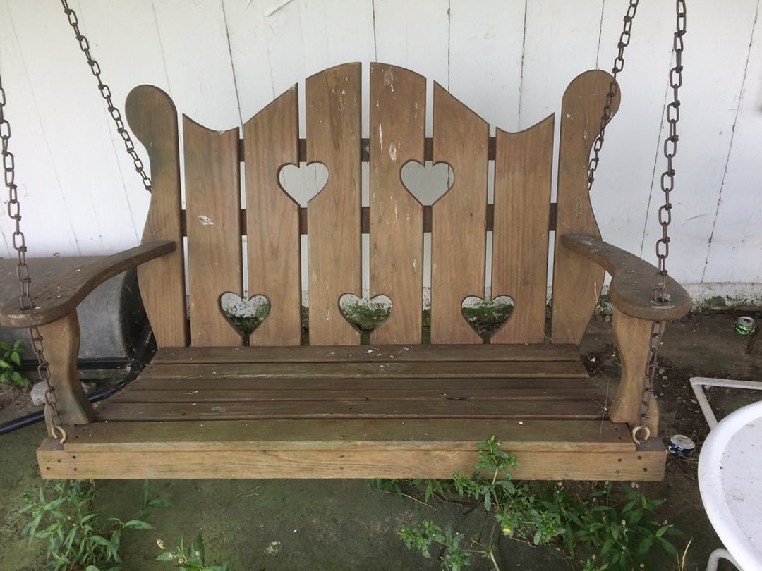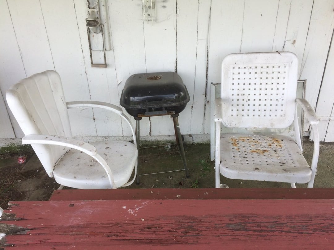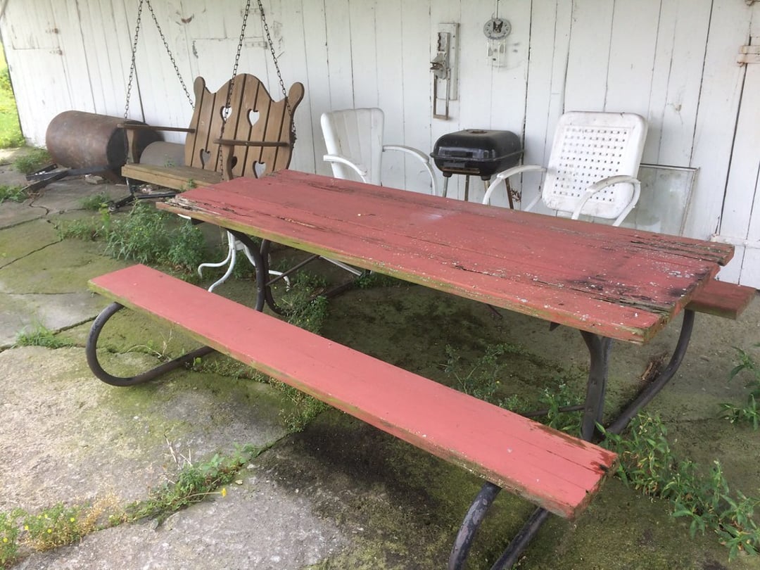 PORCH SWING & ROCKER – (2) CONCRETE DEER – BIRDBATH – BUG LIGHT – METAL PORCH CHAIRS – LAWN CHAIRS – PICNIC TABLE – HUNTING BLIND & APPAREL – LIFE JACKETS & VESTS – FISHING RODS & EQUIPMENT – FEW FENCE POSTS – GAS CANS – TREE & HEDGE TRIMMERS – WEED EATER BLOWER (GAS) – EXTENSION CORDS – ETC.