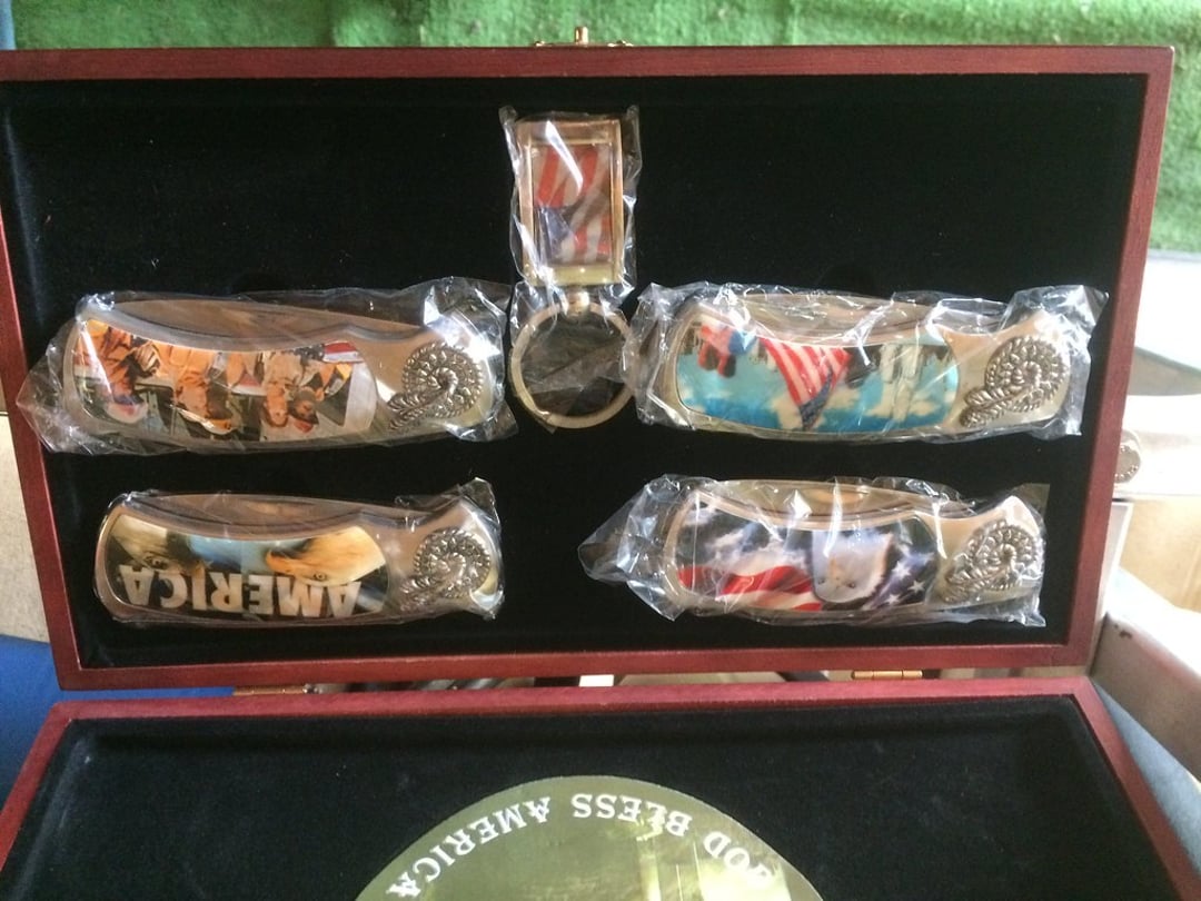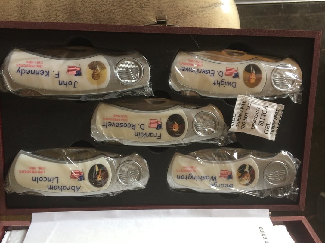 RED GLOBE PR LANTERN – SQUIRT POP CASE – SM KNIFE COLLECTION INCLUDING PRESIDENT SET, GOD BLESS AMERICA SET & OLD TIMER – FEW COLLECTOR COINS – 2 PC DEPRESSION GLASS – PRIMITIVE TOOLS – THOMAS KINCAID VILLAGE – BASEBALL CARDS – COLLECTOR HO TRAIN PCS – ETC.