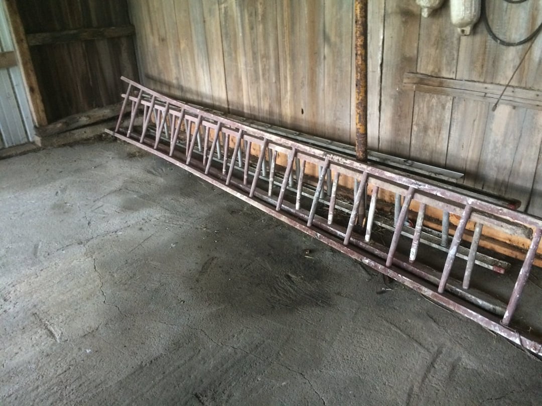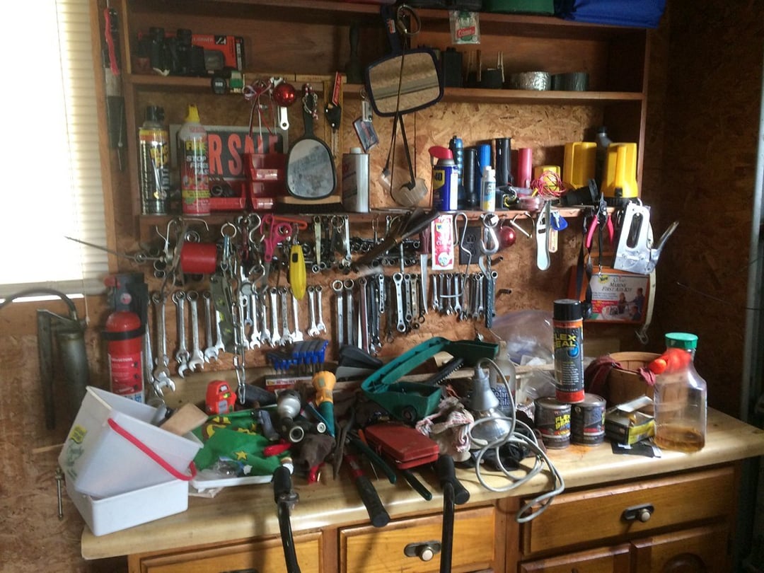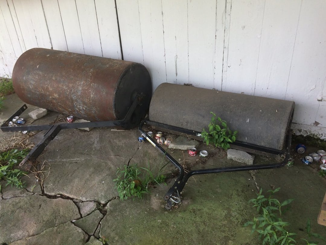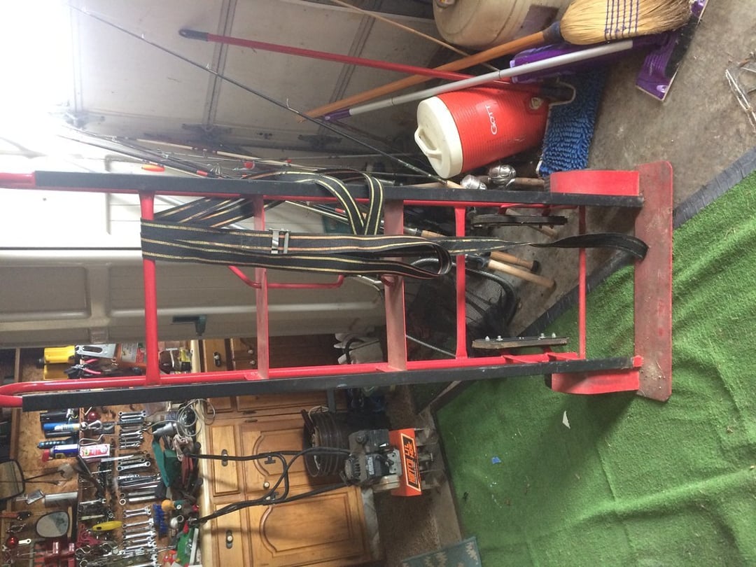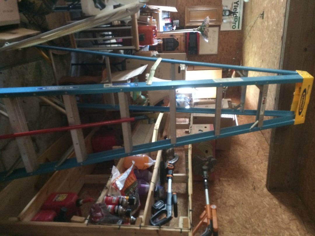 •FIBERGLASS LADDERS & STEP LADDERS – (2) LAWN ROLLERS – WORKMATE – BENCH GRINDER – SANBORN AIR COMPRESSOR – APPLIANCE CART – BOTTLE JACKS – COME-A-LONG – PLASTIC STORAGE BIN RACK – ETC.
