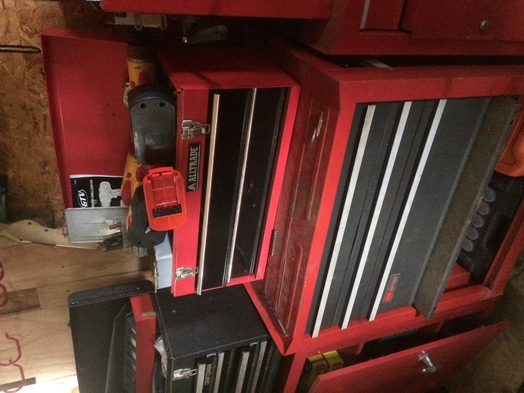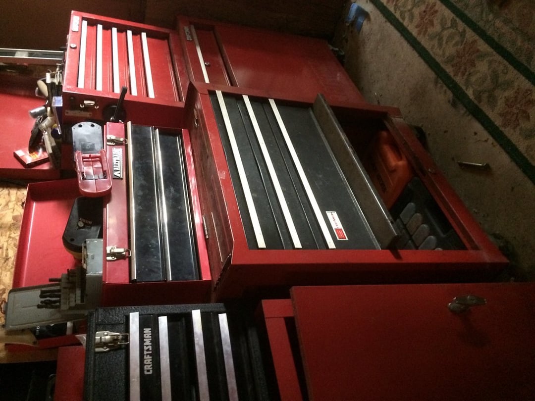 •38″ DECK) – PULL LAWN SWEEPER – YARD TRAILER – PULL BEHIND SPRAYER – 5×10′ TRAILER W/ FOLD DOWN RAMP- 5×8 HAULIN TRAILER – (3) CRAFTSMAN TOOL CHEST KENNEDY TOOL CHEST – HUFFCO LI’L HOW TILLER – MAKITA