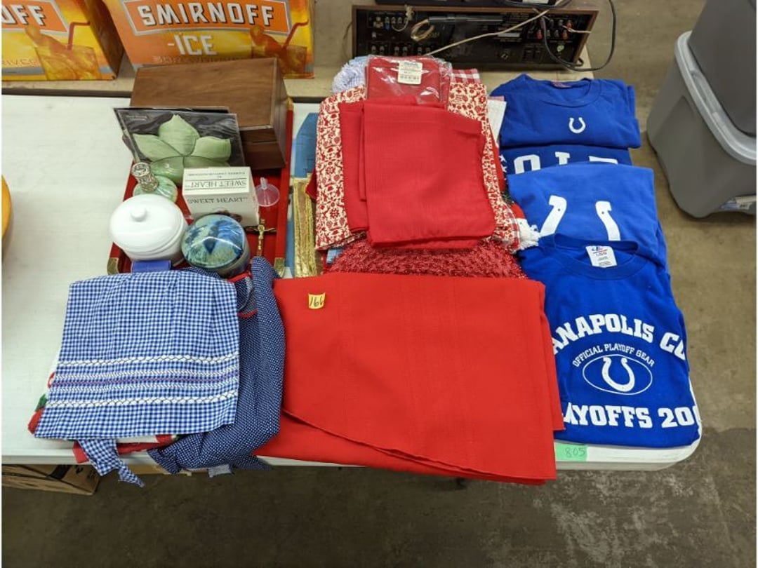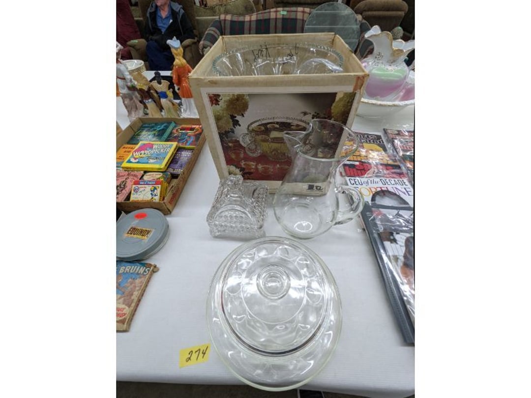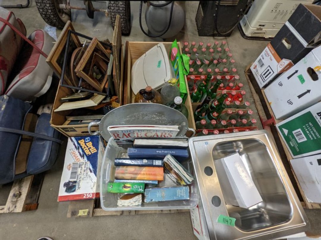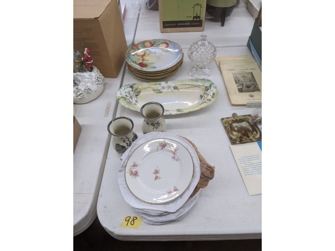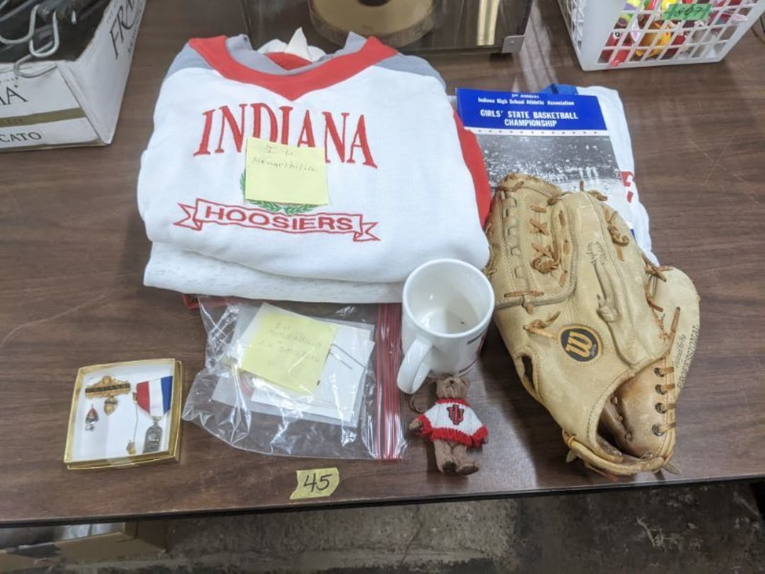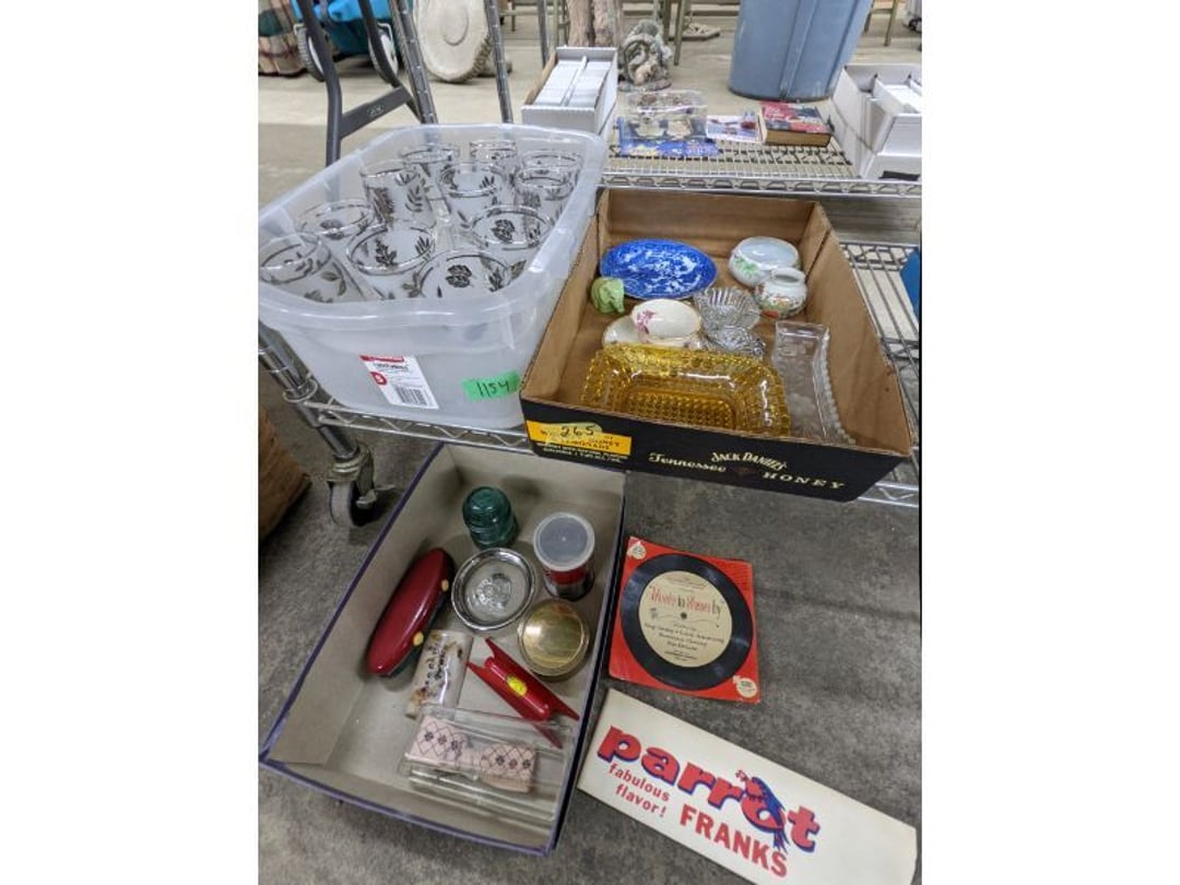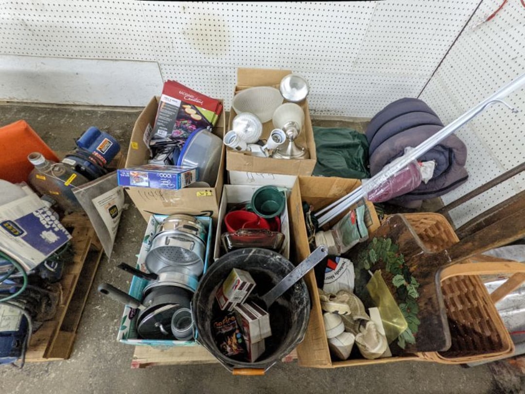 Gear pullers- Horse tie off- 2 Class rings - IU & Heritage Highschool- Pepsi Thermometer- Kissing Angels, Mickey Mouse plate, 2 Baldwin candlesticks- Oster Microwave- Ladies purses, Sm. Rival Crockpot- Hoover PortaPower Vacumn- Yamaha AV Reciever- Sony 3 way Speaker System- HP Desk Jet 1512 -Print, Scan, Copy- Bed Comforter & Signs- LG Blu-Ray Disc Player, Psyc CD Walkman- Paintbrushes, Tool balances, Misc. Tools- Air grinder stones, air tools, & Craftsman Table Saw Molding Head Insert- Vintage Mailbox & GE light switch- Hunting Gear- Tackle box, fishing gear & décor- Sidewinder Sewer Hose support- Electric Craftsman stapler, misc. tools, & organizer boxes- Haier 24" Mini Fridge- Wagner Power Painter- Little Tikes Plastic Child's slide 36"- Little Tikes Basketball Hoop- 3 pieces Leisure Luggage- 19"x24" Pet Cage- Coleman Camping Shelter & adjustable grill- 2 Northwest Territory Camping Chairs- Wolf Mattress & Boxspring - double - Handcrafted Live Edge Table/stool w/ Epoxy inlay- Handcrafted Live Edge Table/stool w/ Epoxy inlay- Handcrafted Wood w/Epoxy inlay- Handcrafted Wooden small table- Lefton China - Lily of the Valley- West Morlan Paneled Grape & Depression divided dish- 70+ pcs. Fire King Swirl dishes'- 40 pcs. Columbia Depression glass- Vernon Kilns Black Eyed Susan- 15 Tiffin glass- Royal China - Fair Oaks, serves 4- Vintage Tupperware- Aircraft wire rope & Ice tongs- Rubber Tarp straps - Indian University Memorabilia- Drawing/Ballot Box w/ tickets- M&M sm. Figurines- Kerosene Lamps w/ cast iron wall brackets- 5 pcs. Milk glass, Hersey kisses candy dish, & Apollo 11 glass - Heisey Glass - cream & sugar, & mint trays- Dunlop tire ashtray & 2 brown glass ashtrays- 2 Imperial blue glass plates- Large Imperial blue glass bowl- 3 small Imperial glass bowls- Carnival glass candy dish- Imperial Slag glass sugar bowl- 3 speakers- Akai Stero reciever - Sony Audio/Video Control Center- Pabst Blue Ribbon mirror- Jeff Gordon & Tiger Woods Pictures- Vintage Pictures- Vintage Shelf, children books, & kitchenware- Vintage Lampshade & 4 pictures- 7 pcs china bowls- Large painted glass sun catcher - 36" & sm. Picture- 3 Lamps- Depression, Corelle, & glassware- Vintage Printing Press letter block shelf- 4 Misc. Pictures- Musical Bell Suymphonium – Trombone- Up Easy lifting cushion- Lionel Trains windup Railroad Handcar- 4 Four Seasons Music box Horses & Wooden music box trolley- 3 Pocket Watches, Brighton clock, pewter bowl, pocket knives, misc.- Haviland china - serves 12- Vintage wooden box of nails- Hawthorne Thomas KinKade Village- 8 pcs. Fire King- Hall China Tavern Scene- Cookbooks- 10 pcs. Fostoria Stemware- Corelle - serves 8- Vernonware Homespun- Merlot Poppy Trail Rooster dishes w/canisters- Corelle Callawa Ivy w/ coffee mugs & glasses- Corelle cups - misc. - Pyrex bowls, casserole, Corningware bakeware- Pink Fenton- 6 red glasses & compote - Real English figurines, Goebel ornaments, & Vintage Children's book- Dishes & small knife set- Music boxes- Snow globes, & Avon perfume bottles- Rose mailing Red candle holders, misc. Christmas- Haviland china- Postcards, vintage National park booklets, vintage misc.- Vintage Erector set & misc. games- Cameras & accessories -Musical Ferris Wheel- Lighted pictures & misc. pictures- Bed is Humidifier filters, GE clock radio, Tierra glass- Yard ornaments & wall pocket- Records Albumns- DVDs - 60 CDs- Lamps- 3 Gray plastic stools- 3 White plastic stools- Vintage Scale- Venturer under cabinet DVD player- Bradford Exchange Russian Legend Set plates & 2 misc.- Electric Colormode Percolater & basket set- View Master w/ discs & misc. children's toys- Misc. Children’s Toys- 3 Metal trucks & wooden semi- Stetson & Resistol Cowboy Hats w/case- Cast Iron Ship Doorstop- 4 Fisher Price Buildings w/accessories - 2 Jack in the Pulpit vases & misc. glass- Misc. china- Florentine China - serves 12- 5 pcs. Fire King bakeware & Pyrex casserole + The Paden City Pottery Co. - serves 12- The Paden City Pottery Co. - serves 12- Temp-tations ovenware by Tara- 6 totes- RCA turntable & Pioneer Stereo Receiver - Record Albums- Mikita Maktec drill w/charger & battery- Air tools- Motorcycle SPH10 Bluetooth Headsets & Intercom + 1 Helmet- Budweiser Clock- Kirkland Professional Quality Pots & Pans- Omega Juicer & Mr. Coffee maker- Kinetic bike trainer - extension cord- Wayne Lawn Pump Utility pump - Wagner Power Roller Plus- 4 Phaltzgraft canisters & 3 glass bowls- Whirlpool over the stove microwave- Vintage Matchbooks, cigar boxes & tote bag- Kitchen appliances- Magnacox Portable DVD player, samsung phone, misc.- Kitchenware, Osterizer blender, & toastmaster waffle maker- Baseball cards - 1985, 1990, 2000- Blue glass dishes- Books- Hitachi VCR, Memorix Portable Karaoke Machine- Outers Pistol Perch- Angel picture & collage frame- Magic Chef Mini fridge- Vintage pulley & hooks- Vintage pitchers & mugs- Large Wooden Bowl- Linens, aprons, Colts tee shirts, misc.- Silver plated punch bowl & goblets- Rodgers silver plated tea pots & cream & sugar- animal figurines- Sheridan silver plated tea pot, cream & sugar, cups, misc.- Cut glass dishes- Crystal dishes- Silver plated dishes- Longenberger basket, wooden nesting pieces- 9 Precious Moments-Christmas - electric merry-go-round, misc.- Paper cutting board, 2 rag rugs- Lg. Brass deer, stone clock, 3 sm. Benches, Ty bear, etc.- Photography equipment & accessories- Magnavox tuner, amplifier, tape deck, CD player- CDs, tapes, 45s, 1 record album- 3 VHS players & Panasonic satellite receiver - Lloyd's record player, 8 track, AM-FM receiver w/2speakers- Sheller & coon traps- 2 speakers- Hallicrafters World-Wide radio- CBs, Emergency radio, etc.- Vintage Singer Sewing machine- Black & Decker 5" grinder & Olympia vice- Duracraft Bench grinder - Powr-Kraft drill, Black & Decker Jig Saw, misc.- Black & Decker mouse, Craftsman sander, Wen soldering gun, & mitering kit- Stereo Headphones, Prism binoculars, 2 Eliminator - Rockwell sander/polishe
