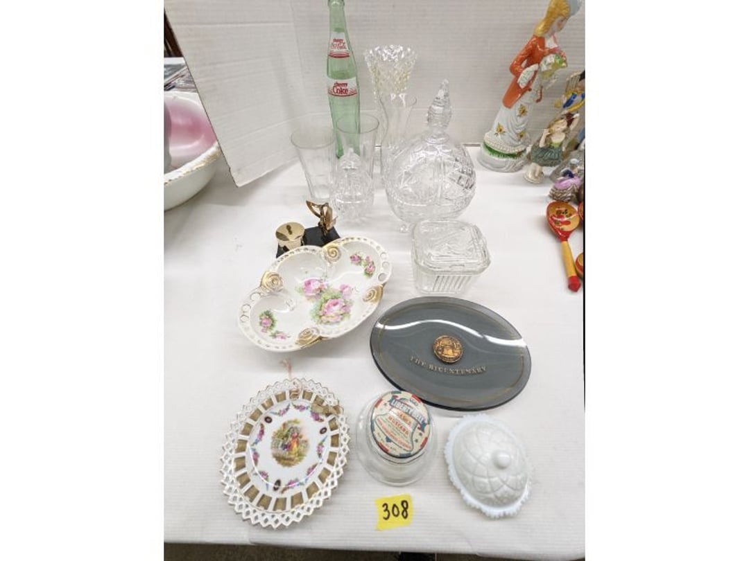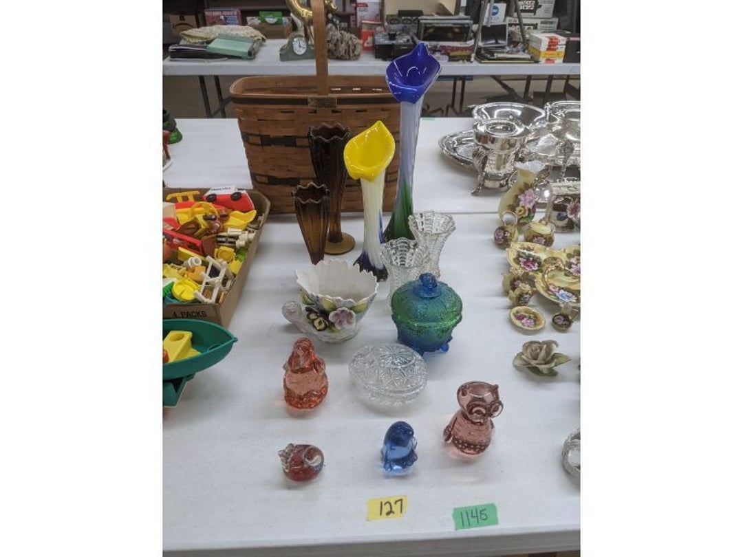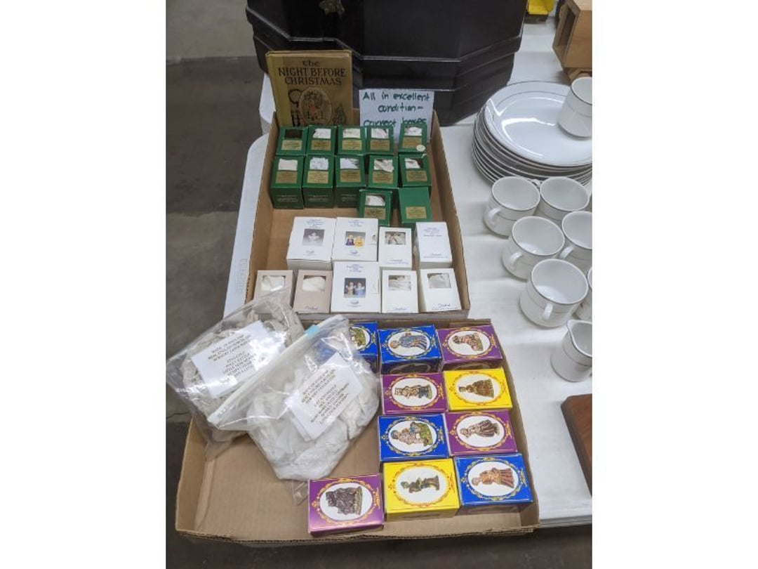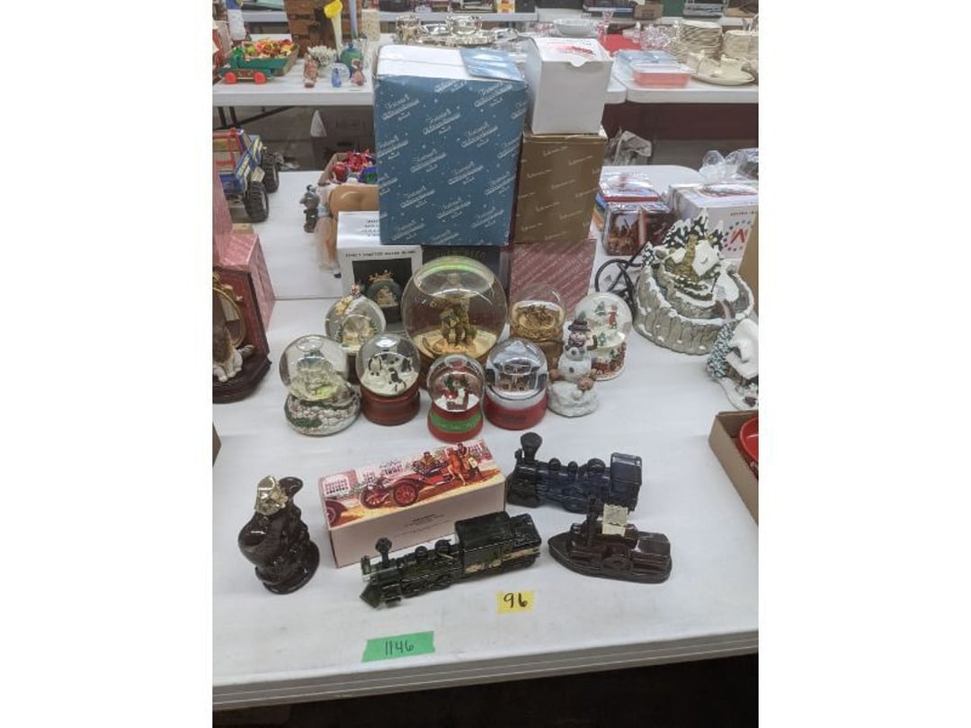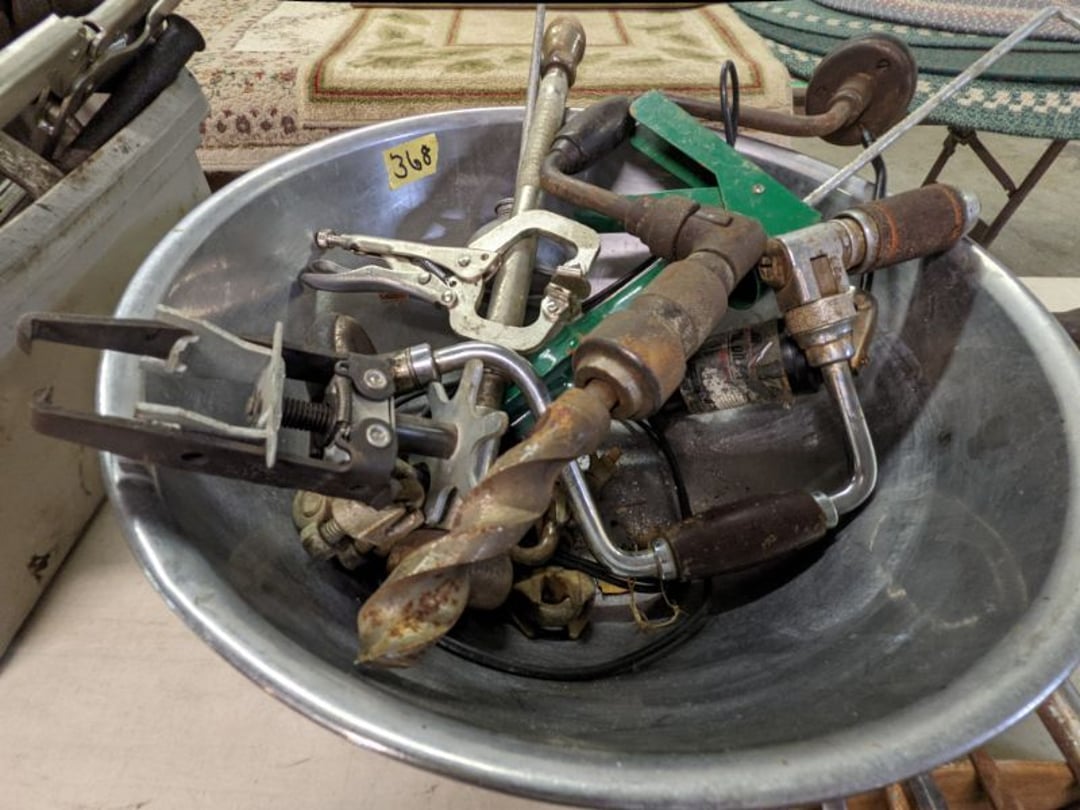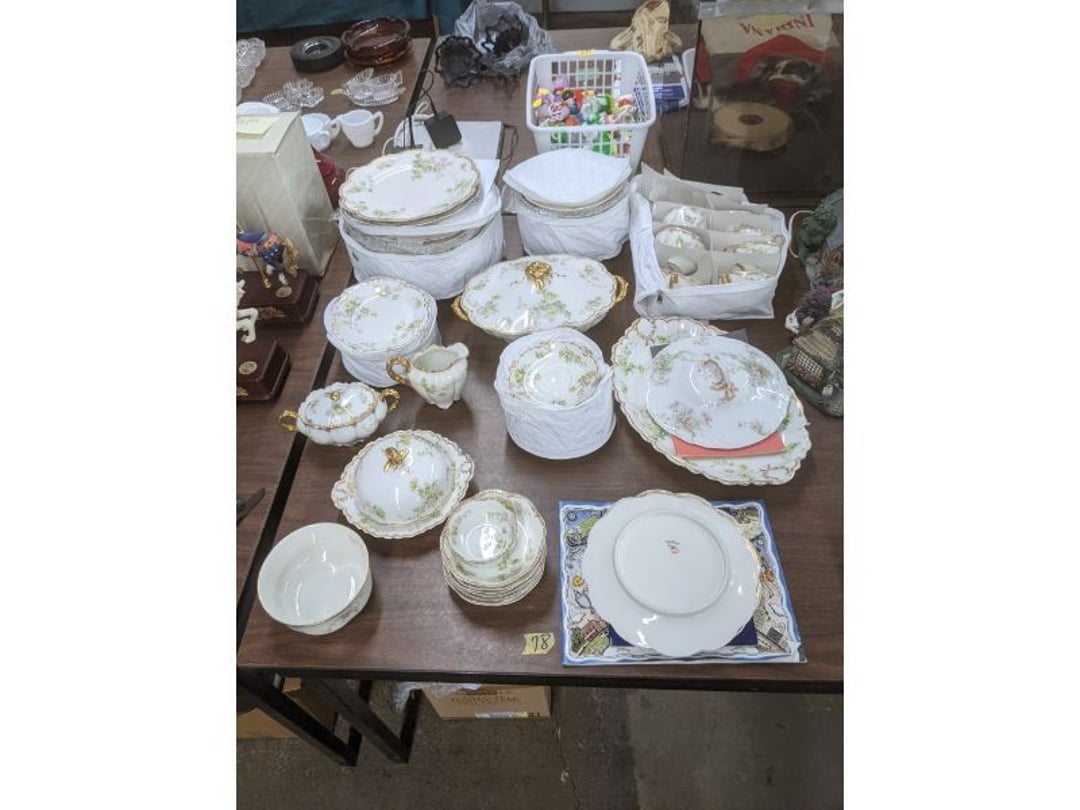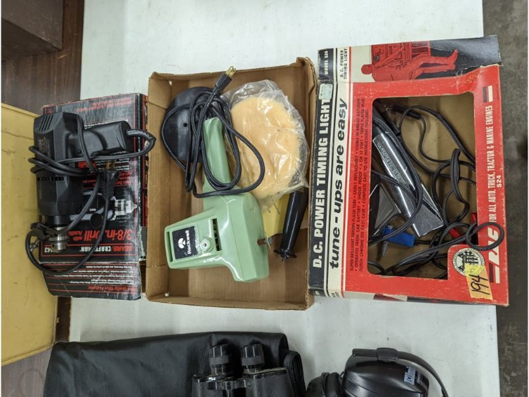 Gear pullers- Horse tie off- 2 Class rings - IU & Heritage Highschool- Pepsi Thermometer- Kissing Angels, Mickey Mouse plate, 2 Baldwin candlesticks- Oster Microwave- Ladies purses, Sm. Rival Crockpot- Hoover PortaPower Vacumn- Yamaha AV Reciever- Sony 3 way Speaker System- HP Desk Jet 1512 -Print, Scan, Copy- Bed Comforter & Signs- LG Blu-Ray Disc Player, Psyc CD Walkman- Paintbrushes, Tool balances, Misc. Tools- Air grinder stones, air tools, & Craftsman Table Saw Molding Head Insert- Vintage Mailbox & GE light switch- Hunting Gear- Tackle box, fishing gear & décor- Sidewinder Sewer Hose support- Electric Craftsman stapler, misc. tools, & organizer boxes- Haier 24" Mini Fridge- Wagner Power Painter- Little Tikes Plastic Child's slide 36"- Little Tikes Basketball Hoop- 3 pieces Leisure Luggage- 19"x24" Pet Cage- Coleman Camping Shelter & adjustable grill- 2 Northwest Territory Camping Chairs- Wolf Mattress & Boxspring - double - Handcrafted Live Edge Table/stool w/ Epoxy inlay- Handcrafted Live Edge Table/stool w/ Epoxy inlay- Handcrafted Wood w/Epoxy inlay- Handcrafted Wooden small table- Lefton China - Lily of the Valley- West Morlan Paneled Grape & Depression divided dish- 70+ pcs. Fire King Swirl dishes'- 40 pcs. Columbia Depression glass- Vernon Kilns Black Eyed Susan- 15 Tiffin glass- Royal China - Fair Oaks, serves 4- Vintage Tupperware- Aircraft wire rope & Ice tongs- Rubber Tarp straps - Indian University Memorabilia- Drawing/Ballot Box w/ tickets- M&M sm. Figurines- Kerosene Lamps w/ cast iron wall brackets- 5 pcs. Milk glass, Hersey kisses candy dish, & Apollo 11 glass - Heisey Glass - cream & sugar, & mint trays- Dunlop tire ashtray & 2 brown glass ashtrays- 2 Imperial blue glass plates- Large Imperial blue glass bowl- 3 small Imperial glass bowls- Carnival glass candy dish- Imperial Slag glass sugar bowl- 3 speakers- Akai Stero reciever - Sony Audio/Video Control Center- Pabst Blue Ribbon mirror- Jeff Gordon & Tiger Woods Pictures- Vintage Pictures- Vintage Shelf, children books, & kitchenware- Vintage Lampshade & 4 pictures- 7 pcs china bowls- Large painted glass sun catcher - 36" & sm. Picture- 3 Lamps- Depression, Corelle, & glassware- Vintage Printing Press letter block shelf- 4 Misc. Pictures- Musical Bell Suymphonium – Trombone- Up Easy lifting cushion- Lionel Trains windup Railroad Handcar- 4 Four Seasons Music box Horses & Wooden music box trolley- 3 Pocket Watches, Brighton clock, pewter bowl, pocket knives, misc.- Haviland china - serves 12- Vintage wooden box of nails- Hawthorne Thomas KinKade Village- 8 pcs. Fire King- Hall China Tavern Scene- Cookbooks- 10 pcs. Fostoria Stemware- Corelle - serves 8- Vernonware Homespun- Merlot Poppy Trail Rooster dishes w/canisters- Corelle Callawa Ivy w/ coffee mugs & glasses- Corelle cups - misc. - Pyrex bowls, casserole, Corningware bakeware- Pink Fenton- 6 red glasses & compote - Real English figurines, Goebel ornaments, & Vintage Children's book- Dishes & small knife set- Music boxes- Snow globes, & Avon perfume bottles- Rose mailing Red candle holders, misc. Christmas- Haviland china- Postcards, vintage National park booklets, vintage misc.- Vintage Erector set & misc. games- Cameras & accessories -Musical Ferris Wheel- Lighted pictures & misc. pictures- Bed is Humidifier filters, GE clock radio, Tierra glass- Yard ornaments & wall pocket- Records Albumns- DVDs - 60 CDs- Lamps- 3 Gray plastic stools- 3 White plastic stools- Vintage Scale- Venturer under cabinet DVD player- Bradford Exchange Russian Legend Set plates & 2 misc.- Electric Colormode Percolater & basket set- View Master w/ discs & misc. children's toys- Misc. Children’s Toys- 3 Metal trucks & wooden semi- Stetson & Resistol Cowboy Hats w/case- Cast Iron Ship Doorstop- 4 Fisher Price Buildings w/accessories - 2 Jack in the Pulpit vases & misc. glass- Misc. china- Florentine China - serves 12- 5 pcs. Fire King bakeware & Pyrex casserole + The Paden City Pottery Co. - serves 12- The Paden City Pottery Co. - serves 12- Temp-tations ovenware by Tara- 6 totes- RCA turntable & Pioneer Stereo Receiver - Record Albums- Mikita Maktec drill w/charger & battery- Air tools- Motorcycle SPH10 Bluetooth Headsets & Intercom + 1 Helmet- Budweiser Clock- Kirkland Professional Quality Pots & Pans- Omega Juicer & Mr. Coffee maker- Kinetic bike trainer - extension cord- Wayne Lawn Pump Utility pump - Wagner Power Roller Plus- 4 Phaltzgraft canisters & 3 glass bowls- Whirlpool over the stove microwave- Vintage Matchbooks, cigar boxes & tote bag- Kitchen appliances- Magnacox Portable DVD player, samsung phone, misc.- Kitchenware, Osterizer blender, & toastmaster waffle maker- Baseball cards - 1985, 1990, 2000- Blue glass dishes- Books- Hitachi VCR, Memorix Portable Karaoke Machine- Outers Pistol Perch- Angel picture & collage frame- Magic Chef Mini fridge- Vintage pulley & hooks- Vintage pitchers & mugs- Large Wooden Bowl- Linens, aprons, Colts tee shirts, misc.- Silver plated punch bowl & goblets- Rodgers silver plated tea pots & cream & sugar- animal figurines- Sheridan silver plated tea pot, cream & sugar, cups, misc.- Cut glass dishes- Crystal dishes- Silver plated dishes- Longenberger basket, wooden nesting pieces- 9 Precious Moments-Christmas - electric merry-go-round, misc.- Paper cutting board, 2 rag rugs- Lg. Brass deer, stone clock, 3 sm. Benches, Ty bear, etc.- Photography equipment & accessories- Magnavox tuner, amplifier, tape deck, CD player- CDs, tapes, 45s, 1 record album- 3 VHS players & Panasonic satellite receiver - Lloyd's record player, 8 track, AM-FM receiver w/2speakers- Sheller & coon traps- 2 speakers- Hallicrafters World-Wide radio- CBs, Emergency radio, etc.- Vintage Singer Sewing machine- Black & Decker 5" grinder & Olympia vice- Duracraft Bench grinder - Powr-Kraft drill, Black & Decker Jig Saw, misc.- Black & Decker mouse, Craftsman sander, Wen soldering gun, & mitering kit- Stereo Headphones, Prism binoculars, 2 Eliminator - Rockwell sander/polishe
