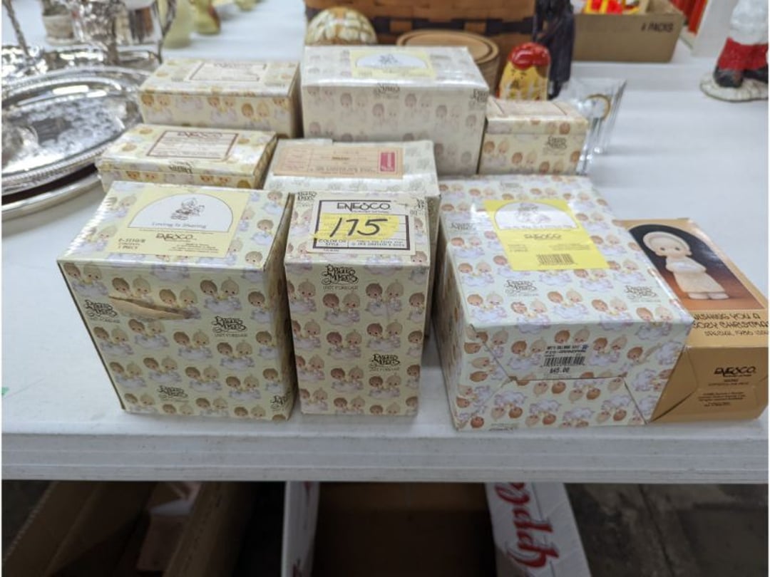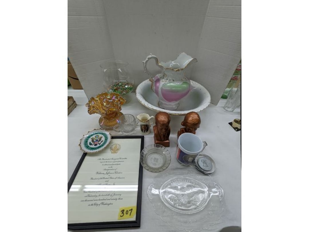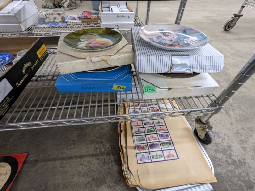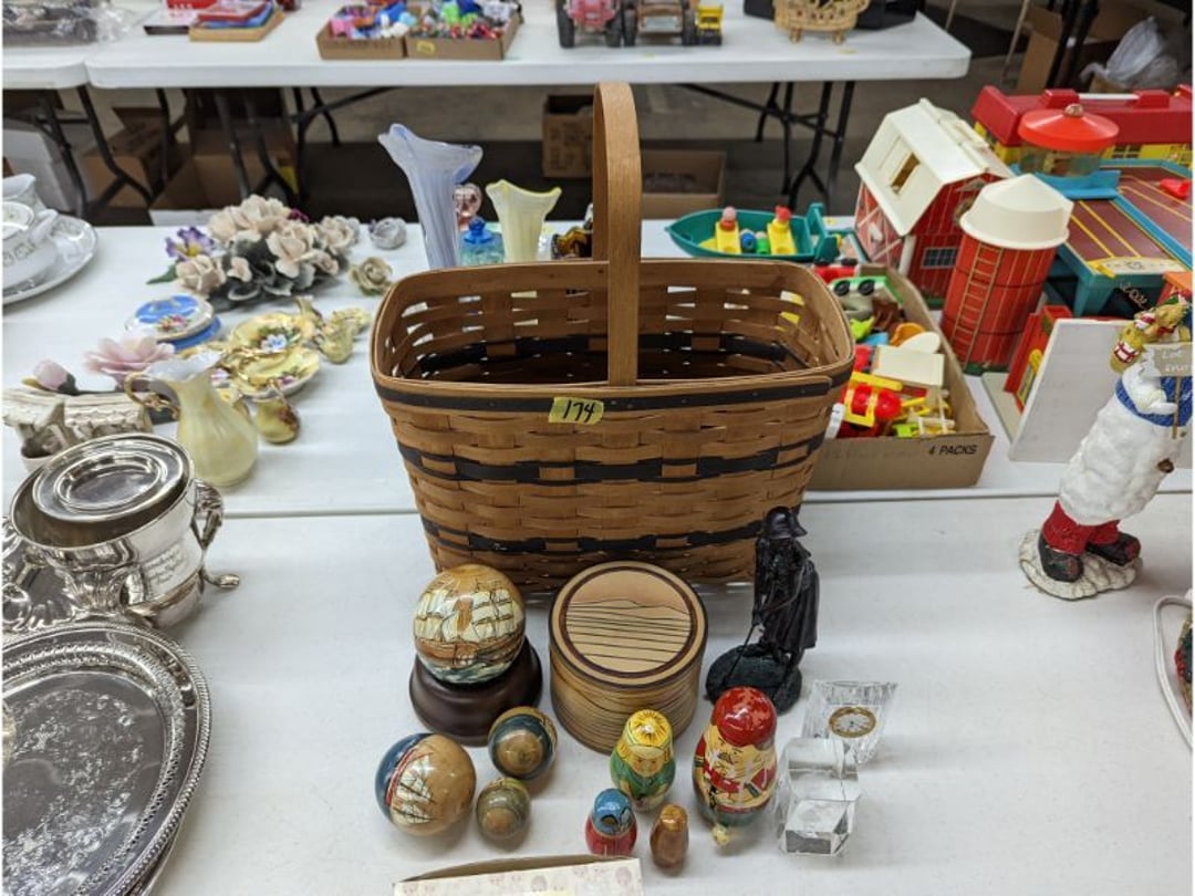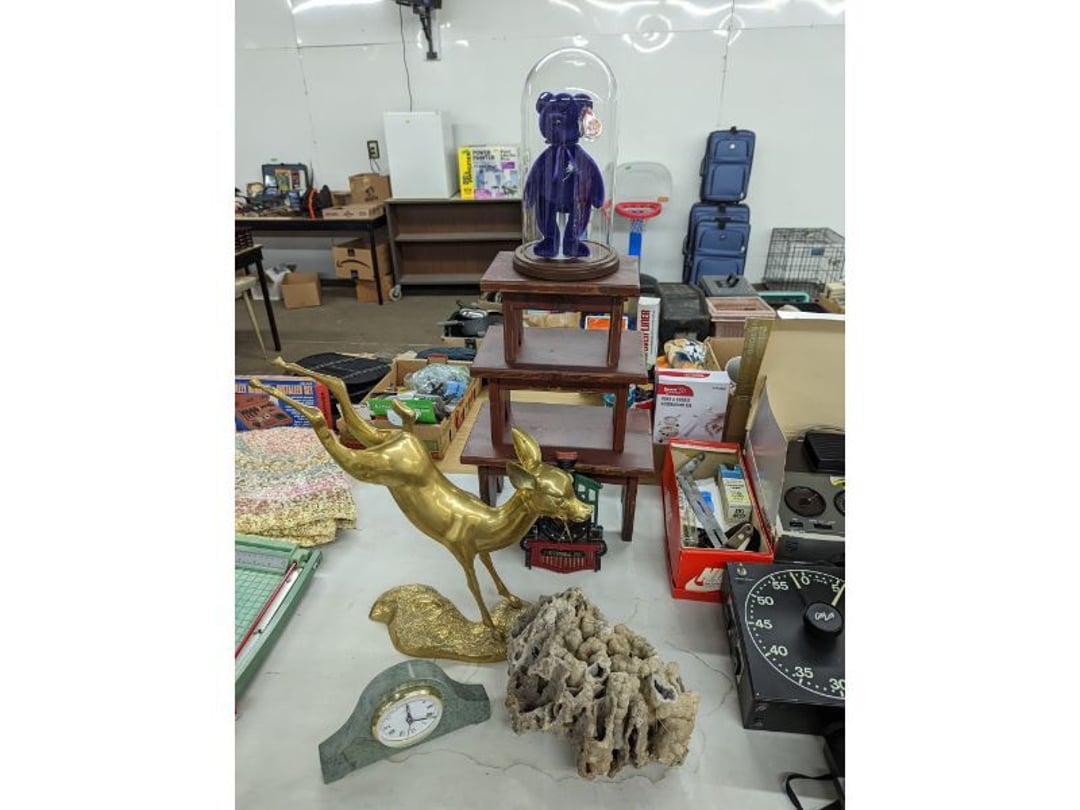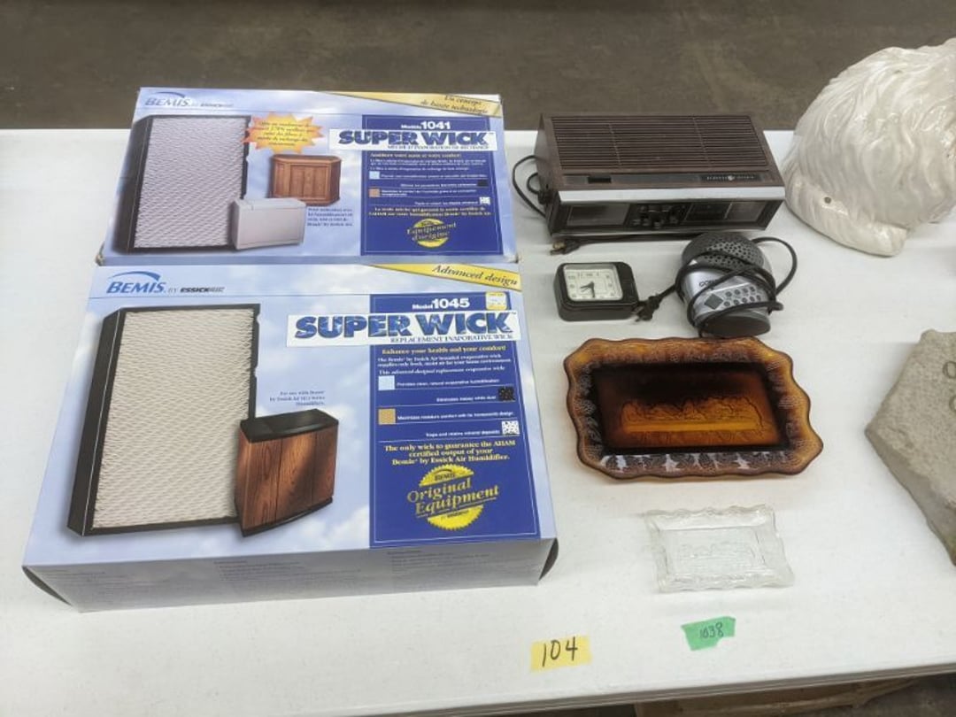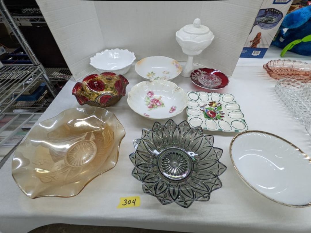 Gear pullers- Horse tie off- 2 Class rings - IU & Heritage Highschool- Pepsi Thermometer- Kissing Angels, Mickey Mouse plate, 2 Baldwin candlesticks- Oster Microwave- Ladies purses, Sm. Rival Crockpot- Hoover PortaPower Vacumn- Yamaha AV Reciever- Sony 3 way Speaker System- HP Desk Jet 1512 -Print, Scan, Copy- Bed Comforter & Signs- LG Blu-Ray Disc Player, Psyc CD Walkman- Paintbrushes, Tool balances, Misc. Tools- Air grinder stones, air tools, & Craftsman Table Saw Molding Head Insert- Vintage Mailbox & GE light switch- Hunting Gear- Tackle box, fishing gear & décor- Sidewinder Sewer Hose support- Electric Craftsman stapler, misc. tools, & organizer boxes- Haier 24" Mini Fridge- Wagner Power Painter- Little Tikes Plastic Child's slide 36"- Little Tikes Basketball Hoop- 3 pieces Leisure Luggage- 19"x24" Pet Cage- Coleman Camping Shelter & adjustable grill- 2 Northwest Territory Camping Chairs- Wolf Mattress & Boxspring - double - Handcrafted Live Edge Table/stool w/ Epoxy inlay- Handcrafted Live Edge Table/stool w/ Epoxy inlay- Handcrafted Wood w/Epoxy inlay- Handcrafted Wooden small table- Lefton China - Lily of the Valley- West Morlan Paneled Grape & Depression divided dish- 70+ pcs. Fire King Swirl dishes'- 40 pcs. Columbia Depression glass- Vernon Kilns Black Eyed Susan- 15 Tiffin glass- Royal China - Fair Oaks, serves 4- Vintage Tupperware- Aircraft wire rope & Ice tongs- Rubber Tarp straps - Indian University Memorabilia- Drawing/Ballot Box w/ tickets- M&M sm. Figurines- Kerosene Lamps w/ cast iron wall brackets- 5 pcs. Milk glass, Hersey kisses candy dish, & Apollo 11 glass - Heisey Glass - cream & sugar, & mint trays- Dunlop tire ashtray & 2 brown glass ashtrays- 2 Imperial blue glass plates- Large Imperial blue glass bowl- 3 small Imperial glass bowls- Carnival glass candy dish- Imperial Slag glass sugar bowl- 3 speakers- Akai Stero reciever - Sony Audio/Video Control Center- Pabst Blue Ribbon mirror- Jeff Gordon & Tiger Woods Pictures- Vintage Pictures- Vintage Shelf, children books, & kitchenware- Vintage Lampshade & 4 pictures- 7 pcs china bowls- Large painted glass sun catcher - 36" & sm. Picture- 3 Lamps- Depression, Corelle, & glassware- Vintage Printing Press letter block shelf- 4 Misc. Pictures- Musical Bell Suymphonium – Trombone- Up Easy lifting cushion- Lionel Trains windup Railroad Handcar- 4 Four Seasons Music box Horses & Wooden music box trolley- 3 Pocket Watches, Brighton clock, pewter bowl, pocket knives, misc.- Haviland china - serves 12- Vintage wooden box of nails- Hawthorne Thomas KinKade Village- 8 pcs. Fire King- Hall China Tavern Scene- Cookbooks- 10 pcs. Fostoria Stemware- Corelle - serves 8- Vernonware Homespun- Merlot Poppy Trail Rooster dishes w/canisters- Corelle Callawa Ivy w/ coffee mugs & glasses- Corelle cups - misc. - Pyrex bowls, casserole, Corningware bakeware- Pink Fenton- 6 red glasses & compote - Real English figurines, Goebel ornaments, & Vintage Children's book- Dishes & small knife set- Music boxes- Snow globes, & Avon perfume bottles- Rose mailing Red candle holders, misc. Christmas- Haviland china- Postcards, vintage National park booklets, vintage misc.- Vintage Erector set & misc. games- Cameras & accessories -Musical Ferris Wheel- Lighted pictures & misc. pictures- Bed is Humidifier filters, GE clock radio, Tierra glass- Yard ornaments & wall pocket- Records Albumns- DVDs - 60 CDs- Lamps- 3 Gray plastic stools- 3 White plastic stools- Vintage Scale- Venturer under cabinet DVD player- Bradford Exchange Russian Legend Set plates & 2 misc.- Electric Colormode Percolater & basket set- View Master w/ discs & misc. children's toys- Misc. Children’s Toys- 3 Metal trucks & wooden semi- Stetson & Resistol Cowboy Hats w/case- Cast Iron Ship Doorstop- 4 Fisher Price Buildings w/accessories - 2 Jack in the Pulpit vases & misc. glass- Misc. china- Florentine China - serves 12- 5 pcs. Fire King bakeware & Pyrex casserole + The Paden City Pottery Co. - serves 12- The Paden City Pottery Co. - serves 12- Temp-tations ovenware by Tara- 6 totes- RCA turntable & Pioneer Stereo Receiver - Record Albums- Mikita Maktec drill w/charger & battery- Air tools- Motorcycle SPH10 Bluetooth Headsets & Intercom + 1 Helmet- Budweiser Clock- Kirkland Professional Quality Pots & Pans- Omega Juicer & Mr. Coffee maker- Kinetic bike trainer - extension cord- Wayne Lawn Pump Utility pump - Wagner Power Roller Plus- 4 Phaltzgraft canisters & 3 glass bowls- Whirlpool over the stove microwave- Vintage Matchbooks, cigar boxes & tote bag- Kitchen appliances- Magnacox Portable DVD player, samsung phone, misc.- Kitchenware, Osterizer blender, & toastmaster waffle maker- Baseball cards - 1985, 1990, 2000- Blue glass dishes- Books- Hitachi VCR, Memorix Portable Karaoke Machine- Outers Pistol Perch- Angel picture & collage frame- Magic Chef Mini fridge- Vintage pulley & hooks- Vintage pitchers & mugs- Large Wooden Bowl- Linens, aprons, Colts tee shirts, misc.- Silver plated punch bowl & goblets- Rodgers silver plated tea pots & cream & sugar- animal figurines- Sheridan silver plated tea pot, cream & sugar, cups, misc.- Cut glass dishes- Crystal dishes- Silver plated dishes- Longenberger basket, wooden nesting pieces- 9 Precious Moments-Christmas - electric merry-go-round, misc.- Paper cutting board, 2 rag rugs- Lg. Brass deer, stone clock, 3 sm. Benches, Ty bear, etc.- Photography equipment & accessories- Magnavox tuner, amplifier, tape deck, CD player- CDs, tapes, 45s, 1 record album- 3 VHS players & Panasonic satellite receiver - Lloyd's record player, 8 track, AM-FM receiver w/2speakers- Sheller & coon traps- 2 speakers- Hallicrafters World-Wide radio- CBs, Emergency radio, etc.- Vintage Singer Sewing machine- Black & Decker 5" grinder & Olympia vice- Duracraft Bench grinder - Powr-Kraft drill, Black & Decker Jig Saw, misc.- Black & Decker mouse, Craftsman sander, Wen soldering gun, & mitering kit- Stereo Headphones, Prism binoculars, 2 Eliminator - Rockwell sander/polishe
