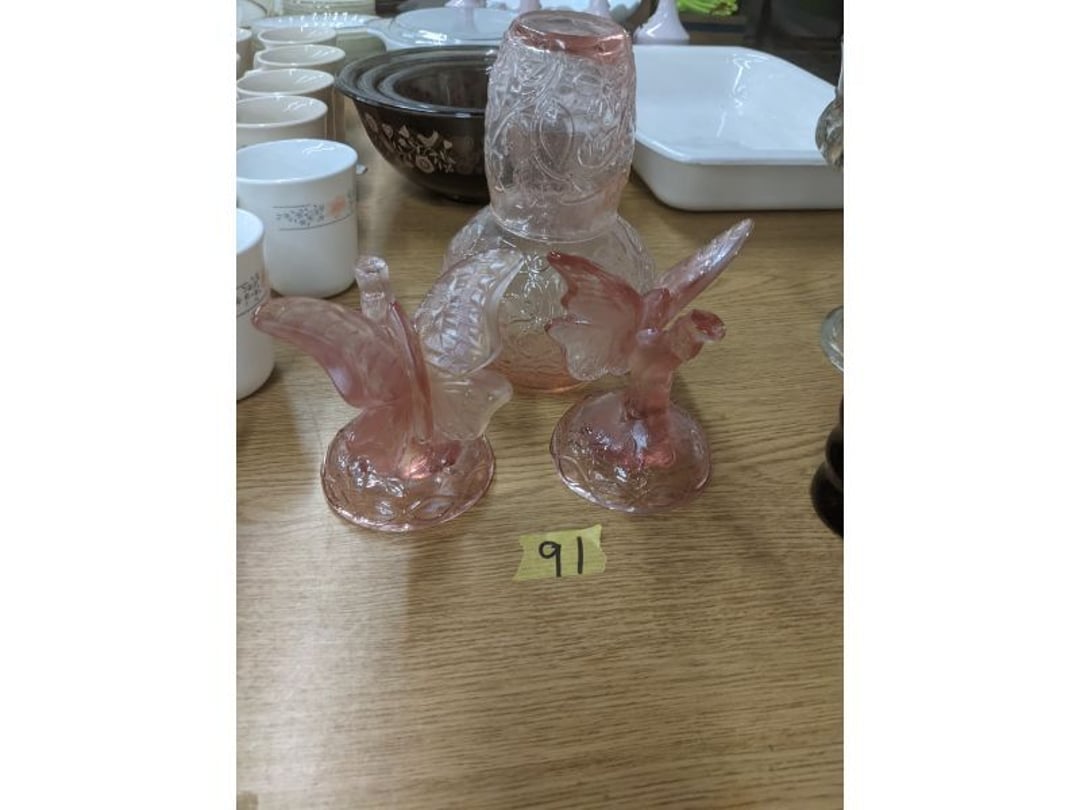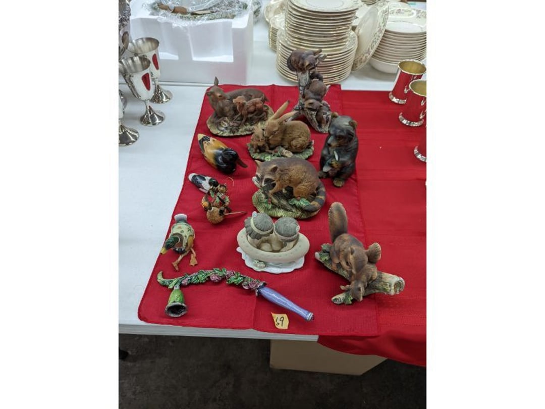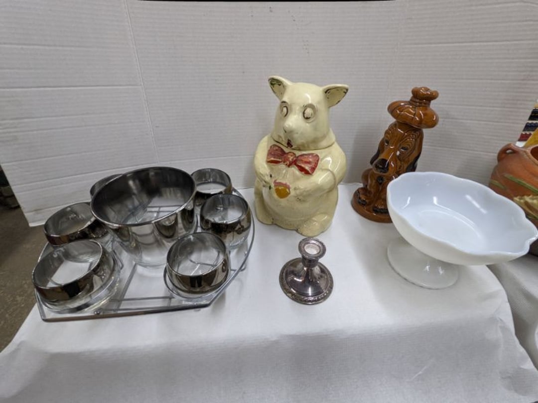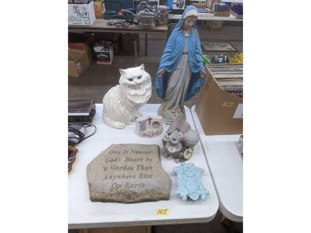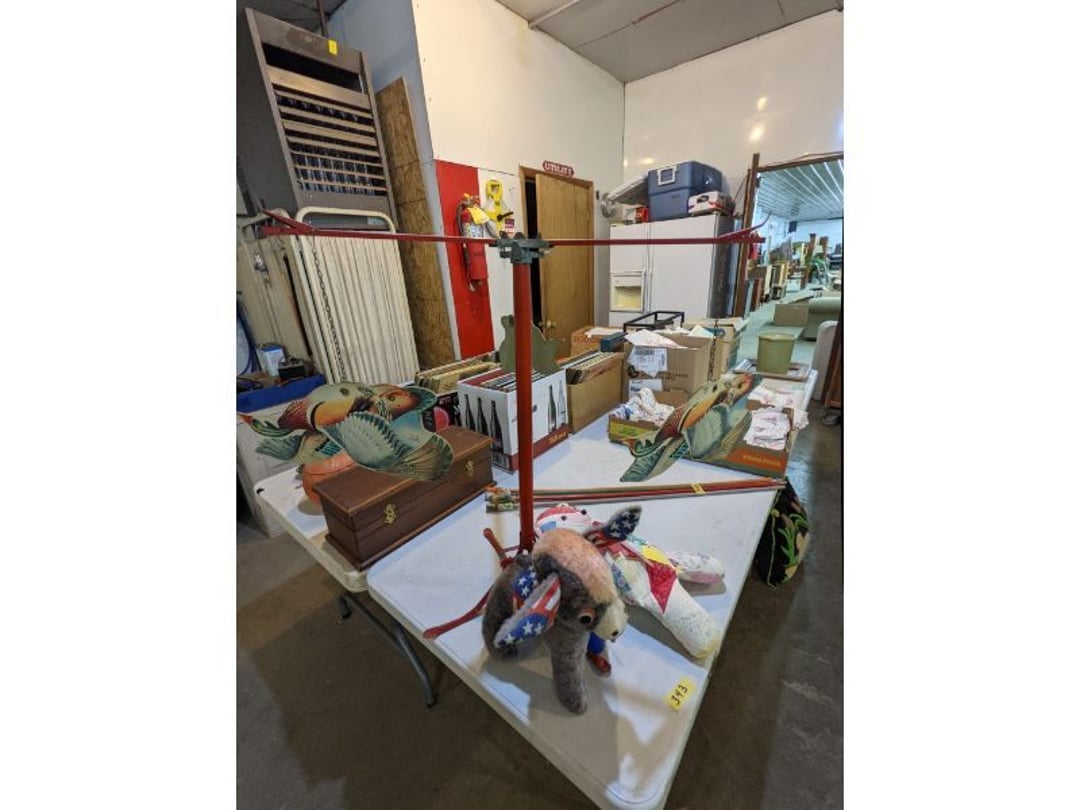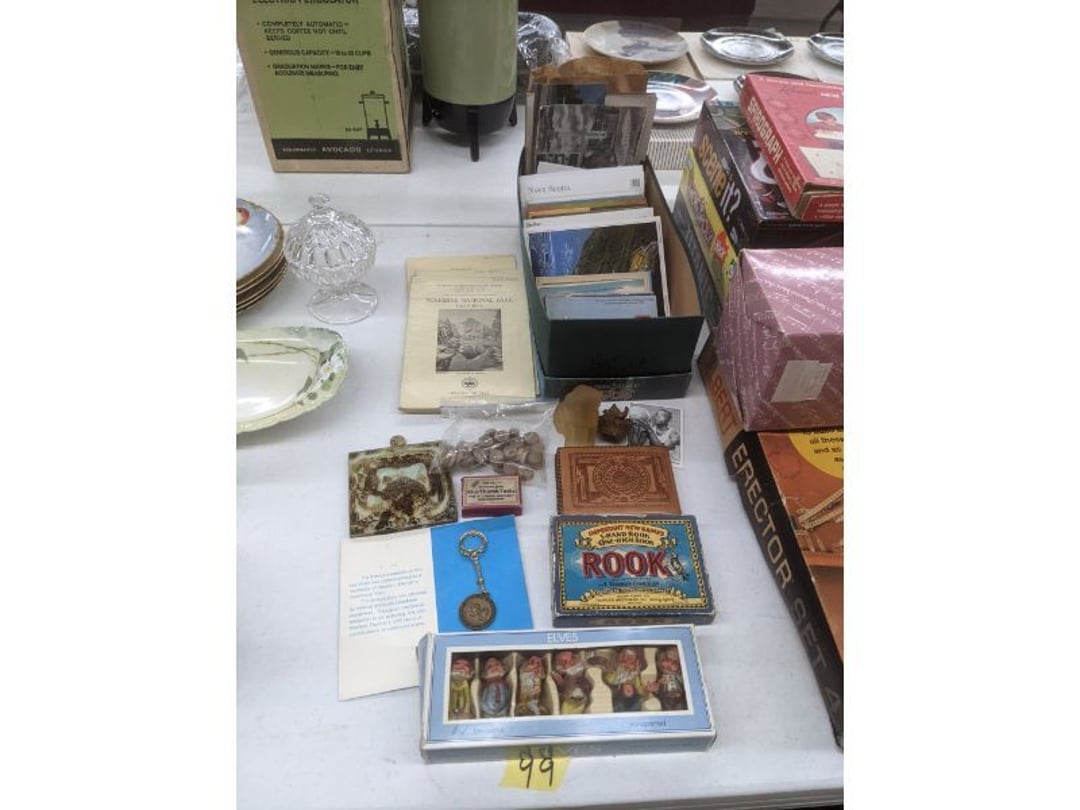 Gear pullers- Horse tie off- 2 Class rings - IU & Heritage Highschool- Pepsi Thermometer- Kissing Angels, Mickey Mouse plate, 2 Baldwin candlesticks- Oster Microwave- Ladies purses, Sm. Rival Crockpot- Hoover PortaPower Vacumn- Yamaha AV Reciever- Sony 3 way Speaker System- HP Desk Jet 1512 -Print, Scan, Copy- Bed Comforter & Signs- LG Blu-Ray Disc Player, Psyc CD Walkman- Paintbrushes, Tool balances, Misc. Tools- Air grinder stones, air tools, & Craftsman Table Saw Molding Head Insert- Vintage Mailbox & GE light switch- Hunting Gear- Tackle box, fishing gear & décor- Sidewinder Sewer Hose support- Electric Craftsman stapler, misc. tools, & organizer boxes- Haier 24" Mini Fridge- Wagner Power Painter- Little Tikes Plastic Child's slide 36"- Little Tikes Basketball Hoop- 3 pieces Leisure Luggage- 19"x24" Pet Cage- Coleman Camping Shelter & adjustable grill- 2 Northwest Territory Camping Chairs- Wolf Mattress & Boxspring - double - Handcrafted Live Edge Table/stool w/ Epoxy inlay- Handcrafted Live Edge Table/stool w/ Epoxy inlay- Handcrafted Wood w/Epoxy inlay- Handcrafted Wooden small table- Lefton China - Lily of the Valley- West Morlan Paneled Grape & Depression divided dish- 70+ pcs. Fire King Swirl dishes'- 40 pcs. Columbia Depression glass- Vernon Kilns Black Eyed Susan- 15 Tiffin glass- Royal China - Fair Oaks, serves 4- Vintage Tupperware- Aircraft wire rope & Ice tongs- Rubber Tarp straps - Indian University Memorabilia- Drawing/Ballot Box w/ tickets- M&M sm. Figurines- Kerosene Lamps w/ cast iron wall brackets- 5 pcs. Milk glass, Hersey kisses candy dish, & Apollo 11 glass - Heisey Glass - cream & sugar, & mint trays- Dunlop tire ashtray & 2 brown glass ashtrays- 2 Imperial blue glass plates- Large Imperial blue glass bowl- 3 small Imperial glass bowls- Carnival glass candy dish- Imperial Slag glass sugar bowl- 3 speakers- Akai Stero reciever - Sony Audio/Video Control Center- Pabst Blue Ribbon mirror- Jeff Gordon & Tiger Woods Pictures- Vintage Pictures- Vintage Shelf, children books, & kitchenware- Vintage Lampshade & 4 pictures- 7 pcs china bowls- Large painted glass sun catcher - 36" & sm. Picture- 3 Lamps- Depression, Corelle, & glassware- Vintage Printing Press letter block shelf- 4 Misc. Pictures- Musical Bell Suymphonium – Trombone- Up Easy lifting cushion- Lionel Trains windup Railroad Handcar- 4 Four Seasons Music box Horses & Wooden music box trolley- 3 Pocket Watches, Brighton clock, pewter bowl, pocket knives, misc.- Haviland china - serves 12- Vintage wooden box of nails- Hawthorne Thomas KinKade Village- 8 pcs. Fire King- Hall China Tavern Scene- Cookbooks- 10 pcs. Fostoria Stemware- Corelle - serves 8- Vernonware Homespun- Merlot Poppy Trail Rooster dishes w/canisters- Corelle Callawa Ivy w/ coffee mugs & glasses- Corelle cups - misc. - Pyrex bowls, casserole, Corningware bakeware- Pink Fenton- 6 red glasses & compote - Real English figurines, Goebel ornaments, & Vintage Children's book- Dishes & small knife set- Music boxes- Snow globes, & Avon perfume bottles- Rose mailing Red candle holders, misc. Christmas- Haviland china- Postcards, vintage National park booklets, vintage misc.- Vintage Erector set & misc. games- Cameras & accessories -Musical Ferris Wheel- Lighted pictures & misc. pictures- Bed is Humidifier filters, GE clock radio, Tierra glass- Yard ornaments & wall pocket- Records Albumns- DVDs - 60 CDs- Lamps- 3 Gray plastic stools- 3 White plastic stools- Vintage Scale- Venturer under cabinet DVD player- Bradford Exchange Russian Legend Set plates & 2 misc.- Electric Colormode Percolater & basket set- View Master w/ discs & misc. children's toys- Misc. Children’s Toys- 3 Metal trucks & wooden semi- Stetson & Resistol Cowboy Hats w/case- Cast Iron Ship Doorstop- 4 Fisher Price Buildings w/accessories - 2 Jack in the Pulpit vases & misc. glass- Misc. china- Florentine China - serves 12- 5 pcs. Fire King bakeware & Pyrex casserole + The Paden City Pottery Co. - serves 12- The Paden City Pottery Co. - serves 12- Temp-tations ovenware by Tara- 6 totes- RCA turntable & Pioneer Stereo Receiver - Record Albums- Mikita Maktec drill w/charger & battery- Air tools- Motorcycle SPH10 Bluetooth Headsets & Intercom + 1 Helmet- Budweiser Clock- Kirkland Professional Quality Pots & Pans- Omega Juicer & Mr. Coffee maker- Kinetic bike trainer - extension cord- Wayne Lawn Pump Utility pump - Wagner Power Roller Plus- 4 Phaltzgraft canisters & 3 glass bowls- Whirlpool over the stove microwave- Vintage Matchbooks, cigar boxes & tote bag- Kitchen appliances- Magnacox Portable DVD player, samsung phone, misc.- Kitchenware, Osterizer blender, & toastmaster waffle maker- Baseball cards - 1985, 1990, 2000- Blue glass dishes- Books- Hitachi VCR, Memorix Portable Karaoke Machine- Outers Pistol Perch- Angel picture & collage frame- Magic Chef Mini fridge- Vintage pulley & hooks- Vintage pitchers & mugs- Large Wooden Bowl- Linens, aprons, Colts tee shirts, misc.- Silver plated punch bowl & goblets- Rodgers silver plated tea pots & cream & sugar- animal figurines- Sheridan silver plated tea pot, cream & sugar, cups, misc.- Cut glass dishes- Crystal dishes- Silver plated dishes- Longenberger basket, wooden nesting pieces- 9 Precious Moments-Christmas - electric merry-go-round, misc.- Paper cutting board, 2 rag rugs- Lg. Brass deer, stone clock, 3 sm. Benches, Ty bear, etc.- Photography equipment & accessories- Magnavox tuner, amplifier, tape deck, CD player- CDs, tapes, 45s, 1 record album- 3 VHS players & Panasonic satellite receiver - Lloyd's record player, 8 track, AM-FM receiver w/2speakers- Sheller & coon traps- 2 speakers- Hallicrafters World-Wide radio- CBs, Emergency radio, etc.- Vintage Singer Sewing machine- Black & Decker 5" grinder & Olympia vice- Duracraft Bench grinder - Powr-Kraft drill, Black & Decker Jig Saw, misc.- Black & Decker mouse, Craftsman sander, Wen soldering gun, & mitering kit- Stereo Headphones, Prism binoculars, 2 Eliminator - Rockwell sander/polishe