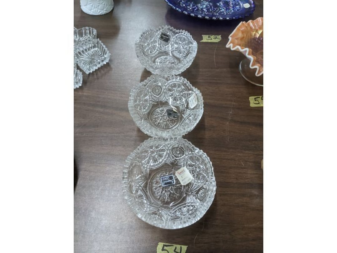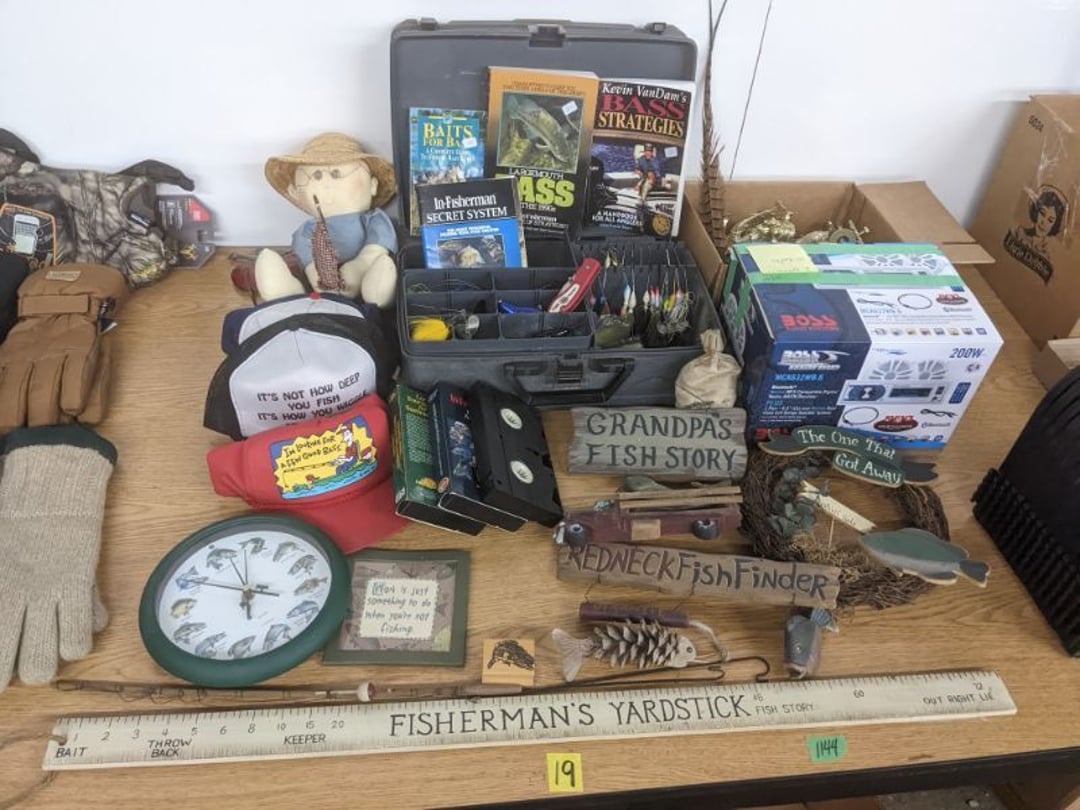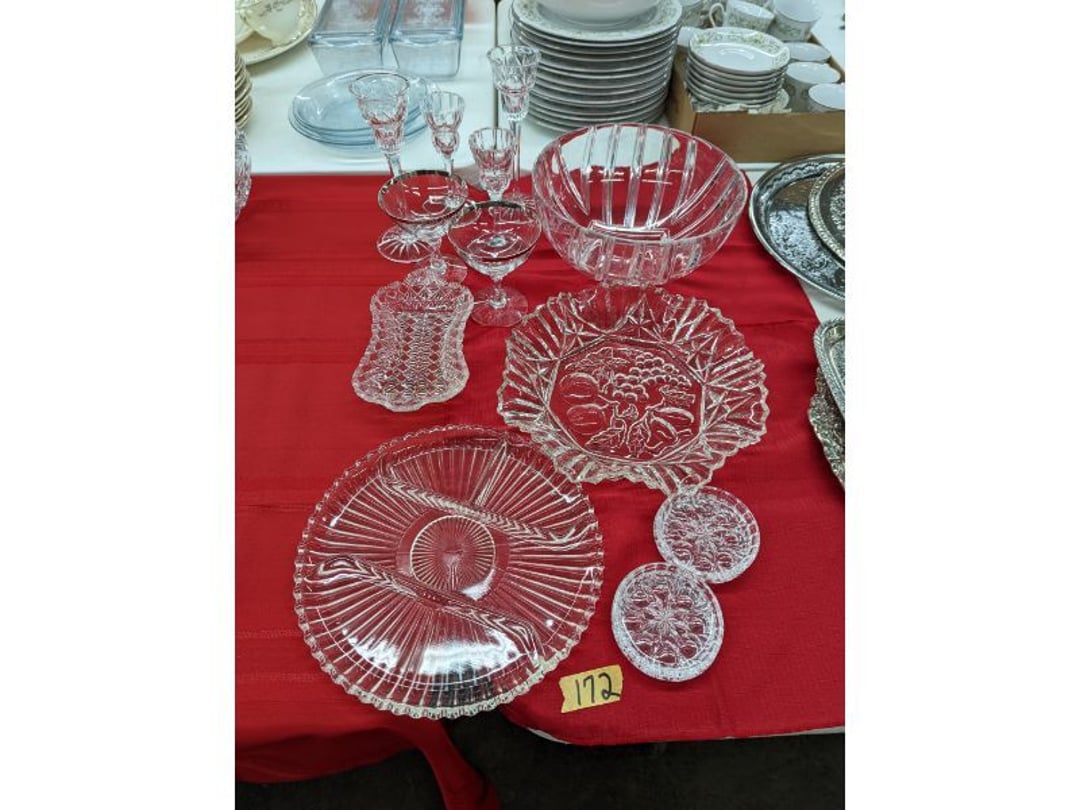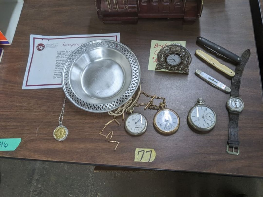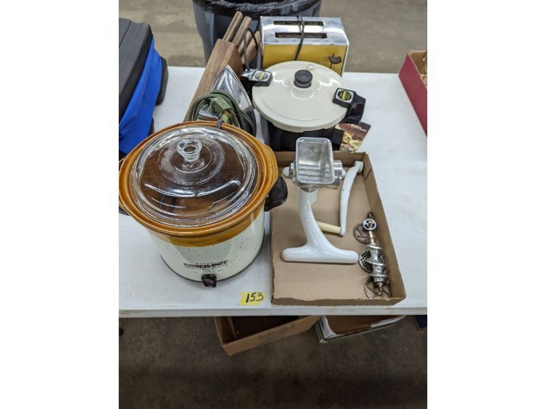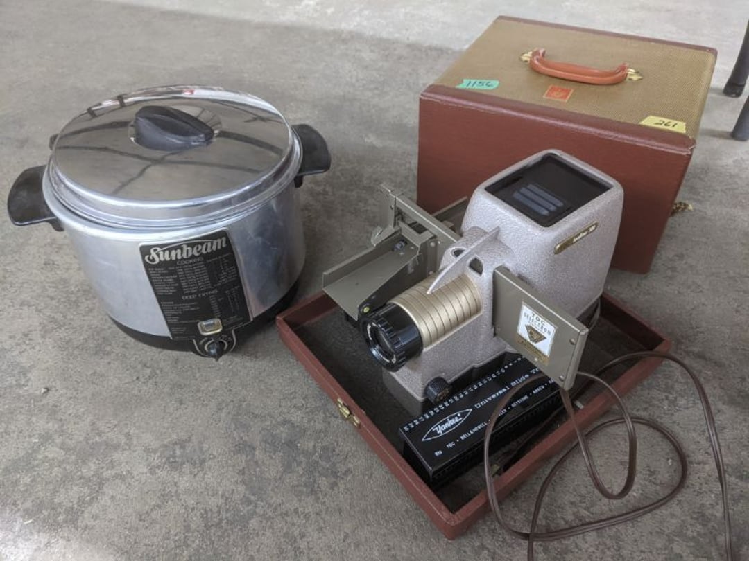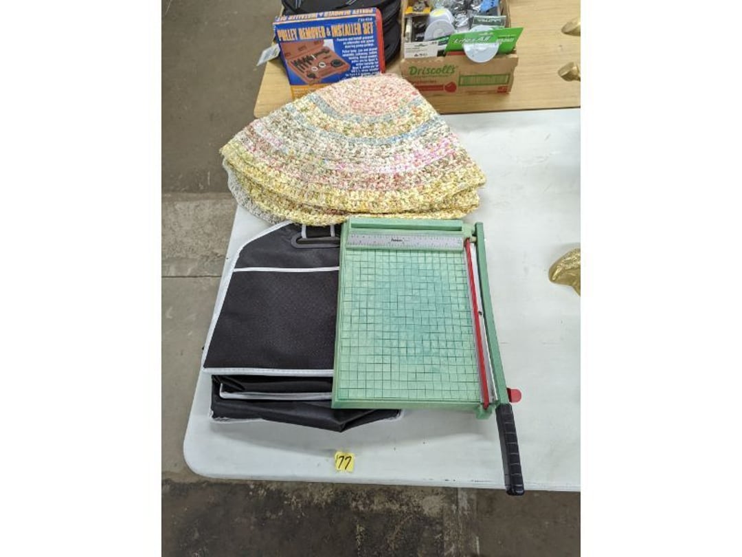 Gear pullers- Horse tie off- 2 Class rings - IU & Heritage Highschool- Pepsi Thermometer- Kissing Angels, Mickey Mouse plate, 2 Baldwin candlesticks- Oster Microwave- Ladies purses, Sm. Rival Crockpot- Hoover PortaPower Vacumn- Yamaha AV Reciever- Sony 3 way Speaker System- HP Desk Jet 1512 -Print, Scan, Copy- Bed Comforter & Signs- LG Blu-Ray Disc Player, Psyc CD Walkman- Paintbrushes, Tool balances, Misc. Tools- Air grinder stones, air tools, & Craftsman Table Saw Molding Head Insert- Vintage Mailbox & GE light switch- Hunting Gear- Tackle box, fishing gear & décor- Sidewinder Sewer Hose support- Electric Craftsman stapler, misc. tools, & organizer boxes- Haier 24" Mini Fridge- Wagner Power Painter- Little Tikes Plastic Child's slide 36"- Little Tikes Basketball Hoop- 3 pieces Leisure Luggage- 19"x24" Pet Cage- Coleman Camping Shelter & adjustable grill- 2 Northwest Territory Camping Chairs- Wolf Mattress & Boxspring - double - Handcrafted Live Edge Table/stool w/ Epoxy inlay- Handcrafted Live Edge Table/stool w/ Epoxy inlay- Handcrafted Wood w/Epoxy inlay- Handcrafted Wooden small table- Lefton China - Lily of the Valley- West Morlan Paneled Grape & Depression divided dish- 70+ pcs. Fire King Swirl dishes'- 40 pcs. Columbia Depression glass- Vernon Kilns Black Eyed Susan- 15 Tiffin glass- Royal China - Fair Oaks, serves 4- Vintage Tupperware- Aircraft wire rope & Ice tongs- Rubber Tarp straps - Indian University Memorabilia- Drawing/Ballot Box w/ tickets- M&M sm. Figurines- Kerosene Lamps w/ cast iron wall brackets- 5 pcs. Milk glass, Hersey kisses candy dish, & Apollo 11 glass - Heisey Glass - cream & sugar, & mint trays- Dunlop tire ashtray & 2 brown glass ashtrays- 2 Imperial blue glass plates- Large Imperial blue glass bowl- 3 small Imperial glass bowls- Carnival glass candy dish- Imperial Slag glass sugar bowl- 3 speakers- Akai Stero reciever - Sony Audio/Video Control Center- Pabst Blue Ribbon mirror- Jeff Gordon & Tiger Woods Pictures- Vintage Pictures- Vintage Shelf, children books, & kitchenware- Vintage Lampshade & 4 pictures- 7 pcs china bowls- Large painted glass sun catcher - 36" & sm. Picture- 3 Lamps- Depression, Corelle, & glassware- Vintage Printing Press letter block shelf- 4 Misc. Pictures- Musical Bell Suymphonium – Trombone- Up Easy lifting cushion- Lionel Trains windup Railroad Handcar- 4 Four Seasons Music box Horses & Wooden music box trolley- 3 Pocket Watches, Brighton clock, pewter bowl, pocket knives, misc.- Haviland china - serves 12- Vintage wooden box of nails- Hawthorne Thomas KinKade Village- 8 pcs. Fire King- Hall China Tavern Scene- Cookbooks- 10 pcs. Fostoria Stemware- Corelle - serves 8- Vernonware Homespun- Merlot Poppy Trail Rooster dishes w/canisters- Corelle Callawa Ivy w/ coffee mugs & glasses- Corelle cups - misc. - Pyrex bowls, casserole, Corningware bakeware- Pink Fenton- 6 red glasses & compote - Real English figurines, Goebel ornaments, & Vintage Children's book- Dishes & small knife set- Music boxes- Snow globes, & Avon perfume bottles- Rose mailing Red candle holders, misc. Christmas- Haviland china- Postcards, vintage National park booklets, vintage misc.- Vintage Erector set & misc. games- Cameras & accessories -Musical Ferris Wheel- Lighted pictures & misc. pictures- Bed is Humidifier filters, GE clock radio, Tierra glass- Yard ornaments & wall pocket- Records Albumns- DVDs - 60 CDs- Lamps- 3 Gray plastic stools- 3 White plastic stools- Vintage Scale- Venturer under cabinet DVD player- Bradford Exchange Russian Legend Set plates & 2 misc.- Electric Colormode Percolater & basket set- View Master w/ discs & misc. children's toys- Misc. Children’s Toys- 3 Metal trucks & wooden semi- Stetson & Resistol Cowboy Hats w/case- Cast Iron Ship Doorstop- 4 Fisher Price Buildings w/accessories - 2 Jack in the Pulpit vases & misc. glass- Misc. china- Florentine China - serves 12- 5 pcs. Fire King bakeware & Pyrex casserole + The Paden City Pottery Co. - serves 12- The Paden City Pottery Co. - serves 12- Temp-tations ovenware by Tara- 6 totes- RCA turntable & Pioneer Stereo Receiver - Record Albums- Mikita Maktec drill w/charger & battery- Air tools- Motorcycle SPH10 Bluetooth Headsets & Intercom + 1 Helmet- Budweiser Clock- Kirkland Professional Quality Pots & Pans- Omega Juicer & Mr. Coffee maker- Kinetic bike trainer - extension cord- Wayne Lawn Pump Utility pump - Wagner Power Roller Plus- 4 Phaltzgraft canisters & 3 glass bowls- Whirlpool over the stove microwave- Vintage Matchbooks, cigar boxes & tote bag- Kitchen appliances- Magnacox Portable DVD player, samsung phone, misc.- Kitchenware, Osterizer blender, & toastmaster waffle maker- Baseball cards - 1985, 1990, 2000- Blue glass dishes- Books- Hitachi VCR, Memorix Portable Karaoke Machine- Outers Pistol Perch- Angel picture & collage frame- Magic Chef Mini fridge- Vintage pulley & hooks- Vintage pitchers & mugs- Large Wooden Bowl- Linens, aprons, Colts tee shirts, misc.- Silver plated punch bowl & goblets- Rodgers silver plated tea pots & cream & sugar- animal figurines- Sheridan silver plated tea pot, cream & sugar, cups, misc.- Cut glass dishes- Crystal dishes- Silver plated dishes- Longenberger basket, wooden nesting pieces- 9 Precious Moments-Christmas - electric merry-go-round, misc.- Paper cutting board, 2 rag rugs- Lg. Brass deer, stone clock, 3 sm. Benches, Ty bear, etc.- Photography equipment & accessories- Magnavox tuner, amplifier, tape deck, CD player- CDs, tapes, 45s, 1 record album- 3 VHS players & Panasonic satellite receiver - Lloyd's record player, 8 track, AM-FM receiver w/2speakers- Sheller & coon traps- 2 speakers- Hallicrafters World-Wide radio- CBs, Emergency radio, etc.- Vintage Singer Sewing machine- Black & Decker 5" grinder & Olympia vice- Duracraft Bench grinder - Powr-Kraft drill, Black & Decker Jig Saw, misc.- Black & Decker mouse, Craftsman sander, Wen soldering gun, & mitering kit- Stereo Headphones, Prism binoculars, 2 Eliminator - Rockwell sander/polishe