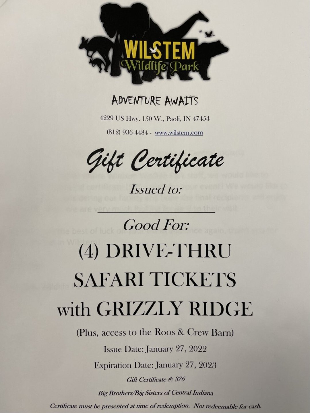 Adventure Time!1 Gift Certificate for four drive-thru safari tickets
