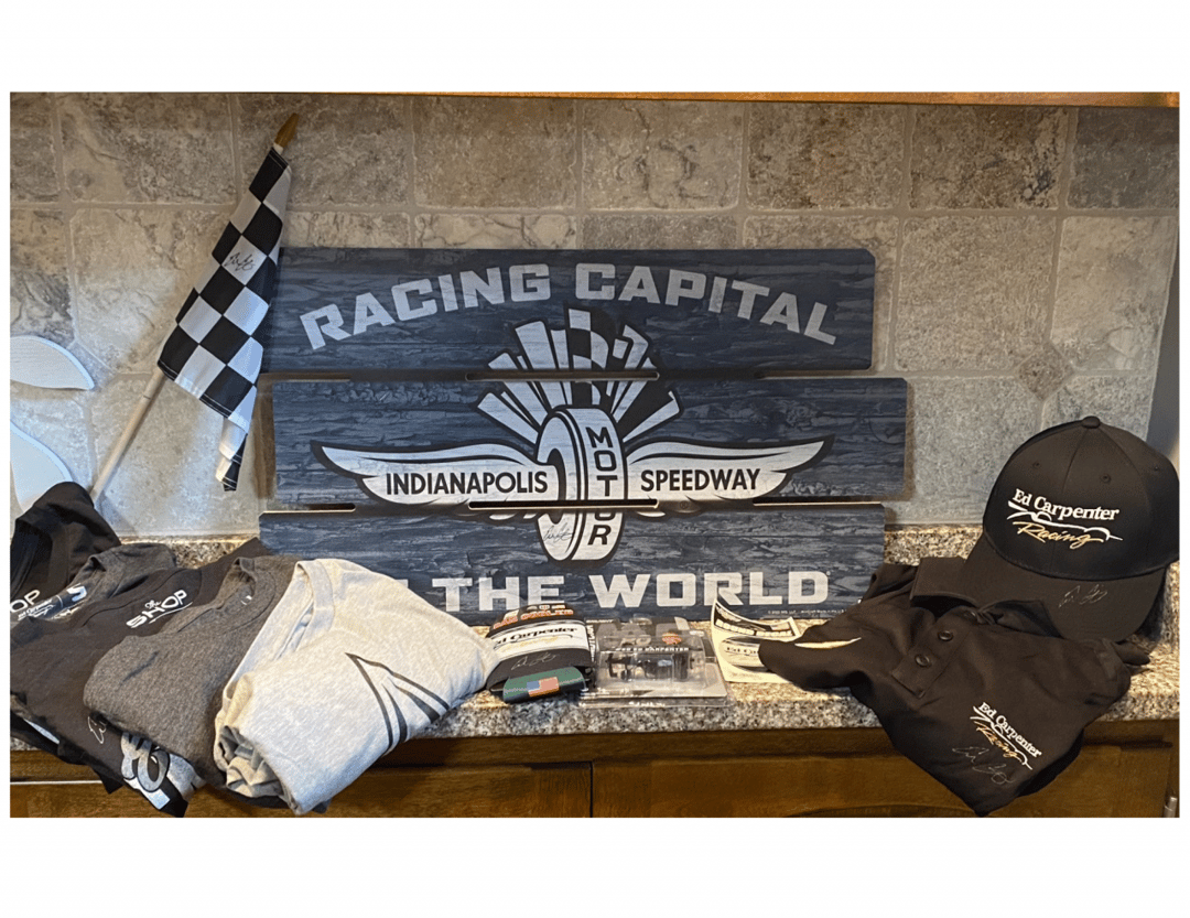 Indy Car Ed Carpenter Racing PackageAll Items Autographed by Ed Carpenter: IMS Wooden Sign, Adult ECR hat, Chevy ECR black polo shirt Adult Large, Light Gray United States Space Force ECR child size XL, 2 Gray ECR t-shirts in children's sizes large and small, 2 black "Carpenter 20" t-shirts in size Adult medium and large, checkered flag, ECR can cooler, USSF Ed Carpenter die cast car