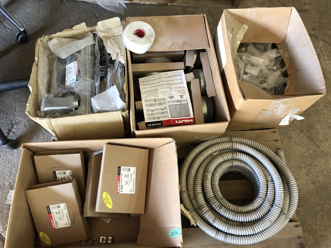 Weed eater power edge, STIHL trimmer, Impulse cordless power fastening system, Snap - on engine starter, STIHL concrete saw, STIHL concrete saw, STIHL concrete saw TS- 400, STIHL concrete saw TS 760, STIHL concrete saw, STIHL concrete saw, PARTNER K700 Concrete Saw, PARTNER K700 Concrete Saw, Husqvarna K3000 Wet Concrete, PARTNER K650 Concrete Saw, Makita power miter saw, Milwaukee chop saw, Milwaukee chop saw, Milwaukee chop saw, Sander, saber saw, drill, Jack stand, Jack, 2 STIHL Blowers, 3 STIHL Blowers, Grease pump, 4000 W Generator, Wire dispenser, MK - BBO Wet tile saw, IR INGERSOLL RAND Air compressor, JD 6200W Generator, Clipper concrete saw, Barrel cart, Barrel cart, Barrel cart, Barrel cart, 12 Ton shop press, Electric Heater, Starter, straps, Gas powered packer, Large steel tool box, 4000 W Generator with attached pump, Craftsman toolbox, creeper, wood box, Hydraulic jack, Hydraulic jack, 3 Electric concrete vibrators, 6 Power heads, Milwaukee frame drill, Concrete boring bits, 10 HPConcrete saw, Metal cart, Threading machine, 3 Wire rope slings, Aluminum toolbox, (16) buckets Blacktop Filler & Sealer, (13)Buckets blacktop filler & sealer, (10) Buckets blacktop sealer & sealer, NOS 3 HR Submersible sewage pump, , , Craftsman 1/3 hp grinder on pedestal, DANFOSS Refrigeration unit, DANFOSS Refrigeration unit, DANFOSS Refrigeration unit, DANFOSS Refrigeration unit, 14-04 Broadcast security cable, LUTRON GRAFIK EYE Cable, 14-04 Broadcast security cable, 18-02 Broadcast security table, 18 AWG Tinned 2 Cond Shld, 19 AWG Tinned 2 Cond Shld, 18-2C STR BC VN Tray cable, 18-2C STR BC VN Tray cable, 18-2C STR BC VN Tray cable, (4) 4-18 AWG Shielded tray cable, STSTIMAX GigaSPEED X10D Cable, Voice and data cable, 16-1P STR TNC PE Foil SHD, 14-04, 2 rolls 22AWG CL 2/CM, 4 rolls Cable, 4 rolls Cable, 3 Rolls cable, CoilPAK 10 - strand 600V gr wire, 3 partial Boxes of wiring, 6 Partial boxes of wiring, 4 Boxes of Cable, 4 Boxes of Cable, 2 Rolls metal – clad cable, 1 =Roll metal – clad cable, 1 roll 8/2 G Aluminum cable, 2 Rolls black cable, 2 Rolls cable, 1 Roll 12 AWG, 9 Rolls of wire, 18-04 OAS STR DBTC Quad, 1 Roll wire, 1 Roll wire, 1 Roll wire, 2 Heavy cables, 3 Rolls metal - clad cable, 1 Large roll 14-3C STR BC Tray cable, 3 Boxes wiring, 2 Boxes wiring, 2 Boxes voice and data cable, 7 Small rolls of wiring, 1 Roll 18AWG 8 cond SHLD, 3 Rolls 18AWG 2 COND, 2 Rolls 18AWG 2 COND, 1 Roll Black wire, wire rope (500ft), Reciprocating saw, Gardner - Denver balancer, Case of refrigeration lubricant, 3 Cases EATON circuit breakers (20)AMP, Coil of cable/pipe brackets, Plumbing - water hook up boxes, Plumbing - water hook up boxes, Plumbing - water hook up boxes, (9) 8x14 Metal vents, Circuit breaker enclosure, Heavy duty safety switch, Heavy duty safety switch, Heavy duty safety switch, (5) McCue Gard 24, ( 8) Gard 12, (12) McCue Gard 12,(5) Gard 24, (8) McCue Cartstop RE 2Corner, (3) McCue cartstop RE 2 corner, McCue guards, vertical sliding doors, Large pallet McCue carstop RE, Yard man blower, STIHL trimmer, 8 Heavy duty tool cases, 2 Milwaukee Tools cases 24 x 16, 10 Milwaukee tool cases 14 1/2 x 12, 10 Milwaukee tool cases 14 1/2 x 12, 10 Milwaukee tool cases 17 x 13, 9 Milwaukee tool cases 20 x 14, 6 Milwaukee tool cases 14 1/2 x 12, 7 Milwaukee tool cases 17 x 13, Water control valve, Squirrel cage blower part, 1 case foam door seals, 1 case foam door seals, 3 Metal vent, refrigerant strainer,, 3 Flats of copper fittings, 4 Flats of copper fittings, (4) cases Steel deck inserts, , Hardware, Wood cart with wheels, DAINKIN Air Conditioner, DAINKIN Air Conditioner, DAINKIN Air Conditioner, 3 Large first aid cabinets, 2 oil dispensers, 2 Oil dispensers, , PINGUINO 10,000 BTU Dehumidfier, Storage Tubes, 3 Wire 10 AWG 3-G electrical Cable, 3 Safety cones, drink cooler, 2 Wheel Cart, Firestone LT225/.75R16 Tire (8Lugs), Hydraulic hose with electric plug in, 8 Safety hard hats. NEW, 13 Safety hard hats NEW, CD player, RC aluminum toolbox, STIHL MS 170 Chainsaw with Case, STIHL MS 170 Chainsaw , ECHO QV 6700 Chainsaw, Tennant floor scrubber, Betco BR1500 Floor scrubber, Milwaukee sawszall with 2 batteries, HURST Hydraulic Spreader with , Hydraulic hoses, RC Tool Box, AC 225 AMP Lincwelder, STIHL MS 170 Chainsaw, STIHL MS 170 Chainsaw, HURST Hydraulic cutter, 4 FORD Rims, HURST hydraulic spreader, STROB Light - Roof mount, STROB Light - Roof mount, STROB Light - Roof mount, STROB Light - Roof mount, Honda Ventilation fan, HURST Hydraulic power unit,, HURST Hydraulic power unit,, Echo QV-8000 Chainsaw with, Ratchet hoist- Bebee Bros., Portable wire holder with 220, STIHL 020T Chainsaw, HANNAY Reels Empty school, SMITH Portable electric light with charger, Metal 4 Shelf rack, 4 Fire fighters helmets, HURST Spreader jaws, Portable electric cord 220 holder, (2) Loadlocks, Portable Oxygen cart, , , , , RYOBI Pressure Washer, RYOBI Pressure Washer, Office chair, Office chair, ORIFLOW Air Leakage Test equipment, 2 Boxes top beam clamps, washers, , HILTI Drop in devices, fire stop, Heavy duty 36 inch zip it, DeWalt Power, Wire, Wire, Wire, Wire, Wire, (4) Chain Reels, Slip joints, copper elbows, plumbing, HILTI Injectable adhesive anchors, HILTI Injectable adhesive anchors, HILTI Injectable adhesive anchors, HILTI Firestop Sealant (17), Hardware, washers, screws, Electrical, 3 boxes lineset cover system, Plumbing- Copper fittings,, Electrical-Screw connectors,, 6 CFM Optimizing accessory kits, 10 boxes Cushion clamps, 10 boxes Cushion clamps, Plumbing - 3/8" Beam clamps, Electrical, beam clamps, hardware, 1 box Air filters,, 2 Boxes air filters, Roll of cable 600 V, Delta Rockwell drill press, Squeegees and miscellaneous, NIB large piece of Glass , 3 Vacuum pumps, 3 Vacuum pumps, Black plastic crate, 4 Boxes of copper fittings, 4 Boxes of copper fittings, Plumbing, Electrical - Strut clamps, couplings, Electrical - fasteners,. Couplers,misc, 1 Case coil paks with calibrated flow , 2 Coil PAKS with M