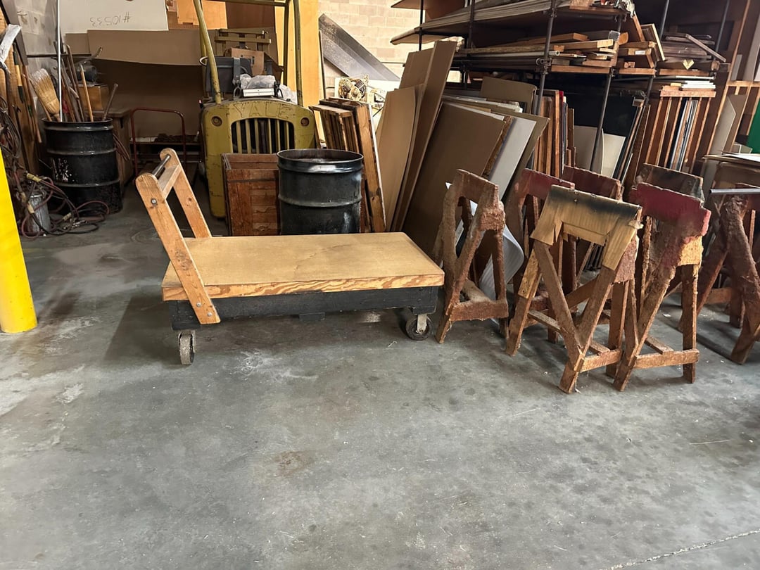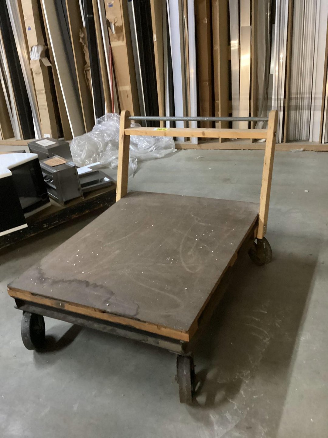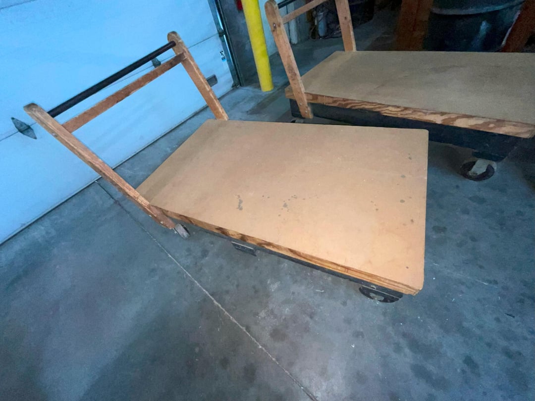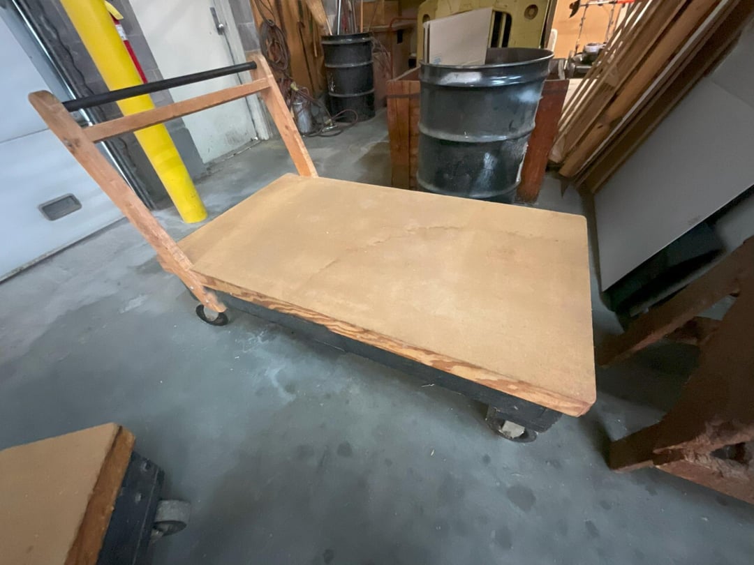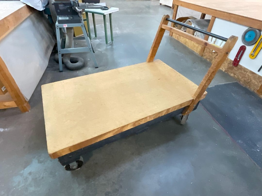 •Heavy wooden rolling shop cart