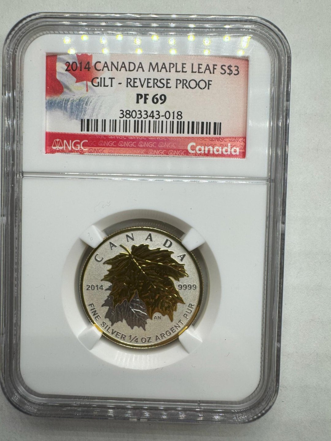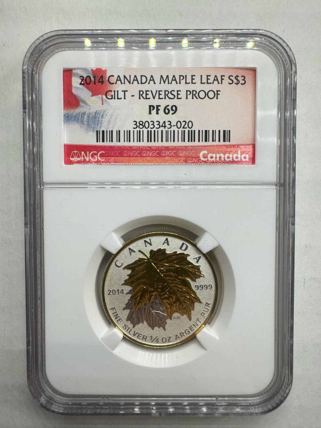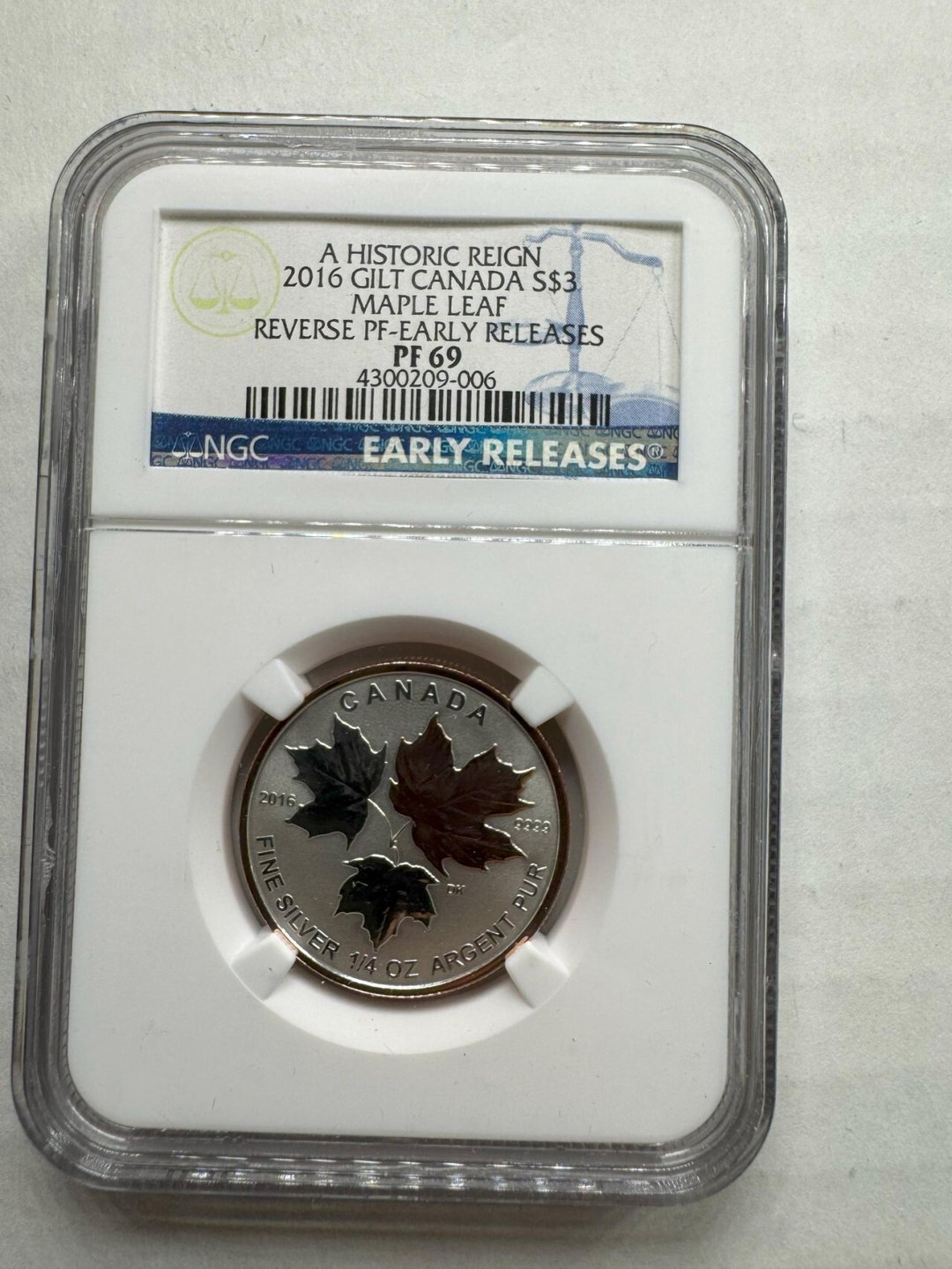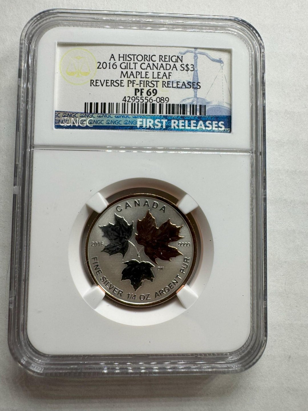 •A Historic Reign 2016 Gilt Canada S$3 Maple Leaf PF 69