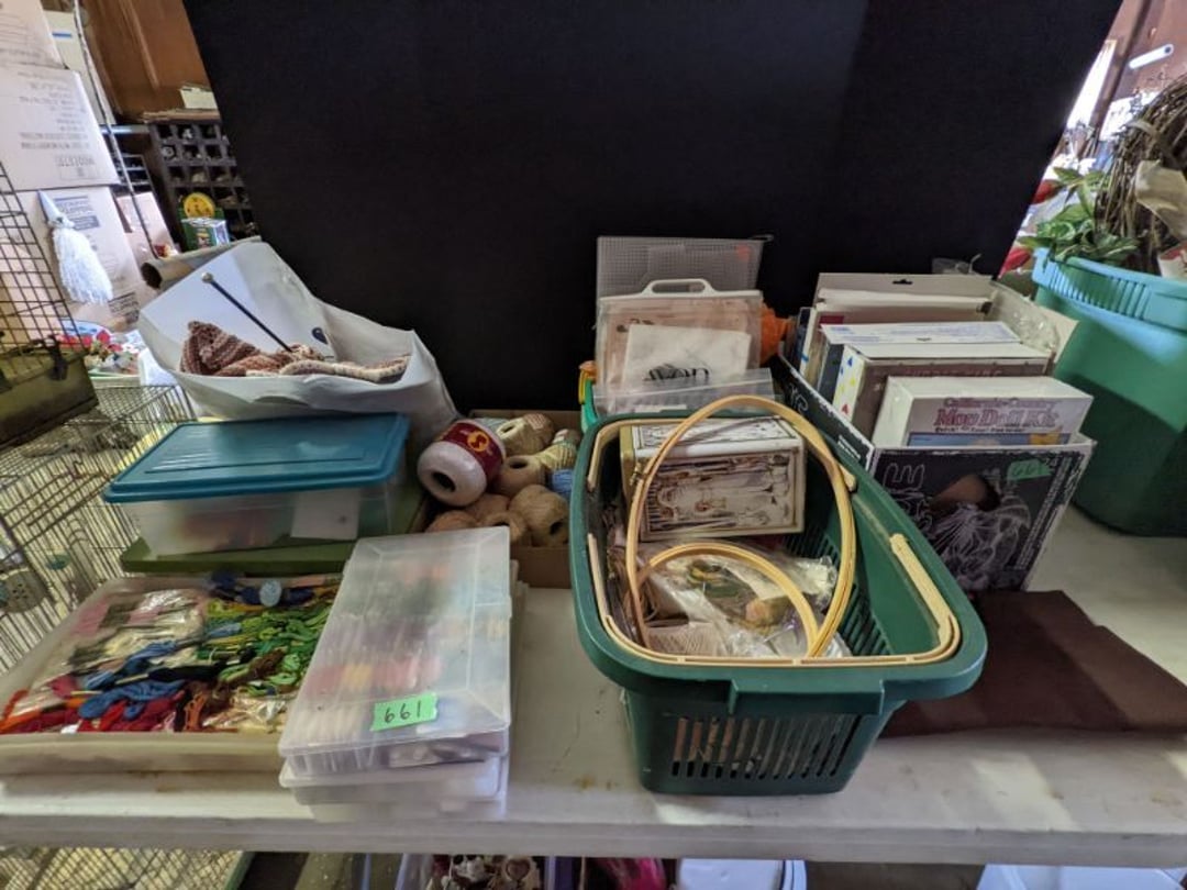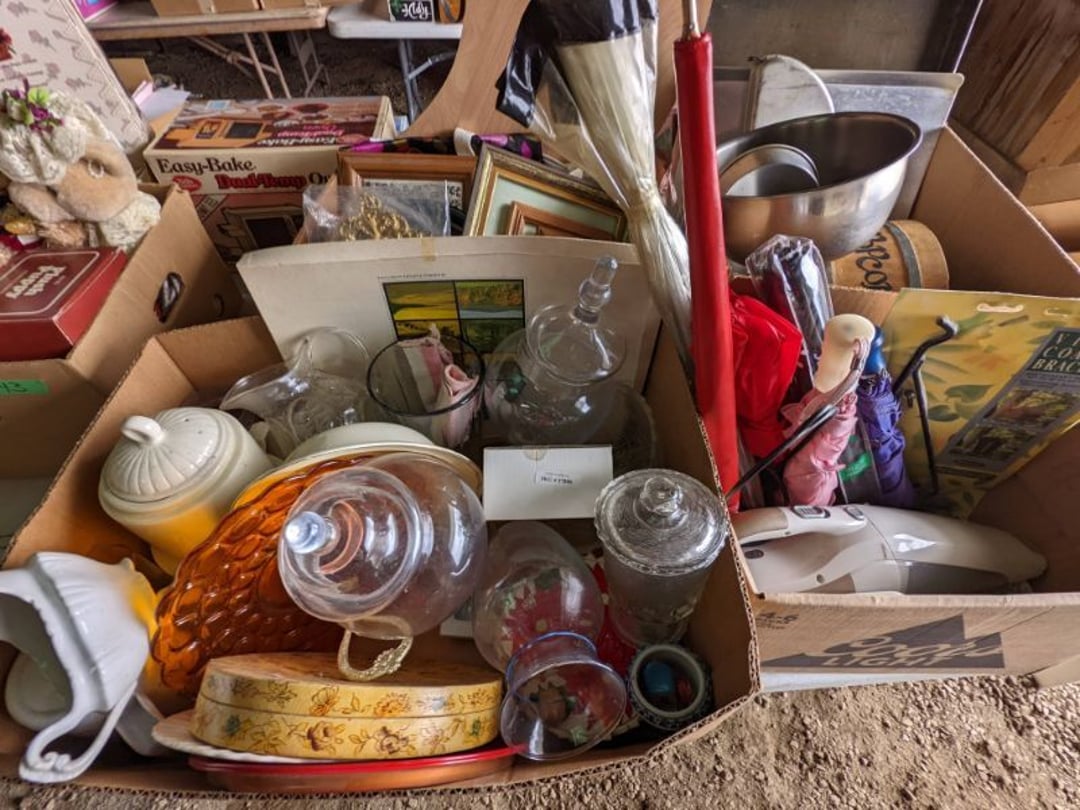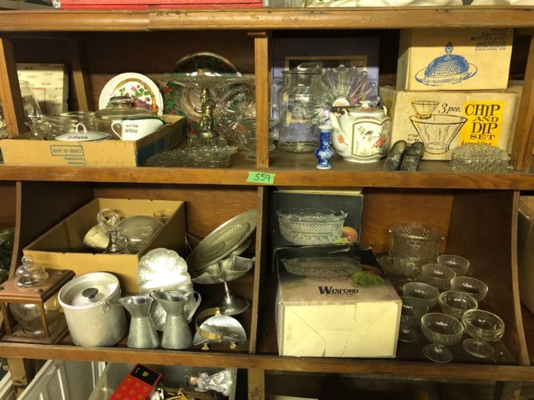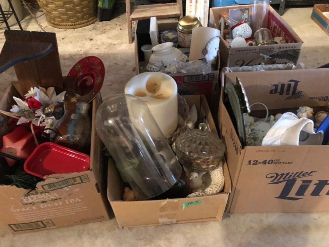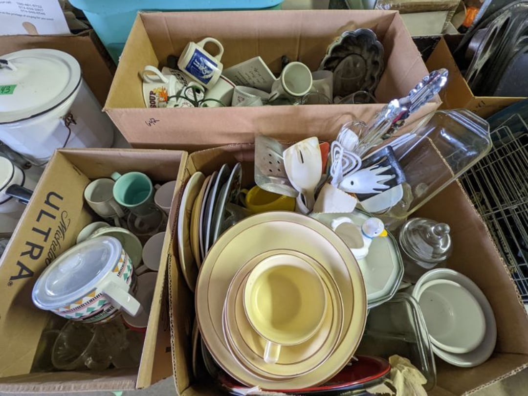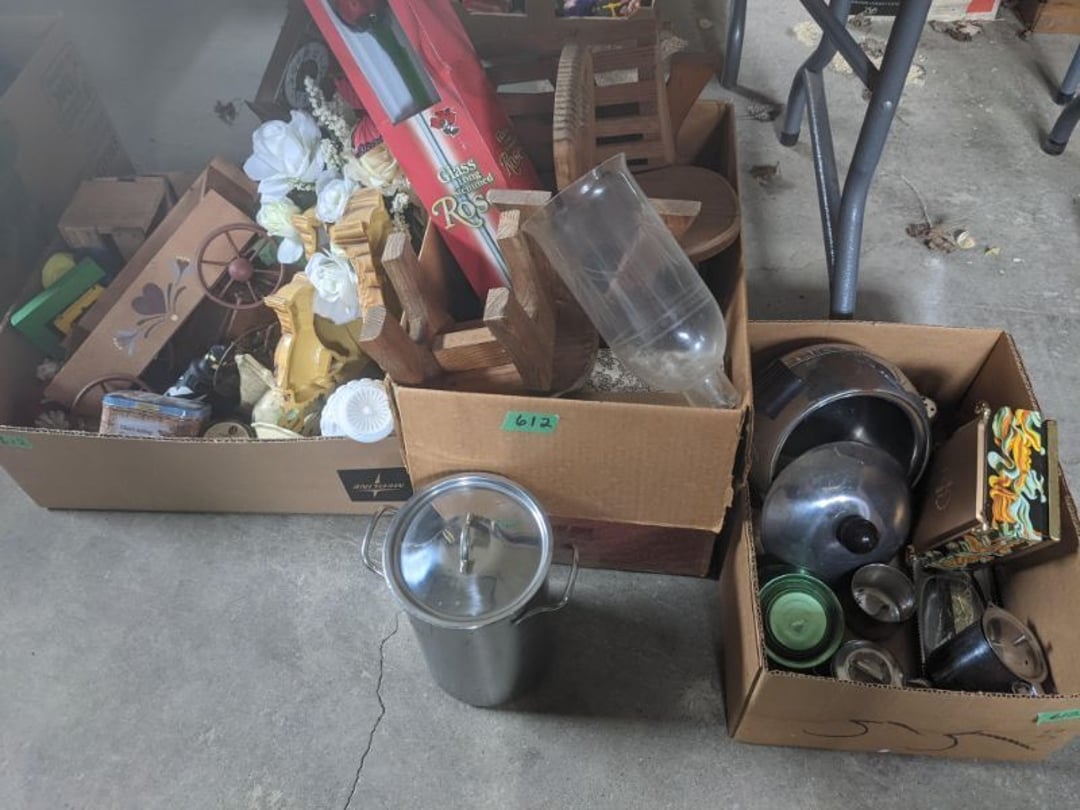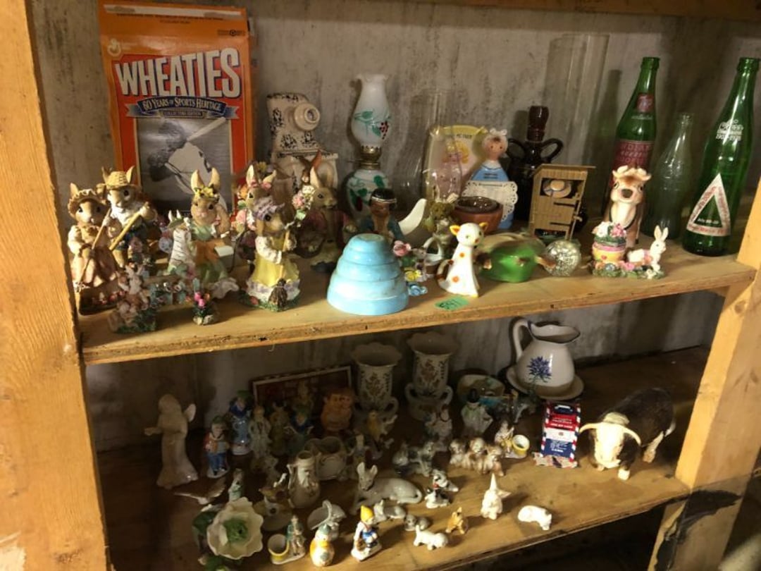 2 Griswold cast iron skillets, Salt and pepper shakers, blue Ball jars, refrigerator dishes, cookie jar, Pink rose dishes, Seyfert's pretzel jar, Jadite blossom design plate, Hull basket, Pink and cream small Hull vase, Roseville pitcher vase, Silver leaf glasses, Cast iron car, metal duck, metal horse bookend, ship bookend, Texaco pump, Glass fish, flower, vase, vintage bookends, bowl, planter, 3 piece moon and stars glassware, Fenton basket, fairy lights, misc glass, Pink, green, yellow depression dishes, Mayfair pink depression dishes, cracker jar, candy jar, 3 Mayfair pink depression bowls, Cast iron doorstop, 75 piece Homer Laughlin dogwood pattern dishes, Patton heater, small fan, Misc kitchenware, Strainer, 2 pressure cookers, Vintage Silvertone radio, 3 vintage ladies hats, 6 men's hats, Magnavox CD player and cassette recorder, cassettes, Juliette Eight Track Stereo player, 8 tracks, Sony fm/am stereo cassette recorder, cassettes, Crocks, sad iron, Vintage kitchenware, DVDs, 37 piece Homer Laughlin Georgian Eggshell dishes, Basket of glass vegetables, Vintage child's dishes, 2 pieces candle wick, 1 American sweetheart plate, 3 pieces bubbleglass, novelties and advertising, violin, 2 Furbys, Dubl Handi washboard, 2 feed bags, 2 cuckoo clocks both made in Germany, 29 pieces of misc Corelle, 95+ pieces of Lazy Daisy Corelle and flatware, 8 Pyrex mixing bowls, 2 Pyrex measuring pitchers, Copper boiler (rusty), vintage pot (chipped), American Tourister suitcase, Holiday decorations, Pots and pans with tote, Cleaning supplies, wire racks, Vintage handmade quilt, Signed handmade quilt, Comforter (damaged), 17 Life magazines from 1969 and 1971, 1969 Sears catalog, Handmade cross stitch flower quilt, State bird needlepoint quilt 96" x 68", Handmade signed quilt 108" x 84", Pyrex 3 piece casseroles, Commodore vintage computer, misc computer equipment, Bell & Howell movie projector, Quilt rack, automatic knitter, Small metal cabinet, Body power inversion table, Vitamaster 1000 XT exercise bike, Craft supplies and metal rack, Coppertone rack with sewing supplies and glassware, Coppertone rack with glassware, pop bottles, ceramic statutes, Record albums, Chalkboard, 3 mirrors, Fossil advertising sign, Metal plant stand, Craft supplies, material, doll heads, toolbox w/paints, metal rack, Weber small grill, 9' x 13' screen house, 3 wooden folding chairs, metal folding chair, 2 lawn chairs, 4 cushions, Belt buckles, knives, lighters, cuff links, hand warmers, Jewelry and jewelry boxes, Cat's eye ring, Logger, chicken wire, watering can, pavers, magnet, 2 boxes of canning jars, Whirlpool hot spa, Matmassager, Chi machine, exercise equipment, Painting supplies, small trash can, plastic baskets, Yard and garden tools, Adams Central letter jacket and t-shirt, Hammock, 2 folding lawn chairs, NIB heavy-duty shelving, Nib Proctor Silex coffee maker, rock garden, Nib Shiatsu foot massager, nib Snuggie, Staple gun, hammers, knives, screwdrivers, Champion socket set, Air pump, light bulbs, smoke alarms, hole saw set, glue gun, parts bin, 3 license plates, Kerosene heater, Patton electric heater, Magnifying lamp, bungee cords, batteries, oil can, Rubbermaid medium size cooler, Igloo polar roller 60 quart cooler, Metal shelving with glassware, stemware, vases, pots, plant stands, buckets, Metal shelving with garden supplies, small wooden ladder, bowling ball, Metal shelving with Memories of Yesterday and misc figurines, Large new extension cord, 3 aluminum treble lights, 2 Blue Mountain 2 piece rainsuits, small Comfort Zone heater, GE HEPA air purifier, Storage totes and containers misc sizes, 3 boxes of décor, Hand blown art glass, 7 pieces of Lefton china, glass basket and animals, Precious Moments collection, Precious Moments musical Ferris wheel, town buildings, books, Precious Moments train, nativity, 14 misc pieces, Brinn's musical dolls, Sleigh bells, 2 vintage bird pictures with feathers, Quilt top 74" x 90", Vintage marbles, Cast iron collection, Wicker planter, Garden statues, 2 photo screens, Vintage light-up Santa and snowman, Huge assortment of Christmas, 3 piece Roseville, Vases and decorator pieces, 18" green plate, glass decorator pieces, 46" x 36" drop leaf table with 2 chairs, Glassware, Americana Star stainless steel flatware service for 12 with chest, Oneida Wm A Rogers AI Plus flatware, 3 pieces silver plated items, Wm Rogers silver tea set, casserole, cutlery, cake knife, Silver plated assortment, 18" tall metal patio table, 5 garden statues, Large sitting angel cement statue, 4 plant stands, Vintage large green glass vase, large artificial rose, Heavy metal stand with glass shelves, wooden cabinet with contents, Misc wall items, Vintage metal serving cart, Microwave and cart, wall décor, Advertising yardsticks, grabber, dusters, gloves, Toshiba 19" television with remote, 6" pasta machine, metal kitchen utensils, warming tray, Office supplies, Kitchen table with 1 leaf and 6 chairs with wheels, Rival electric slicer, Primo water dispenser, Wm Rogers "Harvest" pitcher, Leonard silver plated pitcher, misc silver pieces, Heavy vintage glass pitcher, spongeware bowl, 3 crock bowls, coffee urn, 7 "The Young and the Restless" collector plates, record of "Nadia's Theme", Leonard silver plated pitcher, 2 silver plated cups, William Rogers candlesticks, Fire King baking dishes, 2 casseroles, Pyrex casserole, Misc Corningware and Fire King, 2 boxes of 25 Boopie stemware, Wooden bull, F B Rogers Silver Company tea set - Sugar and creamer, footed waste, Sharp Carousel microwave, Glitter lava-type lamp, dancing clown music box, 20+ pieces of mushroom design kitchen set, 2 boxes of flatware, 1 boxes of knives, sharpening steel, Vintage elephant cookie jar, 8 pieces Lefton china, 12 pieces Pink Rose Lefton china, McCoy cookie jar, 4 boxes of kitchen utensils, Joseph Rogers Jr & Sons drum with case and drum sticks, Bissel Powerforce bagless vacuum, Vintage Shirley Temple "First Vacation" doll, Vin