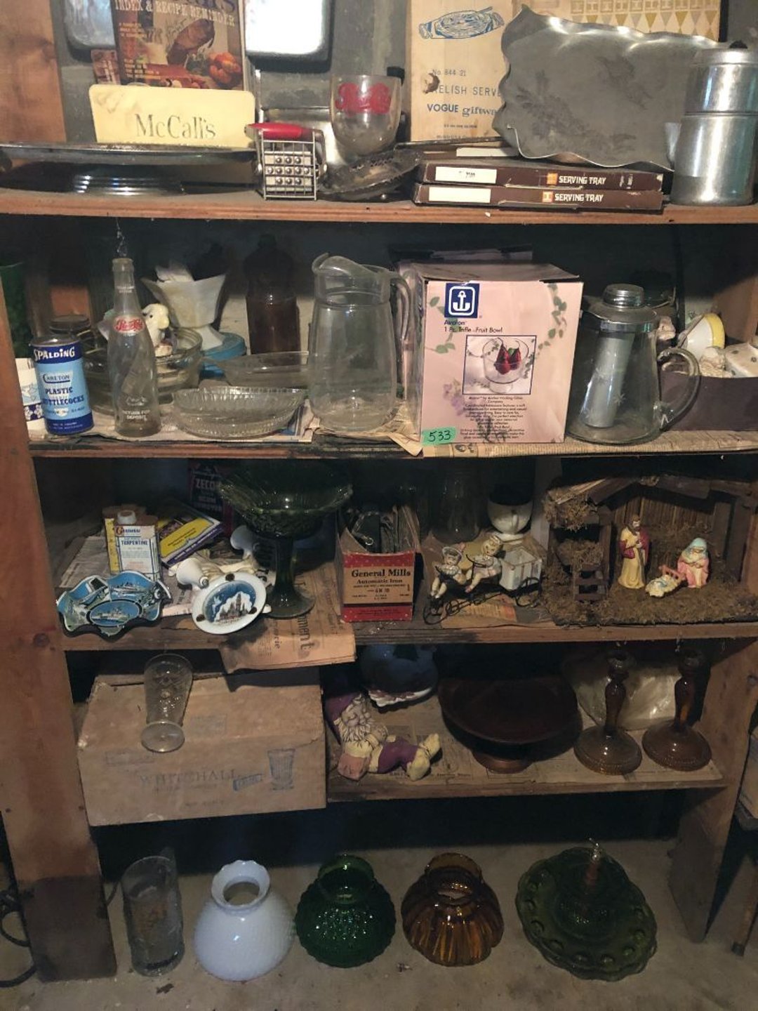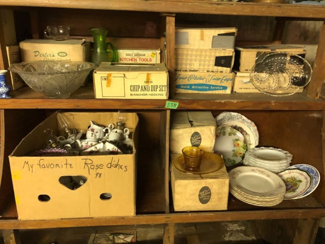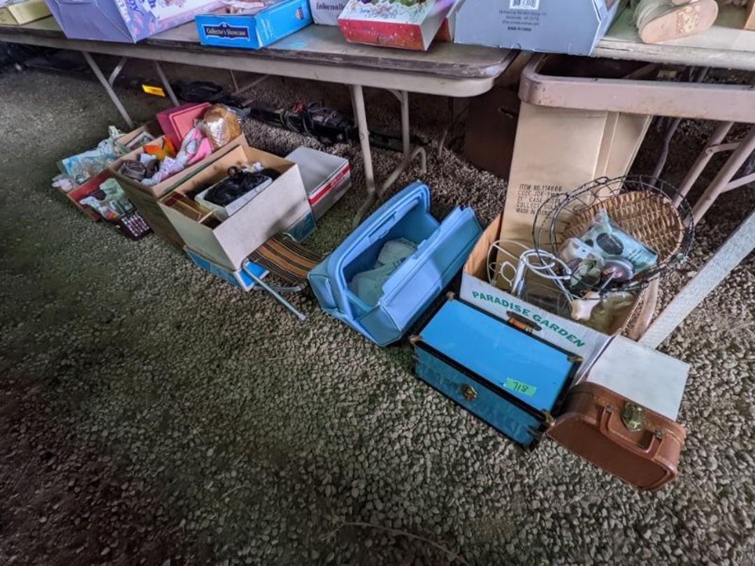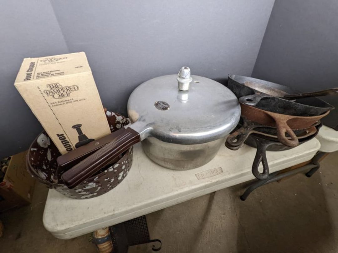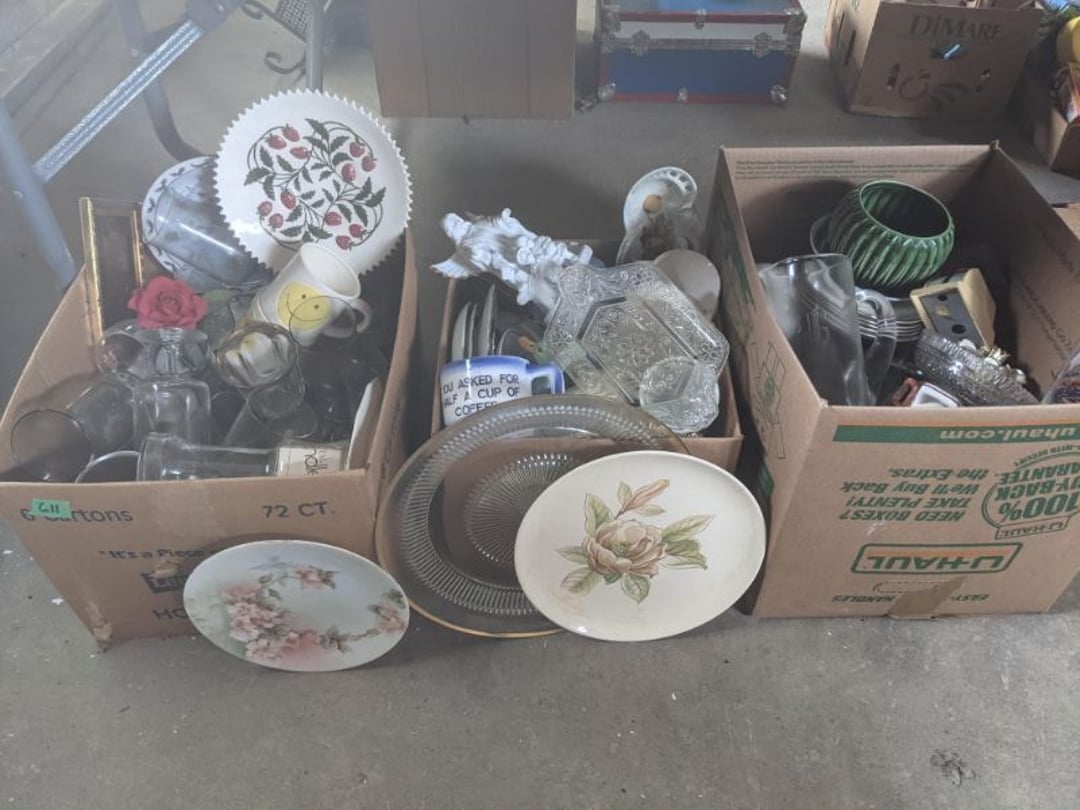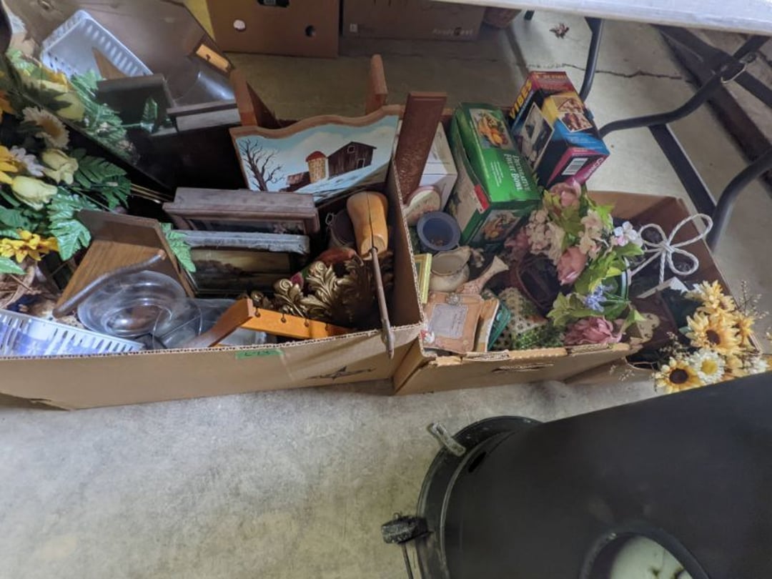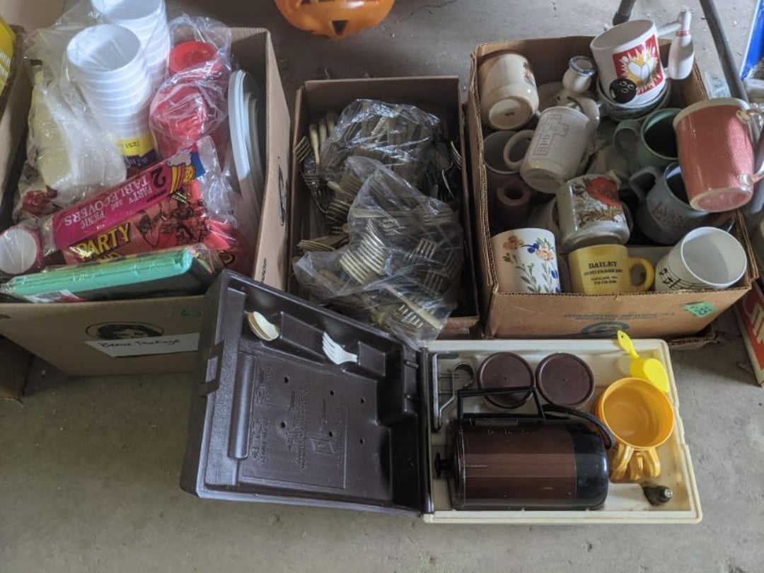 2 Griswold cast iron skillets, Salt and pepper shakers, blue Ball jars, refrigerator dishes, cookie jar, Pink rose dishes, Seyfert's pretzel jar, Jadite blossom design plate, Hull basket, Pink and cream small Hull vase, Roseville pitcher vase, Silver leaf glasses, Cast iron car, metal duck, metal horse bookend, ship bookend, Texaco pump, Glass fish, flower, vase, vintage bookends, bowl, planter, 3 piece moon and stars glassware, Fenton basket, fairy lights, misc glass, Pink, green, yellow depression dishes, Mayfair pink depression dishes, cracker jar, candy jar, 3 Mayfair pink depression bowls, Cast iron doorstop, 75 piece Homer Laughlin dogwood pattern dishes, Patton heater, small fan, Misc kitchenware, Strainer, 2 pressure cookers, Vintage Silvertone radio, 3 vintage ladies hats, 6 men's hats, Magnavox CD player and cassette recorder, cassettes, Juliette Eight Track Stereo player, 8 tracks, Sony fm/am stereo cassette recorder, cassettes, Crocks, sad iron, Vintage kitchenware, DVDs, 37 piece Homer Laughlin Georgian Eggshell dishes, Basket of glass vegetables, Vintage child's dishes, 2 pieces candle wick, 1 American sweetheart plate, 3 pieces bubbleglass, novelties and advertising, violin, 2 Furbys, Dubl Handi washboard, 2 feed bags, 2 cuckoo clocks both made in Germany, 29 pieces of misc Corelle, 95+ pieces of Lazy Daisy Corelle and flatware, 8 Pyrex mixing bowls, 2 Pyrex measuring pitchers, Copper boiler (rusty), vintage pot (chipped), American Tourister suitcase, Holiday decorations, Pots and pans with tote, Cleaning supplies, wire racks, Vintage handmade quilt, Signed handmade quilt, Comforter (damaged), 17 Life magazines from 1969 and 1971, 1969 Sears catalog, Handmade cross stitch flower quilt, State bird needlepoint quilt 96" x 68", Handmade signed quilt 108" x 84", Pyrex 3 piece casseroles, Commodore vintage computer, misc computer equipment, Bell & Howell movie projector, Quilt rack, automatic knitter, Small metal cabinet, Body power inversion table, Vitamaster 1000 XT exercise bike, Craft supplies and metal rack, Coppertone rack with sewing supplies and glassware, Coppertone rack with glassware, pop bottles, ceramic statutes, Record albums, Chalkboard, 3 mirrors, Fossil advertising sign, Metal plant stand, Craft supplies, material, doll heads, toolbox w/paints, metal rack, Weber small grill, 9' x 13' screen house, 3 wooden folding chairs, metal folding chair, 2 lawn chairs, 4 cushions, Belt buckles, knives, lighters, cuff links, hand warmers, Jewelry and jewelry boxes, Cat's eye ring, Logger, chicken wire, watering can, pavers, magnet, 2 boxes of canning jars, Whirlpool hot spa, Matmassager, Chi machine, exercise equipment, Painting supplies, small trash can, plastic baskets, Yard and garden tools, Adams Central letter jacket and t-shirt, Hammock, 2 folding lawn chairs, NIB heavy-duty shelving, Nib Proctor Silex coffee maker, rock garden, Nib Shiatsu foot massager, nib Snuggie, Staple gun, hammers, knives, screwdrivers, Champion socket set, Air pump, light bulbs, smoke alarms, hole saw set, glue gun, parts bin, 3 license plates, Kerosene heater, Patton electric heater, Magnifying lamp, bungee cords, batteries, oil can, Rubbermaid medium size cooler, Igloo polar roller 60 quart cooler, Metal shelving with glassware, stemware, vases, pots, plant stands, buckets, Metal shelving with garden supplies, small wooden ladder, bowling ball, Metal shelving with Memories of Yesterday and misc figurines, Large new extension cord, 3 aluminum treble lights, 2 Blue Mountain 2 piece rainsuits, small Comfort Zone heater, GE HEPA air purifier, Storage totes and containers misc sizes, 3 boxes of décor, Hand blown art glass, 7 pieces of Lefton china, glass basket and animals, Precious Moments collection, Precious Moments musical Ferris wheel, town buildings, books, Precious Moments train, nativity, 14 misc pieces, Brinn's musical dolls, Sleigh bells, 2 vintage bird pictures with feathers, Quilt top 74" x 90", Vintage marbles, Cast iron collection, Wicker planter, Garden statues, 2 photo screens, Vintage light-up Santa and snowman, Huge assortment of Christmas, 3 piece Roseville, Vases and decorator pieces, 18" green plate, glass decorator pieces, 46" x 36" drop leaf table with 2 chairs, Glassware, Americana Star stainless steel flatware service for 12 with chest, Oneida Wm A Rogers AI Plus flatware, 3 pieces silver plated items, Wm Rogers silver tea set, casserole, cutlery, cake knife, Silver plated assortment, 18" tall metal patio table, 5 garden statues, Large sitting angel cement statue, 4 plant stands, Vintage large green glass vase, large artificial rose, Heavy metal stand with glass shelves, wooden cabinet with contents, Misc wall items, Vintage metal serving cart, Microwave and cart, wall décor, Advertising yardsticks, grabber, dusters, gloves, Toshiba 19" television with remote, 6" pasta machine, metal kitchen utensils, warming tray, Office supplies, Kitchen table with 1 leaf and 6 chairs with wheels, Rival electric slicer, Primo water dispenser, Wm Rogers "Harvest" pitcher, Leonard silver plated pitcher, misc silver pieces, Heavy vintage glass pitcher, spongeware bowl, 3 crock bowls, coffee urn, 7 "The Young and the Restless" collector plates, record of "Nadia's Theme", Leonard silver plated pitcher, 2 silver plated cups, William Rogers candlesticks, Fire King baking dishes, 2 casseroles, Pyrex casserole, Misc Corningware and Fire King, 2 boxes of 25 Boopie stemware, Wooden bull, F B Rogers Silver Company tea set - Sugar and creamer, footed waste, Sharp Carousel microwave, Glitter lava-type lamp, dancing clown music box, 20+ pieces of mushroom design kitchen set, 2 boxes of flatware, 1 boxes of knives, sharpening steel, Vintage elephant cookie jar, 8 pieces Lefton china, 12 pieces Pink Rose Lefton china, McCoy cookie jar, 4 boxes of kitchen utensils, Joseph Rogers Jr & Sons drum with case and drum sticks, Bissel Powerforce bagless vacuum, Vintage Shirley Temple "First Vacation" doll, Vin
