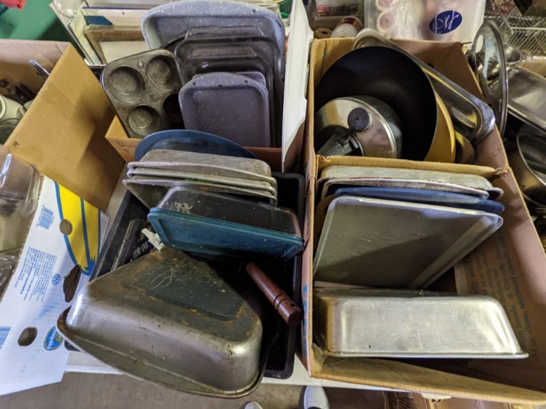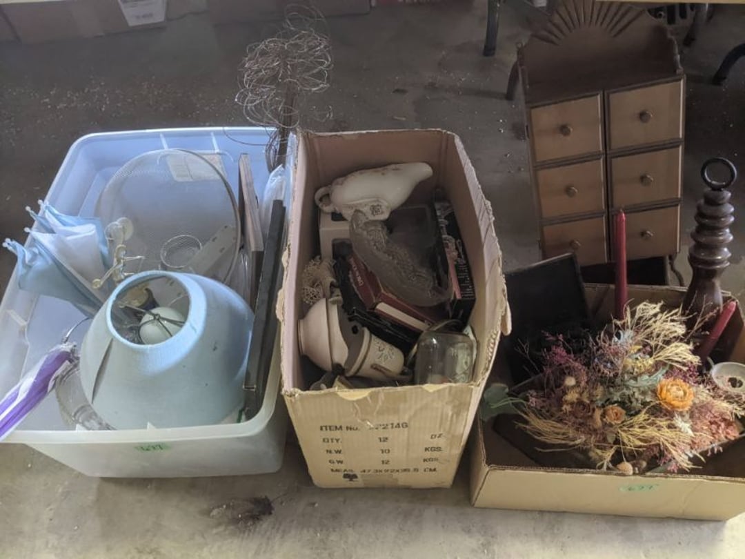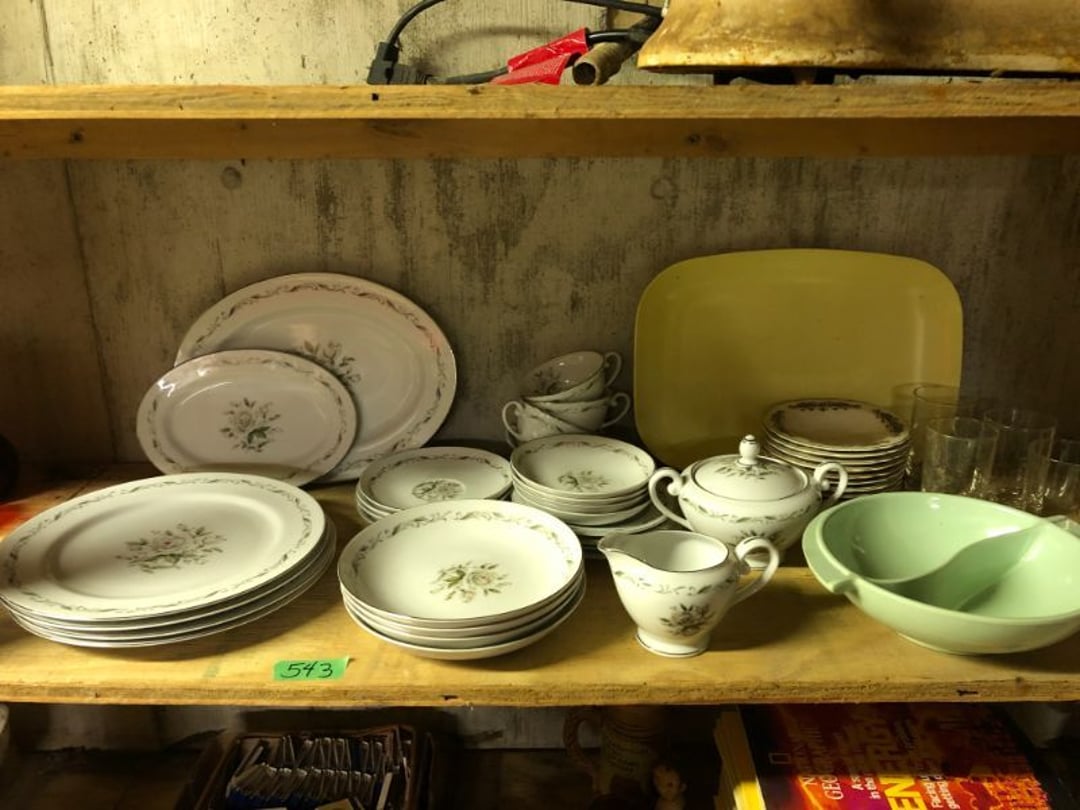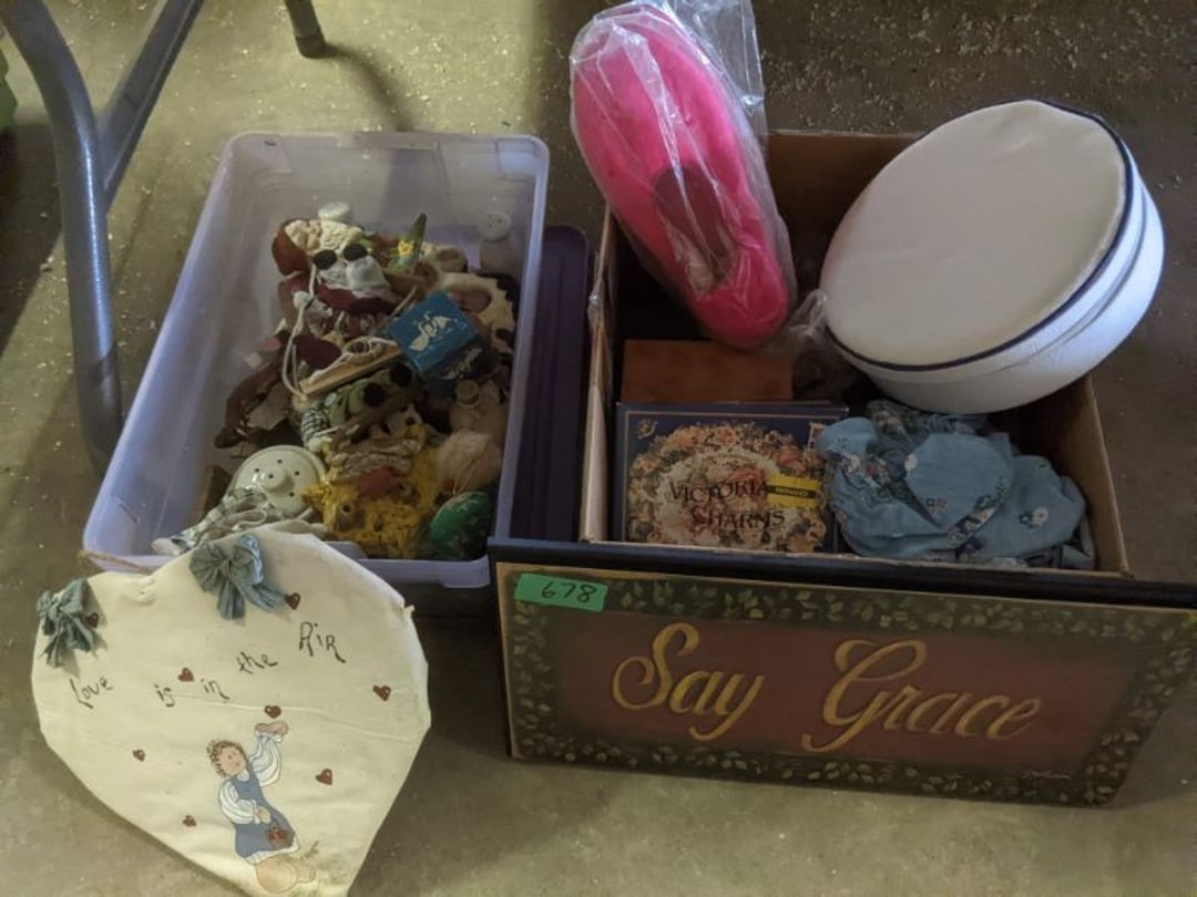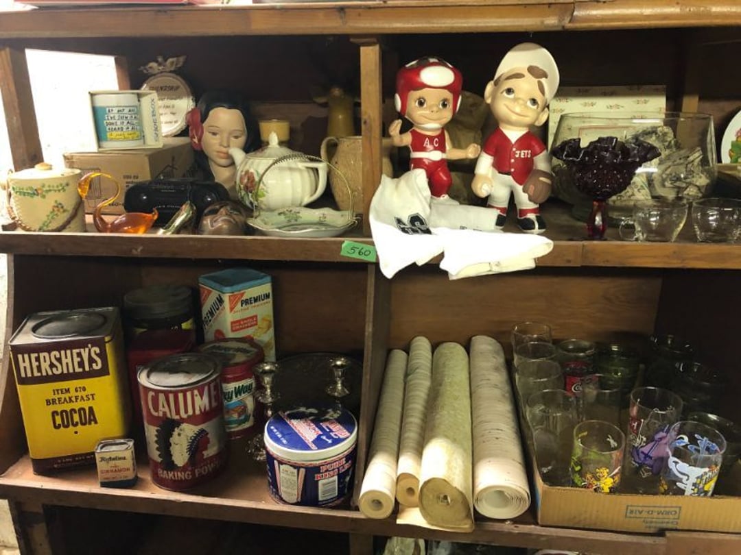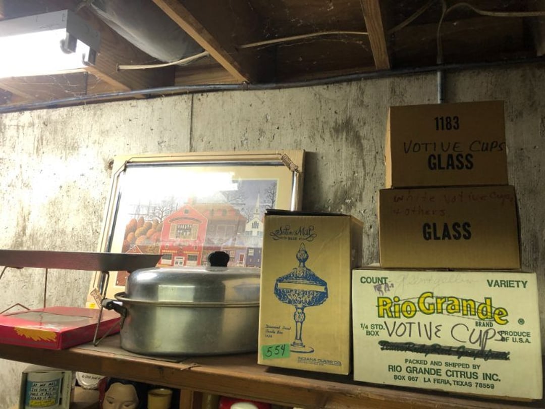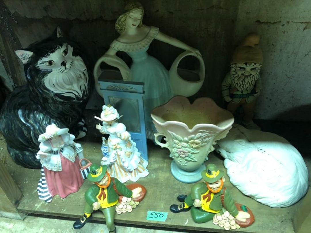2 Griswold cast iron skillets, Salt and pepper shakers, blue Ball jars, refrigerator dishes, cookie jar, Pink rose dishes, Seyfert's pretzel jar, Jadite blossom design plate, Hull basket, Pink and cream small Hull vase, Roseville pitcher vase, Silver leaf glasses, Cast iron car, metal duck, metal horse bookend, ship bookend, Texaco pump, Glass fish, flower, vase, vintage bookends, bowl, planter, 3 piece moon and stars glassware, Fenton basket, fairy lights, misc glass, Pink, green, yellow depression dishes, Mayfair pink depression dishes, cracker jar, candy jar, 3 Mayfair pink depression bowls, Cast iron doorstop, 75 piece Homer Laughlin dogwood pattern dishes, Patton heater, small fan, Misc kitchenware, Strainer, 2 pressure cookers, Vintage Silvertone radio, 3 vintage ladies hats, 6 men's hats, Magnavox CD player and cassette recorder, cassettes, Juliette Eight Track Stereo player, 8 tracks, Sony fm/am stereo cassette recorder, cassettes, Crocks, sad iron, Vintage kitchenware, DVDs, 37 piece Homer Laughlin Georgian Eggshell dishes, Basket of glass vegetables, Vintage child's dishes, 2 pieces candle wick, 1 American sweetheart plate, 3 pieces bubbleglass, novelties and advertising, violin, 2 Furbys, Dubl Handi washboard, 2 feed bags, 2 cuckoo clocks both made in Germany, 29 pieces of misc Corelle, 95+ pieces of Lazy Daisy Corelle and flatware, 8 Pyrex mixing bowls, 2 Pyrex measuring pitchers, Copper boiler (rusty), vintage pot (chipped), American Tourister suitcase, Holiday decorations, Pots and pans with tote, Cleaning supplies, wire racks, Vintage handmade quilt, Signed handmade quilt, Comforter (damaged), 17 Life magazines from 1969 and 1971, 1969 Sears catalog, Handmade cross stitch flower quilt, State bird needlepoint quilt 96" x 68", Handmade signed quilt 108" x 84", Pyrex 3 piece casseroles, Commodore vintage computer, misc computer equipment, Bell & Howell movie projector, Quilt rack, automatic knitter, Small metal cabinet, Body power inversion table, Vitamaster 1000 XT exercise bike, Craft supplies and metal rack, Coppertone rack with sewing supplies and glassware, Coppertone rack with glassware, pop bottles, ceramic statutes, Record albums, Chalkboard, 3 mirrors, Fossil advertising sign, Metal plant stand, Craft supplies, material, doll heads, toolbox w/paints, metal rack, Weber small grill, 9' x 13' screen house, 3 wooden folding chairs, metal folding chair, 2 lawn chairs, 4 cushions, Belt buckles, knives, lighters, cuff links, hand warmers, Jewelry and jewelry boxes, Cat's eye ring, Logger, chicken wire, watering can, pavers, magnet, 2 boxes of canning jars, Whirlpool hot spa, Matmassager, Chi machine, exercise equipment, Painting supplies, small trash can, plastic baskets, Yard and garden tools, Adams Central letter jacket and t-shirt, Hammock, 2 folding lawn chairs, NIB heavy-duty shelving, Nib Proctor Silex coffee maker, rock garden, Nib Shiatsu foot massager, nib Snuggie, Staple gun, hammers, knives, screwdrivers, Champion socket set, Air pump, light bulbs, smoke alarms, hole saw set, glue gun, parts bin, 3 license plates, Kerosene heater, Patton electric heater, Magnifying lamp, bungee cords, batteries, oil can, Rubbermaid medium size cooler, Igloo polar roller 60 quart cooler, Metal shelving with glassware, stemware, vases, pots, plant stands, buckets, Metal shelving with garden supplies, small wooden ladder, bowling ball, Metal shelving with Memories of Yesterday and misc figurines, Large new extension cord, 3 aluminum treble lights, 2 Blue Mountain 2 piece rainsuits, small Comfort Zone heater, GE HEPA air purifier, Storage totes and containers misc sizes, 3 boxes of décor, Hand blown art glass, 7 pieces of Lefton china, glass basket and animals, Precious Moments collection, Precious Moments musical Ferris wheel, town buildings, books, Precious Moments train, nativity, 14 misc pieces, Brinn's musical dolls, Sleigh bells, 2 vintage bird pictures with feathers, Quilt top 74" x 90", Vintage marbles, Cast iron collection, Wicker planter, Garden statues, 2 photo screens, Vintage light-up Santa and snowman, Huge assortment of Christmas, 3 piece Roseville, Vases and decorator pieces, 18" green plate, glass decorator pieces, 46" x 36" drop leaf table with 2 chairs, Glassware, Americana Star stainless steel flatware service for 12 with chest, Oneida Wm A Rogers AI Plus flatware, 3 pieces silver plated items, Wm Rogers silver tea set, casserole, cutlery, cake knife, Silver plated assortment, 18" tall metal patio table, 5 garden statues, Large sitting angel cement statue, 4 plant stands, Vintage large green glass vase, large artificial rose, Heavy metal stand with glass shelves, wooden cabinet with contents, Misc wall items, Vintage metal serving cart, Microwave and cart, wall décor, Advertising yardsticks, grabber, dusters, gloves, Toshiba 19" television with remote, 6" pasta machine, metal kitchen utensils, warming tray, Office supplies, Kitchen table with 1 leaf and 6 chairs with wheels, Rival electric slicer, Primo water dispenser, Wm Rogers "Harvest" pitcher, Leonard silver plated pitcher, misc silver pieces, Heavy vintage glass pitcher, spongeware bowl, 3 crock bowls, coffee urn, 7 "The Young and the Restless" collector plates, record of "Nadia's Theme", Leonard silver plated pitcher, 2 silver plated cups, William Rogers candlesticks, Fire King baking dishes, 2 casseroles, Pyrex casserole, Misc Corningware and Fire King, 2 boxes of 25 Boopie stemware, Wooden bull, F B Rogers Silver Company tea set - Sugar and creamer, footed waste, Sharp Carousel microwave, Glitter lava-type lamp, dancing clown music box, 20+ pieces of mushroom design kitchen set, 2 boxes of flatware, 1 boxes of knives, sharpening steel, Vintage elephant cookie jar, 8 pieces Lefton china, 12 pieces Pink Rose Lefton china, McCoy cookie jar, 4 boxes of kitchen utensils, Joseph Rogers Jr & Sons drum with case and drum sticks, Bissel Powerforce bagless vacuum, Vintage Shirley Temple "First Vacation" doll, Vin