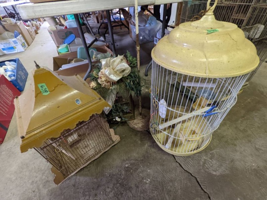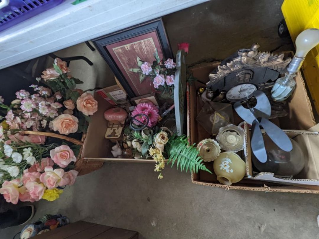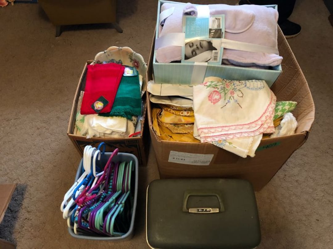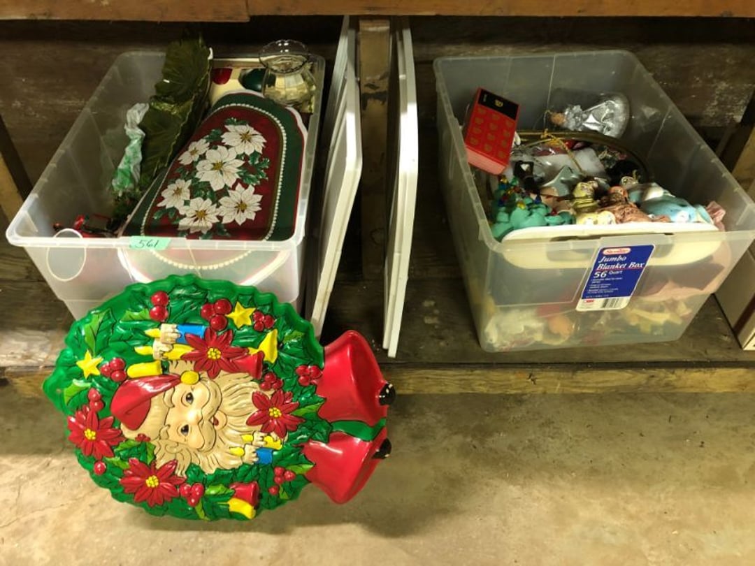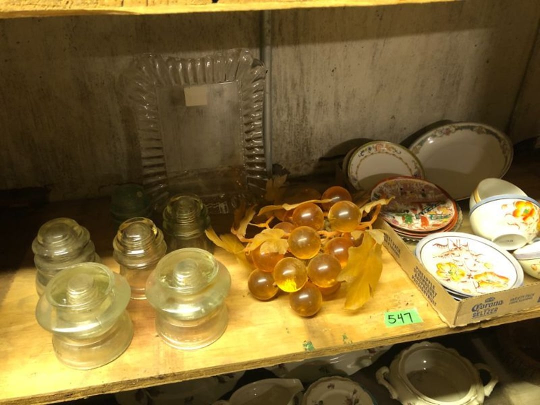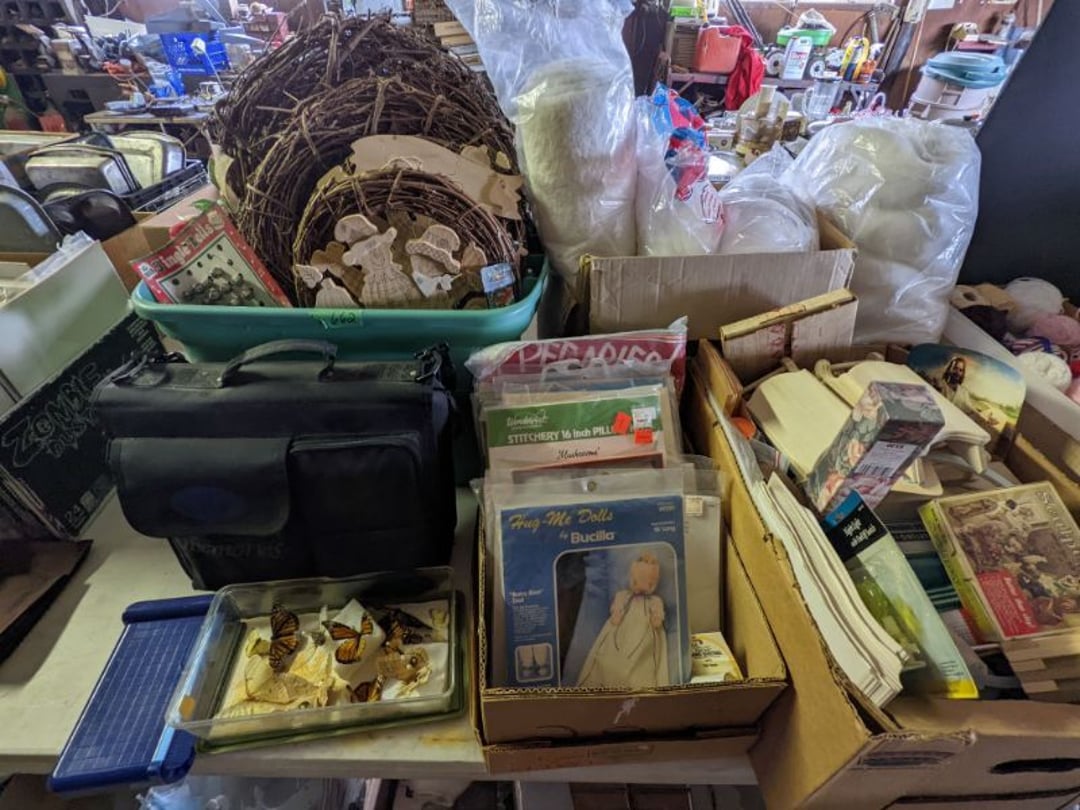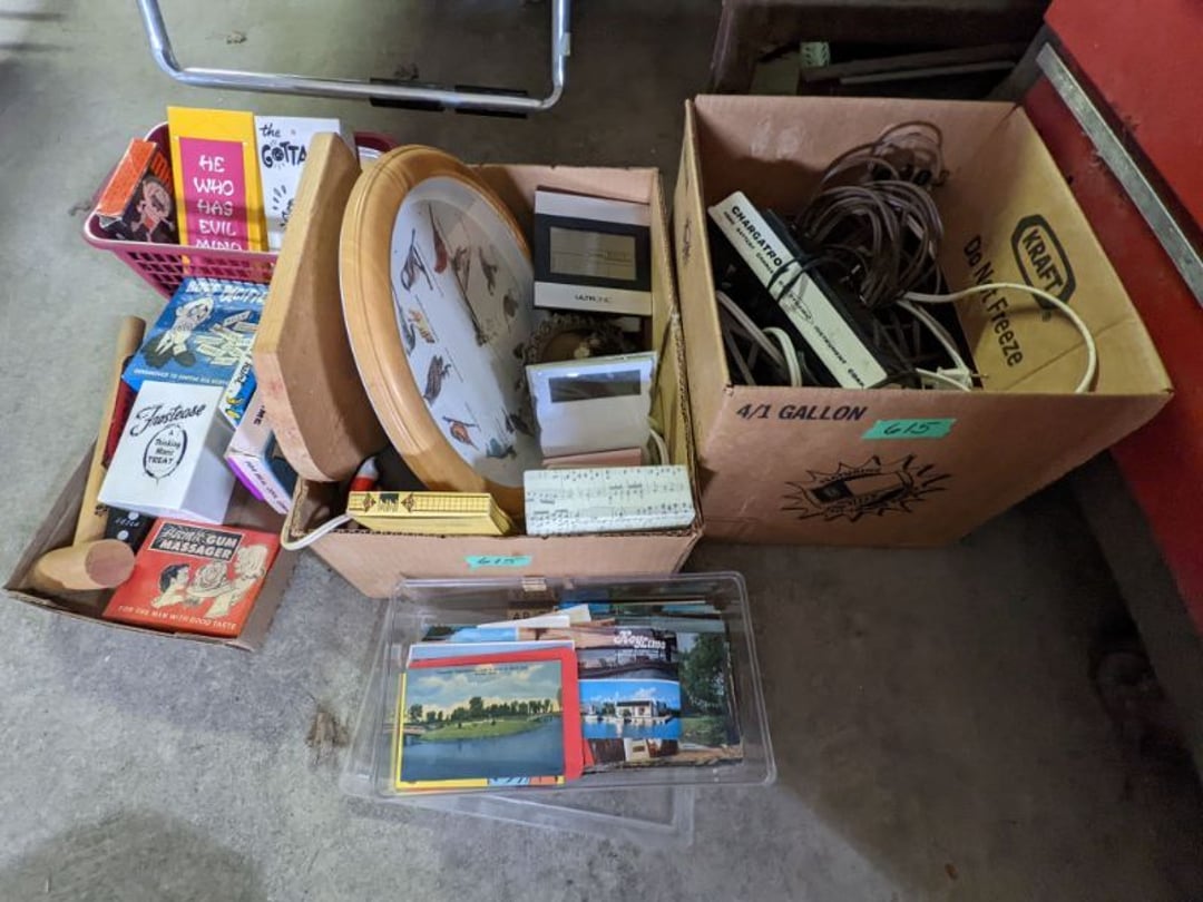 2 Griswold cast iron skillets, Salt and pepper shakers, blue Ball jars, refrigerator dishes, cookie jar, Pink rose dishes, Seyfert's pretzel jar, Jadite blossom design plate, Hull basket, Pink and cream small Hull vase, Roseville pitcher vase, Silver leaf glasses, Cast iron car, metal duck, metal horse bookend, ship bookend, Texaco pump, Glass fish, flower, vase, vintage bookends, bowl, planter, 3 piece moon and stars glassware, Fenton basket, fairy lights, misc glass, Pink, green, yellow depression dishes, Mayfair pink depression dishes, cracker jar, candy jar, 3 Mayfair pink depression bowls, Cast iron doorstop, 75 piece Homer Laughlin dogwood pattern dishes, Patton heater, small fan, Misc kitchenware, Strainer, 2 pressure cookers, Vintage Silvertone radio, 3 vintage ladies hats, 6 men's hats, Magnavox CD player and cassette recorder, cassettes, Juliette Eight Track Stereo player, 8 tracks, Sony fm/am stereo cassette recorder, cassettes, Crocks, sad iron, Vintage kitchenware, DVDs, 37 piece Homer Laughlin Georgian Eggshell dishes, Basket of glass vegetables, Vintage child's dishes, 2 pieces candle wick, 1 American sweetheart plate, 3 pieces bubbleglass, novelties and advertising, violin, 2 Furbys, Dubl Handi washboard, 2 feed bags, 2 cuckoo clocks both made in Germany, 29 pieces of misc Corelle, 95+ pieces of Lazy Daisy Corelle and flatware, 8 Pyrex mixing bowls, 2 Pyrex measuring pitchers, Copper boiler (rusty), vintage pot (chipped), American Tourister suitcase, Holiday decorations, Pots and pans with tote, Cleaning supplies, wire racks, Vintage handmade quilt, Signed handmade quilt, Comforter (damaged), 17 Life magazines from 1969 and 1971, 1969 Sears catalog, Handmade cross stitch flower quilt, State bird needlepoint quilt 96" x 68", Handmade signed quilt 108" x 84", Pyrex 3 piece casseroles, Commodore vintage computer, misc computer equipment, Bell & Howell movie projector, Quilt rack, automatic knitter, Small metal cabinet, Body power inversion table, Vitamaster 1000 XT exercise bike, Craft supplies and metal rack, Coppertone rack with sewing supplies and glassware, Coppertone rack with glassware, pop bottles, ceramic statutes, Record albums, Chalkboard, 3 mirrors, Fossil advertising sign, Metal plant stand, Craft supplies, material, doll heads, toolbox w/paints, metal rack, Weber small grill, 9' x 13' screen house, 3 wooden folding chairs, metal folding chair, 2 lawn chairs, 4 cushions, Belt buckles, knives, lighters, cuff links, hand warmers, Jewelry and jewelry boxes, Cat's eye ring, Logger, chicken wire, watering can, pavers, magnet, 2 boxes of canning jars, Whirlpool hot spa, Matmassager, Chi machine, exercise equipment, Painting supplies, small trash can, plastic baskets, Yard and garden tools, Adams Central letter jacket and t-shirt, Hammock, 2 folding lawn chairs, NIB heavy-duty shelving, Nib Proctor Silex coffee maker, rock garden, Nib Shiatsu foot massager, nib Snuggie, Staple gun, hammers, knives, screwdrivers, Champion socket set, Air pump, light bulbs, smoke alarms, hole saw set, glue gun, parts bin, 3 license plates, Kerosene heater, Patton electric heater, Magnifying lamp, bungee cords, batteries, oil can, Rubbermaid medium size cooler, Igloo polar roller 60 quart cooler, Metal shelving with glassware, stemware, vases, pots, plant stands, buckets, Metal shelving with garden supplies, small wooden ladder, bowling ball, Metal shelving with Memories of Yesterday and misc figurines, Large new extension cord, 3 aluminum treble lights, 2 Blue Mountain 2 piece rainsuits, small Comfort Zone heater, GE HEPA air purifier, Storage totes and containers misc sizes, 3 boxes of décor, Hand blown art glass, 7 pieces of Lefton china, glass basket and animals, Precious Moments collection, Precious Moments musical Ferris wheel, town buildings, books, Precious Moments train, nativity, 14 misc pieces, Brinn's musical dolls, Sleigh bells, 2 vintage bird pictures with feathers, Quilt top 74" x 90", Vintage marbles, Cast iron collection, Wicker planter, Garden statues, 2 photo screens, Vintage light-up Santa and snowman, Huge assortment of Christmas, 3 piece Roseville, Vases and decorator pieces, 18" green plate, glass decorator pieces, 46" x 36" drop leaf table with 2 chairs, Glassware, Americana Star stainless steel flatware service for 12 with chest, Oneida Wm A Rogers AI Plus flatware, 3 pieces silver plated items, Wm Rogers silver tea set, casserole, cutlery, cake knife, Silver plated assortment, 18" tall metal patio table, 5 garden statues, Large sitting angel cement statue, 4 plant stands, Vintage large green glass vase, large artificial rose, Heavy metal stand with glass shelves, wooden cabinet with contents, Misc wall items, Vintage metal serving cart, Microwave and cart, wall décor, Advertising yardsticks, grabber, dusters, gloves, Toshiba 19" television with remote, 6" pasta machine, metal kitchen utensils, warming tray, Office supplies, Kitchen table with 1 leaf and 6 chairs with wheels, Rival electric slicer, Primo water dispenser, Wm Rogers "Harvest" pitcher, Leonard silver plated pitcher, misc silver pieces, Heavy vintage glass pitcher, spongeware bowl, 3 crock bowls, coffee urn, 7 "The Young and the Restless" collector plates, record of "Nadia's Theme", Leonard silver plated pitcher, 2 silver plated cups, William Rogers candlesticks, Fire King baking dishes, 2 casseroles, Pyrex casserole, Misc Corningware and Fire King, 2 boxes of 25 Boopie stemware, Wooden bull, F B Rogers Silver Company tea set - Sugar and creamer, footed waste, Sharp Carousel microwave, Glitter lava-type lamp, dancing clown music box, 20+ pieces of mushroom design kitchen set, 2 boxes of flatware, 1 boxes of knives, sharpening steel, Vintage elephant cookie jar, 8 pieces Lefton china, 12 pieces Pink Rose Lefton china, McCoy cookie jar, 4 boxes of kitchen utensils, Joseph Rogers Jr & Sons drum with case and drum sticks, Bissel Powerforce bagless vacuum, Vintage Shirley Temple "First Vacation" doll, Vin