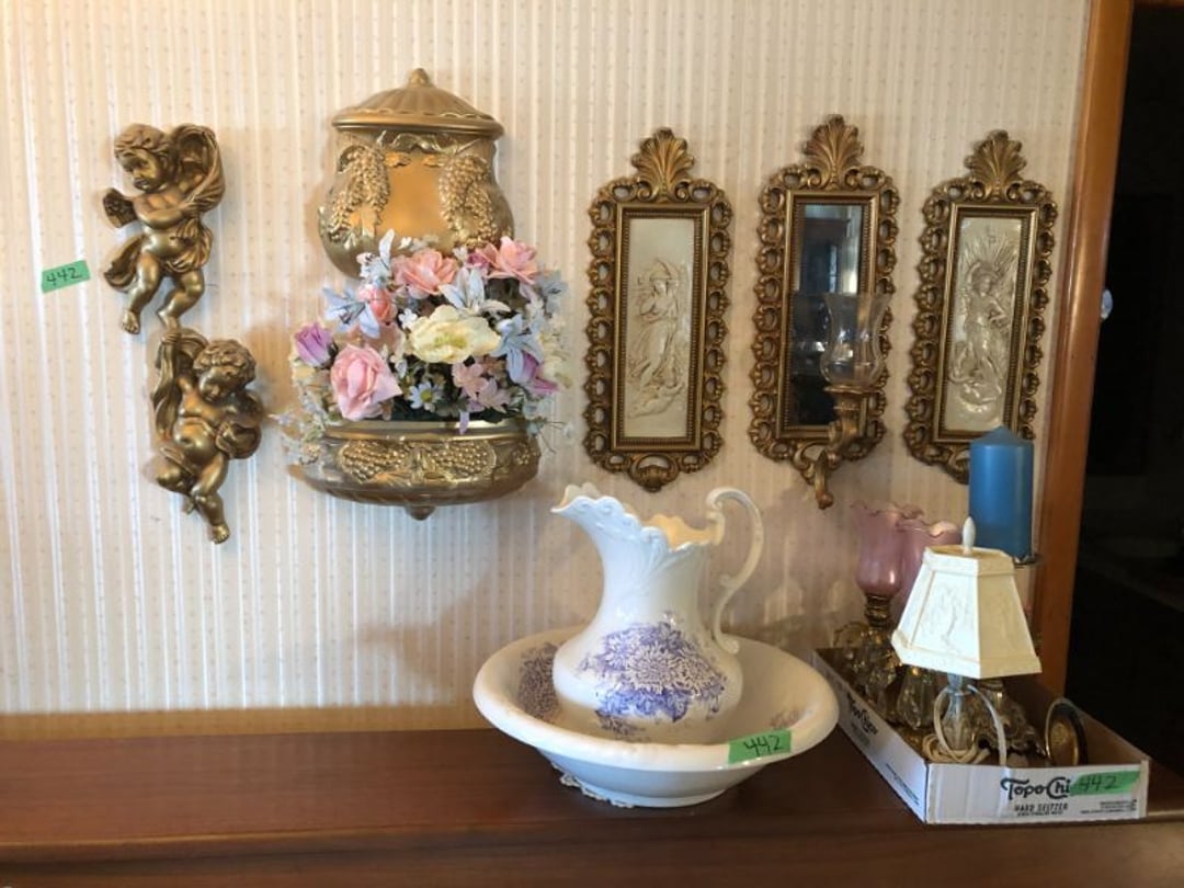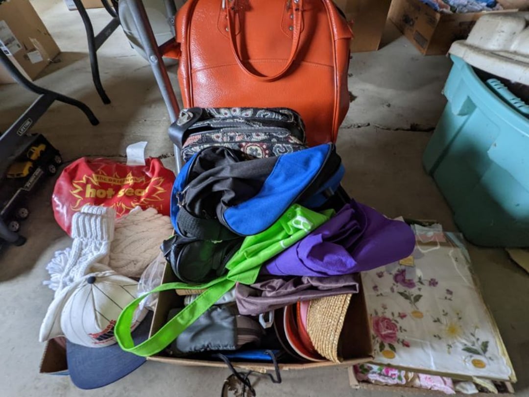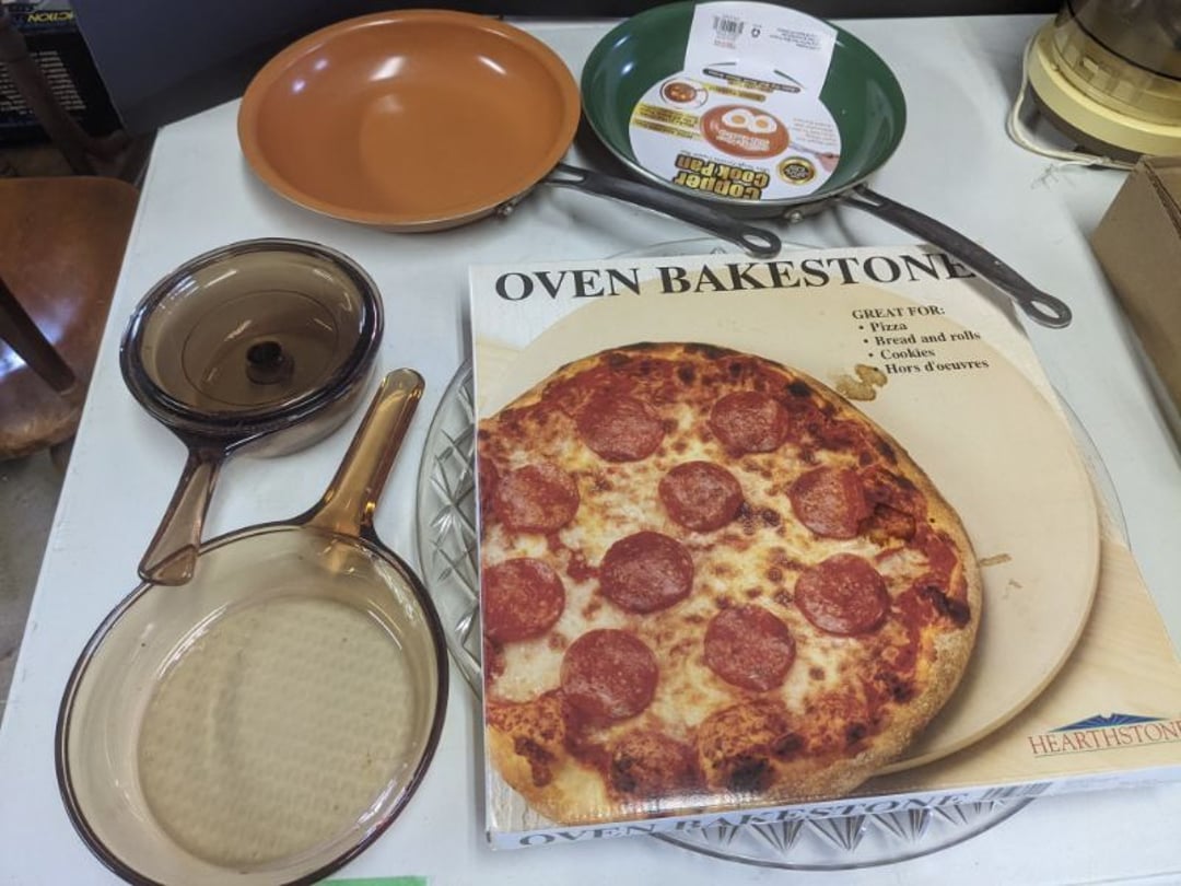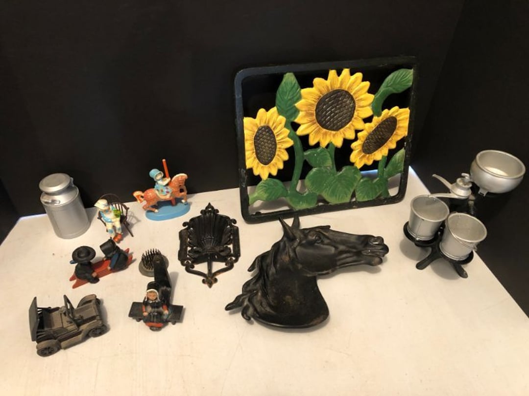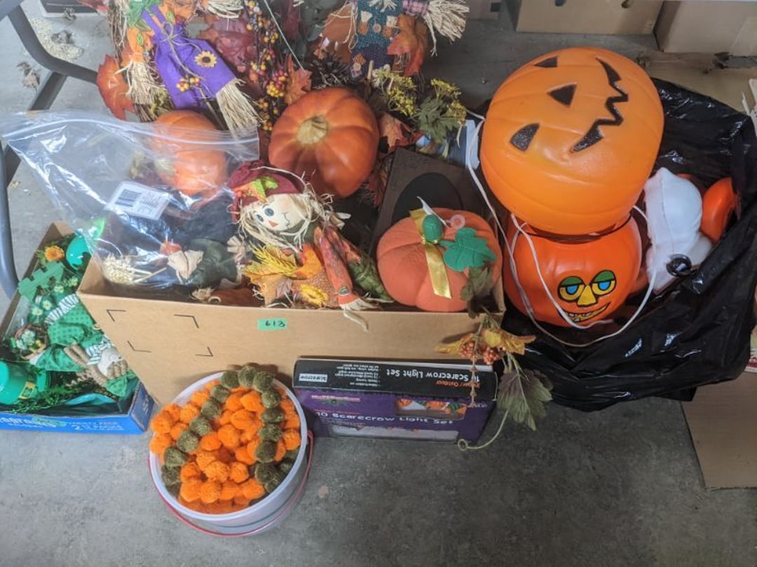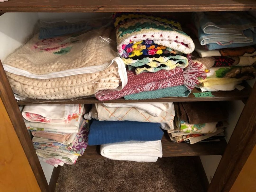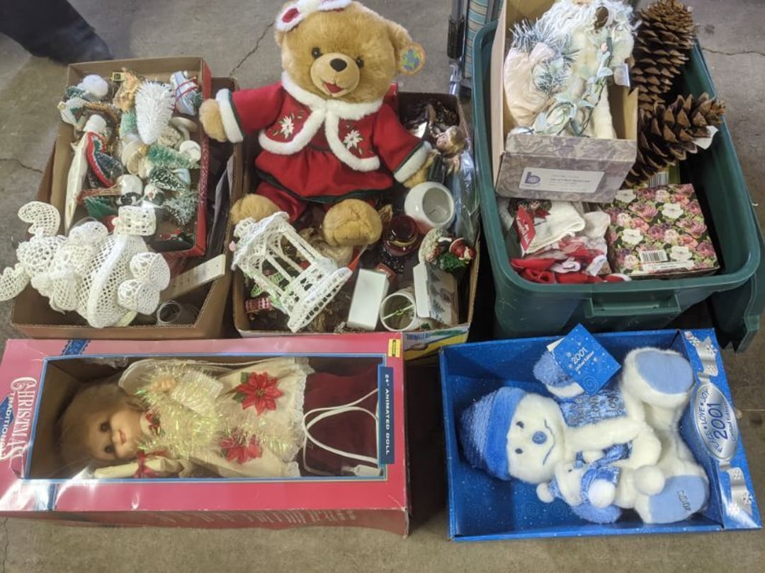 2 Griswold cast iron skillets, Salt and pepper shakers, blue Ball jars, refrigerator dishes, cookie jar, Pink rose dishes, Seyfert's pretzel jar, Jadite blossom design plate, Hull basket, Pink and cream small Hull vase, Roseville pitcher vase, Silver leaf glasses, Cast iron car, metal duck, metal horse bookend, ship bookend, Texaco pump, Glass fish, flower, vase, vintage bookends, bowl, planter, 3 piece moon and stars glassware, Fenton basket, fairy lights, misc glass, Pink, green, yellow depression dishes, Mayfair pink depression dishes, cracker jar, candy jar, 3 Mayfair pink depression bowls, Cast iron doorstop, 75 piece Homer Laughlin dogwood pattern dishes, Patton heater, small fan, Misc kitchenware, Strainer, 2 pressure cookers, Vintage Silvertone radio, 3 vintage ladies hats, 6 men's hats, Magnavox CD player and cassette recorder, cassettes, Juliette Eight Track Stereo player, 8 tracks, Sony fm/am stereo cassette recorder, cassettes, Crocks, sad iron, Vintage kitchenware, DVDs, 37 piece Homer Laughlin Georgian Eggshell dishes, Basket of glass vegetables, Vintage child's dishes, 2 pieces candle wick, 1 American sweetheart plate, 3 pieces bubbleglass, novelties and advertising, violin, 2 Furbys, Dubl Handi washboard, 2 feed bags, 2 cuckoo clocks both made in Germany, 29 pieces of misc Corelle, 95+ pieces of Lazy Daisy Corelle and flatware, 8 Pyrex mixing bowls, 2 Pyrex measuring pitchers, Copper boiler (rusty), vintage pot (chipped), American Tourister suitcase, Holiday decorations, Pots and pans with tote, Cleaning supplies, wire racks, Vintage handmade quilt, Signed handmade quilt, Comforter (damaged), 17 Life magazines from 1969 and 1971, 1969 Sears catalog, Handmade cross stitch flower quilt, State bird needlepoint quilt 96" x 68", Handmade signed quilt 108" x 84", Pyrex 3 piece casseroles, Commodore vintage computer, misc computer equipment, Bell & Howell movie projector, Quilt rack, automatic knitter, Small metal cabinet, Body power inversion table, Vitamaster 1000 XT exercise bike, Craft supplies and metal rack, Coppertone rack with sewing supplies and glassware, Coppertone rack with glassware, pop bottles, ceramic statutes, Record albums, Chalkboard, 3 mirrors, Fossil advertising sign, Metal plant stand, Craft supplies, material, doll heads, toolbox w/paints, metal rack, Weber small grill, 9' x 13' screen house, 3 wooden folding chairs, metal folding chair, 2 lawn chairs, 4 cushions, Belt buckles, knives, lighters, cuff links, hand warmers, Jewelry and jewelry boxes, Cat's eye ring, Logger, chicken wire, watering can, pavers, magnet, 2 boxes of canning jars, Whirlpool hot spa, Matmassager, Chi machine, exercise equipment, Painting supplies, small trash can, plastic baskets, Yard and garden tools, Adams Central letter jacket and t-shirt, Hammock, 2 folding lawn chairs, NIB heavy-duty shelving, Nib Proctor Silex coffee maker, rock garden, Nib Shiatsu foot massager, nib Snuggie, Staple gun, hammers, knives, screwdrivers, Champion socket set, Air pump, light bulbs, smoke alarms, hole saw set, glue gun, parts bin, 3 license plates, Kerosene heater, Patton electric heater, Magnifying lamp, bungee cords, batteries, oil can, Rubbermaid medium size cooler, Igloo polar roller 60 quart cooler, Metal shelving with glassware, stemware, vases, pots, plant stands, buckets, Metal shelving with garden supplies, small wooden ladder, bowling ball, Metal shelving with Memories of Yesterday and misc figurines, Large new extension cord, 3 aluminum treble lights, 2 Blue Mountain 2 piece rainsuits, small Comfort Zone heater, GE HEPA air purifier, Storage totes and containers misc sizes, 3 boxes of décor, Hand blown art glass, 7 pieces of Lefton china, glass basket and animals, Precious Moments collection, Precious Moments musical Ferris wheel, town buildings, books, Precious Moments train, nativity, 14 misc pieces, Brinn's musical dolls, Sleigh bells, 2 vintage bird pictures with feathers, Quilt top 74" x 90", Vintage marbles, Cast iron collection, Wicker planter, Garden statues, 2 photo screens, Vintage light-up Santa and snowman, Huge assortment of Christmas, 3 piece Roseville, Vases and decorator pieces, 18" green plate, glass decorator pieces, 46" x 36" drop leaf table with 2 chairs, Glassware, Americana Star stainless steel flatware service for 12 with chest, Oneida Wm A Rogers AI Plus flatware, 3 pieces silver plated items, Wm Rogers silver tea set, casserole, cutlery, cake knife, Silver plated assortment, 18" tall metal patio table, 5 garden statues, Large sitting angel cement statue, 4 plant stands, Vintage large green glass vase, large artificial rose, Heavy metal stand with glass shelves, wooden cabinet with contents, Misc wall items, Vintage metal serving cart, Microwave and cart, wall décor, Advertising yardsticks, grabber, dusters, gloves, Toshiba 19" television with remote, 6" pasta machine, metal kitchen utensils, warming tray, Office supplies, Kitchen table with 1 leaf and 6 chairs with wheels, Rival electric slicer, Primo water dispenser, Wm Rogers "Harvest" pitcher, Leonard silver plated pitcher, misc silver pieces, Heavy vintage glass pitcher, spongeware bowl, 3 crock bowls, coffee urn, 7 "The Young and the Restless" collector plates, record of "Nadia's Theme", Leonard silver plated pitcher, 2 silver plated cups, William Rogers candlesticks, Fire King baking dishes, 2 casseroles, Pyrex casserole, Misc Corningware and Fire King, 2 boxes of 25 Boopie stemware, Wooden bull, F B Rogers Silver Company tea set - Sugar and creamer, footed waste, Sharp Carousel microwave, Glitter lava-type lamp, dancing clown music box, 20+ pieces of mushroom design kitchen set, 2 boxes of flatware, 1 boxes of knives, sharpening steel, Vintage elephant cookie jar, 8 pieces Lefton china, 12 pieces Pink Rose Lefton china, McCoy cookie jar, 4 boxes of kitchen utensils, Joseph Rogers Jr & Sons drum with case and drum sticks, Bissel Powerforce bagless vacuum, Vintage Shirley Temple "First Vacation" doll, Vin