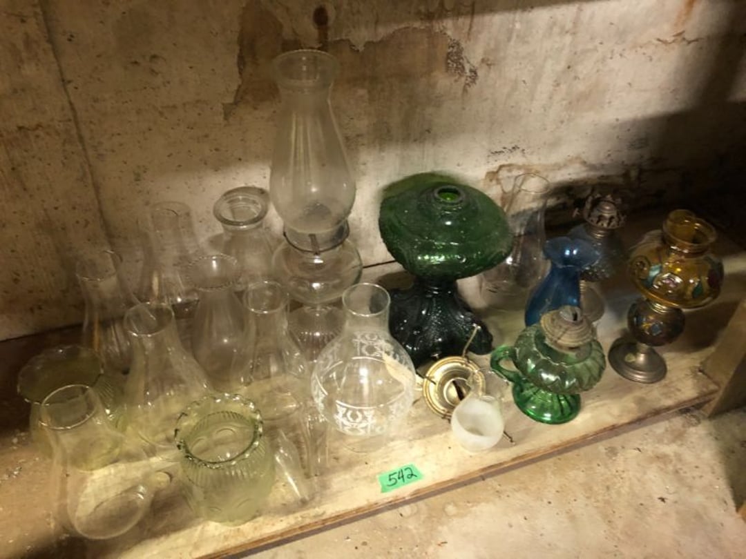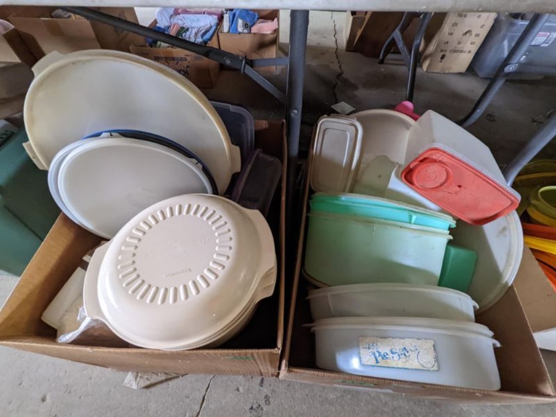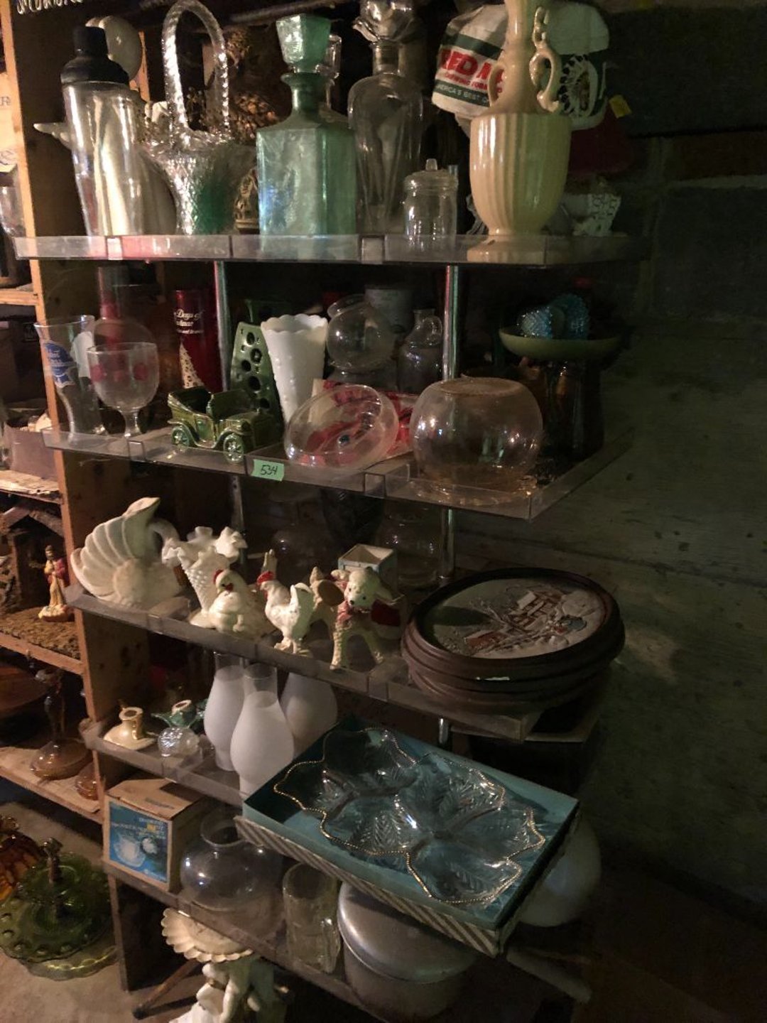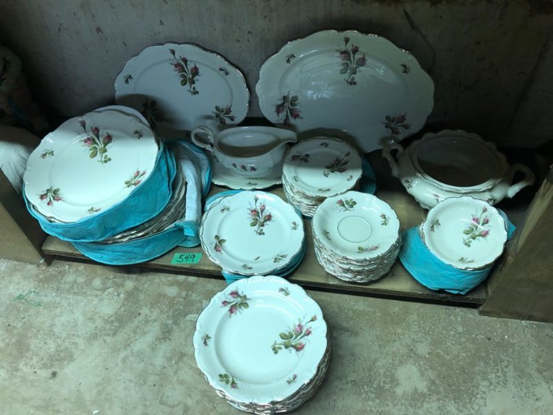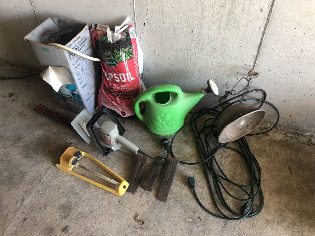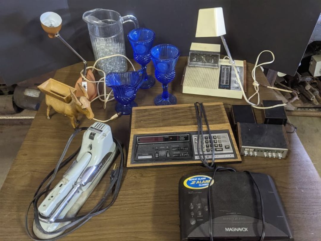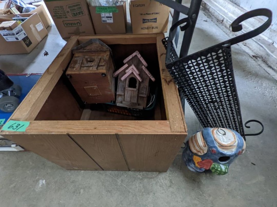 2 Griswold cast iron skillets, Salt and pepper shakers, blue Ball jars, refrigerator dishes, cookie jar, Pink rose dishes, Seyfert's pretzel jar, Jadite blossom design plate, Hull basket, Pink and cream small Hull vase, Roseville pitcher vase, Silver leaf glasses, Cast iron car, metal duck, metal horse bookend, ship bookend, Texaco pump, Glass fish, flower, vase, vintage bookends, bowl, planter, 3 piece moon and stars glassware, Fenton basket, fairy lights, misc glass, Pink, green, yellow depression dishes, Mayfair pink depression dishes, cracker jar, candy jar, 3 Mayfair pink depression bowls, Cast iron doorstop, 75 piece Homer Laughlin dogwood pattern dishes, Patton heater, small fan, Misc kitchenware, Strainer, 2 pressure cookers, Vintage Silvertone radio, 3 vintage ladies hats, 6 men's hats, Magnavox CD player and cassette recorder, cassettes, Juliette Eight Track Stereo player, 8 tracks, Sony fm/am stereo cassette recorder, cassettes, Crocks, sad iron, Vintage kitchenware, DVDs, 37 piece Homer Laughlin Georgian Eggshell dishes, Basket of glass vegetables, Vintage child's dishes, 2 pieces candle wick, 1 American sweetheart plate, 3 pieces bubbleglass, novelties and advertising, violin, 2 Furbys, Dubl Handi washboard, 2 feed bags, 2 cuckoo clocks both made in Germany, 29 pieces of misc Corelle, 95+ pieces of Lazy Daisy Corelle and flatware, 8 Pyrex mixing bowls, 2 Pyrex measuring pitchers, Copper boiler (rusty), vintage pot (chipped), American Tourister suitcase, Holiday decorations, Pots and pans with tote, Cleaning supplies, wire racks, Vintage handmade quilt, Signed handmade quilt, Comforter (damaged), 17 Life magazines from 1969 and 1971, 1969 Sears catalog, Handmade cross stitch flower quilt, State bird needlepoint quilt 96" x 68", Handmade signed quilt 108" x 84", Pyrex 3 piece casseroles, Commodore vintage computer, misc computer equipment, Bell & Howell movie projector, Quilt rack, automatic knitter, Small metal cabinet, Body power inversion table, Vitamaster 1000 XT exercise bike, Craft supplies and metal rack, Coppertone rack with sewing supplies and glassware, Coppertone rack with glassware, pop bottles, ceramic statutes, Record albums, Chalkboard, 3 mirrors, Fossil advertising sign, Metal plant stand, Craft supplies, material, doll heads, toolbox w/paints, metal rack, Weber small grill, 9' x 13' screen house, 3 wooden folding chairs, metal folding chair, 2 lawn chairs, 4 cushions, Belt buckles, knives, lighters, cuff links, hand warmers, Jewelry and jewelry boxes, Cat's eye ring, Logger, chicken wire, watering can, pavers, magnet, 2 boxes of canning jars, Whirlpool hot spa, Matmassager, Chi machine, exercise equipment, Painting supplies, small trash can, plastic baskets, Yard and garden tools, Adams Central letter jacket and t-shirt, Hammock, 2 folding lawn chairs, NIB heavy-duty shelving, Nib Proctor Silex coffee maker, rock garden, Nib Shiatsu foot massager, nib Snuggie, Staple gun, hammers, knives, screwdrivers, Champion socket set, Air pump, light bulbs, smoke alarms, hole saw set, glue gun, parts bin, 3 license plates, Kerosene heater, Patton electric heater, Magnifying lamp, bungee cords, batteries, oil can, Rubbermaid medium size cooler, Igloo polar roller 60 quart cooler, Metal shelving with glassware, stemware, vases, pots, plant stands, buckets, Metal shelving with garden supplies, small wooden ladder, bowling ball, Metal shelving with Memories of Yesterday and misc figurines, Large new extension cord, 3 aluminum treble lights, 2 Blue Mountain 2 piece rainsuits, small Comfort Zone heater, GE HEPA air purifier, Storage totes and containers misc sizes, 3 boxes of décor, Hand blown art glass, 7 pieces of Lefton china, glass basket and animals, Precious Moments collection, Precious Moments musical Ferris wheel, town buildings, books, Precious Moments train, nativity, 14 misc pieces, Brinn's musical dolls, Sleigh bells, 2 vintage bird pictures with feathers, Quilt top 74" x 90", Vintage marbles, Cast iron collection, Wicker planter, Garden statues, 2 photo screens, Vintage light-up Santa and snowman, Huge assortment of Christmas, 3 piece Roseville, Vases and decorator pieces, 18" green plate, glass decorator pieces, 46" x 36" drop leaf table with 2 chairs, Glassware, Americana Star stainless steel flatware service for 12 with chest, Oneida Wm A Rogers AI Plus flatware, 3 pieces silver plated items, Wm Rogers silver tea set, casserole, cutlery, cake knife, Silver plated assortment, 18" tall metal patio table, 5 garden statues, Large sitting angel cement statue, 4 plant stands, Vintage large green glass vase, large artificial rose, Heavy metal stand with glass shelves, wooden cabinet with contents, Misc wall items, Vintage metal serving cart, Microwave and cart, wall décor, Advertising yardsticks, grabber, dusters, gloves, Toshiba 19" television with remote, 6" pasta machine, metal kitchen utensils, warming tray, Office supplies, Kitchen table with 1 leaf and 6 chairs with wheels, Rival electric slicer, Primo water dispenser, Wm Rogers "Harvest" pitcher, Leonard silver plated pitcher, misc silver pieces, Heavy vintage glass pitcher, spongeware bowl, 3 crock bowls, coffee urn, 7 "The Young and the Restless" collector plates, record of "Nadia's Theme", Leonard silver plated pitcher, 2 silver plated cups, William Rogers candlesticks, Fire King baking dishes, 2 casseroles, Pyrex casserole, Misc Corningware and Fire King, 2 boxes of 25 Boopie stemware, Wooden bull, F B Rogers Silver Company tea set - Sugar and creamer, footed waste, Sharp Carousel microwave, Glitter lava-type lamp, dancing clown music box, 20+ pieces of mushroom design kitchen set, 2 boxes of flatware, 1 boxes of knives, sharpening steel, Vintage elephant cookie jar, 8 pieces Lefton china, 12 pieces Pink Rose Lefton china, McCoy cookie jar, 4 boxes of kitchen utensils, Joseph Rogers Jr & Sons drum with case and drum sticks, Bissel Powerforce bagless vacuum, Vintage Shirley Temple "First Vacation" doll, Vin