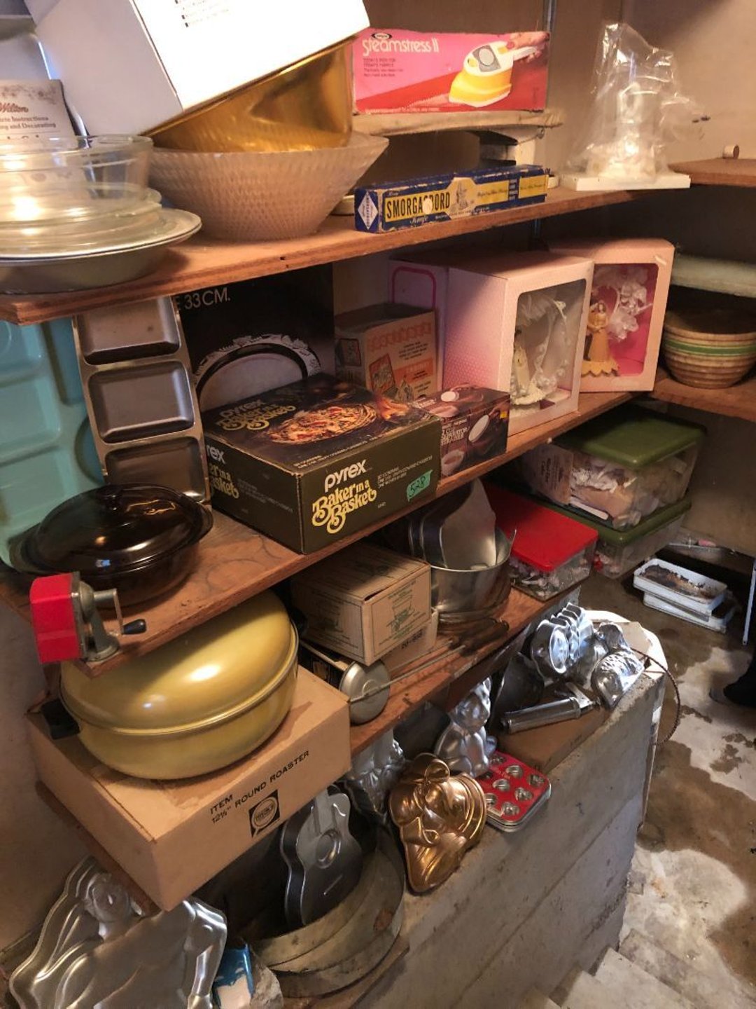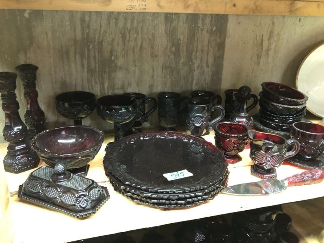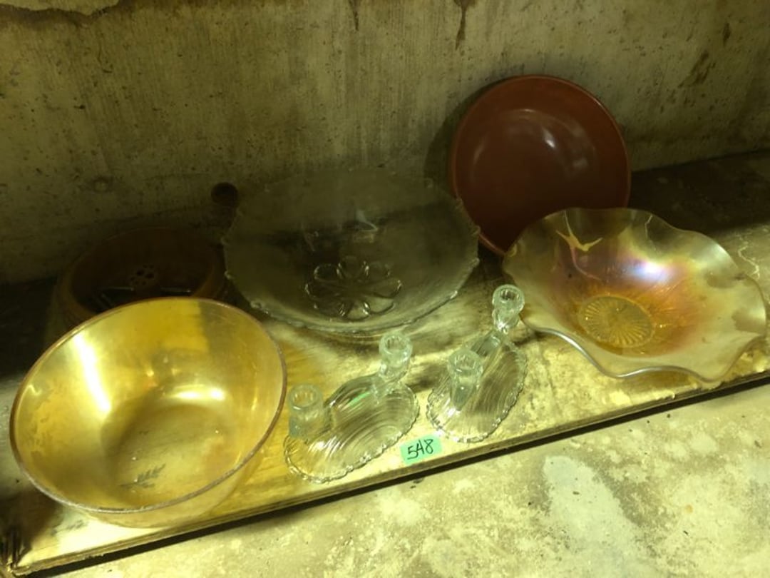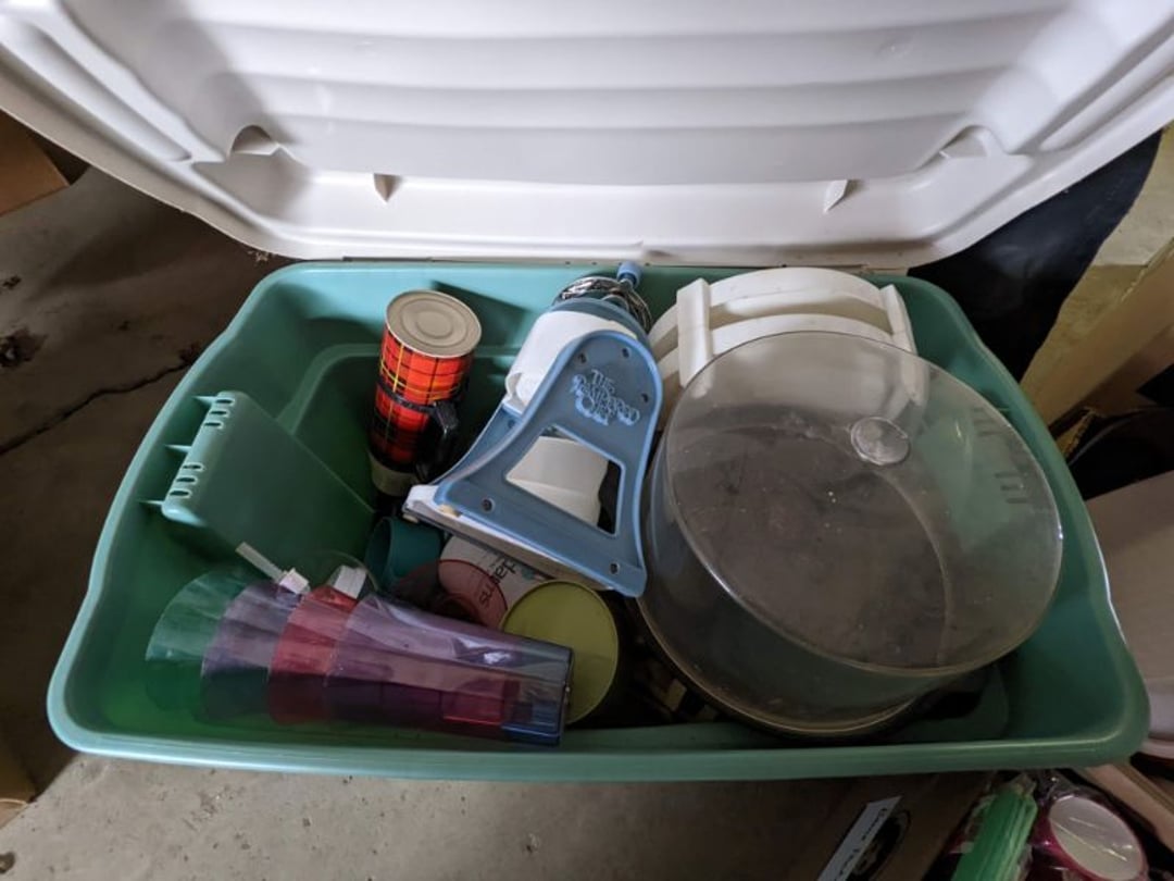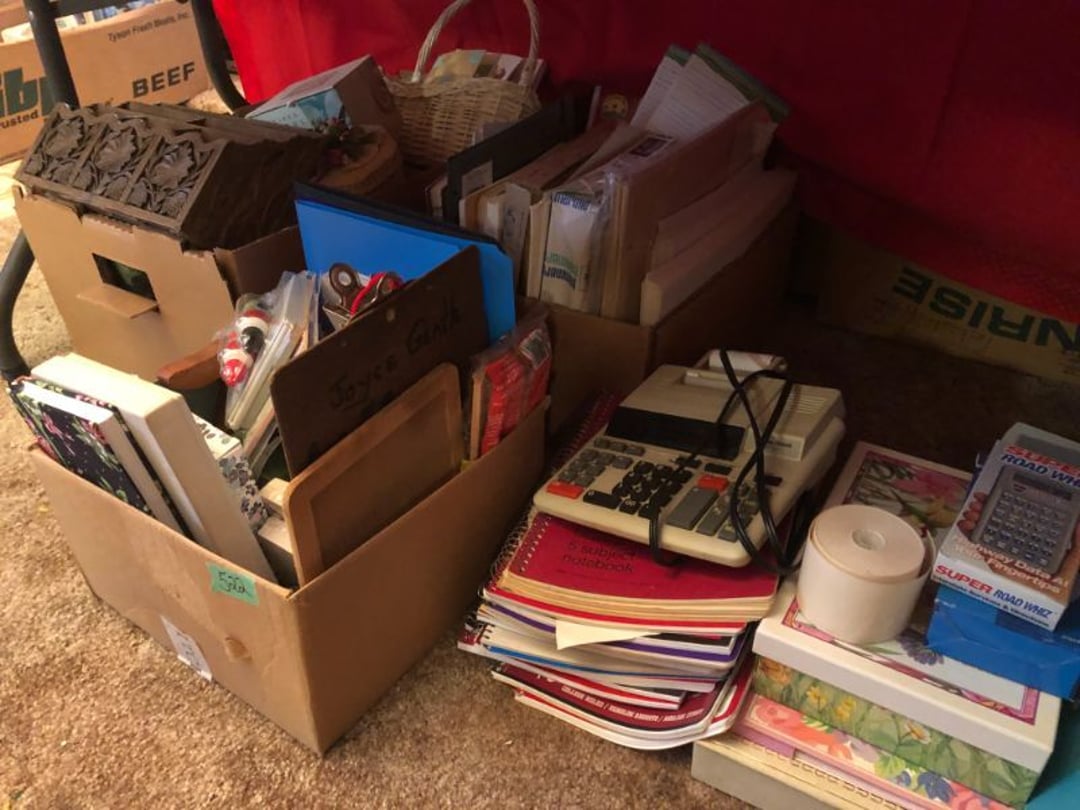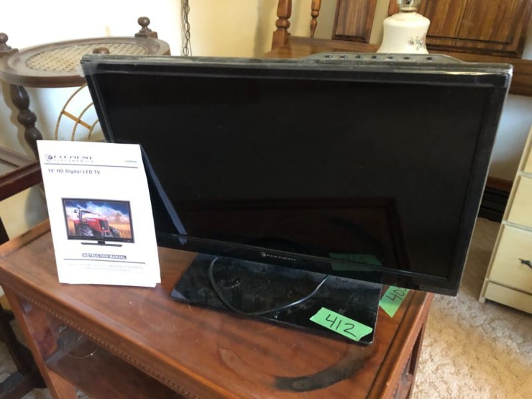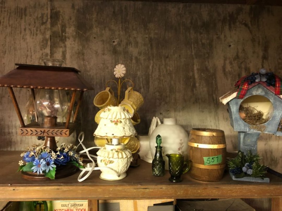 2 Griswold cast iron skillets, Salt and pepper shakers, blue Ball jars, refrigerator dishes, cookie jar, Pink rose dishes, Seyfert's pretzel jar, Jadite blossom design plate, Hull basket, Pink and cream small Hull vase, Roseville pitcher vase, Silver leaf glasses, Cast iron car, metal duck, metal horse bookend, ship bookend, Texaco pump, Glass fish, flower, vase, vintage bookends, bowl, planter, 3 piece moon and stars glassware, Fenton basket, fairy lights, misc glass, Pink, green, yellow depression dishes, Mayfair pink depression dishes, cracker jar, candy jar, 3 Mayfair pink depression bowls, Cast iron doorstop, 75 piece Homer Laughlin dogwood pattern dishes, Patton heater, small fan, Misc kitchenware, Strainer, 2 pressure cookers, Vintage Silvertone radio, 3 vintage ladies hats, 6 men's hats, Magnavox CD player and cassette recorder, cassettes, Juliette Eight Track Stereo player, 8 tracks, Sony fm/am stereo cassette recorder, cassettes, Crocks, sad iron, Vintage kitchenware, DVDs, 37 piece Homer Laughlin Georgian Eggshell dishes, Basket of glass vegetables, Vintage child's dishes, 2 pieces candle wick, 1 American sweetheart plate, 3 pieces bubbleglass, novelties and advertising, violin, 2 Furbys, Dubl Handi washboard, 2 feed bags, 2 cuckoo clocks both made in Germany, 29 pieces of misc Corelle, 95+ pieces of Lazy Daisy Corelle and flatware, 8 Pyrex mixing bowls, 2 Pyrex measuring pitchers, Copper boiler (rusty), vintage pot (chipped), American Tourister suitcase, Holiday decorations, Pots and pans with tote, Cleaning supplies, wire racks, Vintage handmade quilt, Signed handmade quilt, Comforter (damaged), 17 Life magazines from 1969 and 1971, 1969 Sears catalog, Handmade cross stitch flower quilt, State bird needlepoint quilt 96" x 68", Handmade signed quilt 108" x 84", Pyrex 3 piece casseroles, Commodore vintage computer, misc computer equipment, Bell & Howell movie projector, Quilt rack, automatic knitter, Small metal cabinet, Body power inversion table, Vitamaster 1000 XT exercise bike, Craft supplies and metal rack, Coppertone rack with sewing supplies and glassware, Coppertone rack with glassware, pop bottles, ceramic statutes, Record albums, Chalkboard, 3 mirrors, Fossil advertising sign, Metal plant stand, Craft supplies, material, doll heads, toolbox w/paints, metal rack, Weber small grill, 9' x 13' screen house, 3 wooden folding chairs, metal folding chair, 2 lawn chairs, 4 cushions, Belt buckles, knives, lighters, cuff links, hand warmers, Jewelry and jewelry boxes, Cat's eye ring, Logger, chicken wire, watering can, pavers, magnet, 2 boxes of canning jars, Whirlpool hot spa, Matmassager, Chi machine, exercise equipment, Painting supplies, small trash can, plastic baskets, Yard and garden tools, Adams Central letter jacket and t-shirt, Hammock, 2 folding lawn chairs, NIB heavy-duty shelving, Nib Proctor Silex coffee maker, rock garden, Nib Shiatsu foot massager, nib Snuggie, Staple gun, hammers, knives, screwdrivers, Champion socket set, Air pump, light bulbs, smoke alarms, hole saw set, glue gun, parts bin, 3 license plates, Kerosene heater, Patton electric heater, Magnifying lamp, bungee cords, batteries, oil can, Rubbermaid medium size cooler, Igloo polar roller 60 quart cooler, Metal shelving with glassware, stemware, vases, pots, plant stands, buckets, Metal shelving with garden supplies, small wooden ladder, bowling ball, Metal shelving with Memories of Yesterday and misc figurines, Large new extension cord, 3 aluminum treble lights, 2 Blue Mountain 2 piece rainsuits, small Comfort Zone heater, GE HEPA air purifier, Storage totes and containers misc sizes, 3 boxes of décor, Hand blown art glass, 7 pieces of Lefton china, glass basket and animals, Precious Moments collection, Precious Moments musical Ferris wheel, town buildings, books, Precious Moments train, nativity, 14 misc pieces, Brinn's musical dolls, Sleigh bells, 2 vintage bird pictures with feathers, Quilt top 74" x 90", Vintage marbles, Cast iron collection, Wicker planter, Garden statues, 2 photo screens, Vintage light-up Santa and snowman, Huge assortment of Christmas, 3 piece Roseville, Vases and decorator pieces, 18" green plate, glass decorator pieces, 46" x 36" drop leaf table with 2 chairs, Glassware, Americana Star stainless steel flatware service for 12 with chest, Oneida Wm A Rogers AI Plus flatware, 3 pieces silver plated items, Wm Rogers silver tea set, casserole, cutlery, cake knife, Silver plated assortment, 18" tall metal patio table, 5 garden statues, Large sitting angel cement statue, 4 plant stands, Vintage large green glass vase, large artificial rose, Heavy metal stand with glass shelves, wooden cabinet with contents, Misc wall items, Vintage metal serving cart, Microwave and cart, wall décor, Advertising yardsticks, grabber, dusters, gloves, Toshiba 19" television with remote, 6" pasta machine, metal kitchen utensils, warming tray, Office supplies, Kitchen table with 1 leaf and 6 chairs with wheels, Rival electric slicer, Primo water dispenser, Wm Rogers "Harvest" pitcher, Leonard silver plated pitcher, misc silver pieces, Heavy vintage glass pitcher, spongeware bowl, 3 crock bowls, coffee urn, 7 "The Young and the Restless" collector plates, record of "Nadia's Theme", Leonard silver plated pitcher, 2 silver plated cups, William Rogers candlesticks, Fire King baking dishes, 2 casseroles, Pyrex casserole, Misc Corningware and Fire King, 2 boxes of 25 Boopie stemware, Wooden bull, F B Rogers Silver Company tea set - Sugar and creamer, footed waste, Sharp Carousel microwave, Glitter lava-type lamp, dancing clown music box, 20+ pieces of mushroom design kitchen set, 2 boxes of flatware, 1 boxes of knives, sharpening steel, Vintage elephant cookie jar, 8 pieces Lefton china, 12 pieces Pink Rose Lefton china, McCoy cookie jar, 4 boxes of kitchen utensils, Joseph Rogers Jr & Sons drum with case and drum sticks, Bissel Powerforce bagless vacuum, Vintage Shirley Temple "First Vacation" doll, Vin