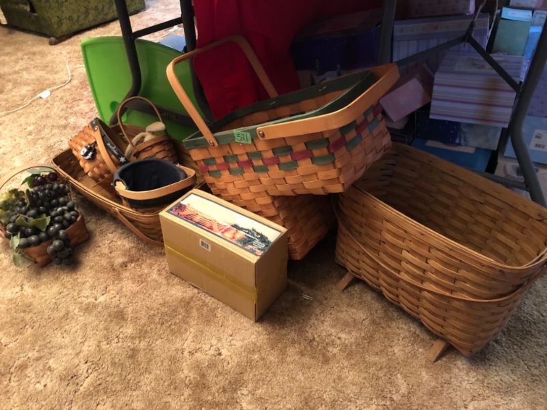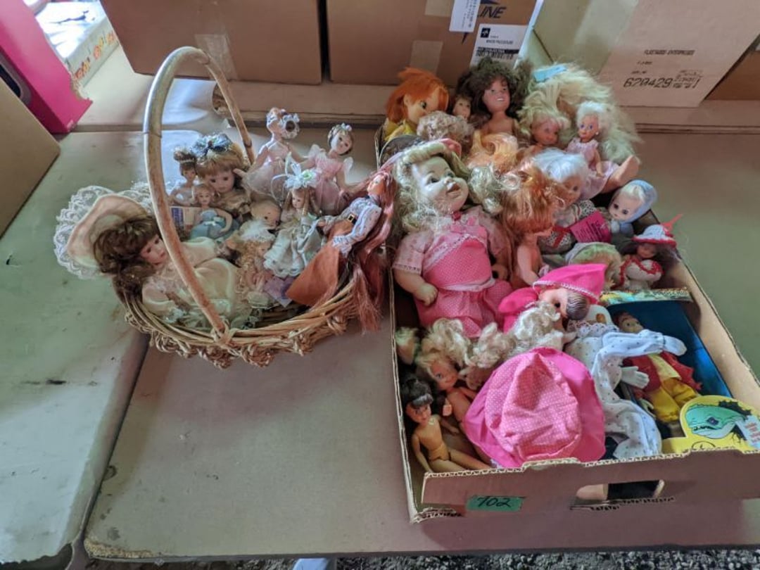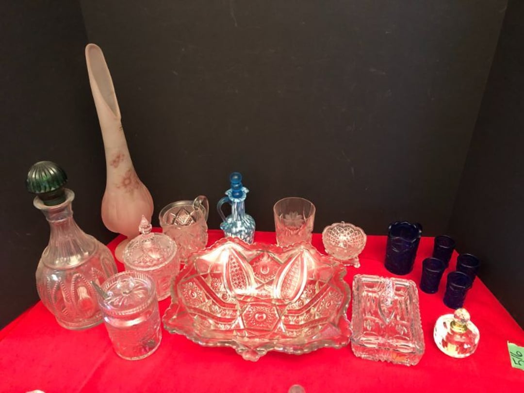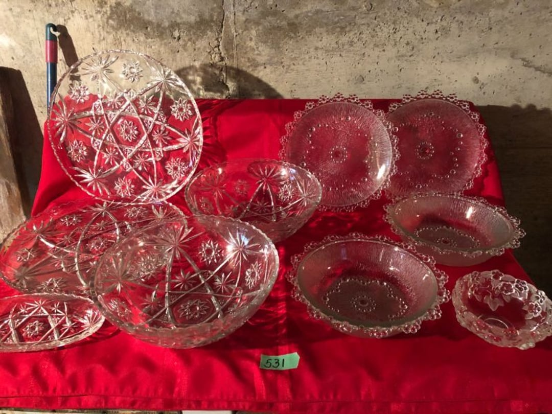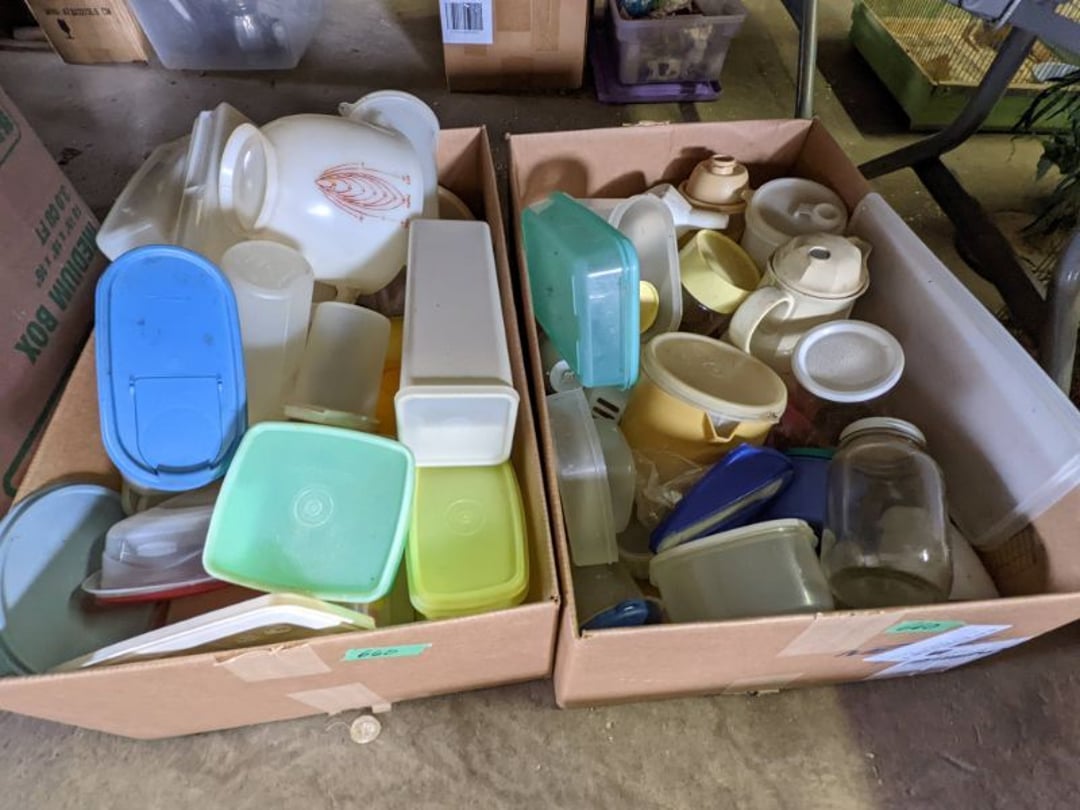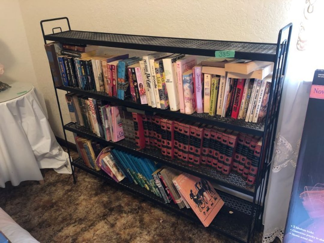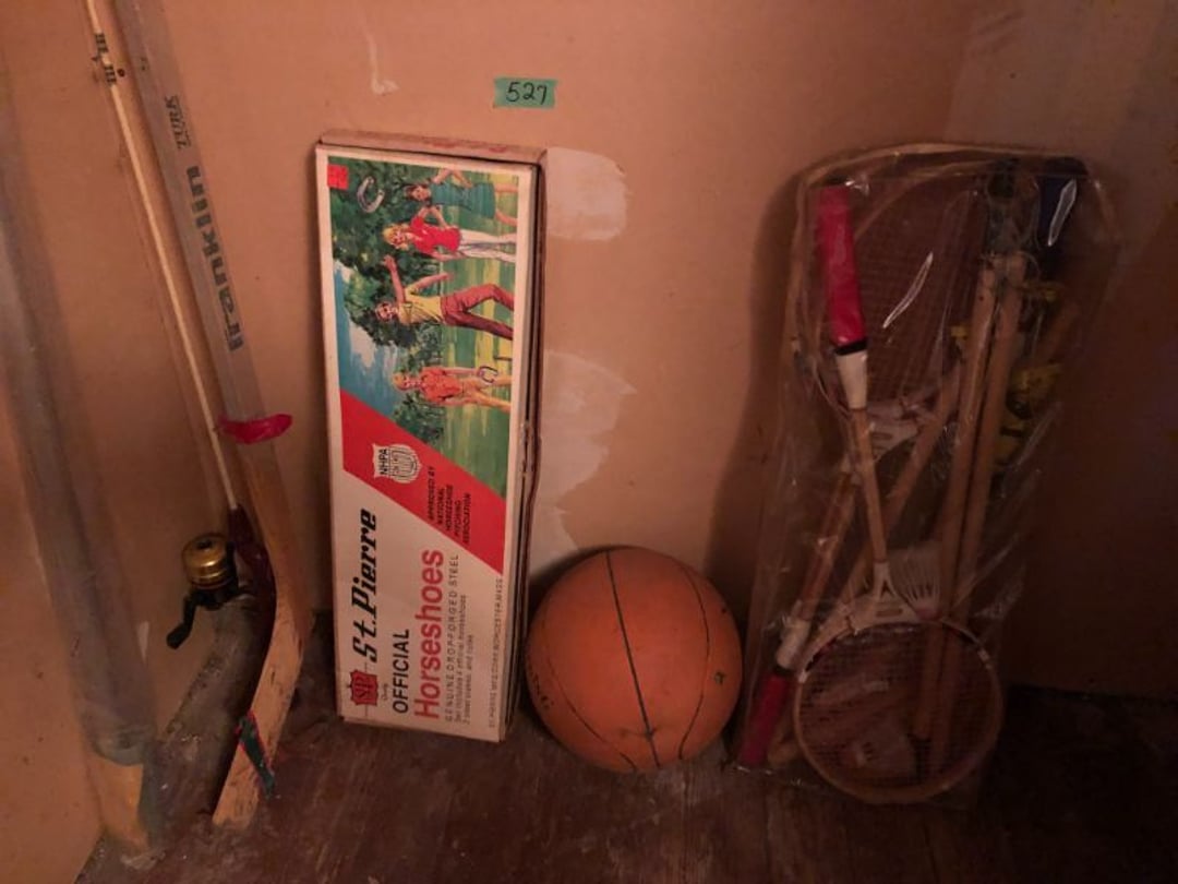 2 Griswold cast iron skillets, Salt and pepper shakers, blue Ball jars, refrigerator dishes, cookie jar, Pink rose dishes, Seyfert's pretzel jar, Jadite blossom design plate, Hull basket, Pink and cream small Hull vase, Roseville pitcher vase, Silver leaf glasses, Cast iron car, metal duck, metal horse bookend, ship bookend, Texaco pump, Glass fish, flower, vase, vintage bookends, bowl, planter, 3 piece moon and stars glassware, Fenton basket, fairy lights, misc glass, Pink, green, yellow depression dishes, Mayfair pink depression dishes, cracker jar, candy jar, 3 Mayfair pink depression bowls, Cast iron doorstop, 75 piece Homer Laughlin dogwood pattern dishes, Patton heater, small fan, Misc kitchenware, Strainer, 2 pressure cookers, Vintage Silvertone radio, 3 vintage ladies hats, 6 men's hats, Magnavox CD player and cassette recorder, cassettes, Juliette Eight Track Stereo player, 8 tracks, Sony fm/am stereo cassette recorder, cassettes, Crocks, sad iron, Vintage kitchenware, DVDs, 37 piece Homer Laughlin Georgian Eggshell dishes, Basket of glass vegetables, Vintage child's dishes, 2 pieces candle wick, 1 American sweetheart plate, 3 pieces bubbleglass, novelties and advertising, violin, 2 Furbys, Dubl Handi washboard, 2 feed bags, 2 cuckoo clocks both made in Germany, 29 pieces of misc Corelle, 95+ pieces of Lazy Daisy Corelle and flatware, 8 Pyrex mixing bowls, 2 Pyrex measuring pitchers, Copper boiler (rusty), vintage pot (chipped), American Tourister suitcase, Holiday decorations, Pots and pans with tote, Cleaning supplies, wire racks, Vintage handmade quilt, Signed handmade quilt, Comforter (damaged), 17 Life magazines from 1969 and 1971, 1969 Sears catalog, Handmade cross stitch flower quilt, State bird needlepoint quilt 96" x 68", Handmade signed quilt 108" x 84", Pyrex 3 piece casseroles, Commodore vintage computer, misc computer equipment, Bell & Howell movie projector, Quilt rack, automatic knitter, Small metal cabinet, Body power inversion table, Vitamaster 1000 XT exercise bike, Craft supplies and metal rack, Coppertone rack with sewing supplies and glassware, Coppertone rack with glassware, pop bottles, ceramic statutes, Record albums, Chalkboard, 3 mirrors, Fossil advertising sign, Metal plant stand, Craft supplies, material, doll heads, toolbox w/paints, metal rack, Weber small grill, 9' x 13' screen house, 3 wooden folding chairs, metal folding chair, 2 lawn chairs, 4 cushions, Belt buckles, knives, lighters, cuff links, hand warmers, Jewelry and jewelry boxes, Cat's eye ring, Logger, chicken wire, watering can, pavers, magnet, 2 boxes of canning jars, Whirlpool hot spa, Matmassager, Chi machine, exercise equipment, Painting supplies, small trash can, plastic baskets, Yard and garden tools, Adams Central letter jacket and t-shirt, Hammock, 2 folding lawn chairs, NIB heavy-duty shelving, Nib Proctor Silex coffee maker, rock garden, Nib Shiatsu foot massager, nib Snuggie, Staple gun, hammers, knives, screwdrivers, Champion socket set, Air pump, light bulbs, smoke alarms, hole saw set, glue gun, parts bin, 3 license plates, Kerosene heater, Patton electric heater, Magnifying lamp, bungee cords, batteries, oil can, Rubbermaid medium size cooler, Igloo polar roller 60 quart cooler, Metal shelving with glassware, stemware, vases, pots, plant stands, buckets, Metal shelving with garden supplies, small wooden ladder, bowling ball, Metal shelving with Memories of Yesterday and misc figurines, Large new extension cord, 3 aluminum treble lights, 2 Blue Mountain 2 piece rainsuits, small Comfort Zone heater, GE HEPA air purifier, Storage totes and containers misc sizes, 3 boxes of décor, Hand blown art glass, 7 pieces of Lefton china, glass basket and animals, Precious Moments collection, Precious Moments musical Ferris wheel, town buildings, books, Precious Moments train, nativity, 14 misc pieces, Brinn's musical dolls, Sleigh bells, 2 vintage bird pictures with feathers, Quilt top 74" x 90", Vintage marbles, Cast iron collection, Wicker planter, Garden statues, 2 photo screens, Vintage light-up Santa and snowman, Huge assortment of Christmas, 3 piece Roseville, Vases and decorator pieces, 18" green plate, glass decorator pieces, 46" x 36" drop leaf table with 2 chairs, Glassware, Americana Star stainless steel flatware service for 12 with chest, Oneida Wm A Rogers AI Plus flatware, 3 pieces silver plated items, Wm Rogers silver tea set, casserole, cutlery, cake knife, Silver plated assortment, 18" tall metal patio table, 5 garden statues, Large sitting angel cement statue, 4 plant stands, Vintage large green glass vase, large artificial rose, Heavy metal stand with glass shelves, wooden cabinet with contents, Misc wall items, Vintage metal serving cart, Microwave and cart, wall décor, Advertising yardsticks, grabber, dusters, gloves, Toshiba 19" television with remote, 6" pasta machine, metal kitchen utensils, warming tray, Office supplies, Kitchen table with 1 leaf and 6 chairs with wheels, Rival electric slicer, Primo water dispenser, Wm Rogers "Harvest" pitcher, Leonard silver plated pitcher, misc silver pieces, Heavy vintage glass pitcher, spongeware bowl, 3 crock bowls, coffee urn, 7 "The Young and the Restless" collector plates, record of "Nadia's Theme", Leonard silver plated pitcher, 2 silver plated cups, William Rogers candlesticks, Fire King baking dishes, 2 casseroles, Pyrex casserole, Misc Corningware and Fire King, 2 boxes of 25 Boopie stemware, Wooden bull, F B Rogers Silver Company tea set - Sugar and creamer, footed waste, Sharp Carousel microwave, Glitter lava-type lamp, dancing clown music box, 20+ pieces of mushroom design kitchen set, 2 boxes of flatware, 1 boxes of knives, sharpening steel, Vintage elephant cookie jar, 8 pieces Lefton china, 12 pieces Pink Rose Lefton china, McCoy cookie jar, 4 boxes of kitchen utensils, Joseph Rogers Jr & Sons drum with case and drum sticks, Bissel Powerforce bagless vacuum, Vintage Shirley Temple "First Vacation" doll, Vin