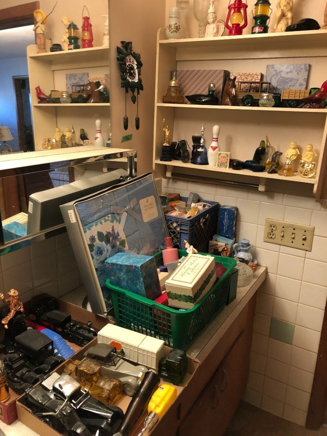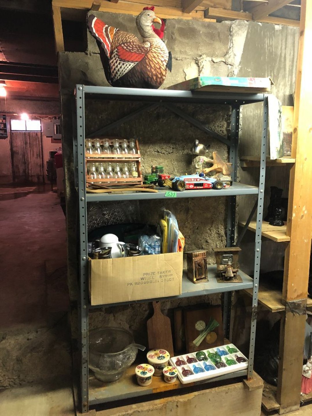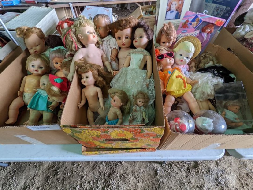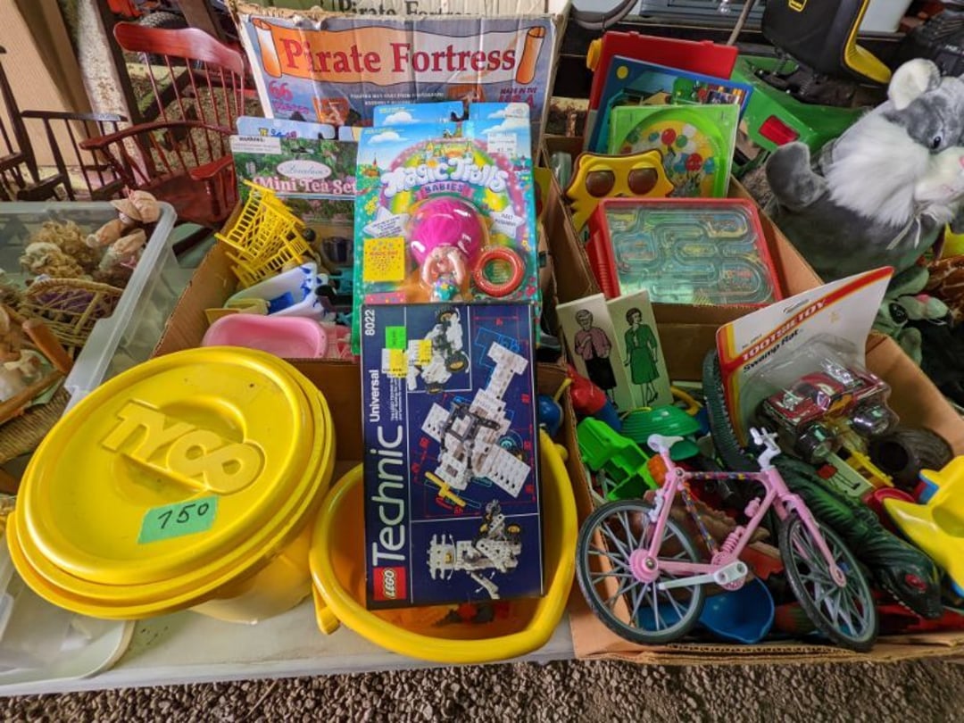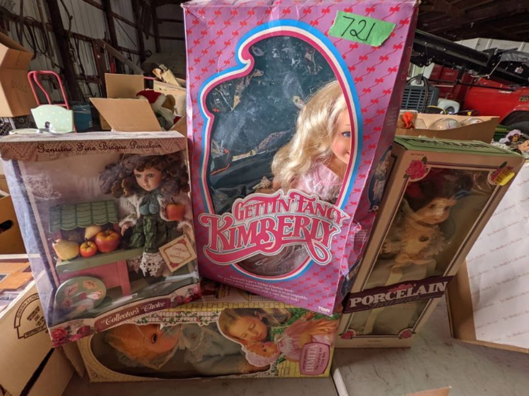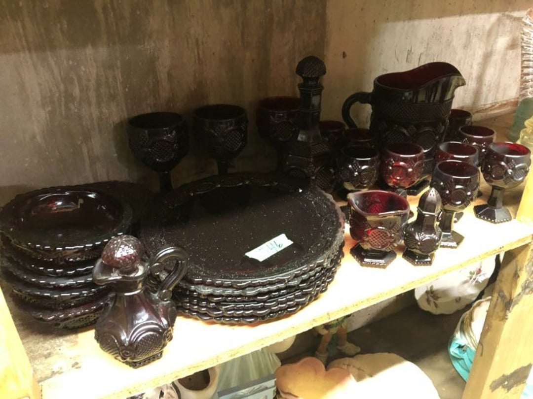 2 Griswold cast iron skillets, Salt and pepper shakers, blue Ball jars, refrigerator dishes, cookie jar, Pink rose dishes, Seyfert's pretzel jar, Jadite blossom design plate, Hull basket, Pink and cream small Hull vase, Roseville pitcher vase, Silver leaf glasses, Cast iron car, metal duck, metal horse bookend, ship bookend, Texaco pump, Glass fish, flower, vase, vintage bookends, bowl, planter, 3 piece moon and stars glassware, Fenton basket, fairy lights, misc glass, Pink, green, yellow depression dishes, Mayfair pink depression dishes, cracker jar, candy jar, 3 Mayfair pink depression bowls, Cast iron doorstop, 75 piece Homer Laughlin dogwood pattern dishes, Patton heater, small fan, Misc kitchenware, Strainer, 2 pressure cookers, Vintage Silvertone radio, 3 vintage ladies hats, 6 men's hats, Magnavox CD player and cassette recorder, cassettes, Juliette Eight Track Stereo player, 8 tracks, Sony fm/am stereo cassette recorder, cassettes, Crocks, sad iron, Vintage kitchenware, DVDs, 37 piece Homer Laughlin Georgian Eggshell dishes, Basket of glass vegetables, Vintage child's dishes, 2 pieces candle wick, 1 American sweetheart plate, 3 pieces bubbleglass, novelties and advertising, violin, 2 Furbys, Dubl Handi washboard, 2 feed bags, 2 cuckoo clocks both made in Germany, 29 pieces of misc Corelle, 95+ pieces of Lazy Daisy Corelle and flatware, 8 Pyrex mixing bowls, 2 Pyrex measuring pitchers, Copper boiler (rusty), vintage pot (chipped), American Tourister suitcase, Holiday decorations, Pots and pans with tote, Cleaning supplies, wire racks, Vintage handmade quilt, Signed handmade quilt, Comforter (damaged), 17 Life magazines from 1969 and 1971, 1969 Sears catalog, Handmade cross stitch flower quilt, State bird needlepoint quilt 96" x 68", Handmade signed quilt 108" x 84", Pyrex 3 piece casseroles, Commodore vintage computer, misc computer equipment, Bell & Howell movie projector, Quilt rack, automatic knitter, Small metal cabinet, Body power inversion table, Vitamaster 1000 XT exercise bike, Craft supplies and metal rack, Coppertone rack with sewing supplies and glassware, Coppertone rack with glassware, pop bottles, ceramic statutes, Record albums, Chalkboard, 3 mirrors, Fossil advertising sign, Metal plant stand, Craft supplies, material, doll heads, toolbox w/paints, metal rack, Weber small grill, 9' x 13' screen house, 3 wooden folding chairs, metal folding chair, 2 lawn chairs, 4 cushions, Belt buckles, knives, lighters, cuff links, hand warmers, Jewelry and jewelry boxes, Cat's eye ring, Logger, chicken wire, watering can, pavers, magnet, 2 boxes of canning jars, Whirlpool hot spa, Matmassager, Chi machine, exercise equipment, Painting supplies, small trash can, plastic baskets, Yard and garden tools, Adams Central letter jacket and t-shirt, Hammock, 2 folding lawn chairs, NIB heavy-duty shelving, Nib Proctor Silex coffee maker, rock garden, Nib Shiatsu foot massager, nib Snuggie, Staple gun, hammers, knives, screwdrivers, Champion socket set, Air pump, light bulbs, smoke alarms, hole saw set, glue gun, parts bin, 3 license plates, Kerosene heater, Patton electric heater, Magnifying lamp, bungee cords, batteries, oil can, Rubbermaid medium size cooler, Igloo polar roller 60 quart cooler, Metal shelving with glassware, stemware, vases, pots, plant stands, buckets, Metal shelving with garden supplies, small wooden ladder, bowling ball, Metal shelving with Memories of Yesterday and misc figurines, Large new extension cord, 3 aluminum treble lights, 2 Blue Mountain 2 piece rainsuits, small Comfort Zone heater, GE HEPA air purifier, Storage totes and containers misc sizes, 3 boxes of décor, Hand blown art glass, 7 pieces of Lefton china, glass basket and animals, Precious Moments collection, Precious Moments musical Ferris wheel, town buildings, books, Precious Moments train, nativity, 14 misc pieces, Brinn's musical dolls, Sleigh bells, 2 vintage bird pictures with feathers, Quilt top 74" x 90", Vintage marbles, Cast iron collection, Wicker planter, Garden statues, 2 photo screens, Vintage light-up Santa and snowman, Huge assortment of Christmas, 3 piece Roseville, Vases and decorator pieces, 18" green plate, glass decorator pieces, 46" x 36" drop leaf table with 2 chairs, Glassware, Americana Star stainless steel flatware service for 12 with chest, Oneida Wm A Rogers AI Plus flatware, 3 pieces silver plated items, Wm Rogers silver tea set, casserole, cutlery, cake knife, Silver plated assortment, 18" tall metal patio table, 5 garden statues, Large sitting angel cement statue, 4 plant stands, Vintage large green glass vase, large artificial rose, Heavy metal stand with glass shelves, wooden cabinet with contents, Misc wall items, Vintage metal serving cart, Microwave and cart, wall décor, Advertising yardsticks, grabber, dusters, gloves, Toshiba 19" television with remote, 6" pasta machine, metal kitchen utensils, warming tray, Office supplies, Kitchen table with 1 leaf and 6 chairs with wheels, Rival electric slicer, Primo water dispenser, Wm Rogers "Harvest" pitcher, Leonard silver plated pitcher, misc silver pieces, Heavy vintage glass pitcher, spongeware bowl, 3 crock bowls, coffee urn, 7 "The Young and the Restless" collector plates, record of "Nadia's Theme", Leonard silver plated pitcher, 2 silver plated cups, William Rogers candlesticks, Fire King baking dishes, 2 casseroles, Pyrex casserole, Misc Corningware and Fire King, 2 boxes of 25 Boopie stemware, Wooden bull, F B Rogers Silver Company tea set - Sugar and creamer, footed waste, Sharp Carousel microwave, Glitter lava-type lamp, dancing clown music box, 20+ pieces of mushroom design kitchen set, 2 boxes of flatware, 1 boxes of knives, sharpening steel, Vintage elephant cookie jar, 8 pieces Lefton china, 12 pieces Pink Rose Lefton china, McCoy cookie jar, 4 boxes of kitchen utensils, Joseph Rogers Jr & Sons drum with case and drum sticks, Bissel Powerforce bagless vacuum, Vintage Shirley Temple "First Vacation" doll, Vin