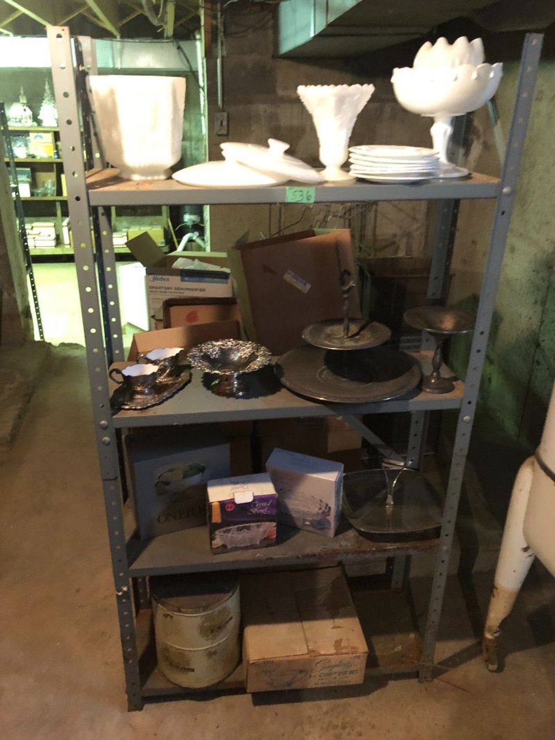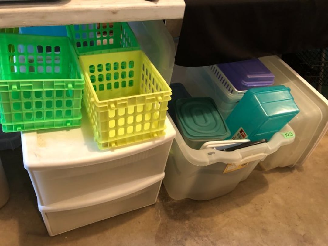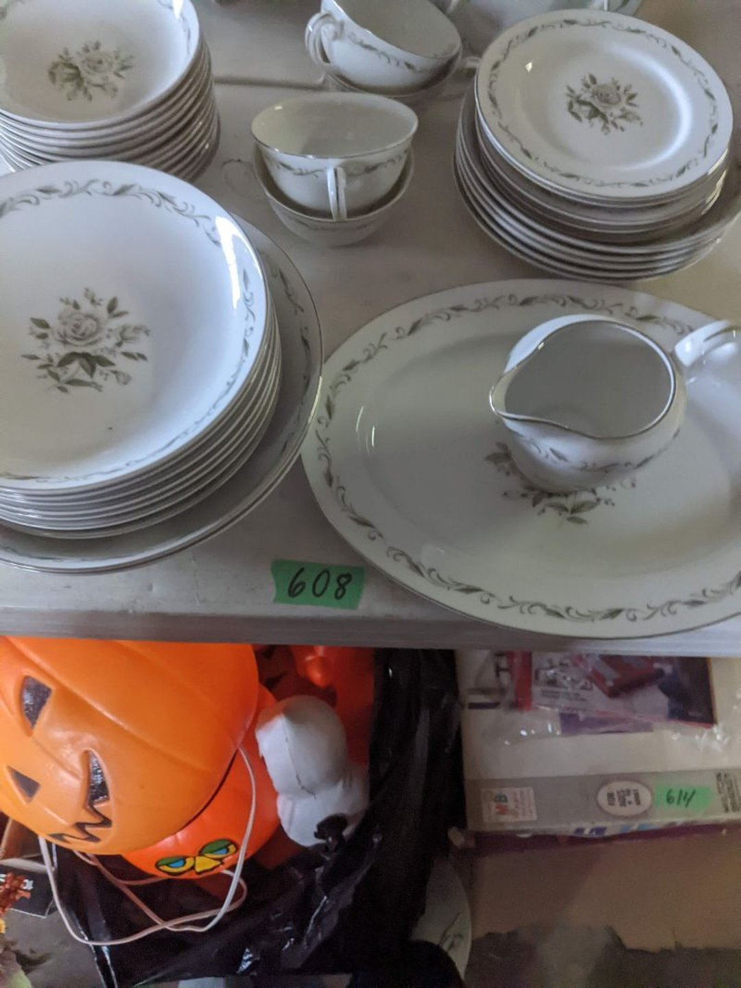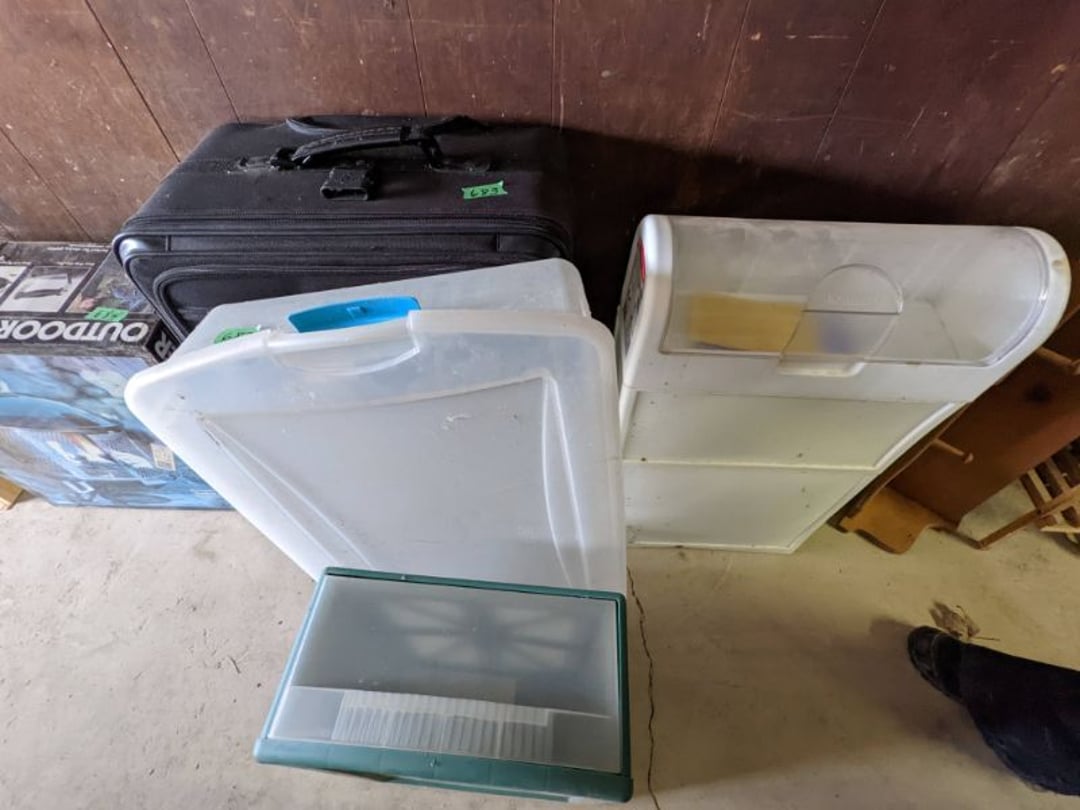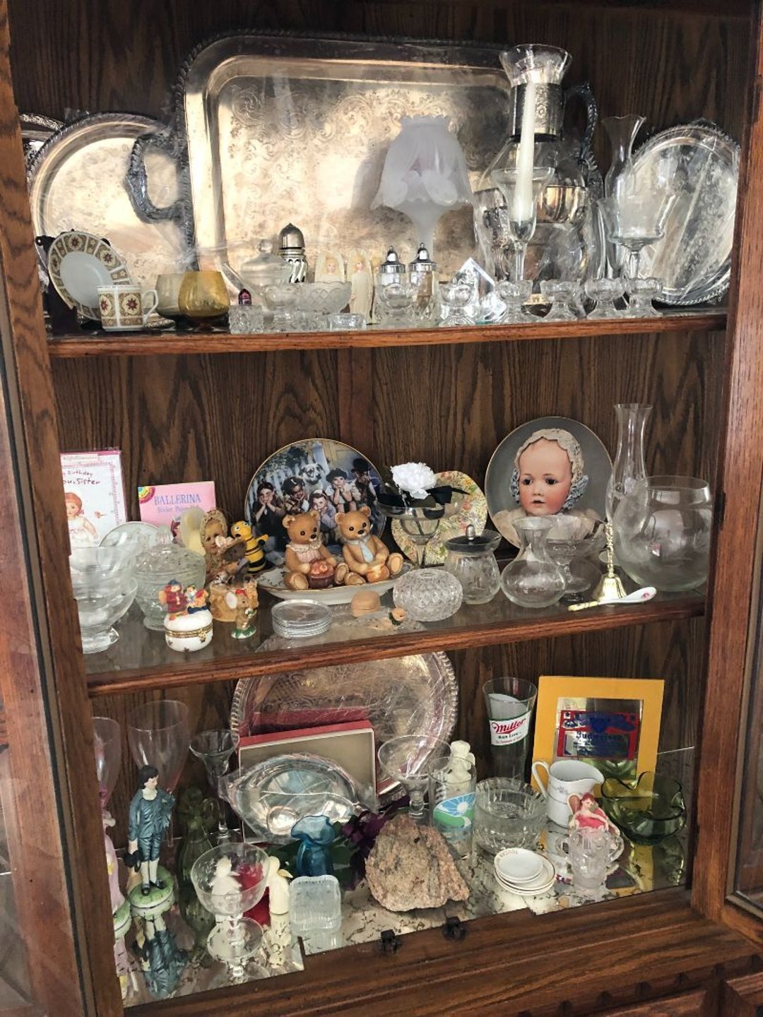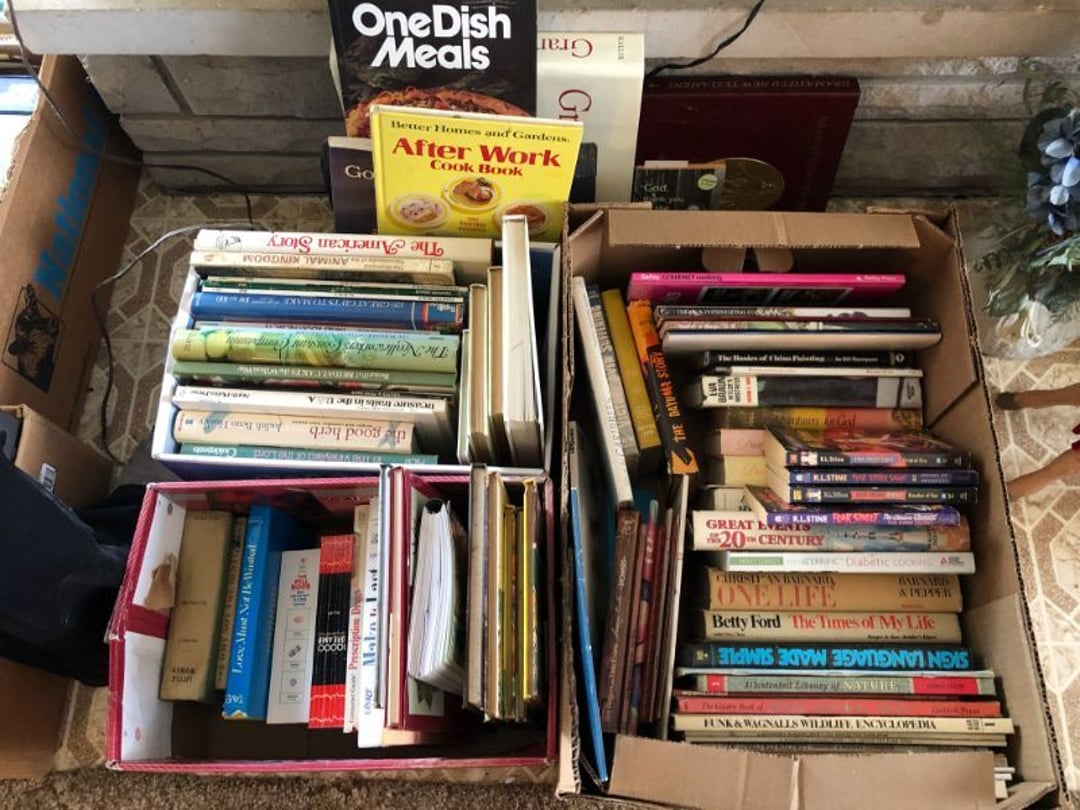 2 Griswold cast iron skillets, Salt and pepper shakers, blue Ball jars, refrigerator dishes, cookie jar, Pink rose dishes, Seyfert's pretzel jar, Jadite blossom design plate, Hull basket, Pink and cream small Hull vase, Roseville pitcher vase, Silver leaf glasses, Cast iron car, metal duck, metal horse bookend, ship bookend, Texaco pump, Glass fish, flower, vase, vintage bookends, bowl, planter, 3 piece moon and stars glassware, Fenton basket, fairy lights, misc glass, Pink, green, yellow depression dishes, Mayfair pink depression dishes, cracker jar, candy jar, 3 Mayfair pink depression bowls, Cast iron doorstop, 75 piece Homer Laughlin dogwood pattern dishes, Patton heater, small fan, Misc kitchenware, Strainer, 2 pressure cookers, Vintage Silvertone radio, 3 vintage ladies hats, 6 men's hats, Magnavox CD player and cassette recorder, cassettes, Juliette Eight Track Stereo player, 8 tracks, Sony fm/am stereo cassette recorder, cassettes, Crocks, sad iron, Vintage kitchenware, DVDs, 37 piece Homer Laughlin Georgian Eggshell dishes, Basket of glass vegetables, Vintage child's dishes, 2 pieces candle wick, 1 American sweetheart plate, 3 pieces bubbleglass, novelties and advertising, violin, 2 Furbys, Dubl Handi washboard, 2 feed bags, 2 cuckoo clocks both made in Germany, 29 pieces of misc Corelle, 95+ pieces of Lazy Daisy Corelle and flatware, 8 Pyrex mixing bowls, 2 Pyrex measuring pitchers, Copper boiler (rusty), vintage pot (chipped), American Tourister suitcase, Holiday decorations, Pots and pans with tote, Cleaning supplies, wire racks, Vintage handmade quilt, Signed handmade quilt, Comforter (damaged), 17 Life magazines from 1969 and 1971, 1969 Sears catalog, Handmade cross stitch flower quilt, State bird needlepoint quilt 96" x 68", Handmade signed quilt 108" x 84", Pyrex 3 piece casseroles, Commodore vintage computer, misc computer equipment, Bell & Howell movie projector, Quilt rack, automatic knitter, Small metal cabinet, Body power inversion table, Vitamaster 1000 XT exercise bike, Craft supplies and metal rack, Coppertone rack with sewing supplies and glassware, Coppertone rack with glassware, pop bottles, ceramic statutes, Record albums, Chalkboard, 3 mirrors, Fossil advertising sign, Metal plant stand, Craft supplies, material, doll heads, toolbox w/paints, metal rack, Weber small grill, 9' x 13' screen house, 3 wooden folding chairs, metal folding chair, 2 lawn chairs, 4 cushions, Belt buckles, knives, lighters, cuff links, hand warmers, Jewelry and jewelry boxes, Cat's eye ring, Logger, chicken wire, watering can, pavers, magnet, 2 boxes of canning jars, Whirlpool hot spa, Matmassager, Chi machine, exercise equipment, Painting supplies, small trash can, plastic baskets, Yard and garden tools, Adams Central letter jacket and t-shirt, Hammock, 2 folding lawn chairs, NIB heavy-duty shelving, Nib Proctor Silex coffee maker, rock garden, Nib Shiatsu foot massager, nib Snuggie, Staple gun, hammers, knives, screwdrivers, Champion socket set, Air pump, light bulbs, smoke alarms, hole saw set, glue gun, parts bin, 3 license plates, Kerosene heater, Patton electric heater, Magnifying lamp, bungee cords, batteries, oil can, Rubbermaid medium size cooler, Igloo polar roller 60 quart cooler, Metal shelving with glassware, stemware, vases, pots, plant stands, buckets, Metal shelving with garden supplies, small wooden ladder, bowling ball, Metal shelving with Memories of Yesterday and misc figurines, Large new extension cord, 3 aluminum treble lights, 2 Blue Mountain 2 piece rainsuits, small Comfort Zone heater, GE HEPA air purifier, Storage totes and containers misc sizes, 3 boxes of décor, Hand blown art glass, 7 pieces of Lefton china, glass basket and animals, Precious Moments collection, Precious Moments musical Ferris wheel, town buildings, books, Precious Moments train, nativity, 14 misc pieces, Brinn's musical dolls, Sleigh bells, 2 vintage bird pictures with feathers, Quilt top 74" x 90", Vintage marbles, Cast iron collection, Wicker planter, Garden statues, 2 photo screens, Vintage light-up Santa and snowman, Huge assortment of Christmas, 3 piece Roseville, Vases and decorator pieces, 18" green plate, glass decorator pieces, 46" x 36" drop leaf table with 2 chairs, Glassware, Americana Star stainless steel flatware service for 12 with chest, Oneida Wm A Rogers AI Plus flatware, 3 pieces silver plated items, Wm Rogers silver tea set, casserole, cutlery, cake knife, Silver plated assortment, 18" tall metal patio table, 5 garden statues, Large sitting angel cement statue, 4 plant stands, Vintage large green glass vase, large artificial rose, Heavy metal stand with glass shelves, wooden cabinet with contents, Misc wall items, Vintage metal serving cart, Microwave and cart, wall décor, Advertising yardsticks, grabber, dusters, gloves, Toshiba 19" television with remote, 6" pasta machine, metal kitchen utensils, warming tray, Office supplies, Kitchen table with 1 leaf and 6 chairs with wheels, Rival electric slicer, Primo water dispenser, Wm Rogers "Harvest" pitcher, Leonard silver plated pitcher, misc silver pieces, Heavy vintage glass pitcher, spongeware bowl, 3 crock bowls, coffee urn, 7 "The Young and the Restless" collector plates, record of "Nadia's Theme", Leonard silver plated pitcher, 2 silver plated cups, William Rogers candlesticks, Fire King baking dishes, 2 casseroles, Pyrex casserole, Misc Corningware and Fire King, 2 boxes of 25 Boopie stemware, Wooden bull, F B Rogers Silver Company tea set - Sugar and creamer, footed waste, Sharp Carousel microwave, Glitter lava-type lamp, dancing clown music box, 20+ pieces of mushroom design kitchen set, 2 boxes of flatware, 1 boxes of knives, sharpening steel, Vintage elephant cookie jar, 8 pieces Lefton china, 12 pieces Pink Rose Lefton china, McCoy cookie jar, 4 boxes of kitchen utensils, Joseph Rogers Jr & Sons drum with case and drum sticks, Bissel Powerforce bagless vacuum, Vintage Shirley Temple "First Vacation" doll, Vin