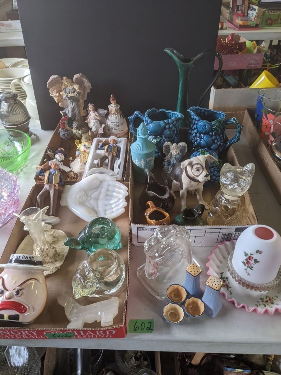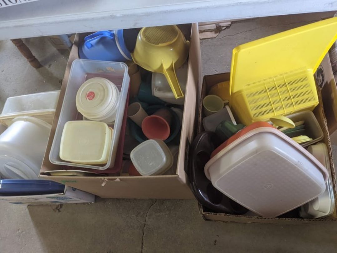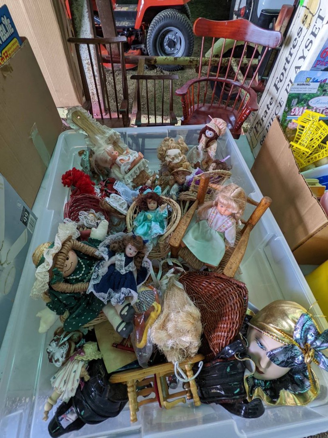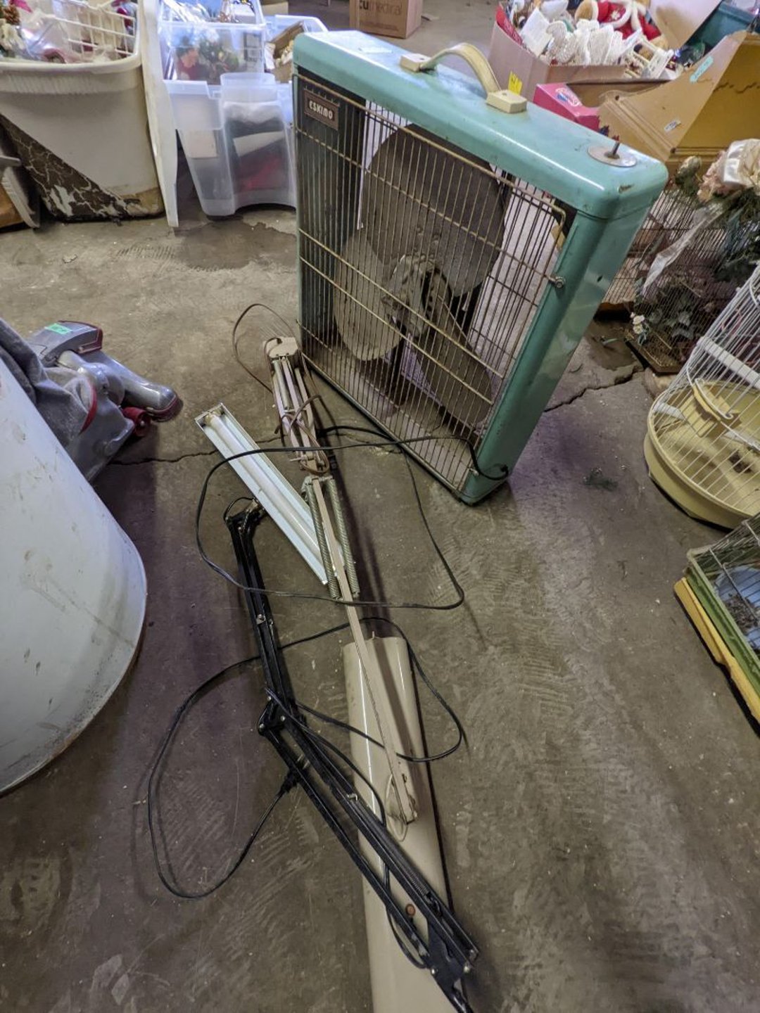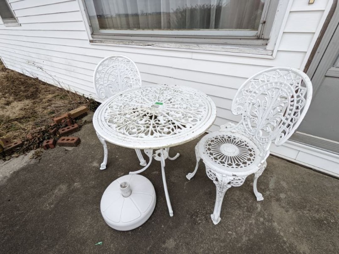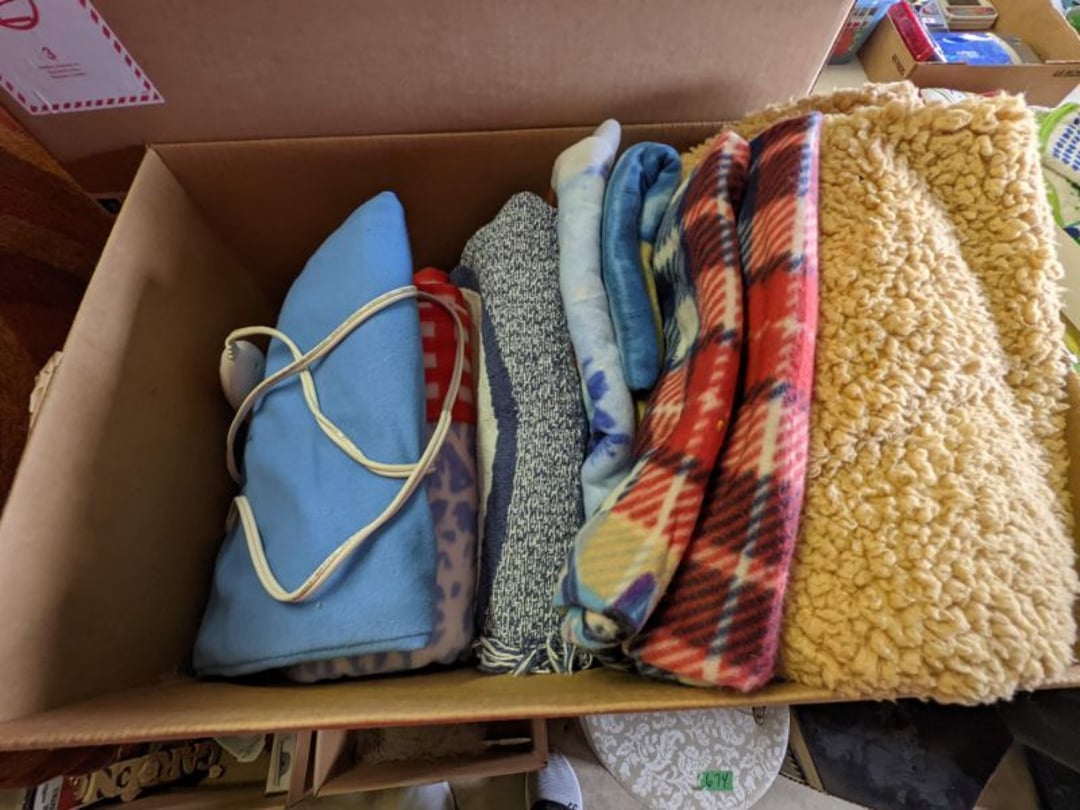 2 Griswold cast iron skillets, Salt and pepper shakers, blue Ball jars, refrigerator dishes, cookie jar, Pink rose dishes, Seyfert's pretzel jar, Jadite blossom design plate, Hull basket, Pink and cream small Hull vase, Roseville pitcher vase, Silver leaf glasses, Cast iron car, metal duck, metal horse bookend, ship bookend, Texaco pump, Glass fish, flower, vase, vintage bookends, bowl, planter, 3 piece moon and stars glassware, Fenton basket, fairy lights, misc glass, Pink, green, yellow depression dishes, Mayfair pink depression dishes, cracker jar, candy jar, 3 Mayfair pink depression bowls, Cast iron doorstop, 75 piece Homer Laughlin dogwood pattern dishes, Patton heater, small fan, Misc kitchenware, Strainer, 2 pressure cookers, Vintage Silvertone radio, 3 vintage ladies hats, 6 men's hats, Magnavox CD player and cassette recorder, cassettes, Juliette Eight Track Stereo player, 8 tracks, Sony fm/am stereo cassette recorder, cassettes, Crocks, sad iron, Vintage kitchenware, DVDs, 37 piece Homer Laughlin Georgian Eggshell dishes, Basket of glass vegetables, Vintage child's dishes, 2 pieces candle wick, 1 American sweetheart plate, 3 pieces bubbleglass, novelties and advertising, violin, 2 Furbys, Dubl Handi washboard, 2 feed bags, 2 cuckoo clocks both made in Germany, 29 pieces of misc Corelle, 95+ pieces of Lazy Daisy Corelle and flatware, 8 Pyrex mixing bowls, 2 Pyrex measuring pitchers, Copper boiler (rusty), vintage pot (chipped), American Tourister suitcase, Holiday decorations, Pots and pans with tote, Cleaning supplies, wire racks, Vintage handmade quilt, Signed handmade quilt, Comforter (damaged), 17 Life magazines from 1969 and 1971, 1969 Sears catalog, Handmade cross stitch flower quilt, State bird needlepoint quilt 96" x 68", Handmade signed quilt 108" x 84", Pyrex 3 piece casseroles, Commodore vintage computer, misc computer equipment, Bell & Howell movie projector, Quilt rack, automatic knitter, Small metal cabinet, Body power inversion table, Vitamaster 1000 XT exercise bike, Craft supplies and metal rack, Coppertone rack with sewing supplies and glassware, Coppertone rack with glassware, pop bottles, ceramic statutes, Record albums, Chalkboard, 3 mirrors, Fossil advertising sign, Metal plant stand, Craft supplies, material, doll heads, toolbox w/paints, metal rack, Weber small grill, 9' x 13' screen house, 3 wooden folding chairs, metal folding chair, 2 lawn chairs, 4 cushions, Belt buckles, knives, lighters, cuff links, hand warmers, Jewelry and jewelry boxes, Cat's eye ring, Logger, chicken wire, watering can, pavers, magnet, 2 boxes of canning jars, Whirlpool hot spa, Matmassager, Chi machine, exercise equipment, Painting supplies, small trash can, plastic baskets, Yard and garden tools, Adams Central letter jacket and t-shirt, Hammock, 2 folding lawn chairs, NIB heavy-duty shelving, Nib Proctor Silex coffee maker, rock garden, Nib Shiatsu foot massager, nib Snuggie, Staple gun, hammers, knives, screwdrivers, Champion socket set, Air pump, light bulbs, smoke alarms, hole saw set, glue gun, parts bin, 3 license plates, Kerosene heater, Patton electric heater, Magnifying lamp, bungee cords, batteries, oil can, Rubbermaid medium size cooler, Igloo polar roller 60 quart cooler, Metal shelving with glassware, stemware, vases, pots, plant stands, buckets, Metal shelving with garden supplies, small wooden ladder, bowling ball, Metal shelving with Memories of Yesterday and misc figurines, Large new extension cord, 3 aluminum treble lights, 2 Blue Mountain 2 piece rainsuits, small Comfort Zone heater, GE HEPA air purifier, Storage totes and containers misc sizes, 3 boxes of décor, Hand blown art glass, 7 pieces of Lefton china, glass basket and animals, Precious Moments collection, Precious Moments musical Ferris wheel, town buildings, books, Precious Moments train, nativity, 14 misc pieces, Brinn's musical dolls, Sleigh bells, 2 vintage bird pictures with feathers, Quilt top 74" x 90", Vintage marbles, Cast iron collection, Wicker planter, Garden statues, 2 photo screens, Vintage light-up Santa and snowman, Huge assortment of Christmas, 3 piece Roseville, Vases and decorator pieces, 18" green plate, glass decorator pieces, 46" x 36" drop leaf table with 2 chairs, Glassware, Americana Star stainless steel flatware service for 12 with chest, Oneida Wm A Rogers AI Plus flatware, 3 pieces silver plated items, Wm Rogers silver tea set, casserole, cutlery, cake knife, Silver plated assortment, 18" tall metal patio table, 5 garden statues, Large sitting angel cement statue, 4 plant stands, Vintage large green glass vase, large artificial rose, Heavy metal stand with glass shelves, wooden cabinet with contents, Misc wall items, Vintage metal serving cart, Microwave and cart, wall décor, Advertising yardsticks, grabber, dusters, gloves, Toshiba 19" television with remote, 6" pasta machine, metal kitchen utensils, warming tray, Office supplies, Kitchen table with 1 leaf and 6 chairs with wheels, Rival electric slicer, Primo water dispenser, Wm Rogers "Harvest" pitcher, Leonard silver plated pitcher, misc silver pieces, Heavy vintage glass pitcher, spongeware bowl, 3 crock bowls, coffee urn, 7 "The Young and the Restless" collector plates, record of "Nadia's Theme", Leonard silver plated pitcher, 2 silver plated cups, William Rogers candlesticks, Fire King baking dishes, 2 casseroles, Pyrex casserole, Misc Corningware and Fire King, 2 boxes of 25 Boopie stemware, Wooden bull, F B Rogers Silver Company tea set - Sugar and creamer, footed waste, Sharp Carousel microwave, Glitter lava-type lamp, dancing clown music box, 20+ pieces of mushroom design kitchen set, 2 boxes of flatware, 1 boxes of knives, sharpening steel, Vintage elephant cookie jar, 8 pieces Lefton china, 12 pieces Pink Rose Lefton china, McCoy cookie jar, 4 boxes of kitchen utensils, Joseph Rogers Jr & Sons drum with case and drum sticks, Bissel Powerforce bagless vacuum, Vintage Shirley Temple "First Vacation" doll, Vin