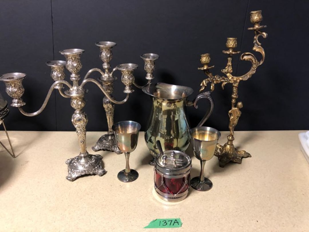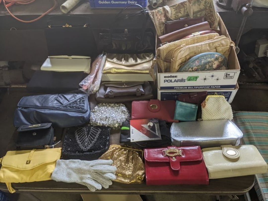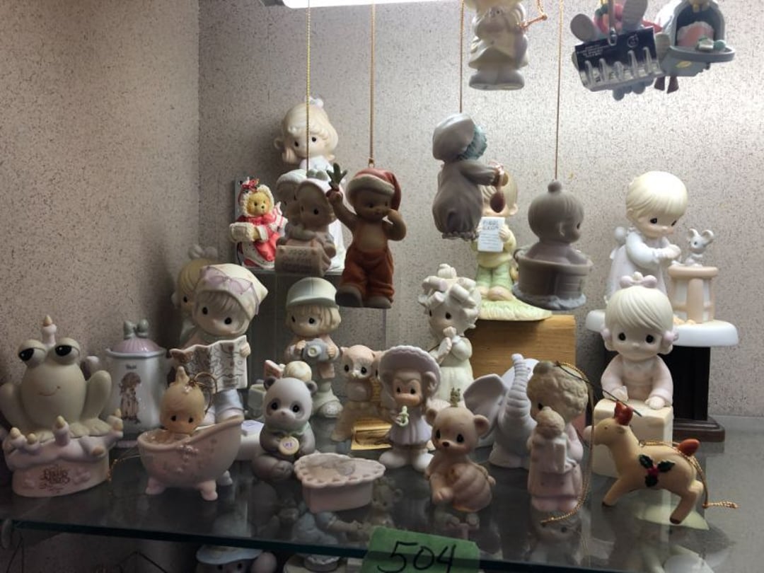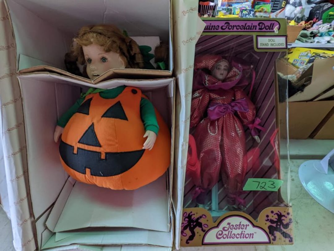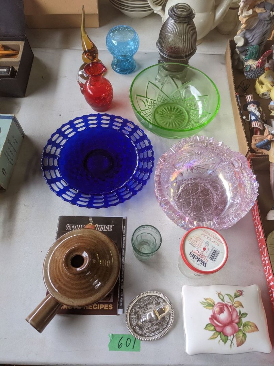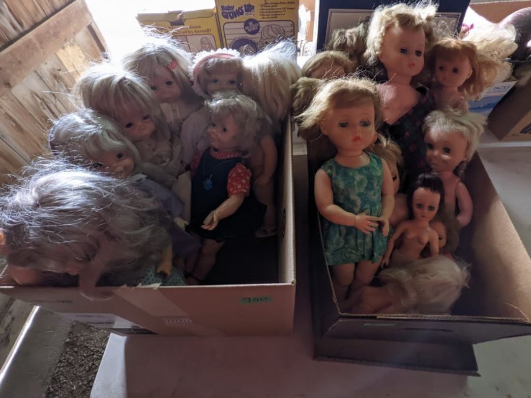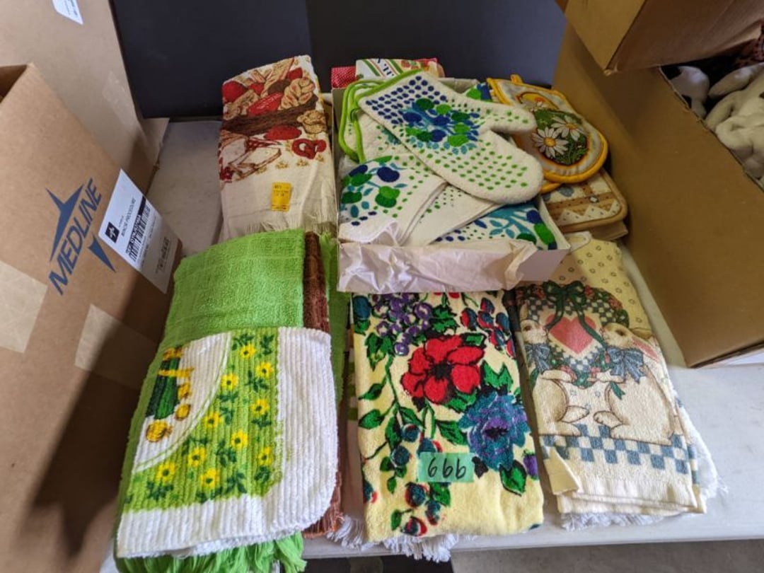 2 Griswold cast iron skillets, Salt and pepper shakers, blue Ball jars, refrigerator dishes, cookie jar, Pink rose dishes, Seyfert's pretzel jar, Jadite blossom design plate, Hull basket, Pink and cream small Hull vase, Roseville pitcher vase, Silver leaf glasses, Cast iron car, metal duck, metal horse bookend, ship bookend, Texaco pump, Glass fish, flower, vase, vintage bookends, bowl, planter, 3 piece moon and stars glassware, Fenton basket, fairy lights, misc glass, Pink, green, yellow depression dishes, Mayfair pink depression dishes, cracker jar, candy jar, 3 Mayfair pink depression bowls, Cast iron doorstop, 75 piece Homer Laughlin dogwood pattern dishes, Patton heater, small fan, Misc kitchenware, Strainer, 2 pressure cookers, Vintage Silvertone radio, 3 vintage ladies hats, 6 men's hats, Magnavox CD player and cassette recorder, cassettes, Juliette Eight Track Stereo player, 8 tracks, Sony fm/am stereo cassette recorder, cassettes, Crocks, sad iron, Vintage kitchenware, DVDs, 37 piece Homer Laughlin Georgian Eggshell dishes, Basket of glass vegetables, Vintage child's dishes, 2 pieces candle wick, 1 American sweetheart plate, 3 pieces bubbleglass, novelties and advertising, violin, 2 Furbys, Dubl Handi washboard, 2 feed bags, 2 cuckoo clocks both made in Germany, 29 pieces of misc Corelle, 95+ pieces of Lazy Daisy Corelle and flatware, 8 Pyrex mixing bowls, 2 Pyrex measuring pitchers, Copper boiler (rusty), vintage pot (chipped), American Tourister suitcase, Holiday decorations, Pots and pans with tote, Cleaning supplies, wire racks, Vintage handmade quilt, Signed handmade quilt, Comforter (damaged), 17 Life magazines from 1969 and 1971, 1969 Sears catalog, Handmade cross stitch flower quilt, State bird needlepoint quilt 96" x 68", Handmade signed quilt 108" x 84", Pyrex 3 piece casseroles, Commodore vintage computer, misc computer equipment, Bell & Howell movie projector, Quilt rack, automatic knitter, Small metal cabinet, Body power inversion table, Vitamaster 1000 XT exercise bike, Craft supplies and metal rack, Coppertone rack with sewing supplies and glassware, Coppertone rack with glassware, pop bottles, ceramic statutes, Record albums, Chalkboard, 3 mirrors, Fossil advertising sign, Metal plant stand, Craft supplies, material, doll heads, toolbox w/paints, metal rack, Weber small grill, 9' x 13' screen house, 3 wooden folding chairs, metal folding chair, 2 lawn chairs, 4 cushions, Belt buckles, knives, lighters, cuff links, hand warmers, Jewelry and jewelry boxes, Cat's eye ring, Logger, chicken wire, watering can, pavers, magnet, 2 boxes of canning jars, Whirlpool hot spa, Matmassager, Chi machine, exercise equipment, Painting supplies, small trash can, plastic baskets, Yard and garden tools, Adams Central letter jacket and t-shirt, Hammock, 2 folding lawn chairs, NIB heavy-duty shelving, Nib Proctor Silex coffee maker, rock garden, Nib Shiatsu foot massager, nib Snuggie, Staple gun, hammers, knives, screwdrivers, Champion socket set, Air pump, light bulbs, smoke alarms, hole saw set, glue gun, parts bin, 3 license plates, Kerosene heater, Patton electric heater, Magnifying lamp, bungee cords, batteries, oil can, Rubbermaid medium size cooler, Igloo polar roller 60 quart cooler, Metal shelving with glassware, stemware, vases, pots, plant stands, buckets, Metal shelving with garden supplies, small wooden ladder, bowling ball, Metal shelving with Memories of Yesterday and misc figurines, Large new extension cord, 3 aluminum treble lights, 2 Blue Mountain 2 piece rainsuits, small Comfort Zone heater, GE HEPA air purifier, Storage totes and containers misc sizes, 3 boxes of décor, Hand blown art glass, 7 pieces of Lefton china, glass basket and animals, Precious Moments collection, Precious Moments musical Ferris wheel, town buildings, books, Precious Moments train, nativity, 14 misc pieces, Brinn's musical dolls, Sleigh bells, 2 vintage bird pictures with feathers, Quilt top 74" x 90", Vintage marbles, Cast iron collection, Wicker planter, Garden statues, 2 photo screens, Vintage light-up Santa and snowman, Huge assortment of Christmas, 3 piece Roseville, Vases and decorator pieces, 18" green plate, glass decorator pieces, 46" x 36" drop leaf table with 2 chairs, Glassware, Americana Star stainless steel flatware service for 12 with chest, Oneida Wm A Rogers AI Plus flatware, 3 pieces silver plated items, Wm Rogers silver tea set, casserole, cutlery, cake knife, Silver plated assortment, 18" tall metal patio table, 5 garden statues, Large sitting angel cement statue, 4 plant stands, Vintage large green glass vase, large artificial rose, Heavy metal stand with glass shelves, wooden cabinet with contents, Misc wall items, Vintage metal serving cart, Microwave and cart, wall décor, Advertising yardsticks, grabber, dusters, gloves, Toshiba 19" television with remote, 6" pasta machine, metal kitchen utensils, warming tray, Office supplies, Kitchen table with 1 leaf and 6 chairs with wheels, Rival electric slicer, Primo water dispenser, Wm Rogers "Harvest" pitcher, Leonard silver plated pitcher, misc silver pieces, Heavy vintage glass pitcher, spongeware bowl, 3 crock bowls, coffee urn, 7 "The Young and the Restless" collector plates, record of "Nadia's Theme", Leonard silver plated pitcher, 2 silver plated cups, William Rogers candlesticks, Fire King baking dishes, 2 casseroles, Pyrex casserole, Misc Corningware and Fire King, 2 boxes of 25 Boopie stemware, Wooden bull, F B Rogers Silver Company tea set - Sugar and creamer, footed waste, Sharp Carousel microwave, Glitter lava-type lamp, dancing clown music box, 20+ pieces of mushroom design kitchen set, 2 boxes of flatware, 1 boxes of knives, sharpening steel, Vintage elephant cookie jar, 8 pieces Lefton china, 12 pieces Pink Rose Lefton china, McCoy cookie jar, 4 boxes of kitchen utensils, Joseph Rogers Jr & Sons drum with case and drum sticks, Bissel Powerforce bagless vacuum, Vintage Shirley Temple "First Vacation" doll, Vin