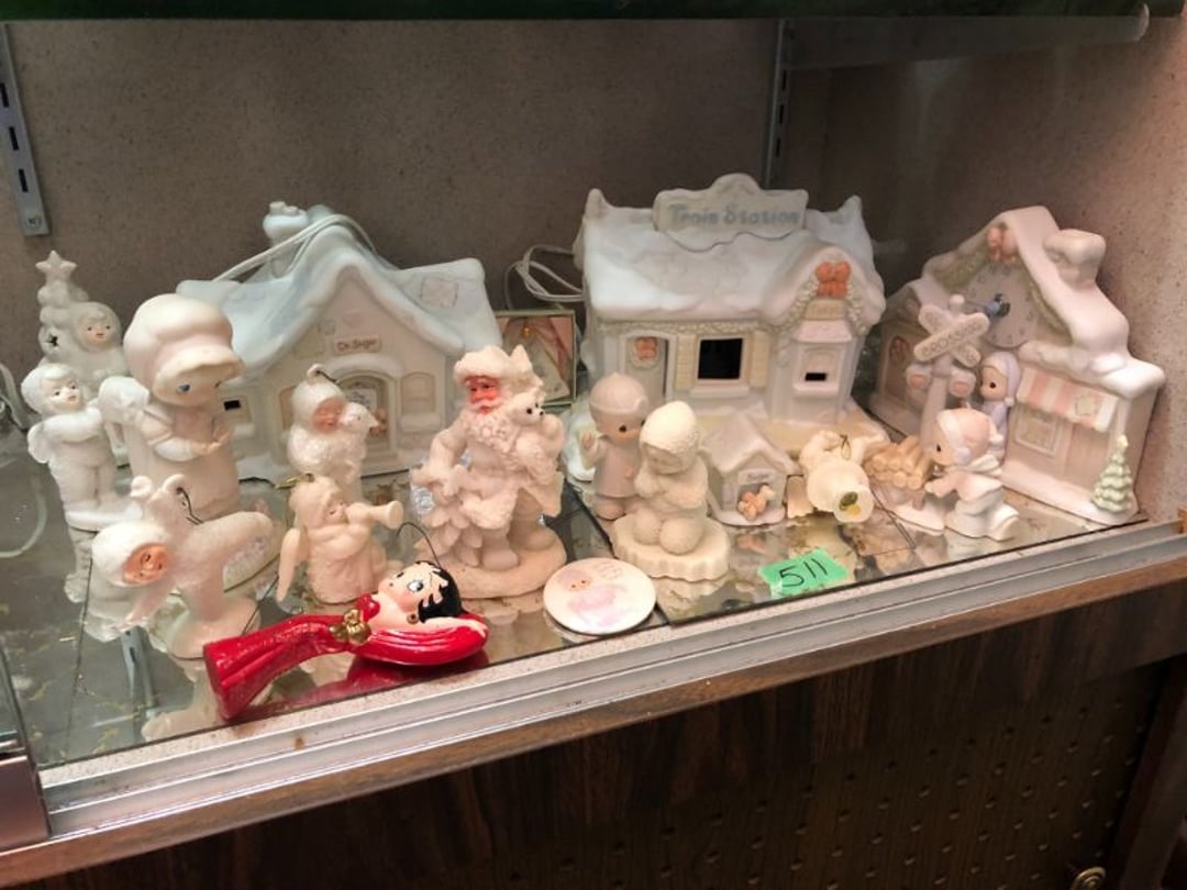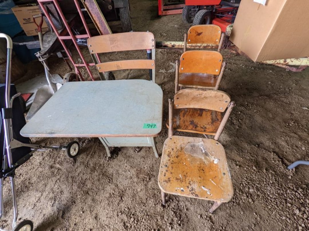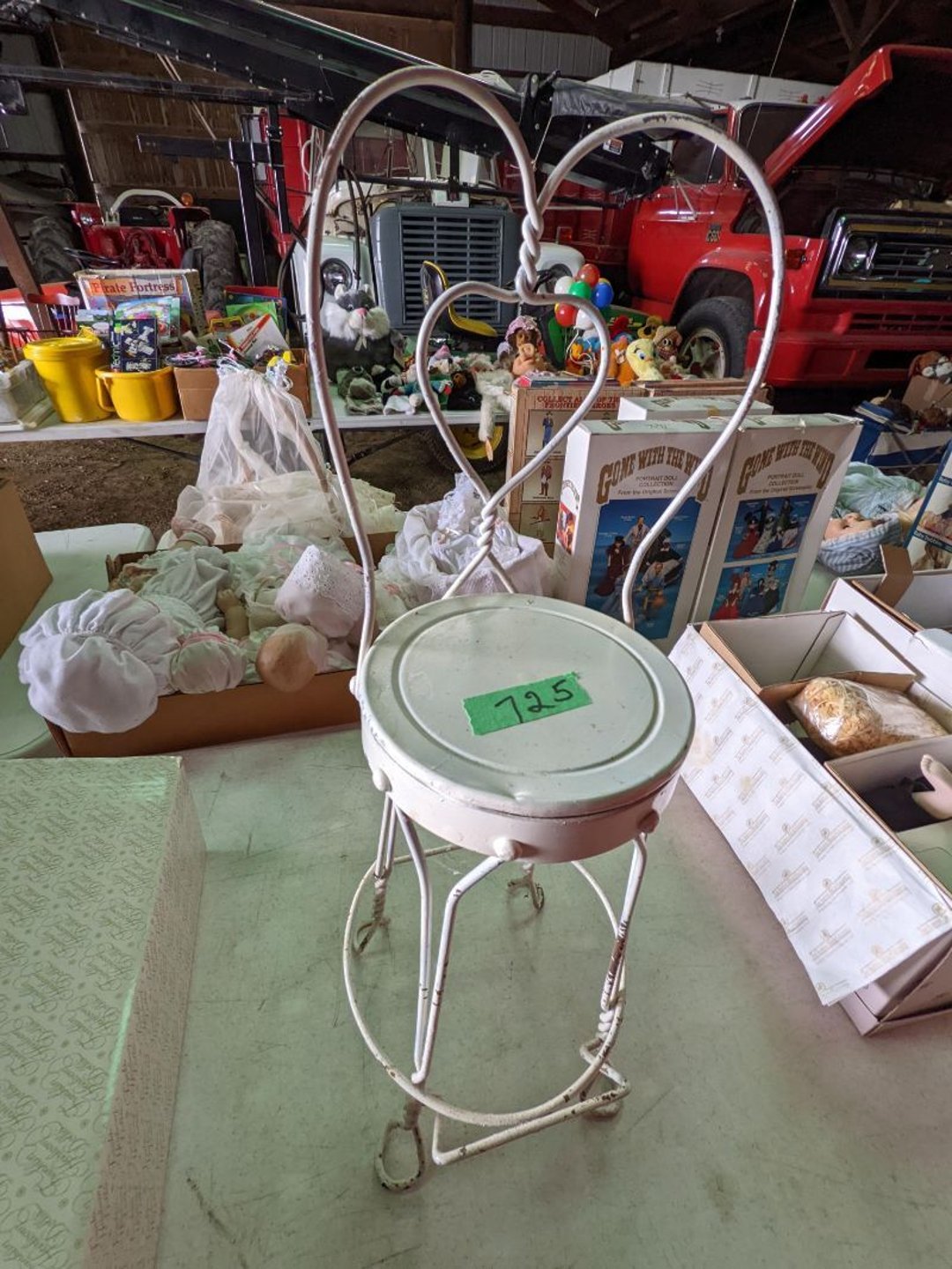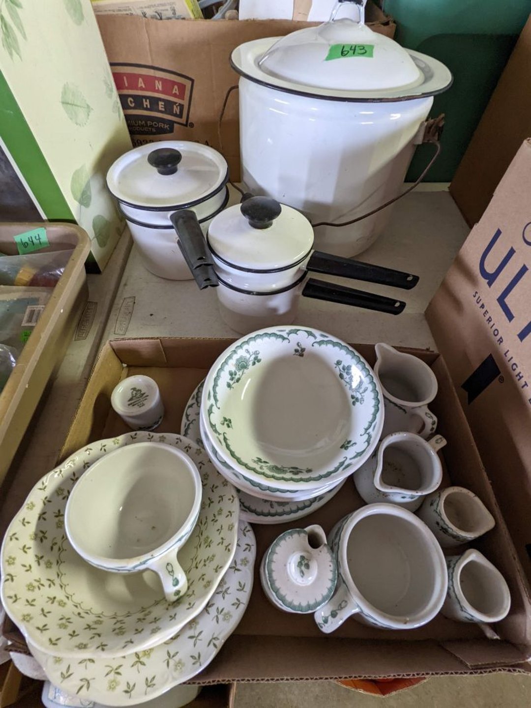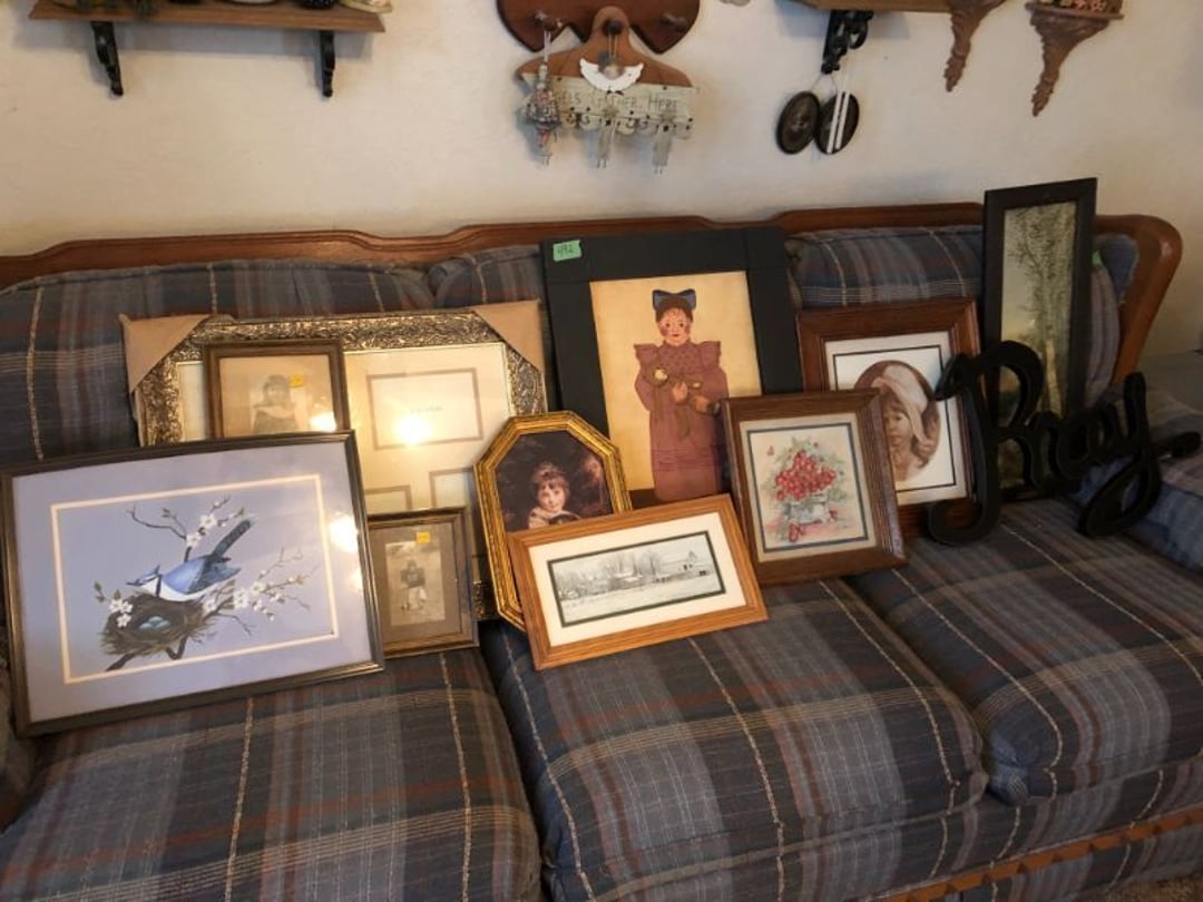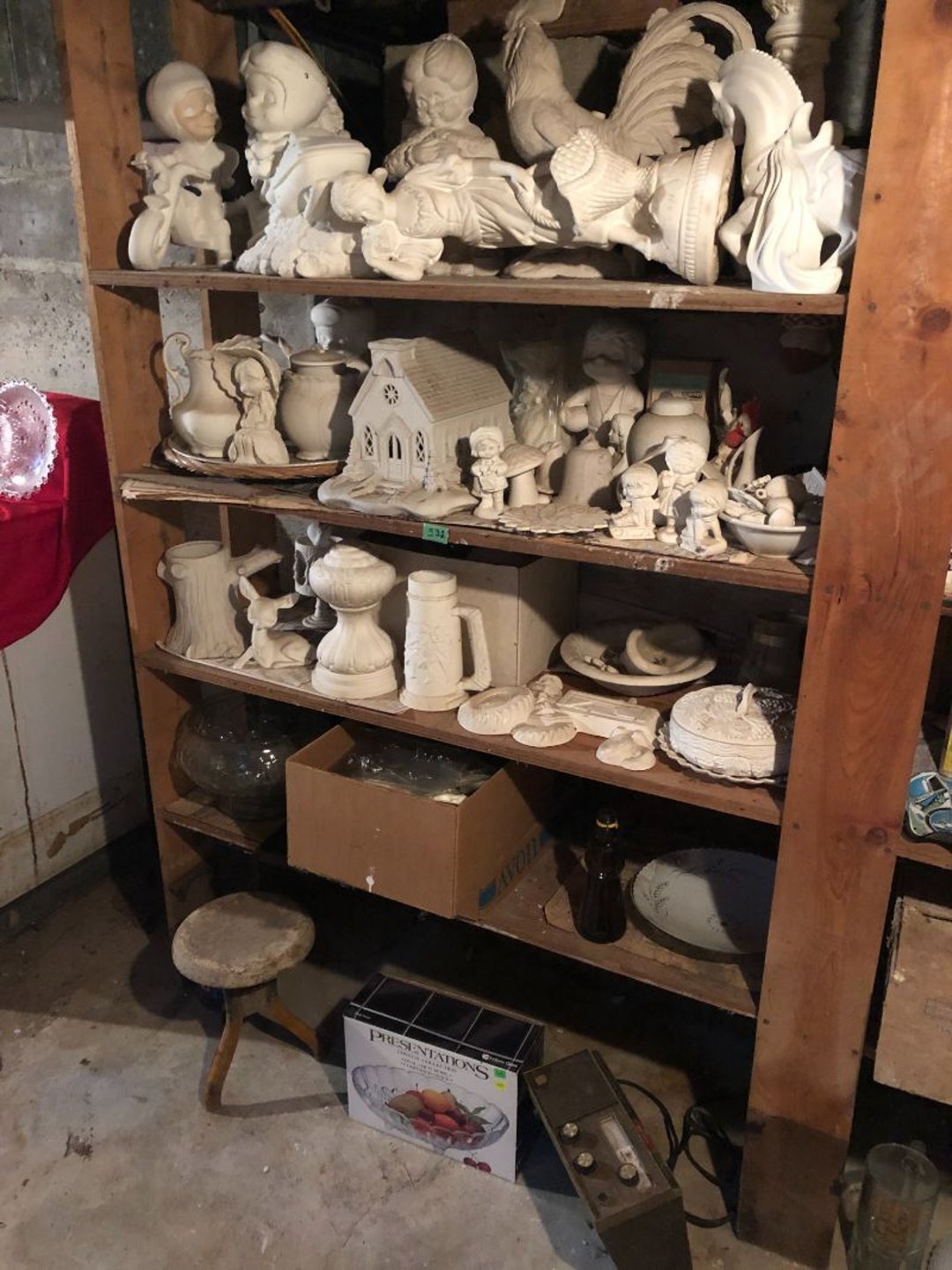 2 Griswold cast iron skillets, Salt and pepper shakers, blue Ball jars, refrigerator dishes, cookie jar, Pink rose dishes, Seyfert's pretzel jar, Jadite blossom design plate, Hull basket, Pink and cream small Hull vase, Roseville pitcher vase, Silver leaf glasses, Cast iron car, metal duck, metal horse bookend, ship bookend, Texaco pump, Glass fish, flower, vase, vintage bookends, bowl, planter, 3 piece moon and stars glassware, Fenton basket, fairy lights, misc glass, Pink, green, yellow depression dishes, Mayfair pink depression dishes, cracker jar, candy jar, 3 Mayfair pink depression bowls, Cast iron doorstop, 75 piece Homer Laughlin dogwood pattern dishes, Patton heater, small fan, Misc kitchenware, Strainer, 2 pressure cookers, Vintage Silvertone radio, 3 vintage ladies hats, 6 men's hats, Magnavox CD player and cassette recorder, cassettes, Juliette Eight Track Stereo player, 8 tracks, Sony fm/am stereo cassette recorder, cassettes, Crocks, sad iron, Vintage kitchenware, DVDs, 37 piece Homer Laughlin Georgian Eggshell dishes, Basket of glass vegetables, Vintage child's dishes, 2 pieces candle wick, 1 American sweetheart plate, 3 pieces bubbleglass, novelties and advertising, violin, 2 Furbys, Dubl Handi washboard, 2 feed bags, 2 cuckoo clocks both made in Germany, 29 pieces of misc Corelle, 95+ pieces of Lazy Daisy Corelle and flatware, 8 Pyrex mixing bowls, 2 Pyrex measuring pitchers, Copper boiler (rusty), vintage pot (chipped), American Tourister suitcase, Holiday decorations, Pots and pans with tote, Cleaning supplies, wire racks, Vintage handmade quilt, Signed handmade quilt, Comforter (damaged), 17 Life magazines from 1969 and 1971, 1969 Sears catalog, Handmade cross stitch flower quilt, State bird needlepoint quilt 96" x 68", Handmade signed quilt 108" x 84", Pyrex 3 piece casseroles, Commodore vintage computer, misc computer equipment, Bell & Howell movie projector, Quilt rack, automatic knitter, Small metal cabinet, Body power inversion table, Vitamaster 1000 XT exercise bike, Craft supplies and metal rack, Coppertone rack with sewing supplies and glassware, Coppertone rack with glassware, pop bottles, ceramic statutes, Record albums, Chalkboard, 3 mirrors, Fossil advertising sign, Metal plant stand, Craft supplies, material, doll heads, toolbox w/paints, metal rack, Weber small grill, 9' x 13' screen house, 3 wooden folding chairs, metal folding chair, 2 lawn chairs, 4 cushions, Belt buckles, knives, lighters, cuff links, hand warmers, Jewelry and jewelry boxes, Cat's eye ring, Logger, chicken wire, watering can, pavers, magnet, 2 boxes of canning jars, Whirlpool hot spa, Matmassager, Chi machine, exercise equipment, Painting supplies, small trash can, plastic baskets, Yard and garden tools, Adams Central letter jacket and t-shirt, Hammock, 2 folding lawn chairs, NIB heavy-duty shelving, Nib Proctor Silex coffee maker, rock garden, Nib Shiatsu foot massager, nib Snuggie, Staple gun, hammers, knives, screwdrivers, Champion socket set, Air pump, light bulbs, smoke alarms, hole saw set, glue gun, parts bin, 3 license plates, Kerosene heater, Patton electric heater, Magnifying lamp, bungee cords, batteries, oil can, Rubbermaid medium size cooler, Igloo polar roller 60 quart cooler, Metal shelving with glassware, stemware, vases, pots, plant stands, buckets, Metal shelving with garden supplies, small wooden ladder, bowling ball, Metal shelving with Memories of Yesterday and misc figurines, Large new extension cord, 3 aluminum treble lights, 2 Blue Mountain 2 piece rainsuits, small Comfort Zone heater, GE HEPA air purifier, Storage totes and containers misc sizes, 3 boxes of décor, Hand blown art glass, 7 pieces of Lefton china, glass basket and animals, Precious Moments collection, Precious Moments musical Ferris wheel, town buildings, books, Precious Moments train, nativity, 14 misc pieces, Brinn's musical dolls, Sleigh bells, 2 vintage bird pictures with feathers, Quilt top 74" x 90", Vintage marbles, Cast iron collection, Wicker planter, Garden statues, 2 photo screens, Vintage light-up Santa and snowman, Huge assortment of Christmas, 3 piece Roseville, Vases and decorator pieces, 18" green plate, glass decorator pieces, 46" x 36" drop leaf table with 2 chairs, Glassware, Americana Star stainless steel flatware service for 12 with chest, Oneida Wm A Rogers AI Plus flatware, 3 pieces silver plated items, Wm Rogers silver tea set, casserole, cutlery, cake knife, Silver plated assortment, 18" tall metal patio table, 5 garden statues, Large sitting angel cement statue, 4 plant stands, Vintage large green glass vase, large artificial rose, Heavy metal stand with glass shelves, wooden cabinet with contents, Misc wall items, Vintage metal serving cart, Microwave and cart, wall décor, Advertising yardsticks, grabber, dusters, gloves, Toshiba 19" television with remote, 6" pasta machine, metal kitchen utensils, warming tray, Office supplies, Kitchen table with 1 leaf and 6 chairs with wheels, Rival electric slicer, Primo water dispenser, Wm Rogers "Harvest" pitcher, Leonard silver plated pitcher, misc silver pieces, Heavy vintage glass pitcher, spongeware bowl, 3 crock bowls, coffee urn, 7 "The Young and the Restless" collector plates, record of "Nadia's Theme", Leonard silver plated pitcher, 2 silver plated cups, William Rogers candlesticks, Fire King baking dishes, 2 casseroles, Pyrex casserole, Misc Corningware and Fire King, 2 boxes of 25 Boopie stemware, Wooden bull, F B Rogers Silver Company tea set - Sugar and creamer, footed waste, Sharp Carousel microwave, Glitter lava-type lamp, dancing clown music box, 20+ pieces of mushroom design kitchen set, 2 boxes of flatware, 1 boxes of knives, sharpening steel, Vintage elephant cookie jar, 8 pieces Lefton china, 12 pieces Pink Rose Lefton china, McCoy cookie jar, 4 boxes of kitchen utensils, Joseph Rogers Jr & Sons drum with case and drum sticks, Bissel Powerforce bagless vacuum, Vintage Shirley Temple "First Vacation" doll, Vin