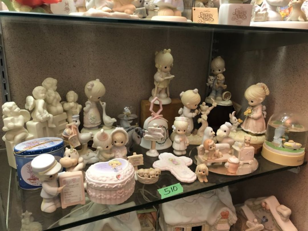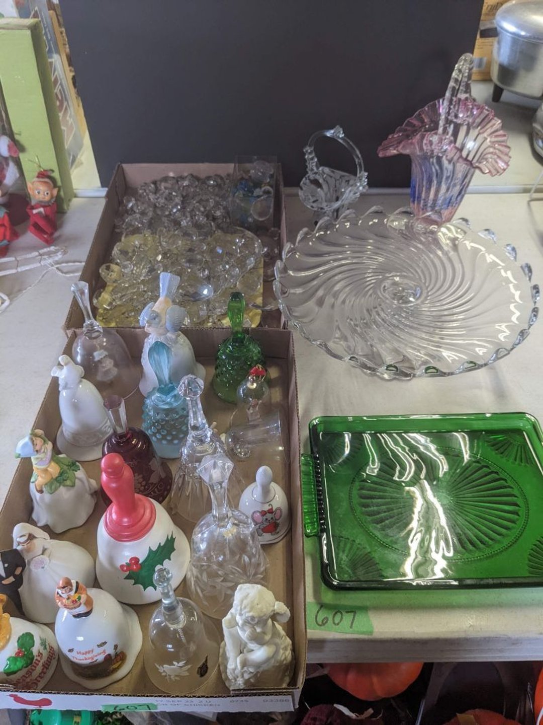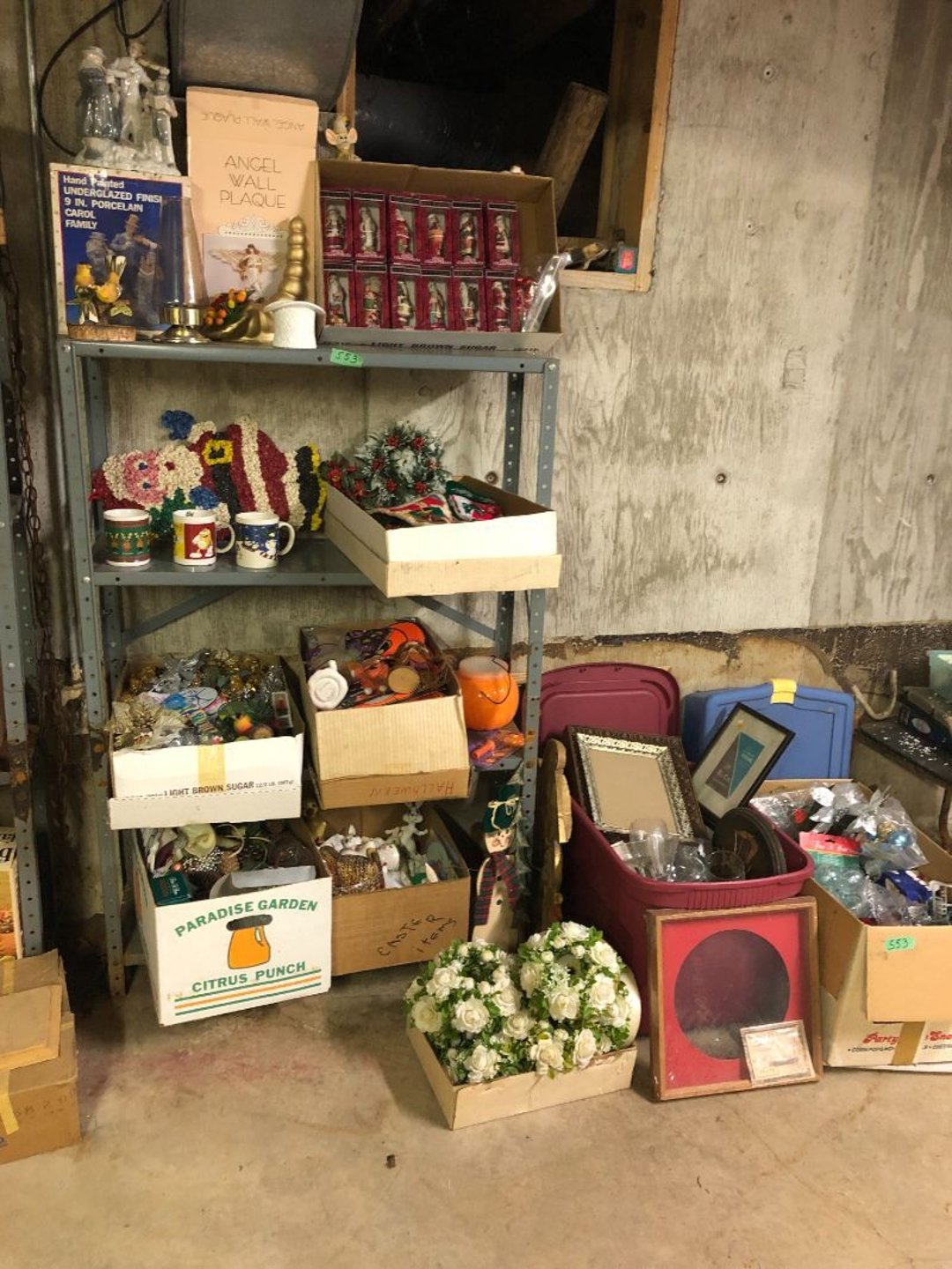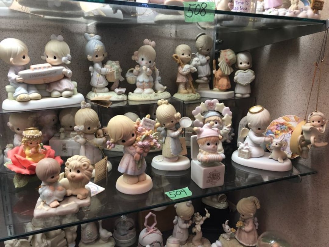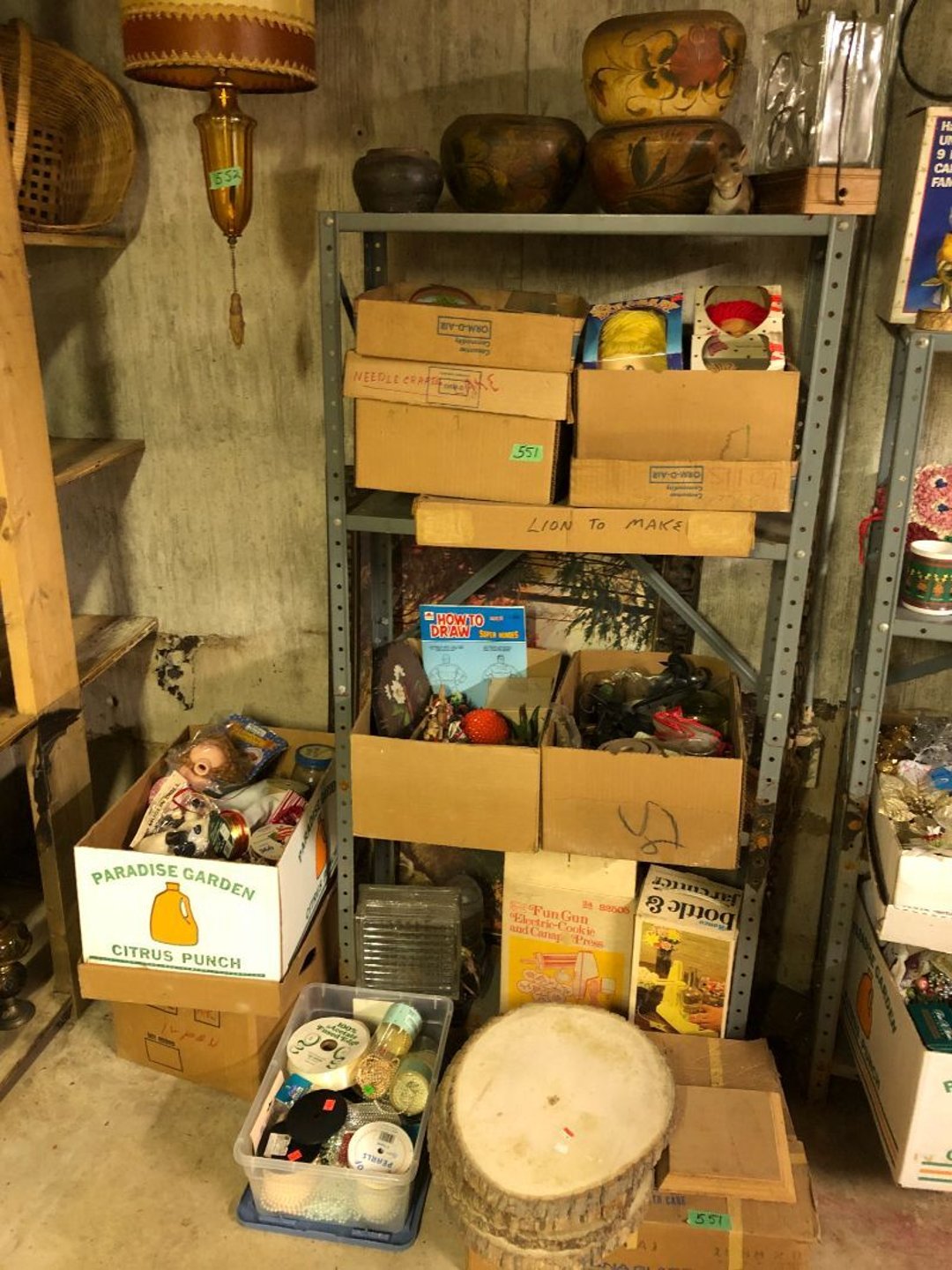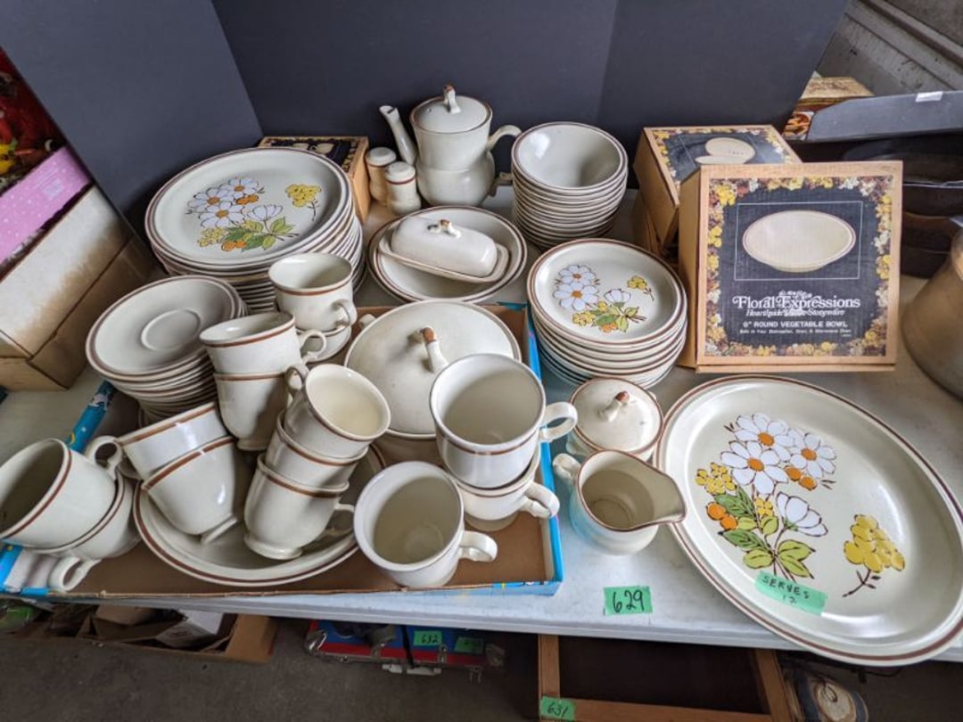 2 Griswold cast iron skillets, Salt and pepper shakers, blue Ball jars, refrigerator dishes, cookie jar, Pink rose dishes, Seyfert's pretzel jar, Jadite blossom design plate, Hull basket, Pink and cream small Hull vase, Roseville pitcher vase, Silver leaf glasses, Cast iron car, metal duck, metal horse bookend, ship bookend, Texaco pump, Glass fish, flower, vase, vintage bookends, bowl, planter, 3 piece moon and stars glassware, Fenton basket, fairy lights, misc glass, Pink, green, yellow depression dishes, Mayfair pink depression dishes, cracker jar, candy jar, 3 Mayfair pink depression bowls, Cast iron doorstop, 75 piece Homer Laughlin dogwood pattern dishes, Patton heater, small fan, Misc kitchenware, Strainer, 2 pressure cookers, Vintage Silvertone radio, 3 vintage ladies hats, 6 men's hats, Magnavox CD player and cassette recorder, cassettes, Juliette Eight Track Stereo player, 8 tracks, Sony fm/am stereo cassette recorder, cassettes, Crocks, sad iron, Vintage kitchenware, DVDs, 37 piece Homer Laughlin Georgian Eggshell dishes, Basket of glass vegetables, Vintage child's dishes, 2 pieces candle wick, 1 American sweetheart plate, 3 pieces bubbleglass, novelties and advertising, violin, 2 Furbys, Dubl Handi washboard, 2 feed bags, 2 cuckoo clocks both made in Germany, 29 pieces of misc Corelle, 95+ pieces of Lazy Daisy Corelle and flatware, 8 Pyrex mixing bowls, 2 Pyrex measuring pitchers, Copper boiler (rusty), vintage pot (chipped), American Tourister suitcase, Holiday decorations, Pots and pans with tote, Cleaning supplies, wire racks, Vintage handmade quilt, Signed handmade quilt, Comforter (damaged), 17 Life magazines from 1969 and 1971, 1969 Sears catalog, Handmade cross stitch flower quilt, State bird needlepoint quilt 96" x 68", Handmade signed quilt 108" x 84", Pyrex 3 piece casseroles, Commodore vintage computer, misc computer equipment, Bell & Howell movie projector, Quilt rack, automatic knitter, Small metal cabinet, Body power inversion table, Vitamaster 1000 XT exercise bike, Craft supplies and metal rack, Coppertone rack with sewing supplies and glassware, Coppertone rack with glassware, pop bottles, ceramic statutes, Record albums, Chalkboard, 3 mirrors, Fossil advertising sign, Metal plant stand, Craft supplies, material, doll heads, toolbox w/paints, metal rack, Weber small grill, 9' x 13' screen house, 3 wooden folding chairs, metal folding chair, 2 lawn chairs, 4 cushions, Belt buckles, knives, lighters, cuff links, hand warmers, Jewelry and jewelry boxes, Cat's eye ring, Logger, chicken wire, watering can, pavers, magnet, 2 boxes of canning jars, Whirlpool hot spa, Matmassager, Chi machine, exercise equipment, Painting supplies, small trash can, plastic baskets, Yard and garden tools, Adams Central letter jacket and t-shirt, Hammock, 2 folding lawn chairs, NIB heavy-duty shelving, Nib Proctor Silex coffee maker, rock garden, Nib Shiatsu foot massager, nib Snuggie, Staple gun, hammers, knives, screwdrivers, Champion socket set, Air pump, light bulbs, smoke alarms, hole saw set, glue gun, parts bin, 3 license plates, Kerosene heater, Patton electric heater, Magnifying lamp, bungee cords, batteries, oil can, Rubbermaid medium size cooler, Igloo polar roller 60 quart cooler, Metal shelving with glassware, stemware, vases, pots, plant stands, buckets, Metal shelving with garden supplies, small wooden ladder, bowling ball, Metal shelving with Memories of Yesterday and misc figurines, Large new extension cord, 3 aluminum treble lights, 2 Blue Mountain 2 piece rainsuits, small Comfort Zone heater, GE HEPA air purifier, Storage totes and containers misc sizes, 3 boxes of décor, Hand blown art glass, 7 pieces of Lefton china, glass basket and animals, Precious Moments collection, Precious Moments musical Ferris wheel, town buildings, books, Precious Moments train, nativity, 14 misc pieces, Brinn's musical dolls, Sleigh bells, 2 vintage bird pictures with feathers, Quilt top 74" x 90", Vintage marbles, Cast iron collection, Wicker planter, Garden statues, 2 photo screens, Vintage light-up Santa and snowman, Huge assortment of Christmas, 3 piece Roseville, Vases and decorator pieces, 18" green plate, glass decorator pieces, 46" x 36" drop leaf table with 2 chairs, Glassware, Americana Star stainless steel flatware service for 12 with chest, Oneida Wm A Rogers AI Plus flatware, 3 pieces silver plated items, Wm Rogers silver tea set, casserole, cutlery, cake knife, Silver plated assortment, 18" tall metal patio table, 5 garden statues, Large sitting angel cement statue, 4 plant stands, Vintage large green glass vase, large artificial rose, Heavy metal stand with glass shelves, wooden cabinet with contents, Misc wall items, Vintage metal serving cart, Microwave and cart, wall décor, Advertising yardsticks, grabber, dusters, gloves, Toshiba 19" television with remote, 6" pasta machine, metal kitchen utensils, warming tray, Office supplies, Kitchen table with 1 leaf and 6 chairs with wheels, Rival electric slicer, Primo water dispenser, Wm Rogers "Harvest" pitcher, Leonard silver plated pitcher, misc silver pieces, Heavy vintage glass pitcher, spongeware bowl, 3 crock bowls, coffee urn, 7 "The Young and the Restless" collector plates, record of "Nadia's Theme", Leonard silver plated pitcher, 2 silver plated cups, William Rogers candlesticks, Fire King baking dishes, 2 casseroles, Pyrex casserole, Misc Corningware and Fire King, 2 boxes of 25 Boopie stemware, Wooden bull, F B Rogers Silver Company tea set - Sugar and creamer, footed waste, Sharp Carousel microwave, Glitter lava-type lamp, dancing clown music box, 20+ pieces of mushroom design kitchen set, 2 boxes of flatware, 1 boxes of knives, sharpening steel, Vintage elephant cookie jar, 8 pieces Lefton china, 12 pieces Pink Rose Lefton china, McCoy cookie jar, 4 boxes of kitchen utensils, Joseph Rogers Jr & Sons drum with case and drum sticks, Bissel Powerforce bagless vacuum, Vintage Shirley Temple "First Vacation" doll, Vin