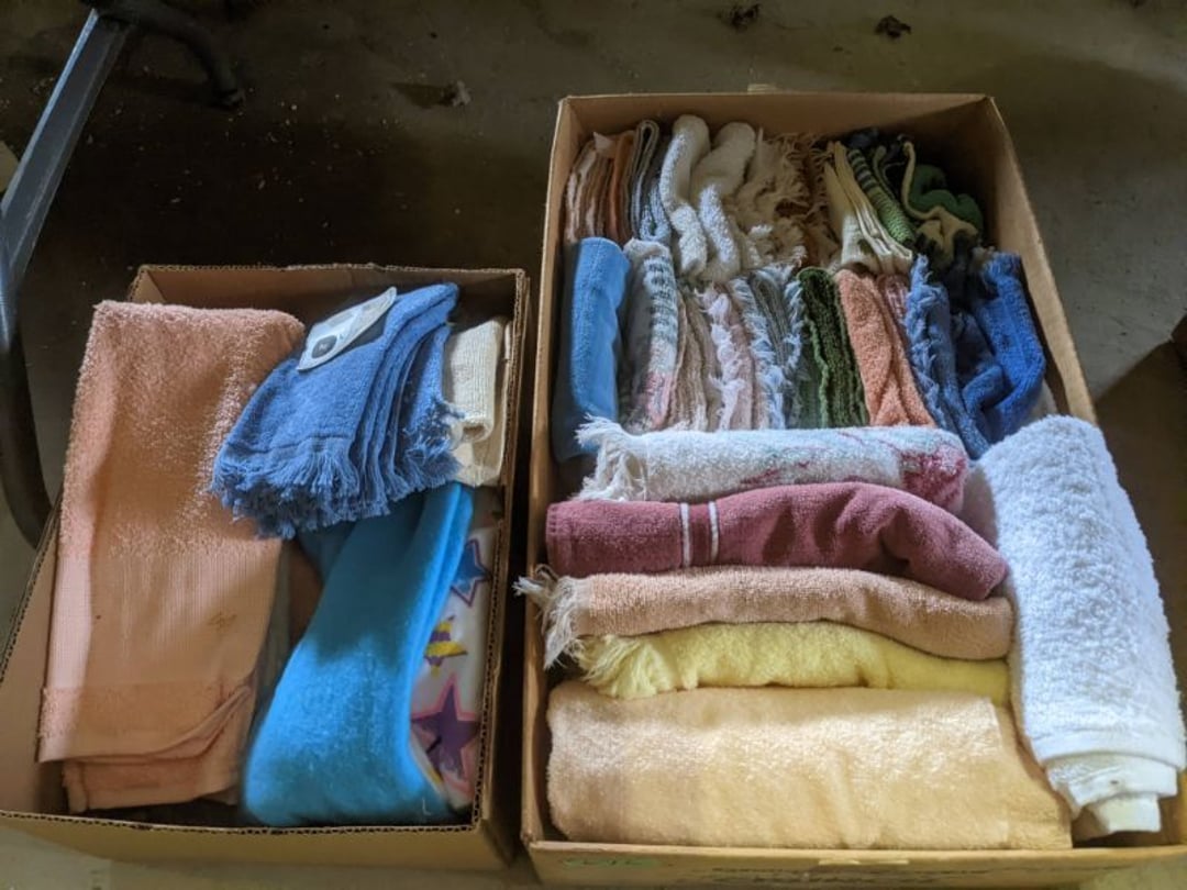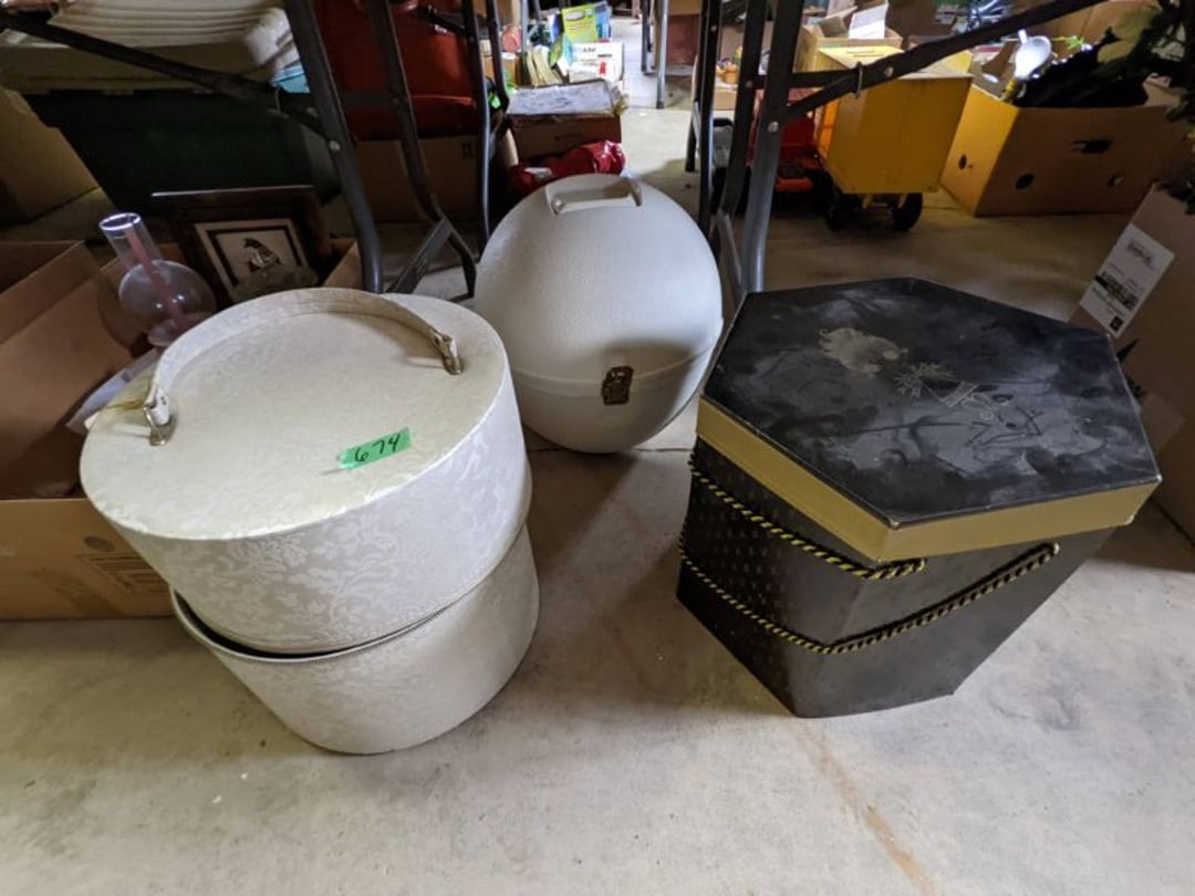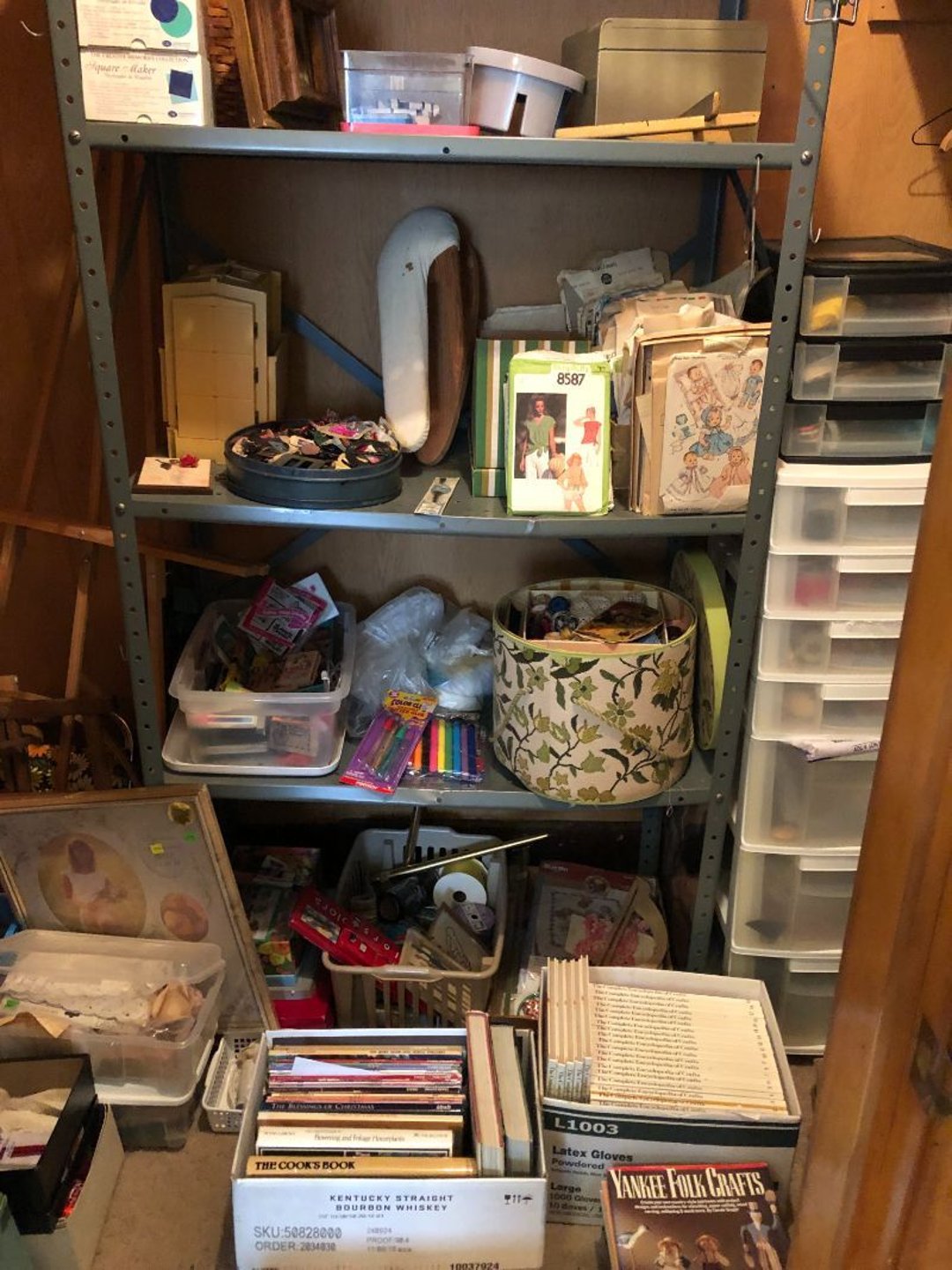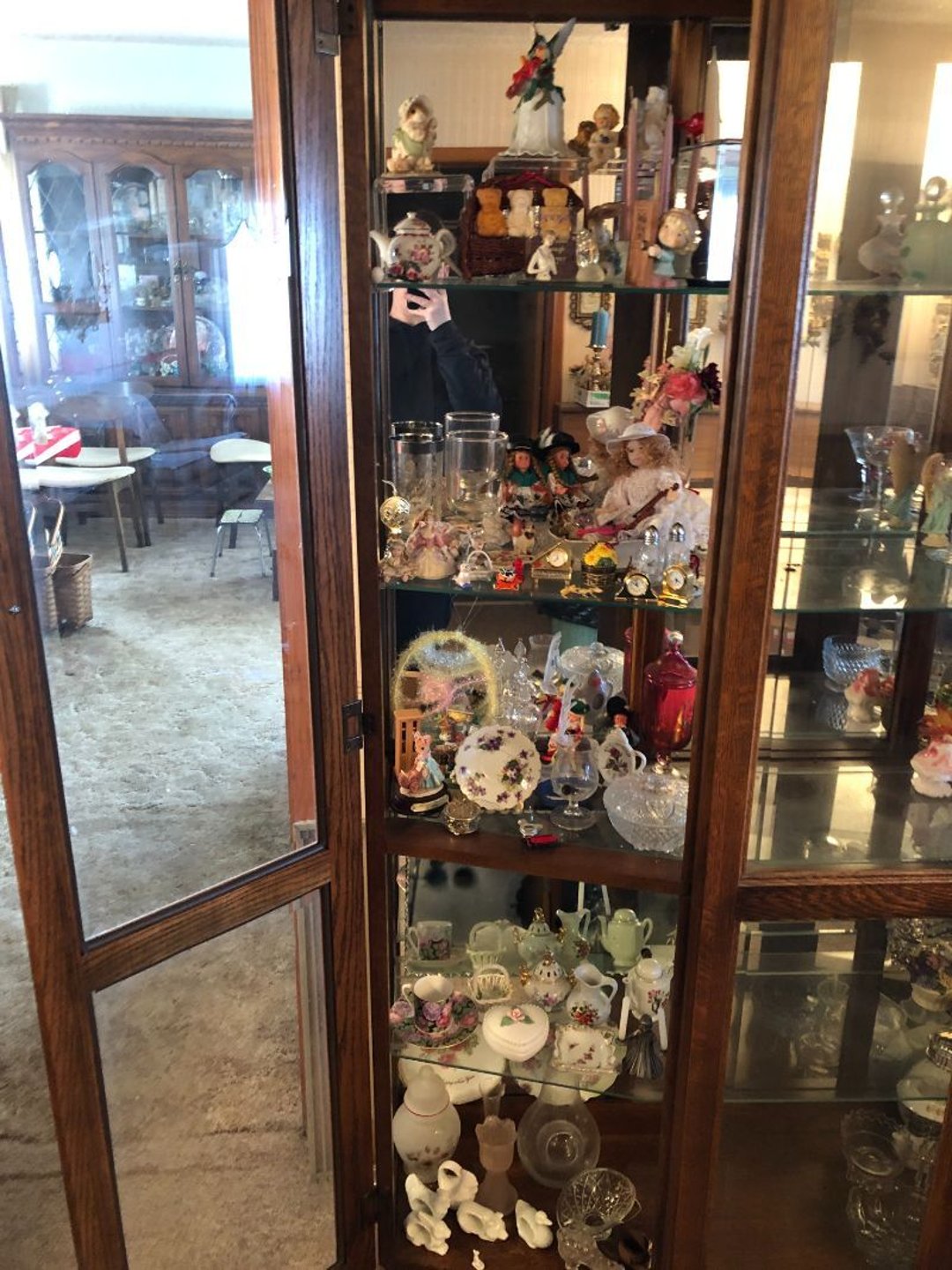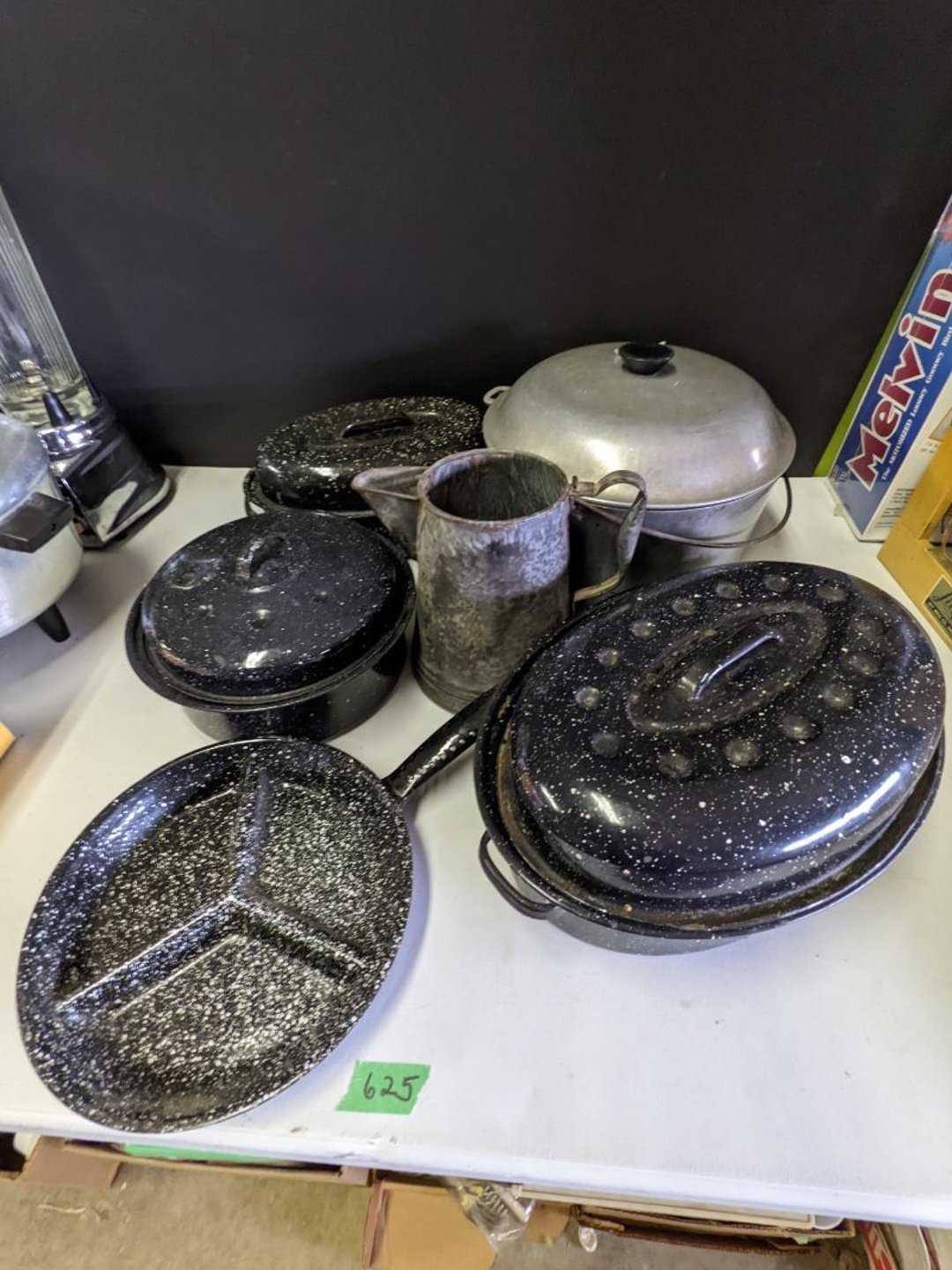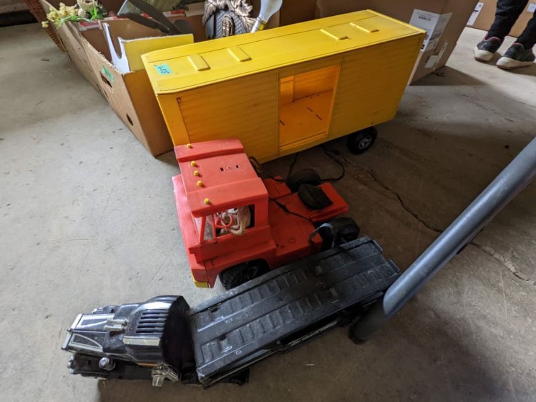 2 Griswold cast iron skillets, Salt and pepper shakers, blue Ball jars, refrigerator dishes, cookie jar, Pink rose dishes, Seyfert's pretzel jar, Jadite blossom design plate, Hull basket, Pink and cream small Hull vase, Roseville pitcher vase, Silver leaf glasses, Cast iron car, metal duck, metal horse bookend, ship bookend, Texaco pump, Glass fish, flower, vase, vintage bookends, bowl, planter, 3 piece moon and stars glassware, Fenton basket, fairy lights, misc glass, Pink, green, yellow depression dishes, Mayfair pink depression dishes, cracker jar, candy jar, 3 Mayfair pink depression bowls, Cast iron doorstop, 75 piece Homer Laughlin dogwood pattern dishes, Patton heater, small fan, Misc kitchenware, Strainer, 2 pressure cookers, Vintage Silvertone radio, 3 vintage ladies hats, 6 men's hats, Magnavox CD player and cassette recorder, cassettes, Juliette Eight Track Stereo player, 8 tracks, Sony fm/am stereo cassette recorder, cassettes, Crocks, sad iron, Vintage kitchenware, DVDs, 37 piece Homer Laughlin Georgian Eggshell dishes, Basket of glass vegetables, Vintage child's dishes, 2 pieces candle wick, 1 American sweetheart plate, 3 pieces bubbleglass, novelties and advertising, violin, 2 Furbys, Dubl Handi washboard, 2 feed bags, 2 cuckoo clocks both made in Germany, 29 pieces of misc Corelle, 95+ pieces of Lazy Daisy Corelle and flatware, 8 Pyrex mixing bowls, 2 Pyrex measuring pitchers, Copper boiler (rusty), vintage pot (chipped), American Tourister suitcase, Holiday decorations, Pots and pans with tote, Cleaning supplies, wire racks, Vintage handmade quilt, Signed handmade quilt, Comforter (damaged), 17 Life magazines from 1969 and 1971, 1969 Sears catalog, Handmade cross stitch flower quilt, State bird needlepoint quilt 96" x 68", Handmade signed quilt 108" x 84", Pyrex 3 piece casseroles, Commodore vintage computer, misc computer equipment, Bell & Howell movie projector, Quilt rack, automatic knitter, Small metal cabinet, Body power inversion table, Vitamaster 1000 XT exercise bike, Craft supplies and metal rack, Coppertone rack with sewing supplies and glassware, Coppertone rack with glassware, pop bottles, ceramic statutes, Record albums, Chalkboard, 3 mirrors, Fossil advertising sign, Metal plant stand, Craft supplies, material, doll heads, toolbox w/paints, metal rack, Weber small grill, 9' x 13' screen house, 3 wooden folding chairs, metal folding chair, 2 lawn chairs, 4 cushions, Belt buckles, knives, lighters, cuff links, hand warmers, Jewelry and jewelry boxes, Cat's eye ring, Logger, chicken wire, watering can, pavers, magnet, 2 boxes of canning jars, Whirlpool hot spa, Matmassager, Chi machine, exercise equipment, Painting supplies, small trash can, plastic baskets, Yard and garden tools, Adams Central letter jacket and t-shirt, Hammock, 2 folding lawn chairs, NIB heavy-duty shelving, Nib Proctor Silex coffee maker, rock garden, Nib Shiatsu foot massager, nib Snuggie, Staple gun, hammers, knives, screwdrivers, Champion socket set, Air pump, light bulbs, smoke alarms, hole saw set, glue gun, parts bin, 3 license plates, Kerosene heater, Patton electric heater, Magnifying lamp, bungee cords, batteries, oil can, Rubbermaid medium size cooler, Igloo polar roller 60 quart cooler, Metal shelving with glassware, stemware, vases, pots, plant stands, buckets, Metal shelving with garden supplies, small wooden ladder, bowling ball, Metal shelving with Memories of Yesterday and misc figurines, Large new extension cord, 3 aluminum treble lights, 2 Blue Mountain 2 piece rainsuits, small Comfort Zone heater, GE HEPA air purifier, Storage totes and containers misc sizes, 3 boxes of décor, Hand blown art glass, 7 pieces of Lefton china, glass basket and animals, Precious Moments collection, Precious Moments musical Ferris wheel, town buildings, books, Precious Moments train, nativity, 14 misc pieces, Brinn's musical dolls, Sleigh bells, 2 vintage bird pictures with feathers, Quilt top 74" x 90", Vintage marbles, Cast iron collection, Wicker planter, Garden statues, 2 photo screens, Vintage light-up Santa and snowman, Huge assortment of Christmas, 3 piece Roseville, Vases and decorator pieces, 18" green plate, glass decorator pieces, 46" x 36" drop leaf table with 2 chairs, Glassware, Americana Star stainless steel flatware service for 12 with chest, Oneida Wm A Rogers AI Plus flatware, 3 pieces silver plated items, Wm Rogers silver tea set, casserole, cutlery, cake knife, Silver plated assortment, 18" tall metal patio table, 5 garden statues, Large sitting angel cement statue, 4 plant stands, Vintage large green glass vase, large artificial rose, Heavy metal stand with glass shelves, wooden cabinet with contents, Misc wall items, Vintage metal serving cart, Microwave and cart, wall décor, Advertising yardsticks, grabber, dusters, gloves, Toshiba 19" television with remote, 6" pasta machine, metal kitchen utensils, warming tray, Office supplies, Kitchen table with 1 leaf and 6 chairs with wheels, Rival electric slicer, Primo water dispenser, Wm Rogers "Harvest" pitcher, Leonard silver plated pitcher, misc silver pieces, Heavy vintage glass pitcher, spongeware bowl, 3 crock bowls, coffee urn, 7 "The Young and the Restless" collector plates, record of "Nadia's Theme", Leonard silver plated pitcher, 2 silver plated cups, William Rogers candlesticks, Fire King baking dishes, 2 casseroles, Pyrex casserole, Misc Corningware and Fire King, 2 boxes of 25 Boopie stemware, Wooden bull, F B Rogers Silver Company tea set - Sugar and creamer, footed waste, Sharp Carousel microwave, Glitter lava-type lamp, dancing clown music box, 20+ pieces of mushroom design kitchen set, 2 boxes of flatware, 1 boxes of knives, sharpening steel, Vintage elephant cookie jar, 8 pieces Lefton china, 12 pieces Pink Rose Lefton china, McCoy cookie jar, 4 boxes of kitchen utensils, Joseph Rogers Jr & Sons drum with case and drum sticks, Bissel Powerforce bagless vacuum, Vintage Shirley Temple "First Vacation" doll, Vin