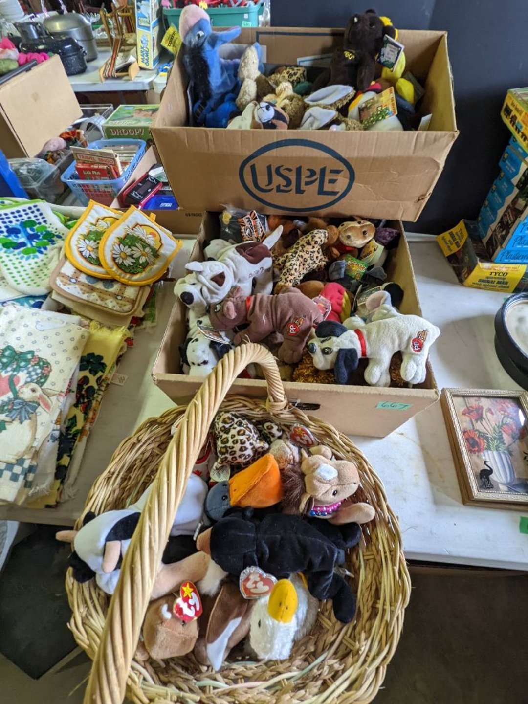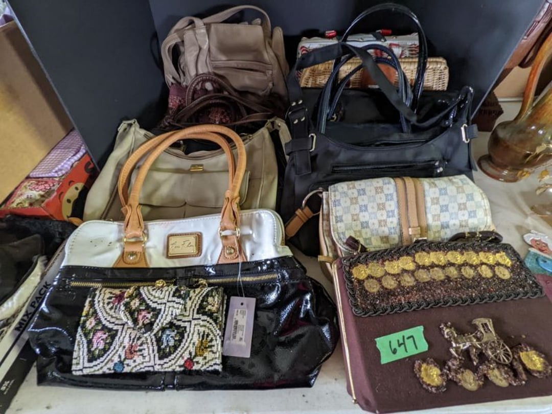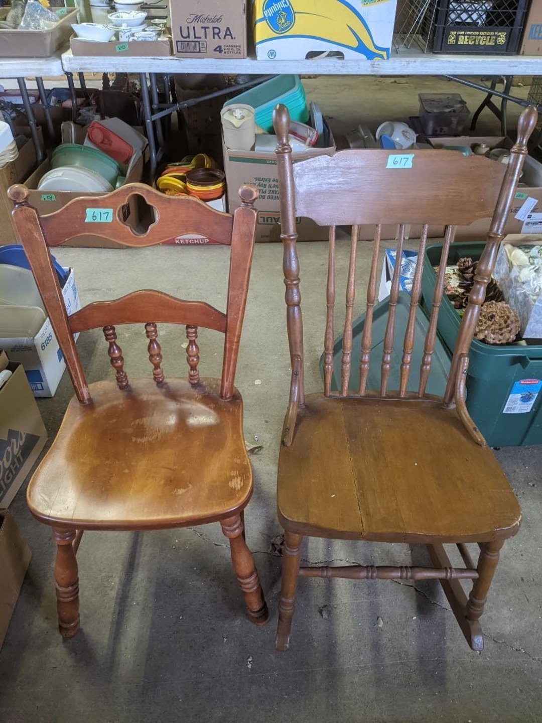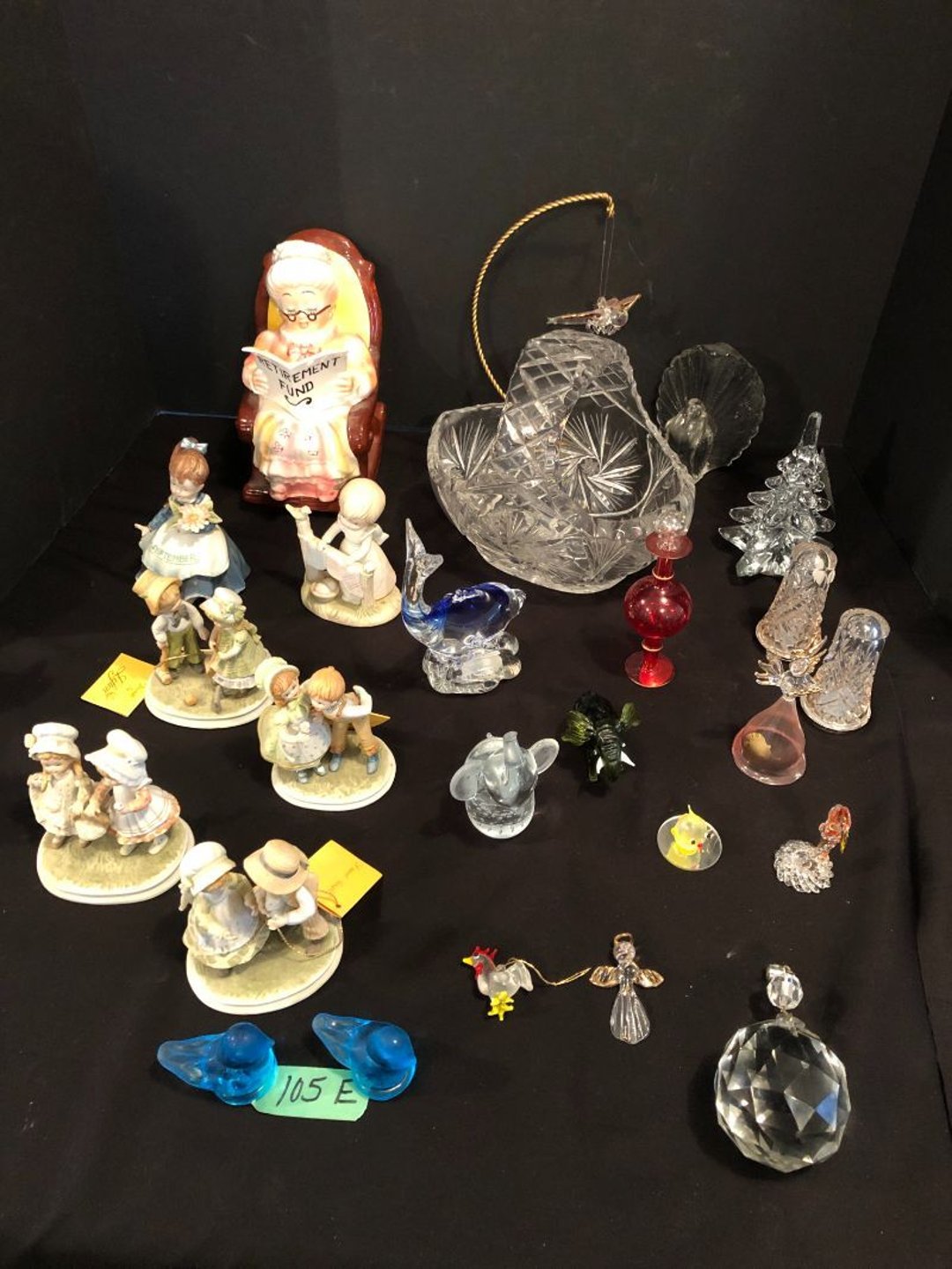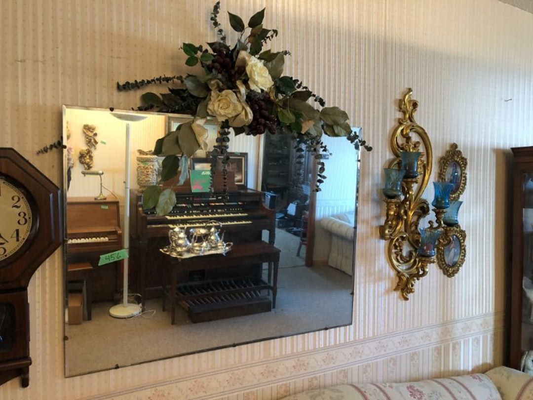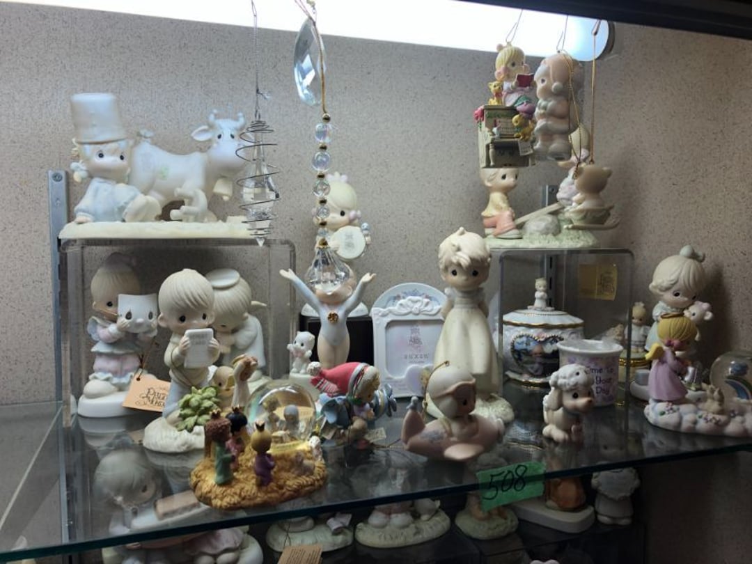 2 Griswold cast iron skillets, Salt and pepper shakers, blue Ball jars, refrigerator dishes, cookie jar, Pink rose dishes, Seyfert's pretzel jar, Jadite blossom design plate, Hull basket, Pink and cream small Hull vase, Roseville pitcher vase, Silver leaf glasses, Cast iron car, metal duck, metal horse bookend, ship bookend, Texaco pump, Glass fish, flower, vase, vintage bookends, bowl, planter, 3 piece moon and stars glassware, Fenton basket, fairy lights, misc glass, Pink, green, yellow depression dishes, Mayfair pink depression dishes, cracker jar, candy jar, 3 Mayfair pink depression bowls, Cast iron doorstop, 75 piece Homer Laughlin dogwood pattern dishes, Patton heater, small fan, Misc kitchenware, Strainer, 2 pressure cookers, Vintage Silvertone radio, 3 vintage ladies hats, 6 men's hats, Magnavox CD player and cassette recorder, cassettes, Juliette Eight Track Stereo player, 8 tracks, Sony fm/am stereo cassette recorder, cassettes, Crocks, sad iron, Vintage kitchenware, DVDs, 37 piece Homer Laughlin Georgian Eggshell dishes, Basket of glass vegetables, Vintage child's dishes, 2 pieces candle wick, 1 American sweetheart plate, 3 pieces bubbleglass, novelties and advertising, violin, 2 Furbys, Dubl Handi washboard, 2 feed bags, 2 cuckoo clocks both made in Germany, 29 pieces of misc Corelle, 95+ pieces of Lazy Daisy Corelle and flatware, 8 Pyrex mixing bowls, 2 Pyrex measuring pitchers, Copper boiler (rusty), vintage pot (chipped), American Tourister suitcase, Holiday decorations, Pots and pans with tote, Cleaning supplies, wire racks, Vintage handmade quilt, Signed handmade quilt, Comforter (damaged), 17 Life magazines from 1969 and 1971, 1969 Sears catalog, Handmade cross stitch flower quilt, State bird needlepoint quilt 96" x 68", Handmade signed quilt 108" x 84", Pyrex 3 piece casseroles, Commodore vintage computer, misc computer equipment, Bell & Howell movie projector, Quilt rack, automatic knitter, Small metal cabinet, Body power inversion table, Vitamaster 1000 XT exercise bike, Craft supplies and metal rack, Coppertone rack with sewing supplies and glassware, Coppertone rack with glassware, pop bottles, ceramic statutes, Record albums, Chalkboard, 3 mirrors, Fossil advertising sign, Metal plant stand, Craft supplies, material, doll heads, toolbox w/paints, metal rack, Weber small grill, 9' x 13' screen house, 3 wooden folding chairs, metal folding chair, 2 lawn chairs, 4 cushions, Belt buckles, knives, lighters, cuff links, hand warmers, Jewelry and jewelry boxes, Cat's eye ring, Logger, chicken wire, watering can, pavers, magnet, 2 boxes of canning jars, Whirlpool hot spa, Matmassager, Chi machine, exercise equipment, Painting supplies, small trash can, plastic baskets, Yard and garden tools, Adams Central letter jacket and t-shirt, Hammock, 2 folding lawn chairs, NIB heavy-duty shelving, Nib Proctor Silex coffee maker, rock garden, Nib Shiatsu foot massager, nib Snuggie, Staple gun, hammers, knives, screwdrivers, Champion socket set, Air pump, light bulbs, smoke alarms, hole saw set, glue gun, parts bin, 3 license plates, Kerosene heater, Patton electric heater, Magnifying lamp, bungee cords, batteries, oil can, Rubbermaid medium size cooler, Igloo polar roller 60 quart cooler, Metal shelving with glassware, stemware, vases, pots, plant stands, buckets, Metal shelving with garden supplies, small wooden ladder, bowling ball, Metal shelving with Memories of Yesterday and misc figurines, Large new extension cord, 3 aluminum treble lights, 2 Blue Mountain 2 piece rainsuits, small Comfort Zone heater, GE HEPA air purifier, Storage totes and containers misc sizes, 3 boxes of décor, Hand blown art glass, 7 pieces of Lefton china, glass basket and animals, Precious Moments collection, Precious Moments musical Ferris wheel, town buildings, books, Precious Moments train, nativity, 14 misc pieces, Brinn's musical dolls, Sleigh bells, 2 vintage bird pictures with feathers, Quilt top 74" x 90", Vintage marbles, Cast iron collection, Wicker planter, Garden statues, 2 photo screens, Vintage light-up Santa and snowman, Huge assortment of Christmas, 3 piece Roseville, Vases and decorator pieces, 18" green plate, glass decorator pieces, 46" x 36" drop leaf table with 2 chairs, Glassware, Americana Star stainless steel flatware service for 12 with chest, Oneida Wm A Rogers AI Plus flatware, 3 pieces silver plated items, Wm Rogers silver tea set, casserole, cutlery, cake knife, Silver plated assortment, 18" tall metal patio table, 5 garden statues, Large sitting angel cement statue, 4 plant stands, Vintage large green glass vase, large artificial rose, Heavy metal stand with glass shelves, wooden cabinet with contents, Misc wall items, Vintage metal serving cart, Microwave and cart, wall décor, Advertising yardsticks, grabber, dusters, gloves, Toshiba 19" television with remote, 6" pasta machine, metal kitchen utensils, warming tray, Office supplies, Kitchen table with 1 leaf and 6 chairs with wheels, Rival electric slicer, Primo water dispenser, Wm Rogers "Harvest" pitcher, Leonard silver plated pitcher, misc silver pieces, Heavy vintage glass pitcher, spongeware bowl, 3 crock bowls, coffee urn, 7 "The Young and the Restless" collector plates, record of "Nadia's Theme", Leonard silver plated pitcher, 2 silver plated cups, William Rogers candlesticks, Fire King baking dishes, 2 casseroles, Pyrex casserole, Misc Corningware and Fire King, 2 boxes of 25 Boopie stemware, Wooden bull, F B Rogers Silver Company tea set - Sugar and creamer, footed waste, Sharp Carousel microwave, Glitter lava-type lamp, dancing clown music box, 20+ pieces of mushroom design kitchen set, 2 boxes of flatware, 1 boxes of knives, sharpening steel, Vintage elephant cookie jar, 8 pieces Lefton china, 12 pieces Pink Rose Lefton china, McCoy cookie jar, 4 boxes of kitchen utensils, Joseph Rogers Jr & Sons drum with case and drum sticks, Bissel Powerforce bagless vacuum, Vintage Shirley Temple "First Vacation" doll, Vin