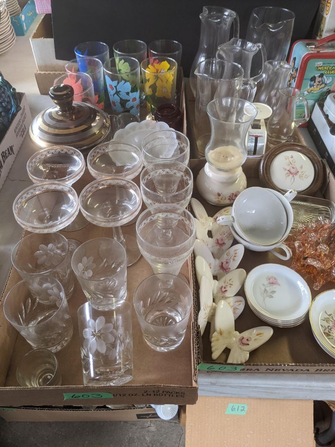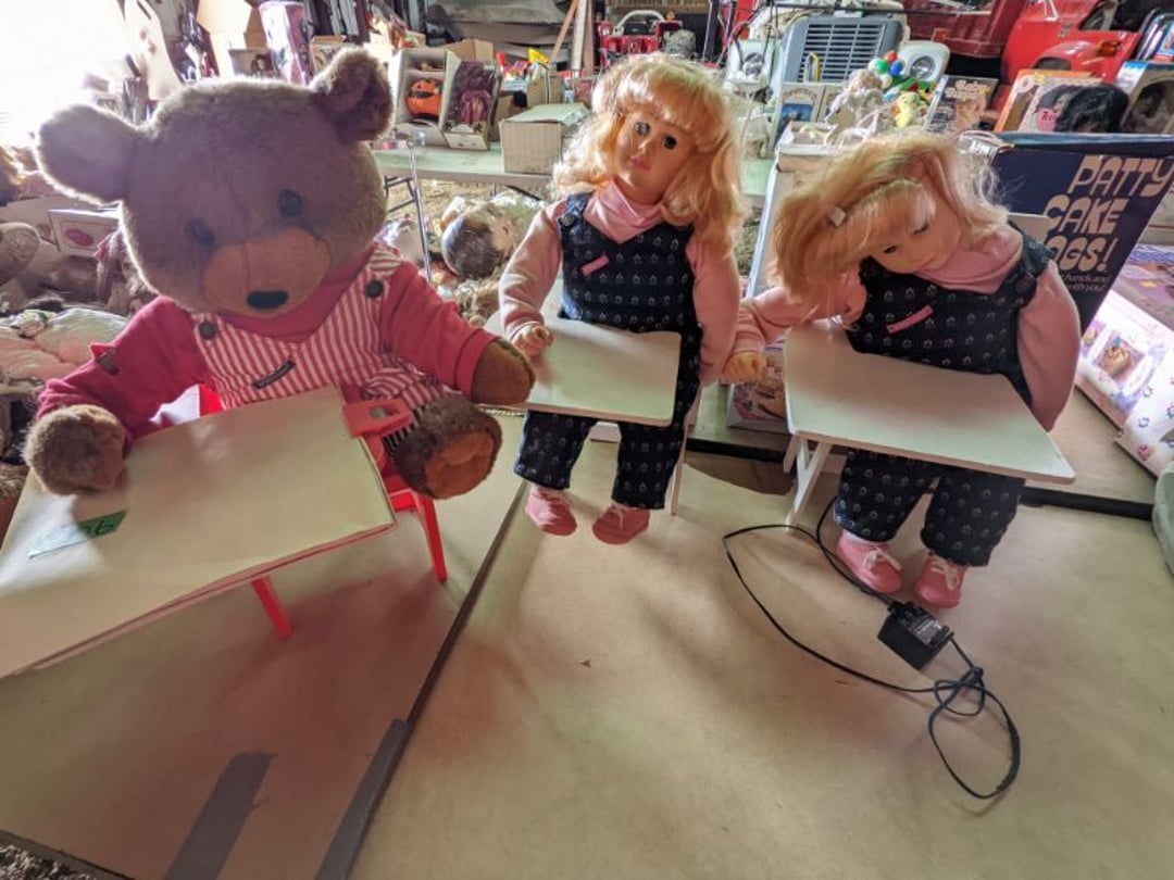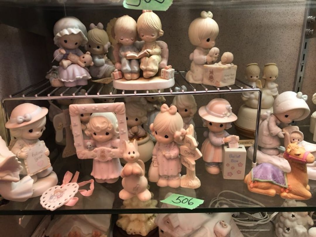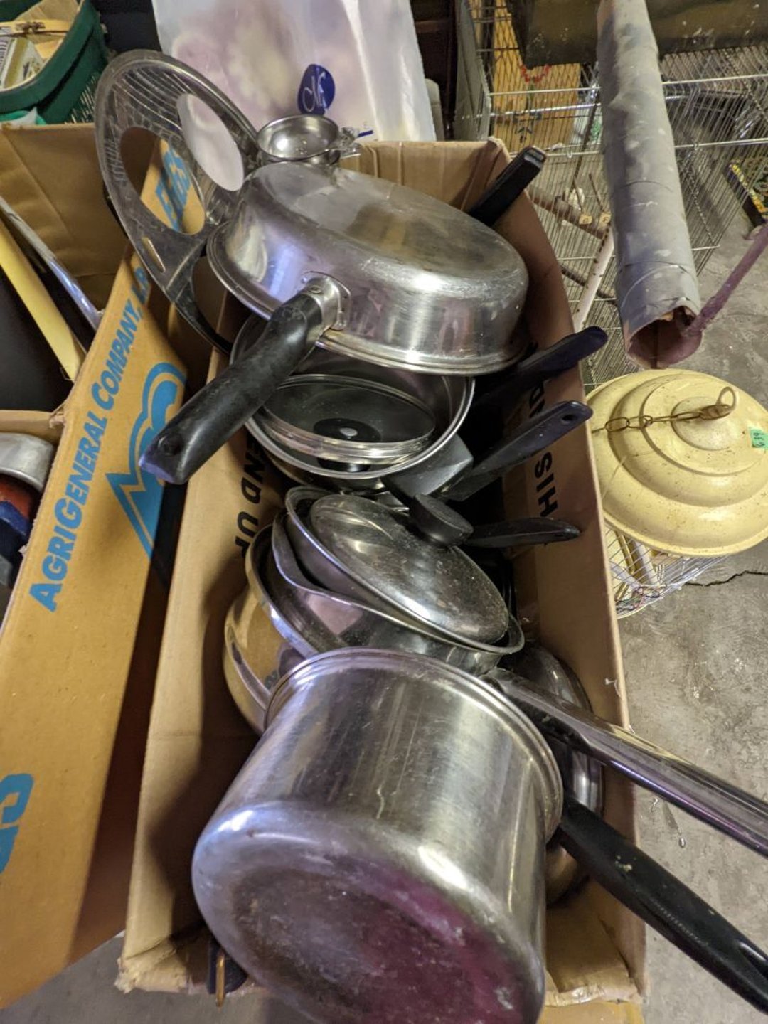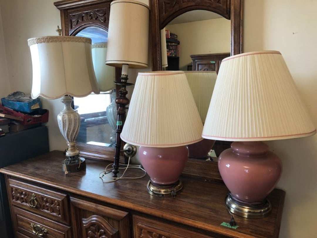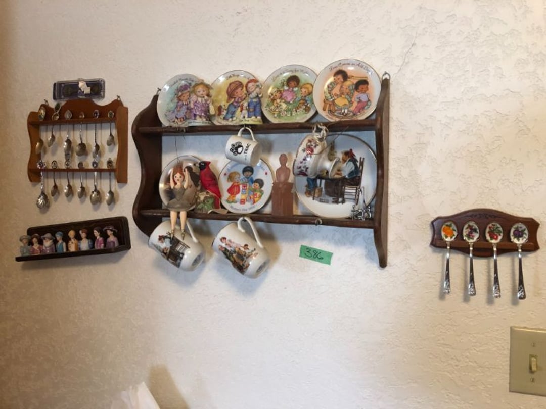 2 Griswold cast iron skillets, Salt and pepper shakers, blue Ball jars, refrigerator dishes, cookie jar, Pink rose dishes, Seyfert's pretzel jar, Jadite blossom design plate, Hull basket, Pink and cream small Hull vase, Roseville pitcher vase, Silver leaf glasses, Cast iron car, metal duck, metal horse bookend, ship bookend, Texaco pump, Glass fish, flower, vase, vintage bookends, bowl, planter, 3 piece moon and stars glassware, Fenton basket, fairy lights, misc glass, Pink, green, yellow depression dishes, Mayfair pink depression dishes, cracker jar, candy jar, 3 Mayfair pink depression bowls, Cast iron doorstop, 75 piece Homer Laughlin dogwood pattern dishes, Patton heater, small fan, Misc kitchenware, Strainer, 2 pressure cookers, Vintage Silvertone radio, 3 vintage ladies hats, 6 men's hats, Magnavox CD player and cassette recorder, cassettes, Juliette Eight Track Stereo player, 8 tracks, Sony fm/am stereo cassette recorder, cassettes, Crocks, sad iron, Vintage kitchenware, DVDs, 37 piece Homer Laughlin Georgian Eggshell dishes, Basket of glass vegetables, Vintage child's dishes, 2 pieces candle wick, 1 American sweetheart plate, 3 pieces bubbleglass, novelties and advertising, violin, 2 Furbys, Dubl Handi washboard, 2 feed bags, 2 cuckoo clocks both made in Germany, 29 pieces of misc Corelle, 95+ pieces of Lazy Daisy Corelle and flatware, 8 Pyrex mixing bowls, 2 Pyrex measuring pitchers, Copper boiler (rusty), vintage pot (chipped), American Tourister suitcase, Holiday decorations, Pots and pans with tote, Cleaning supplies, wire racks, Vintage handmade quilt, Signed handmade quilt, Comforter (damaged), 17 Life magazines from 1969 and 1971, 1969 Sears catalog, Handmade cross stitch flower quilt, State bird needlepoint quilt 96" x 68", Handmade signed quilt 108" x 84", Pyrex 3 piece casseroles, Commodore vintage computer, misc computer equipment, Bell & Howell movie projector, Quilt rack, automatic knitter, Small metal cabinet, Body power inversion table, Vitamaster 1000 XT exercise bike, Craft supplies and metal rack, Coppertone rack with sewing supplies and glassware, Coppertone rack with glassware, pop bottles, ceramic statutes, Record albums, Chalkboard, 3 mirrors, Fossil advertising sign, Metal plant stand, Craft supplies, material, doll heads, toolbox w/paints, metal rack, Weber small grill, 9' x 13' screen house, 3 wooden folding chairs, metal folding chair, 2 lawn chairs, 4 cushions, Belt buckles, knives, lighters, cuff links, hand warmers, Jewelry and jewelry boxes, Cat's eye ring, Logger, chicken wire, watering can, pavers, magnet, 2 boxes of canning jars, Whirlpool hot spa, Matmassager, Chi machine, exercise equipment, Painting supplies, small trash can, plastic baskets, Yard and garden tools, Adams Central letter jacket and t-shirt, Hammock, 2 folding lawn chairs, NIB heavy-duty shelving, Nib Proctor Silex coffee maker, rock garden, Nib Shiatsu foot massager, nib Snuggie, Staple gun, hammers, knives, screwdrivers, Champion socket set, Air pump, light bulbs, smoke alarms, hole saw set, glue gun, parts bin, 3 license plates, Kerosene heater, Patton electric heater, Magnifying lamp, bungee cords, batteries, oil can, Rubbermaid medium size cooler, Igloo polar roller 60 quart cooler, Metal shelving with glassware, stemware, vases, pots, plant stands, buckets, Metal shelving with garden supplies, small wooden ladder, bowling ball, Metal shelving with Memories of Yesterday and misc figurines, Large new extension cord, 3 aluminum treble lights, 2 Blue Mountain 2 piece rainsuits, small Comfort Zone heater, GE HEPA air purifier, Storage totes and containers misc sizes, 3 boxes of décor, Hand blown art glass, 7 pieces of Lefton china, glass basket and animals, Precious Moments collection, Precious Moments musical Ferris wheel, town buildings, books, Precious Moments train, nativity, 14 misc pieces, Brinn's musical dolls, Sleigh bells, 2 vintage bird pictures with feathers, Quilt top 74" x 90", Vintage marbles, Cast iron collection, Wicker planter, Garden statues, 2 photo screens, Vintage light-up Santa and snowman, Huge assortment of Christmas, 3 piece Roseville, Vases and decorator pieces, 18" green plate, glass decorator pieces, 46" x 36" drop leaf table with 2 chairs, Glassware, Americana Star stainless steel flatware service for 12 with chest, Oneida Wm A Rogers AI Plus flatware, 3 pieces silver plated items, Wm Rogers silver tea set, casserole, cutlery, cake knife, Silver plated assortment, 18" tall metal patio table, 5 garden statues, Large sitting angel cement statue, 4 plant stands, Vintage large green glass vase, large artificial rose, Heavy metal stand with glass shelves, wooden cabinet with contents, Misc wall items, Vintage metal serving cart, Microwave and cart, wall décor, Advertising yardsticks, grabber, dusters, gloves, Toshiba 19" television with remote, 6" pasta machine, metal kitchen utensils, warming tray, Office supplies, Kitchen table with 1 leaf and 6 chairs with wheels, Rival electric slicer, Primo water dispenser, Wm Rogers "Harvest" pitcher, Leonard silver plated pitcher, misc silver pieces, Heavy vintage glass pitcher, spongeware bowl, 3 crock bowls, coffee urn, 7 "The Young and the Restless" collector plates, record of "Nadia's Theme", Leonard silver plated pitcher, 2 silver plated cups, William Rogers candlesticks, Fire King baking dishes, 2 casseroles, Pyrex casserole, Misc Corningware and Fire King, 2 boxes of 25 Boopie stemware, Wooden bull, F B Rogers Silver Company tea set - Sugar and creamer, footed waste, Sharp Carousel microwave, Glitter lava-type lamp, dancing clown music box, 20+ pieces of mushroom design kitchen set, 2 boxes of flatware, 1 boxes of knives, sharpening steel, Vintage elephant cookie jar, 8 pieces Lefton china, 12 pieces Pink Rose Lefton china, McCoy cookie jar, 4 boxes of kitchen utensils, Joseph Rogers Jr & Sons drum with case and drum sticks, Bissel Powerforce bagless vacuum, Vintage Shirley Temple "First Vacation" doll, Vin