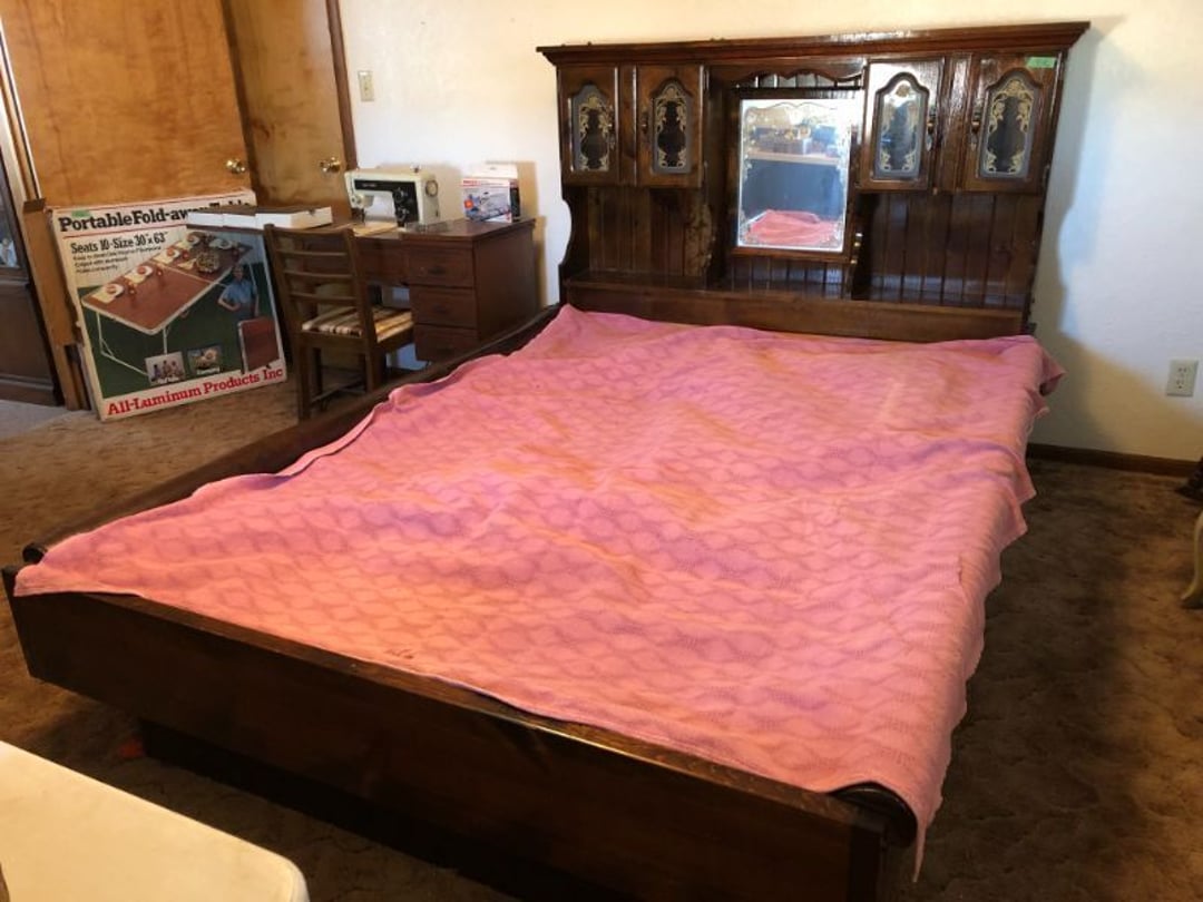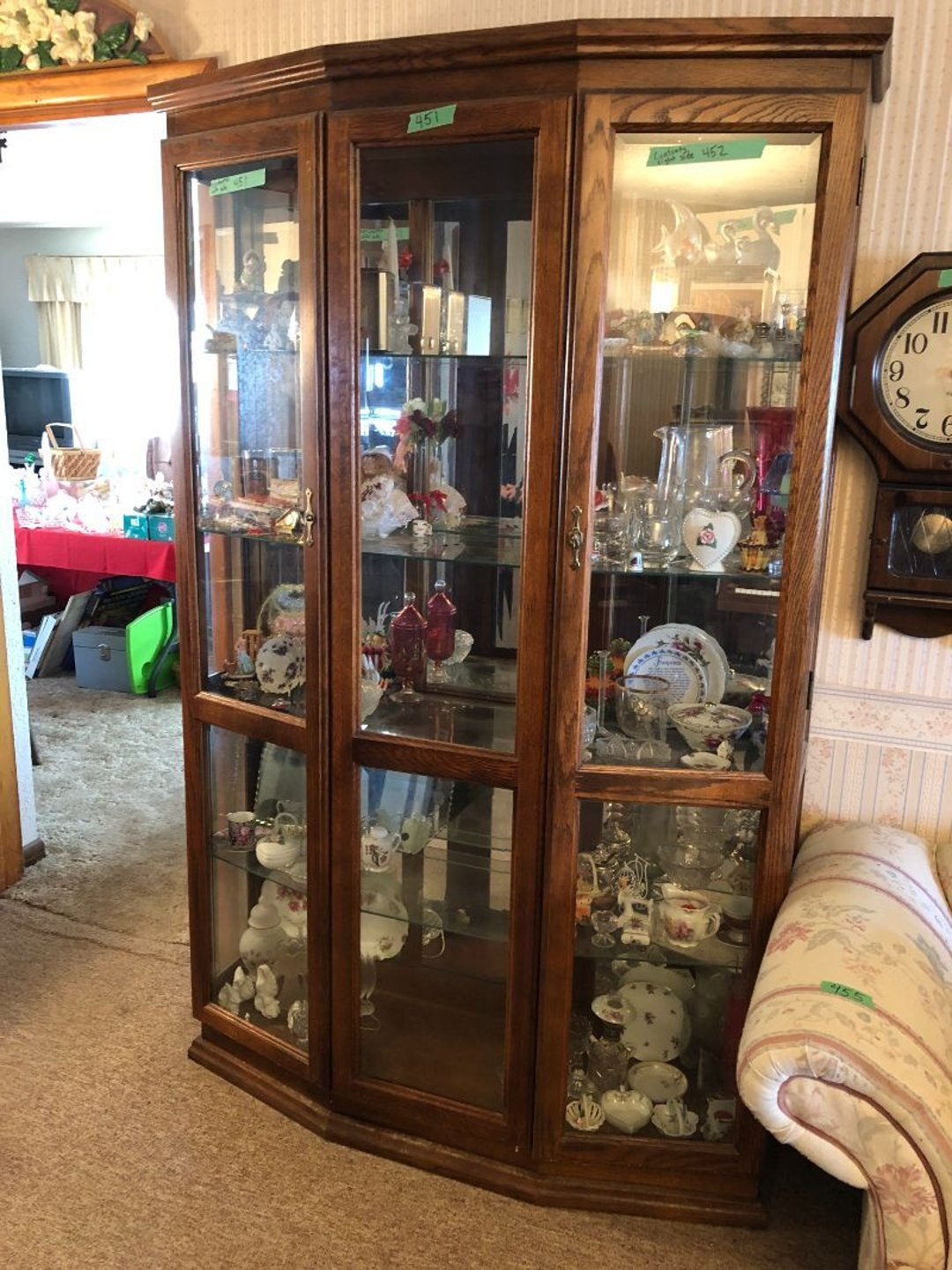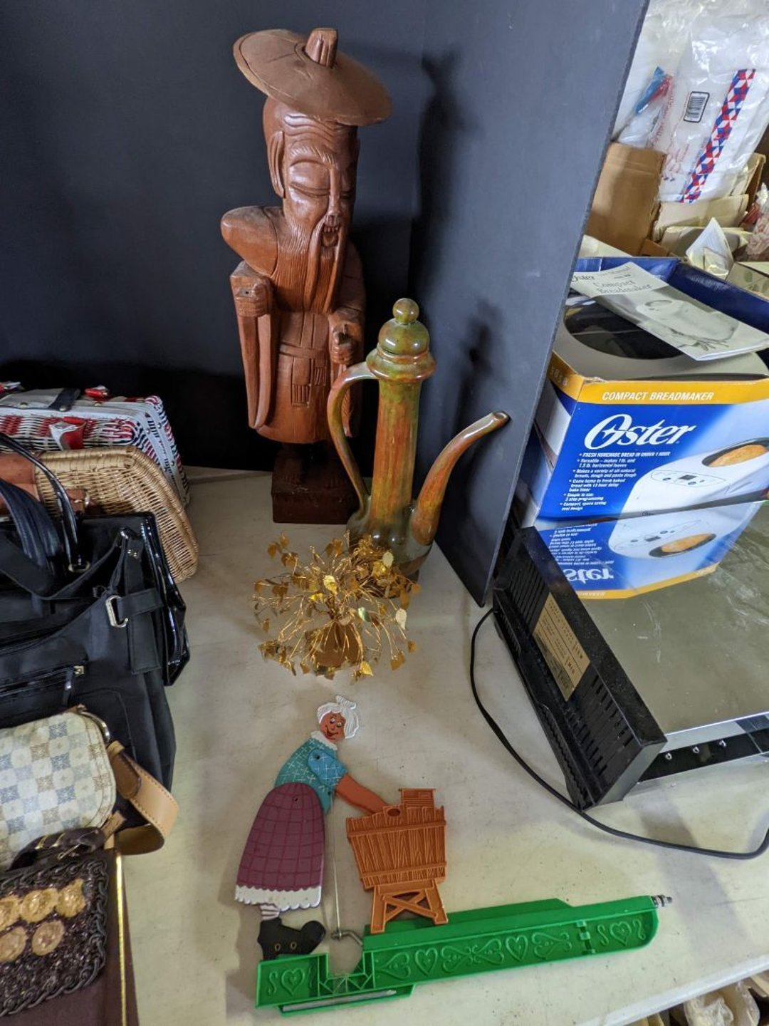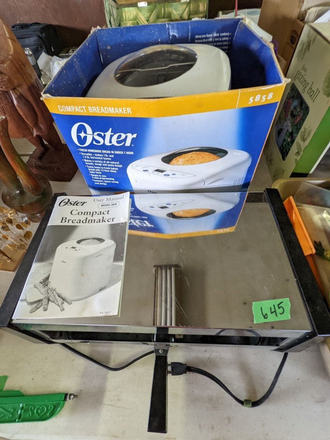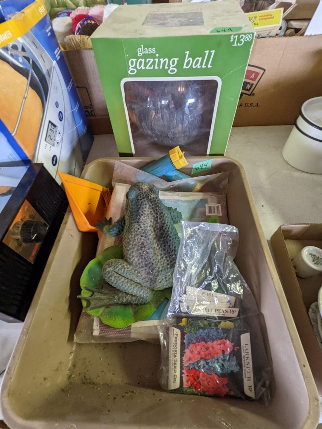 2 Griswold cast iron skillets, Salt and pepper shakers, blue Ball jars, refrigerator dishes, cookie jar, Pink rose dishes, Seyfert's pretzel jar, Jadite blossom design plate, Hull basket, Pink and cream small Hull vase, Roseville pitcher vase, Silver leaf glasses, Cast iron car, metal duck, metal horse bookend, ship bookend, Texaco pump, Glass fish, flower, vase, vintage bookends, bowl, planter, 3 piece moon and stars glassware, Fenton basket, fairy lights, misc glass, Pink, green, yellow depression dishes, Mayfair pink depression dishes, cracker jar, candy jar, 3 Mayfair pink depression bowls, Cast iron doorstop, 75 piece Homer Laughlin dogwood pattern dishes, Patton heater, small fan, Misc kitchenware, Strainer, 2 pressure cookers, Vintage Silvertone radio, 3 vintage ladies hats, 6 men's hats, Magnavox CD player and cassette recorder, cassettes, Juliette Eight Track Stereo player, 8 tracks, Sony fm/am stereo cassette recorder, cassettes, Crocks, sad iron, Vintage kitchenware, DVDs, 37 piece Homer Laughlin Georgian Eggshell dishes, Basket of glass vegetables, Vintage child's dishes, 2 pieces candle wick, 1 American sweetheart plate, 3 pieces bubbleglass, novelties and advertising, violin, 2 Furbys, Dubl Handi washboard, 2 feed bags, 2 cuckoo clocks both made in Germany, 29 pieces of misc Corelle, 95+ pieces of Lazy Daisy Corelle and flatware, 8 Pyrex mixing bowls, 2 Pyrex measuring pitchers, Copper boiler (rusty), vintage pot (chipped), American Tourister suitcase, Holiday decorations, Pots and pans with tote, Cleaning supplies, wire racks, Vintage handmade quilt, Signed handmade quilt, Comforter (damaged), 17 Life magazines from 1969 and 1971, 1969 Sears catalog, Handmade cross stitch flower quilt, State bird needlepoint quilt 96" x 68", Handmade signed quilt 108" x 84", Pyrex 3 piece casseroles, Commodore vintage computer, misc computer equipment, Bell & Howell movie projector, Quilt rack, automatic knitter, Small metal cabinet, Body power inversion table, Vitamaster 1000 XT exercise bike, Craft supplies and metal rack, Coppertone rack with sewing supplies and glassware, Coppertone rack with glassware, pop bottles, ceramic statutes, Record albums, Chalkboard, 3 mirrors, Fossil advertising sign, Metal plant stand, Craft supplies, material, doll heads, toolbox w/paints, metal rack, Weber small grill, 9' x 13' screen house, 3 wooden folding chairs, metal folding chair, 2 lawn chairs, 4 cushions, Belt buckles, knives, lighters, cuff links, hand warmers, Jewelry and jewelry boxes, Cat's eye ring, Logger, chicken wire, watering can, pavers, magnet, 2 boxes of canning jars, Whirlpool hot spa, Matmassager, Chi machine, exercise equipment, Painting supplies, small trash can, plastic baskets, Yard and garden tools, Adams Central letter jacket and t-shirt, Hammock, 2 folding lawn chairs, NIB heavy-duty shelving, Nib Proctor Silex coffee maker, rock garden, Nib Shiatsu foot massager, nib Snuggie, Staple gun, hammers, knives, screwdrivers, Champion socket set, Air pump, light bulbs, smoke alarms, hole saw set, glue gun, parts bin, 3 license plates, Kerosene heater, Patton electric heater, Magnifying lamp, bungee cords, batteries, oil can, Rubbermaid medium size cooler, Igloo polar roller 60 quart cooler, Metal shelving with glassware, stemware, vases, pots, plant stands, buckets, Metal shelving with garden supplies, small wooden ladder, bowling ball, Metal shelving with Memories of Yesterday and misc figurines, Large new extension cord, 3 aluminum treble lights, 2 Blue Mountain 2 piece rainsuits, small Comfort Zone heater, GE HEPA air purifier, Storage totes and containers misc sizes, 3 boxes of décor, Hand blown art glass, 7 pieces of Lefton china, glass basket and animals, Precious Moments collection, Precious Moments musical Ferris wheel, town buildings, books, Precious Moments train, nativity, 14 misc pieces, Brinn's musical dolls, Sleigh bells, 2 vintage bird pictures with feathers, Quilt top 74" x 90", Vintage marbles, Cast iron collection, Wicker planter, Garden statues, 2 photo screens, Vintage light-up Santa and snowman, Huge assortment of Christmas, 3 piece Roseville, Vases and decorator pieces, 18" green plate, glass decorator pieces, 46" x 36" drop leaf table with 2 chairs, Glassware, Americana Star stainless steel flatware service for 12 with chest, Oneida Wm A Rogers AI Plus flatware, 3 pieces silver plated items, Wm Rogers silver tea set, casserole, cutlery, cake knife, Silver plated assortment, 18" tall metal patio table, 5 garden statues, Large sitting angel cement statue, 4 plant stands, Vintage large green glass vase, large artificial rose, Heavy metal stand with glass shelves, wooden cabinet with contents, Misc wall items, Vintage metal serving cart, Microwave and cart, wall décor, Advertising yardsticks, grabber, dusters, gloves, Toshiba 19" television with remote, 6" pasta machine, metal kitchen utensils, warming tray, Office supplies, Kitchen table with 1 leaf and 6 chairs with wheels, Rival electric slicer, Primo water dispenser, Wm Rogers "Harvest" pitcher, Leonard silver plated pitcher, misc silver pieces, Heavy vintage glass pitcher, spongeware bowl, 3 crock bowls, coffee urn, 7 "The Young and the Restless" collector plates, record of "Nadia's Theme", Leonard silver plated pitcher, 2 silver plated cups, William Rogers candlesticks, Fire King baking dishes, 2 casseroles, Pyrex casserole, Misc Corningware and Fire King, 2 boxes of 25 Boopie stemware, Wooden bull, F B Rogers Silver Company tea set - Sugar and creamer, footed waste, Sharp Carousel microwave, Glitter lava-type lamp, dancing clown music box, 20+ pieces of mushroom design kitchen set, 2 boxes of flatware, 1 boxes of knives, sharpening steel, Vintage elephant cookie jar, 8 pieces Lefton china, 12 pieces Pink Rose Lefton china, McCoy cookie jar, 4 boxes of kitchen utensils, Joseph Rogers Jr & Sons drum with case and drum sticks, Bissel Powerforce bagless vacuum, Vintage Shirley Temple "First Vacation" doll, Vin