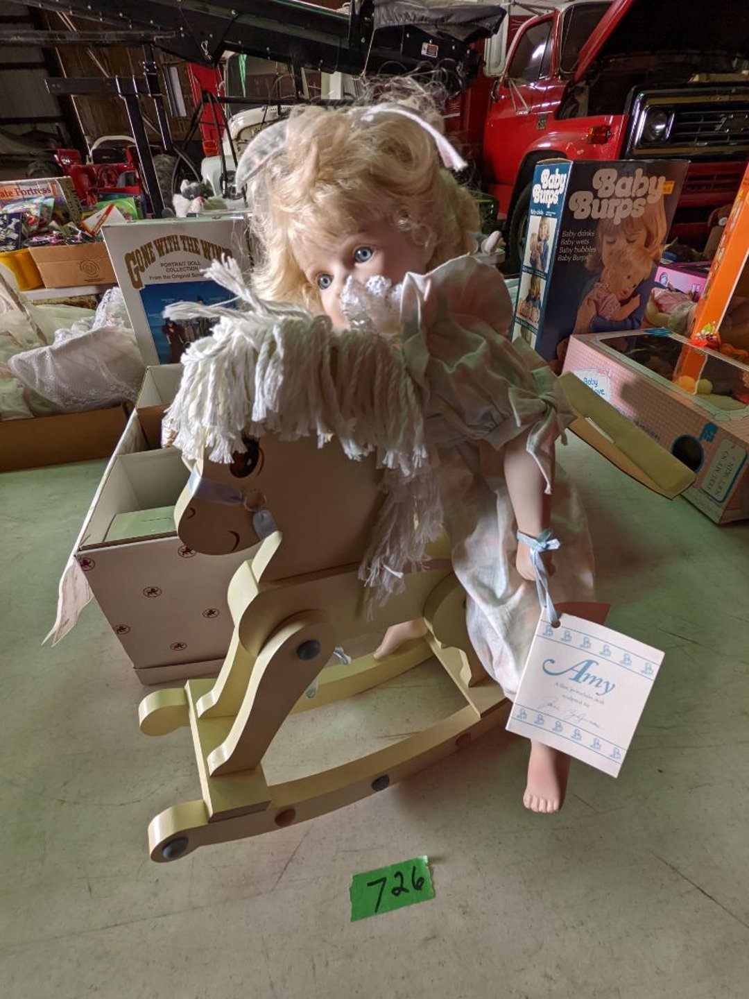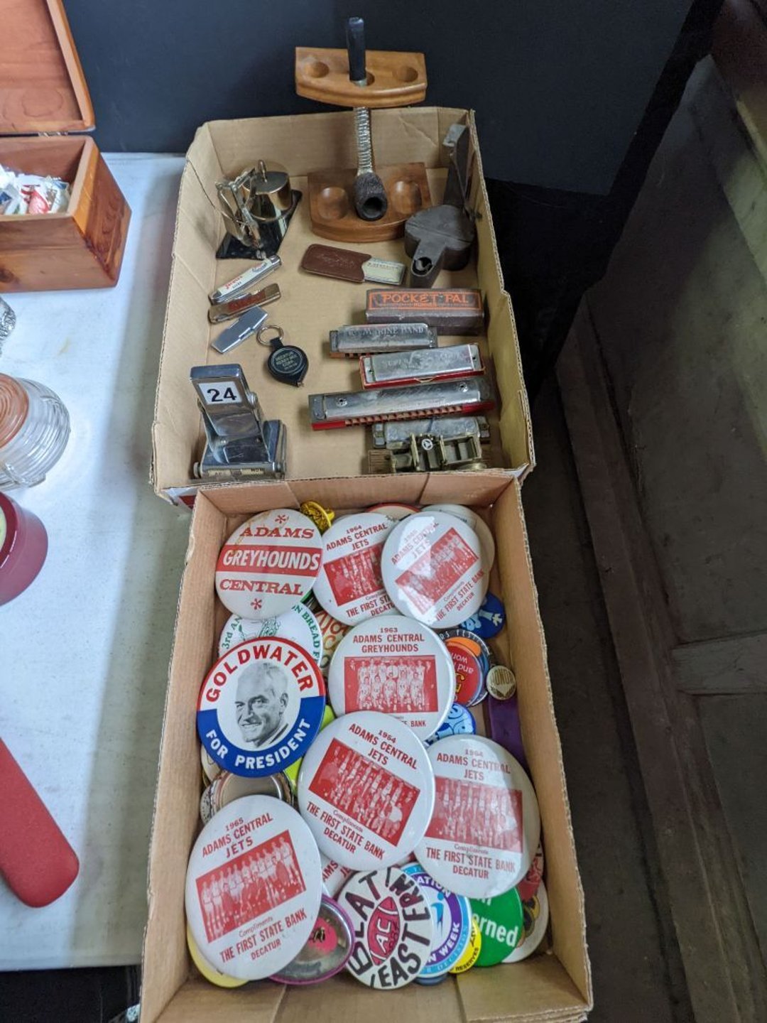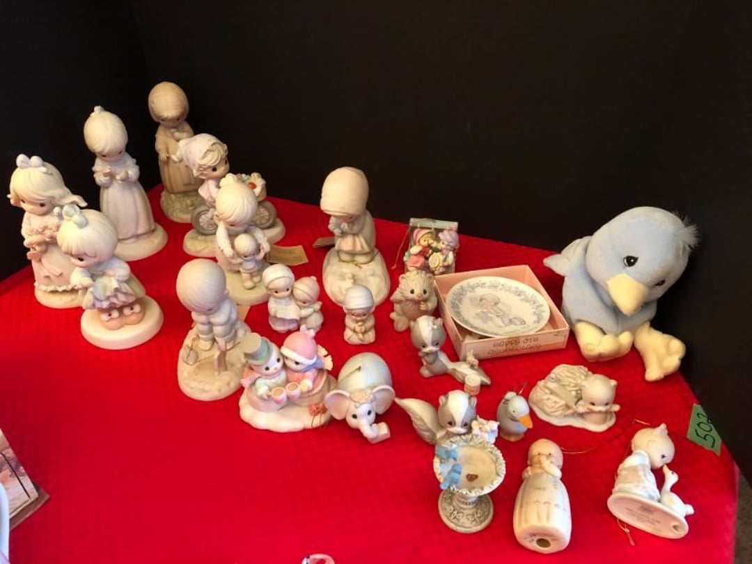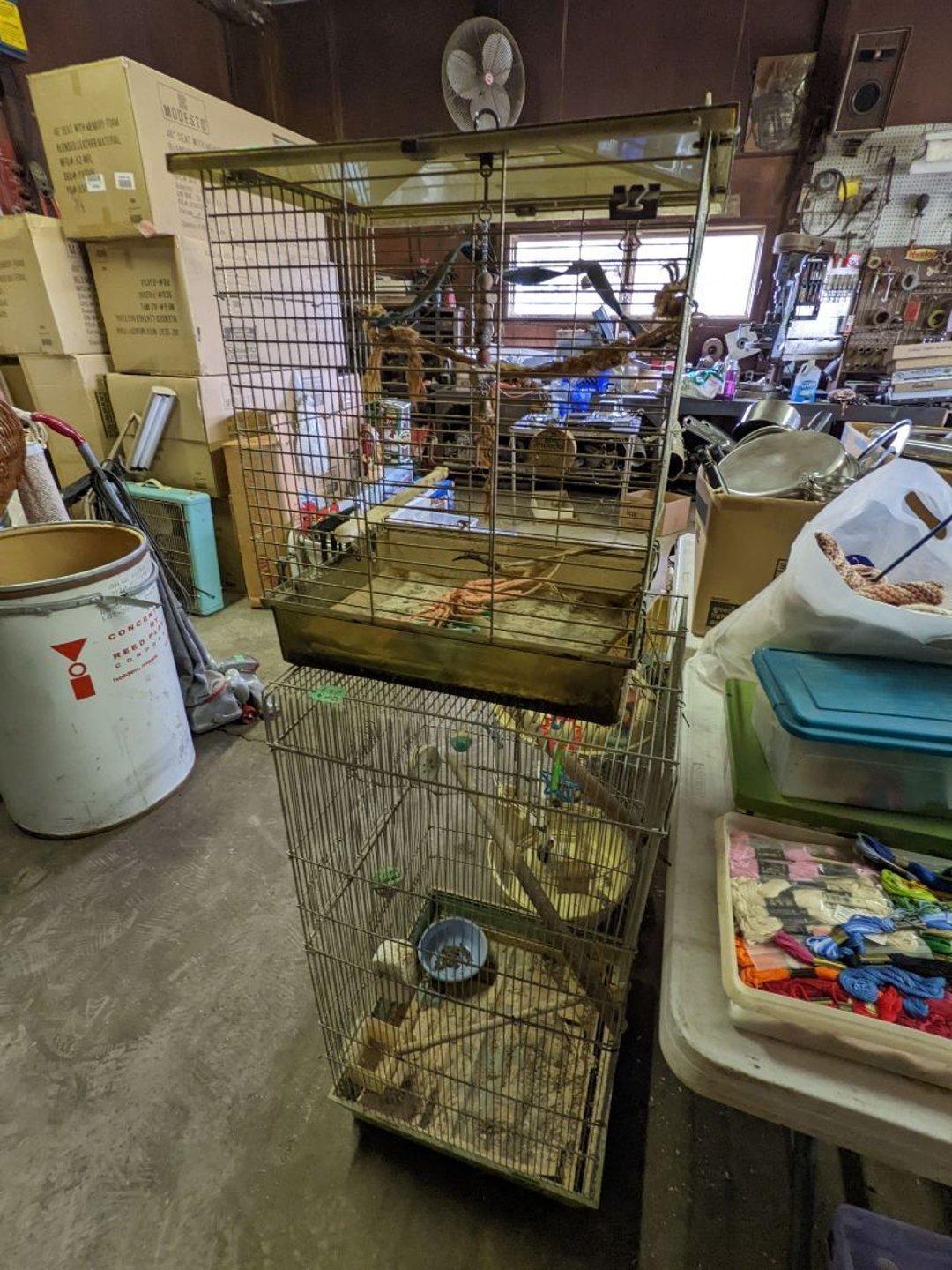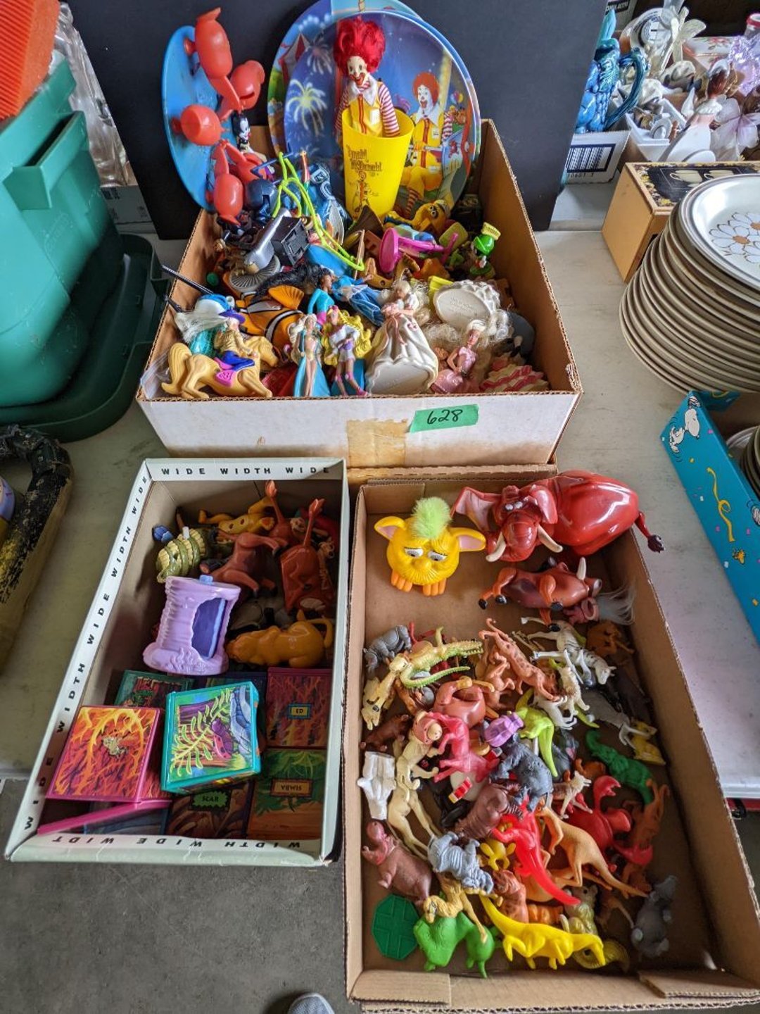 2 Griswold cast iron skillets, Salt and pepper shakers, blue Ball jars, refrigerator dishes, cookie jar, Pink rose dishes, Seyfert's pretzel jar, Jadite blossom design plate, Hull basket, Pink and cream small Hull vase, Roseville pitcher vase, Silver leaf glasses, Cast iron car, metal duck, metal horse bookend, ship bookend, Texaco pump, Glass fish, flower, vase, vintage bookends, bowl, planter, 3 piece moon and stars glassware, Fenton basket, fairy lights, misc glass, Pink, green, yellow depression dishes, Mayfair pink depression dishes, cracker jar, candy jar, 3 Mayfair pink depression bowls, Cast iron doorstop, 75 piece Homer Laughlin dogwood pattern dishes, Patton heater, small fan, Misc kitchenware, Strainer, 2 pressure cookers, Vintage Silvertone radio, 3 vintage ladies hats, 6 men's hats, Magnavox CD player and cassette recorder, cassettes, Juliette Eight Track Stereo player, 8 tracks, Sony fm/am stereo cassette recorder, cassettes, Crocks, sad iron, Vintage kitchenware, DVDs, 37 piece Homer Laughlin Georgian Eggshell dishes, Basket of glass vegetables, Vintage child's dishes, 2 pieces candle wick, 1 American sweetheart plate, 3 pieces bubbleglass, novelties and advertising, violin, 2 Furbys, Dubl Handi washboard, 2 feed bags, 2 cuckoo clocks both made in Germany, 29 pieces of misc Corelle, 95+ pieces of Lazy Daisy Corelle and flatware, 8 Pyrex mixing bowls, 2 Pyrex measuring pitchers, Copper boiler (rusty), vintage pot (chipped), American Tourister suitcase, Holiday decorations, Pots and pans with tote, Cleaning supplies, wire racks, Vintage handmade quilt, Signed handmade quilt, Comforter (damaged), 17 Life magazines from 1969 and 1971, 1969 Sears catalog, Handmade cross stitch flower quilt, State bird needlepoint quilt 96" x 68", Handmade signed quilt 108" x 84", Pyrex 3 piece casseroles, Commodore vintage computer, misc computer equipment, Bell & Howell movie projector, Quilt rack, automatic knitter, Small metal cabinet, Body power inversion table, Vitamaster 1000 XT exercise bike, Craft supplies and metal rack, Coppertone rack with sewing supplies and glassware, Coppertone rack with glassware, pop bottles, ceramic statutes, Record albums, Chalkboard, 3 mirrors, Fossil advertising sign, Metal plant stand, Craft supplies, material, doll heads, toolbox w/paints, metal rack, Weber small grill, 9' x 13' screen house, 3 wooden folding chairs, metal folding chair, 2 lawn chairs, 4 cushions, Belt buckles, knives, lighters, cuff links, hand warmers, Jewelry and jewelry boxes, Cat's eye ring, Logger, chicken wire, watering can, pavers, magnet, 2 boxes of canning jars, Whirlpool hot spa, Matmassager, Chi machine, exercise equipment, Painting supplies, small trash can, plastic baskets, Yard and garden tools, Adams Central letter jacket and t-shirt, Hammock, 2 folding lawn chairs, NIB heavy-duty shelving, Nib Proctor Silex coffee maker, rock garden, Nib Shiatsu foot massager, nib Snuggie, Staple gun, hammers, knives, screwdrivers, Champion socket set, Air pump, light bulbs, smoke alarms, hole saw set, glue gun, parts bin, 3 license plates, Kerosene heater, Patton electric heater, Magnifying lamp, bungee cords, batteries, oil can, Rubbermaid medium size cooler, Igloo polar roller 60 quart cooler, Metal shelving with glassware, stemware, vases, pots, plant stands, buckets, Metal shelving with garden supplies, small wooden ladder, bowling ball, Metal shelving with Memories of Yesterday and misc figurines, Large new extension cord, 3 aluminum treble lights, 2 Blue Mountain 2 piece rainsuits, small Comfort Zone heater, GE HEPA air purifier, Storage totes and containers misc sizes, 3 boxes of décor, Hand blown art glass, 7 pieces of Lefton china, glass basket and animals, Precious Moments collection, Precious Moments musical Ferris wheel, town buildings, books, Precious Moments train, nativity, 14 misc pieces, Brinn's musical dolls, Sleigh bells, 2 vintage bird pictures with feathers, Quilt top 74" x 90", Vintage marbles, Cast iron collection, Wicker planter, Garden statues, 2 photo screens, Vintage light-up Santa and snowman, Huge assortment of Christmas, 3 piece Roseville, Vases and decorator pieces, 18" green plate, glass decorator pieces, 46" x 36" drop leaf table with 2 chairs, Glassware, Americana Star stainless steel flatware service for 12 with chest, Oneida Wm A Rogers AI Plus flatware, 3 pieces silver plated items, Wm Rogers silver tea set, casserole, cutlery, cake knife, Silver plated assortment, 18" tall metal patio table, 5 garden statues, Large sitting angel cement statue, 4 plant stands, Vintage large green glass vase, large artificial rose, Heavy metal stand with glass shelves, wooden cabinet with contents, Misc wall items, Vintage metal serving cart, Microwave and cart, wall décor, Advertising yardsticks, grabber, dusters, gloves, Toshiba 19" television with remote, 6" pasta machine, metal kitchen utensils, warming tray, Office supplies, Kitchen table with 1 leaf and 6 chairs with wheels, Rival electric slicer, Primo water dispenser, Wm Rogers "Harvest" pitcher, Leonard silver plated pitcher, misc silver pieces, Heavy vintage glass pitcher, spongeware bowl, 3 crock bowls, coffee urn, 7 "The Young and the Restless" collector plates, record of "Nadia's Theme", Leonard silver plated pitcher, 2 silver plated cups, William Rogers candlesticks, Fire King baking dishes, 2 casseroles, Pyrex casserole, Misc Corningware and Fire King, 2 boxes of 25 Boopie stemware, Wooden bull, F B Rogers Silver Company tea set - Sugar and creamer, footed waste, Sharp Carousel microwave, Glitter lava-type lamp, dancing clown music box, 20+ pieces of mushroom design kitchen set, 2 boxes of flatware, 1 boxes of knives, sharpening steel, Vintage elephant cookie jar, 8 pieces Lefton china, 12 pieces Pink Rose Lefton china, McCoy cookie jar, 4 boxes of kitchen utensils, Joseph Rogers Jr & Sons drum with case and drum sticks, Bissel Powerforce bagless vacuum, Vintage Shirley Temple "First Vacation" doll, Vin