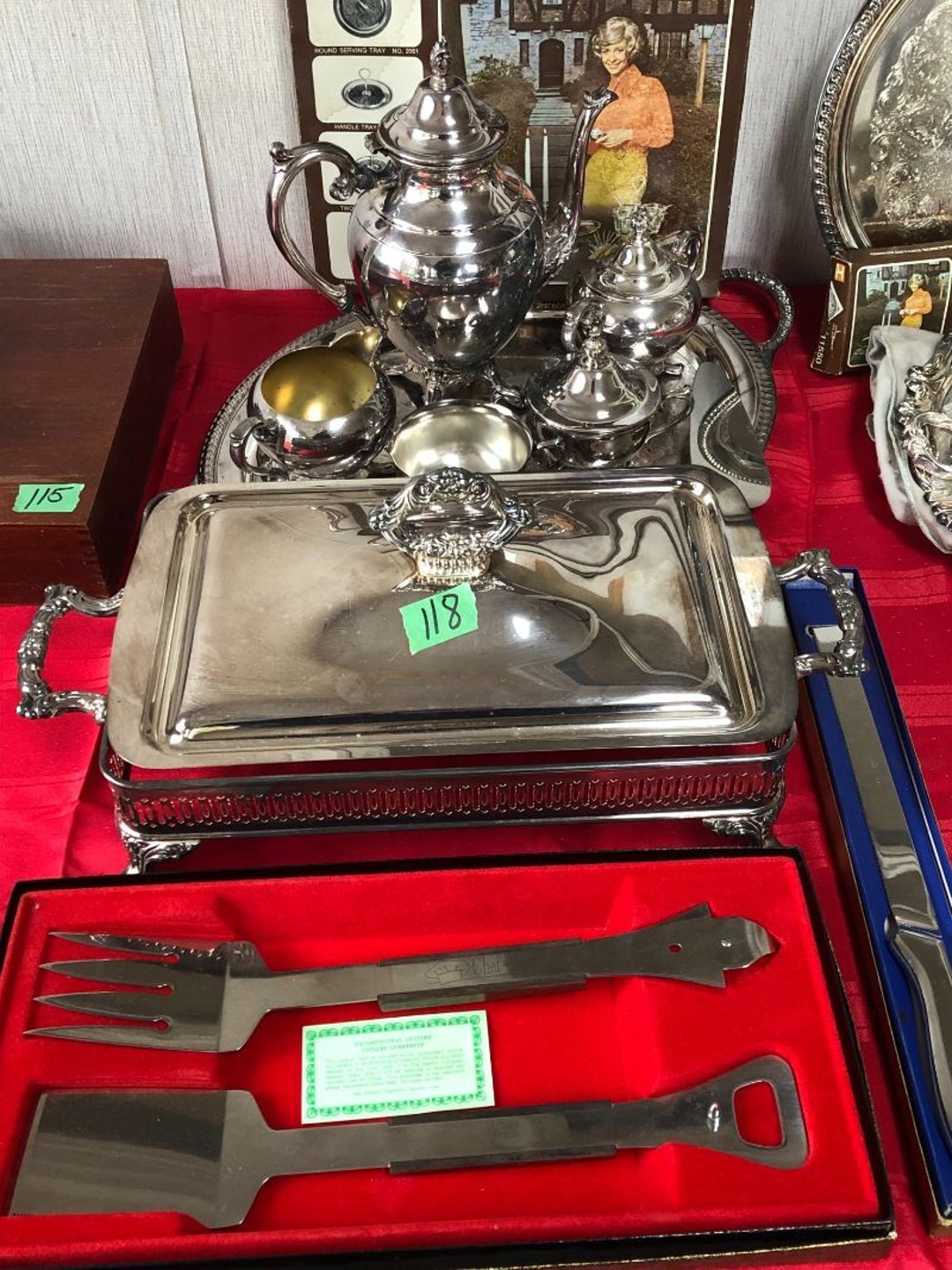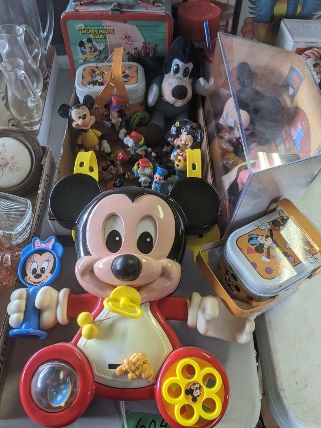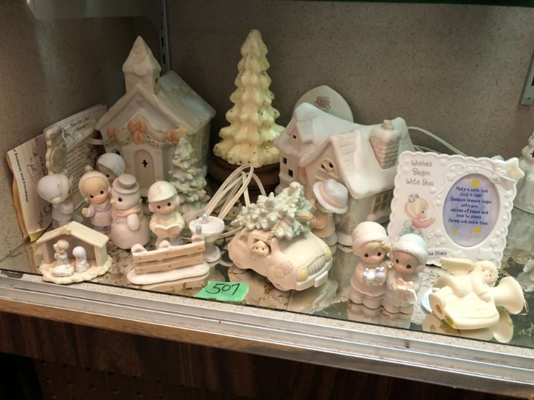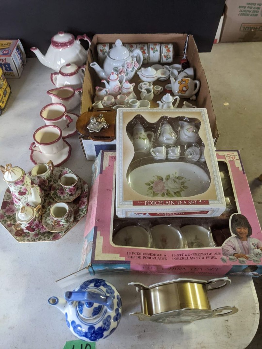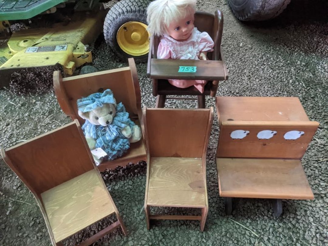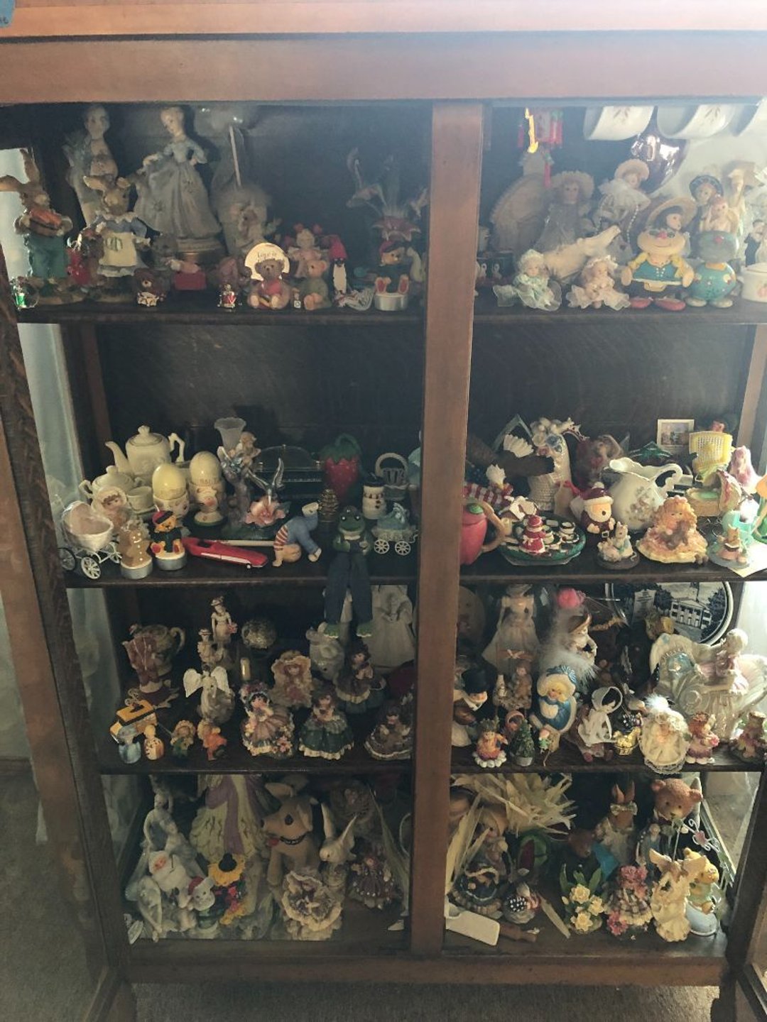 2 Griswold cast iron skillets, Salt and pepper shakers, blue Ball jars, refrigerator dishes, cookie jar, Pink rose dishes, Seyfert's pretzel jar, Jadite blossom design plate, Hull basket, Pink and cream small Hull vase, Roseville pitcher vase, Silver leaf glasses, Cast iron car, metal duck, metal horse bookend, ship bookend, Texaco pump, Glass fish, flower, vase, vintage bookends, bowl, planter, 3 piece moon and stars glassware, Fenton basket, fairy lights, misc glass, Pink, green, yellow depression dishes, Mayfair pink depression dishes, cracker jar, candy jar, 3 Mayfair pink depression bowls, Cast iron doorstop, 75 piece Homer Laughlin dogwood pattern dishes, Patton heater, small fan, Misc kitchenware, Strainer, 2 pressure cookers, Vintage Silvertone radio, 3 vintage ladies hats, 6 men's hats, Magnavox CD player and cassette recorder, cassettes, Juliette Eight Track Stereo player, 8 tracks, Sony fm/am stereo cassette recorder, cassettes, Crocks, sad iron, Vintage kitchenware, DVDs, 37 piece Homer Laughlin Georgian Eggshell dishes, Basket of glass vegetables, Vintage child's dishes, 2 pieces candle wick, 1 American sweetheart plate, 3 pieces bubbleglass, novelties and advertising, violin, 2 Furbys, Dubl Handi washboard, 2 feed bags, 2 cuckoo clocks both made in Germany, 29 pieces of misc Corelle, 95+ pieces of Lazy Daisy Corelle and flatware, 8 Pyrex mixing bowls, 2 Pyrex measuring pitchers, Copper boiler (rusty), vintage pot (chipped), American Tourister suitcase, Holiday decorations, Pots and pans with tote, Cleaning supplies, wire racks, Vintage handmade quilt, Signed handmade quilt, Comforter (damaged), 17 Life magazines from 1969 and 1971, 1969 Sears catalog, Handmade cross stitch flower quilt, State bird needlepoint quilt 96" x 68", Handmade signed quilt 108" x 84", Pyrex 3 piece casseroles, Commodore vintage computer, misc computer equipment, Bell & Howell movie projector, Quilt rack, automatic knitter, Small metal cabinet, Body power inversion table, Vitamaster 1000 XT exercise bike, Craft supplies and metal rack, Coppertone rack with sewing supplies and glassware, Coppertone rack with glassware, pop bottles, ceramic statutes, Record albums, Chalkboard, 3 mirrors, Fossil advertising sign, Metal plant stand, Craft supplies, material, doll heads, toolbox w/paints, metal rack, Weber small grill, 9' x 13' screen house, 3 wooden folding chairs, metal folding chair, 2 lawn chairs, 4 cushions, Belt buckles, knives, lighters, cuff links, hand warmers, Jewelry and jewelry boxes, Cat's eye ring, Logger, chicken wire, watering can, pavers, magnet, 2 boxes of canning jars, Whirlpool hot spa, Matmassager, Chi machine, exercise equipment, Painting supplies, small trash can, plastic baskets, Yard and garden tools, Adams Central letter jacket and t-shirt, Hammock, 2 folding lawn chairs, NIB heavy-duty shelving, Nib Proctor Silex coffee maker, rock garden, Nib Shiatsu foot massager, nib Snuggie, Staple gun, hammers, knives, screwdrivers, Champion socket set, Air pump, light bulbs, smoke alarms, hole saw set, glue gun, parts bin, 3 license plates, Kerosene heater, Patton electric heater, Magnifying lamp, bungee cords, batteries, oil can, Rubbermaid medium size cooler, Igloo polar roller 60 quart cooler, Metal shelving with glassware, stemware, vases, pots, plant stands, buckets, Metal shelving with garden supplies, small wooden ladder, bowling ball, Metal shelving with Memories of Yesterday and misc figurines, Large new extension cord, 3 aluminum treble lights, 2 Blue Mountain 2 piece rainsuits, small Comfort Zone heater, GE HEPA air purifier, Storage totes and containers misc sizes, 3 boxes of décor, Hand blown art glass, 7 pieces of Lefton china, glass basket and animals, Precious Moments collection, Precious Moments musical Ferris wheel, town buildings, books, Precious Moments train, nativity, 14 misc pieces, Brinn's musical dolls, Sleigh bells, 2 vintage bird pictures with feathers, Quilt top 74" x 90", Vintage marbles, Cast iron collection, Wicker planter, Garden statues, 2 photo screens, Vintage light-up Santa and snowman, Huge assortment of Christmas, 3 piece Roseville, Vases and decorator pieces, 18" green plate, glass decorator pieces, 46" x 36" drop leaf table with 2 chairs, Glassware, Americana Star stainless steel flatware service for 12 with chest, Oneida Wm A Rogers AI Plus flatware, 3 pieces silver plated items, Wm Rogers silver tea set, casserole, cutlery, cake knife, Silver plated assortment, 18" tall metal patio table, 5 garden statues, Large sitting angel cement statue, 4 plant stands, Vintage large green glass vase, large artificial rose, Heavy metal stand with glass shelves, wooden cabinet with contents, Misc wall items, Vintage metal serving cart, Microwave and cart, wall décor, Advertising yardsticks, grabber, dusters, gloves, Toshiba 19" television with remote, 6" pasta machine, metal kitchen utensils, warming tray, Office supplies, Kitchen table with 1 leaf and 6 chairs with wheels, Rival electric slicer, Primo water dispenser, Wm Rogers "Harvest" pitcher, Leonard silver plated pitcher, misc silver pieces, Heavy vintage glass pitcher, spongeware bowl, 3 crock bowls, coffee urn, 7 "The Young and the Restless" collector plates, record of "Nadia's Theme", Leonard silver plated pitcher, 2 silver plated cups, William Rogers candlesticks, Fire King baking dishes, 2 casseroles, Pyrex casserole, Misc Corningware and Fire King, 2 boxes of 25 Boopie stemware, Wooden bull, F B Rogers Silver Company tea set - Sugar and creamer, footed waste, Sharp Carousel microwave, Glitter lava-type lamp, dancing clown music box, 20+ pieces of mushroom design kitchen set, 2 boxes of flatware, 1 boxes of knives, sharpening steel, Vintage elephant cookie jar, 8 pieces Lefton china, 12 pieces Pink Rose Lefton china, McCoy cookie jar, 4 boxes of kitchen utensils, Joseph Rogers Jr & Sons drum with case and drum sticks, Bissel Powerforce bagless vacuum, Vintage Shirley Temple "First Vacation" doll, Vin