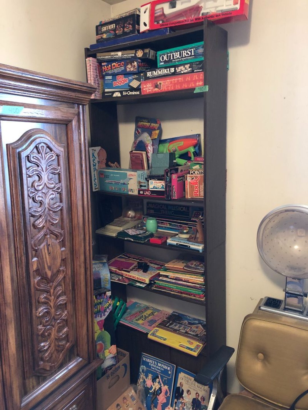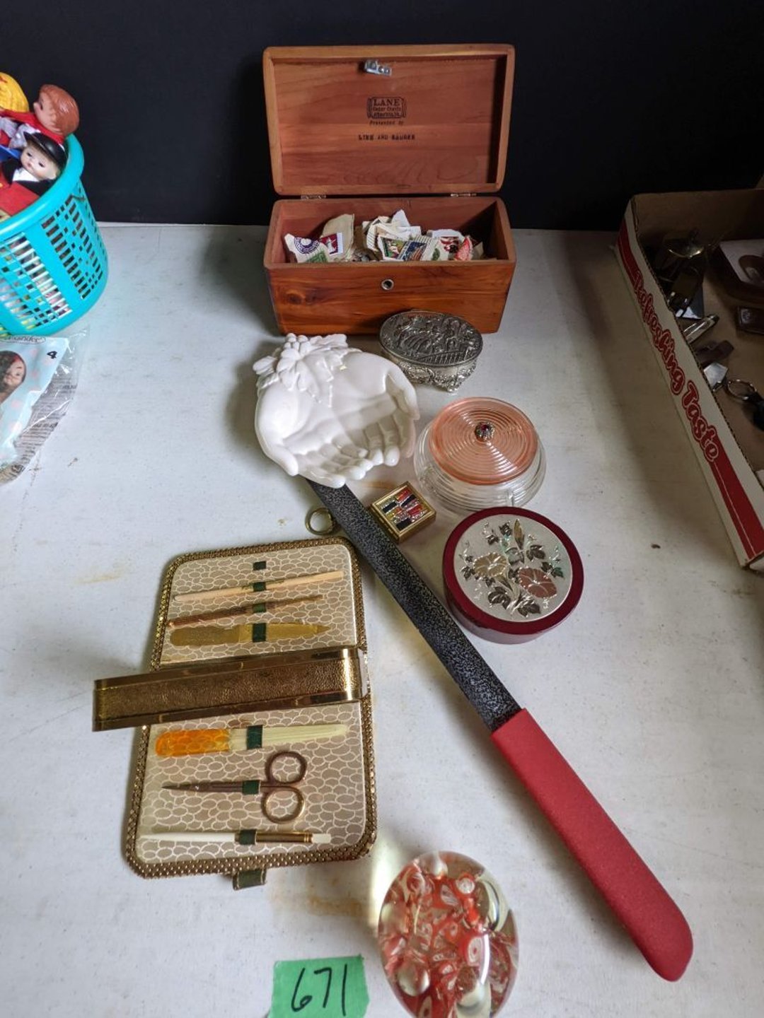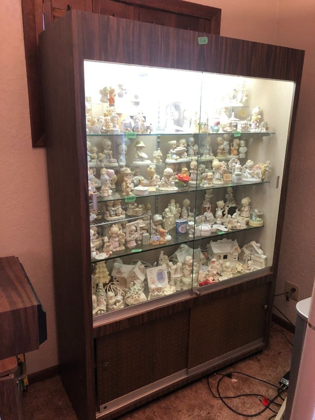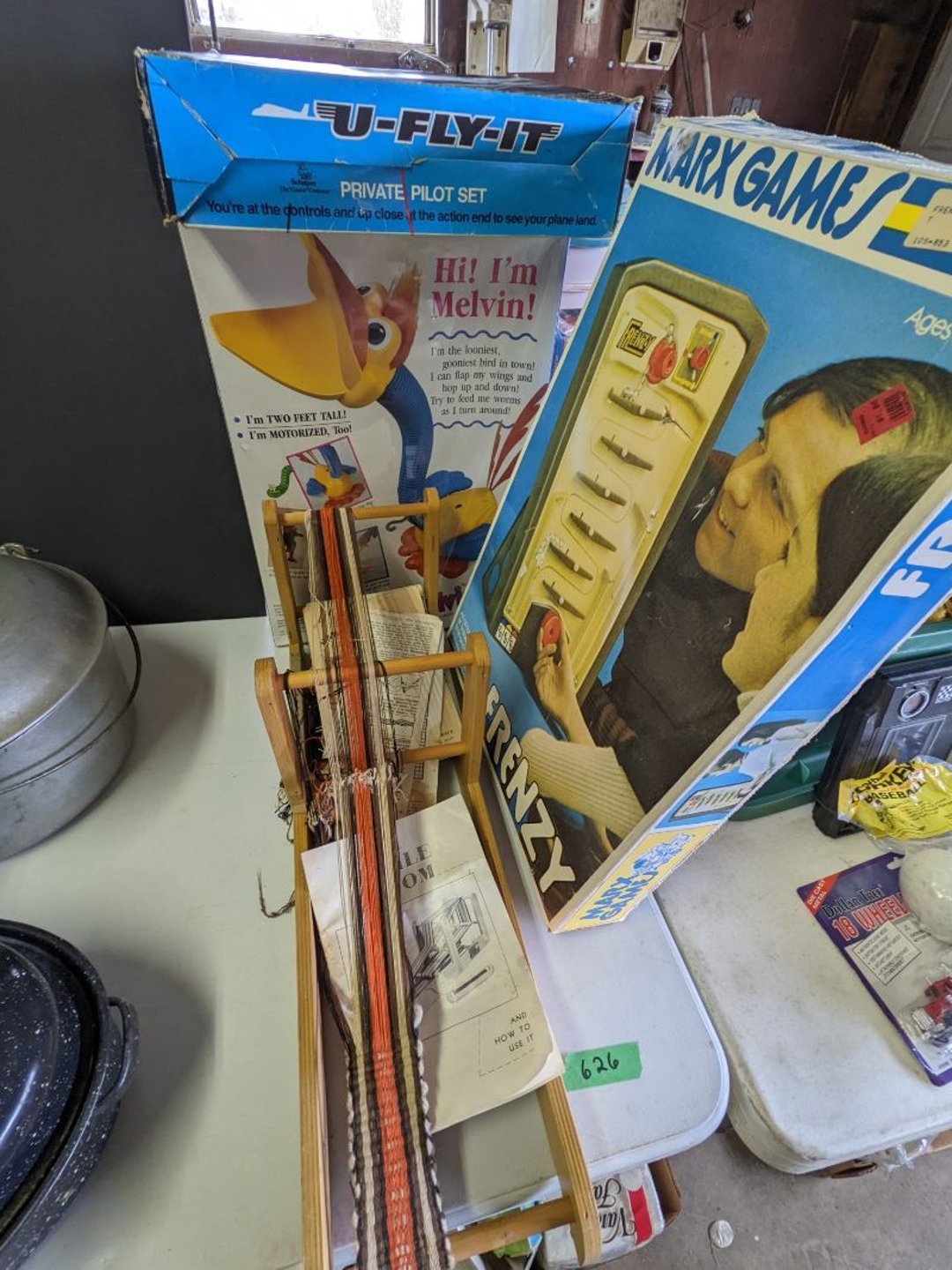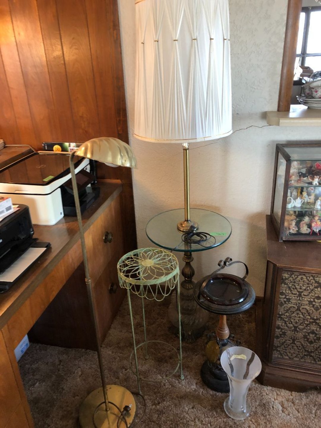2 Griswold cast iron skillets, Salt and pepper shakers, blue Ball jars, refrigerator dishes, cookie jar, Pink rose dishes, Seyfert's pretzel jar, Jadite blossom design plate, Hull basket, Pink and cream small Hull vase, Roseville pitcher vase, Silver leaf glasses, Cast iron car, metal duck, metal horse bookend, ship bookend, Texaco pump, Glass fish, flower, vase, vintage bookends, bowl, planter, 3 piece moon and stars glassware, Fenton basket, fairy lights, misc glass, Pink, green, yellow depression dishes, Mayfair pink depression dishes, cracker jar, candy jar, 3 Mayfair pink depression bowls, Cast iron doorstop, 75 piece Homer Laughlin dogwood pattern dishes, Patton heater, small fan, Misc kitchenware, Strainer, 2 pressure cookers, Vintage Silvertone radio, 3 vintage ladies hats, 6 men's hats, Magnavox CD player and cassette recorder, cassettes, Juliette Eight Track Stereo player, 8 tracks, Sony fm/am stereo cassette recorder, cassettes, Crocks, sad iron, Vintage kitchenware, DVDs, 37 piece Homer Laughlin Georgian Eggshell dishes, Basket of glass vegetables, Vintage child's dishes, 2 pieces candle wick, 1 American sweetheart plate, 3 pieces bubbleglass, novelties and advertising, violin, 2 Furbys, Dubl Handi washboard, 2 feed bags, 2 cuckoo clocks both made in Germany, 29 pieces of misc Corelle, 95+ pieces of Lazy Daisy Corelle and flatware, 8 Pyrex mixing bowls, 2 Pyrex measuring pitchers, Copper boiler (rusty), vintage pot (chipped), American Tourister suitcase, Holiday decorations, Pots and pans with tote, Cleaning supplies, wire racks, Vintage handmade quilt, Signed handmade quilt, Comforter (damaged), 17 Life magazines from 1969 and 1971, 1969 Sears catalog, Handmade cross stitch flower quilt, State bird needlepoint quilt 96" x 68", Handmade signed quilt 108" x 84", Pyrex 3 piece casseroles, Commodore vintage computer, misc computer equipment, Bell & Howell movie projector, Quilt rack, automatic knitter, Small metal cabinet, Body power inversion table, Vitamaster 1000 XT exercise bike, Craft supplies and metal rack, Coppertone rack with sewing supplies and glassware, Coppertone rack with glassware, pop bottles, ceramic statutes, Record albums, Chalkboard, 3 mirrors, Fossil advertising sign, Metal plant stand, Craft supplies, material, doll heads, toolbox w/paints, metal rack, Weber small grill, 9' x 13' screen house, 3 wooden folding chairs, metal folding chair, 2 lawn chairs, 4 cushions, Belt buckles, knives, lighters, cuff links, hand warmers, Jewelry and jewelry boxes, Cat's eye ring, Logger, chicken wire, watering can, pavers, magnet, 2 boxes of canning jars, Whirlpool hot spa, Matmassager, Chi machine, exercise equipment, Painting supplies, small trash can, plastic baskets, Yard and garden tools, Adams Central letter jacket and t-shirt, Hammock, 2 folding lawn chairs, NIB heavy-duty shelving, Nib Proctor Silex coffee maker, rock garden, Nib Shiatsu foot massager, nib Snuggie, Staple gun, hammers, knives, screwdrivers, Champion socket set, Air pump, light bulbs, smoke alarms, hole saw set, glue gun, parts bin, 3 license plates, Kerosene heater, Patton electric heater, Magnifying lamp, bungee cords, batteries, oil can, Rubbermaid medium size cooler, Igloo polar roller 60 quart cooler, Metal shelving with glassware, stemware, vases, pots, plant stands, buckets, Metal shelving with garden supplies, small wooden ladder, bowling ball, Metal shelving with Memories of Yesterday and misc figurines, Large new extension cord, 3 aluminum treble lights, 2 Blue Mountain 2 piece rainsuits, small Comfort Zone heater, GE HEPA air purifier, Storage totes and containers misc sizes, 3 boxes of décor, Hand blown art glass, 7 pieces of Lefton china, glass basket and animals, Precious Moments collection, Precious Moments musical Ferris wheel, town buildings, books, Precious Moments train, nativity, 14 misc pieces, Brinn's musical dolls, Sleigh bells, 2 vintage bird pictures with feathers, Quilt top 74" x 90", Vintage marbles, Cast iron collection, Wicker planter, Garden statues, 2 photo screens, Vintage light-up Santa and snowman, Huge assortment of Christmas, 3 piece Roseville, Vases and decorator pieces, 18" green plate, glass decorator pieces, 46" x 36" drop leaf table with 2 chairs, Glassware, Americana Star stainless steel flatware service for 12 with chest, Oneida Wm A Rogers AI Plus flatware, 3 pieces silver plated items, Wm Rogers silver tea set, casserole, cutlery, cake knife, Silver plated assortment, 18" tall metal patio table, 5 garden statues, Large sitting angel cement statue, 4 plant stands, Vintage large green glass vase, large artificial rose, Heavy metal stand with glass shelves, wooden cabinet with contents, Misc wall items, Vintage metal serving cart, Microwave and cart, wall décor, Advertising yardsticks, grabber, dusters, gloves, Toshiba 19" television with remote, 6" pasta machine, metal kitchen utensils, warming tray, Office supplies, Kitchen table with 1 leaf and 6 chairs with wheels, Rival electric slicer, Primo water dispenser, Wm Rogers "Harvest" pitcher, Leonard silver plated pitcher, misc silver pieces, Heavy vintage glass pitcher, spongeware bowl, 3 crock bowls, coffee urn, 7 "The Young and the Restless" collector plates, record of "Nadia's Theme", Leonard silver plated pitcher, 2 silver plated cups, William Rogers candlesticks, Fire King baking dishes, 2 casseroles, Pyrex casserole, Misc Corningware and Fire King, 2 boxes of 25 Boopie stemware, Wooden bull, F B Rogers Silver Company tea set - Sugar and creamer, footed waste, Sharp Carousel microwave, Glitter lava-type lamp, dancing clown music box, 20+ pieces of mushroom design kitchen set, 2 boxes of flatware, 1 boxes of knives, sharpening steel, Vintage elephant cookie jar, 8 pieces Lefton china, 12 pieces Pink Rose Lefton china, McCoy cookie jar, 4 boxes of kitchen utensils, Joseph Rogers Jr & Sons drum with case and drum sticks, Bissel Powerforce bagless vacuum, Vintage Shirley Temple "First Vacation" doll, Vin