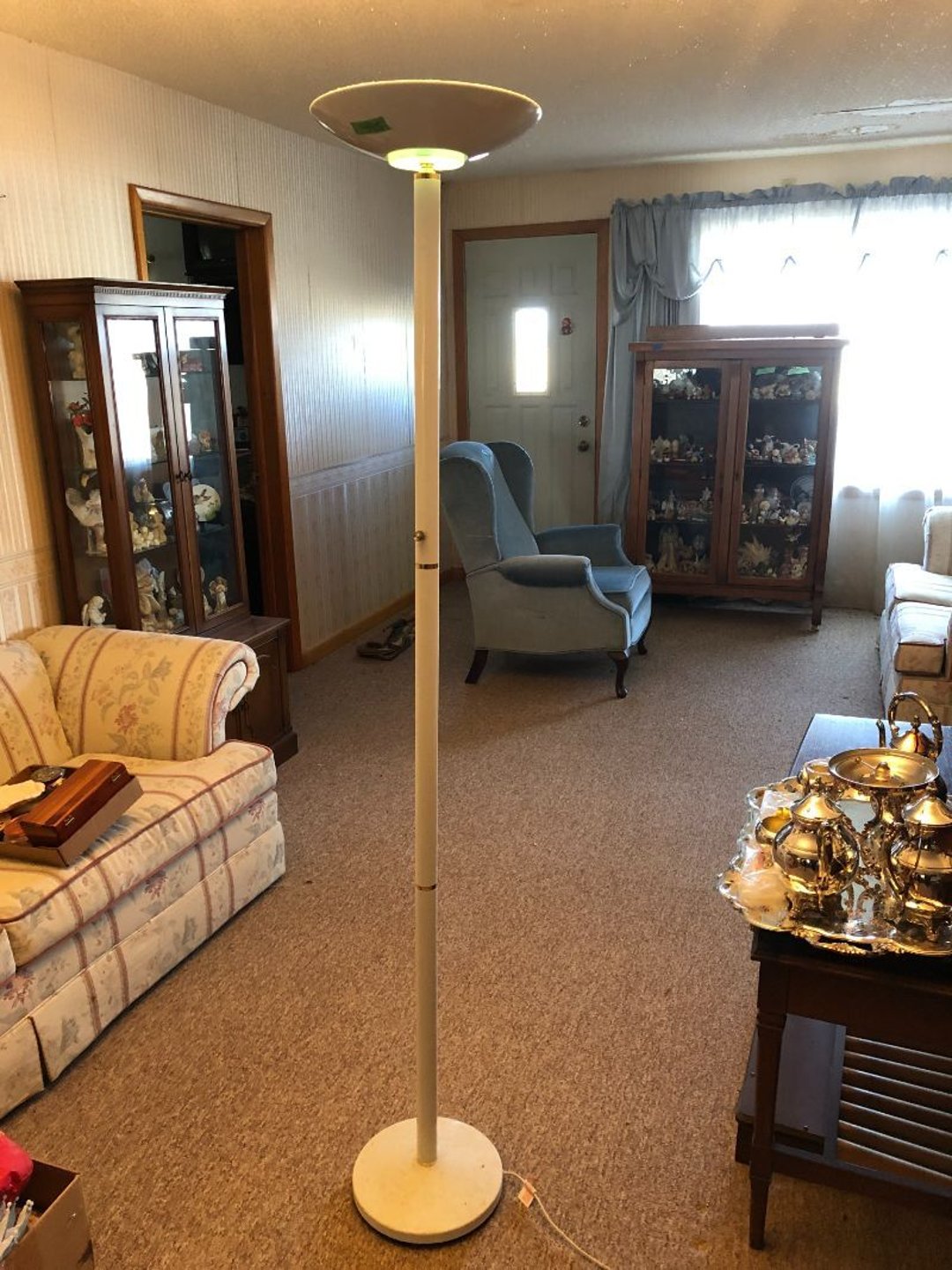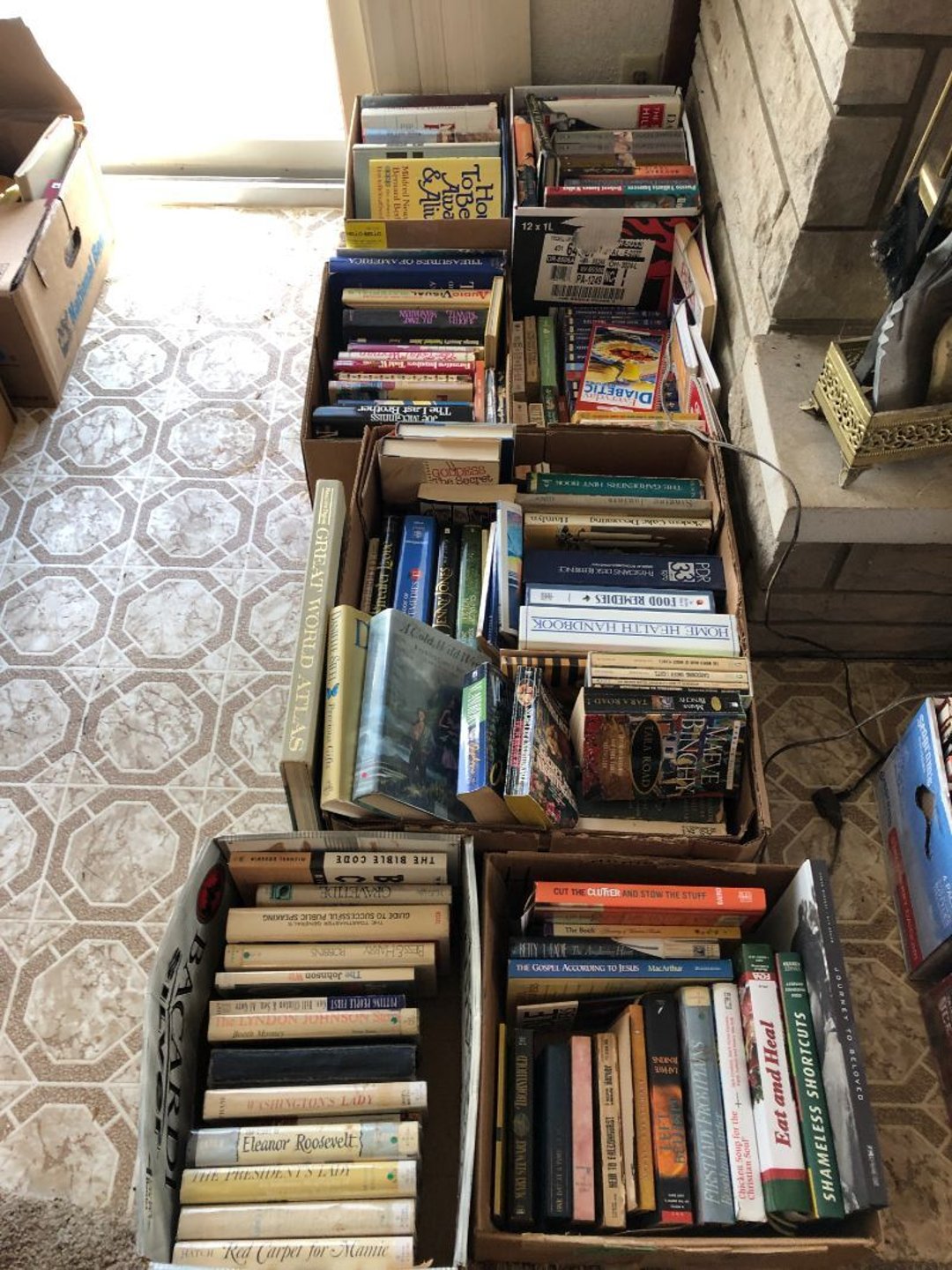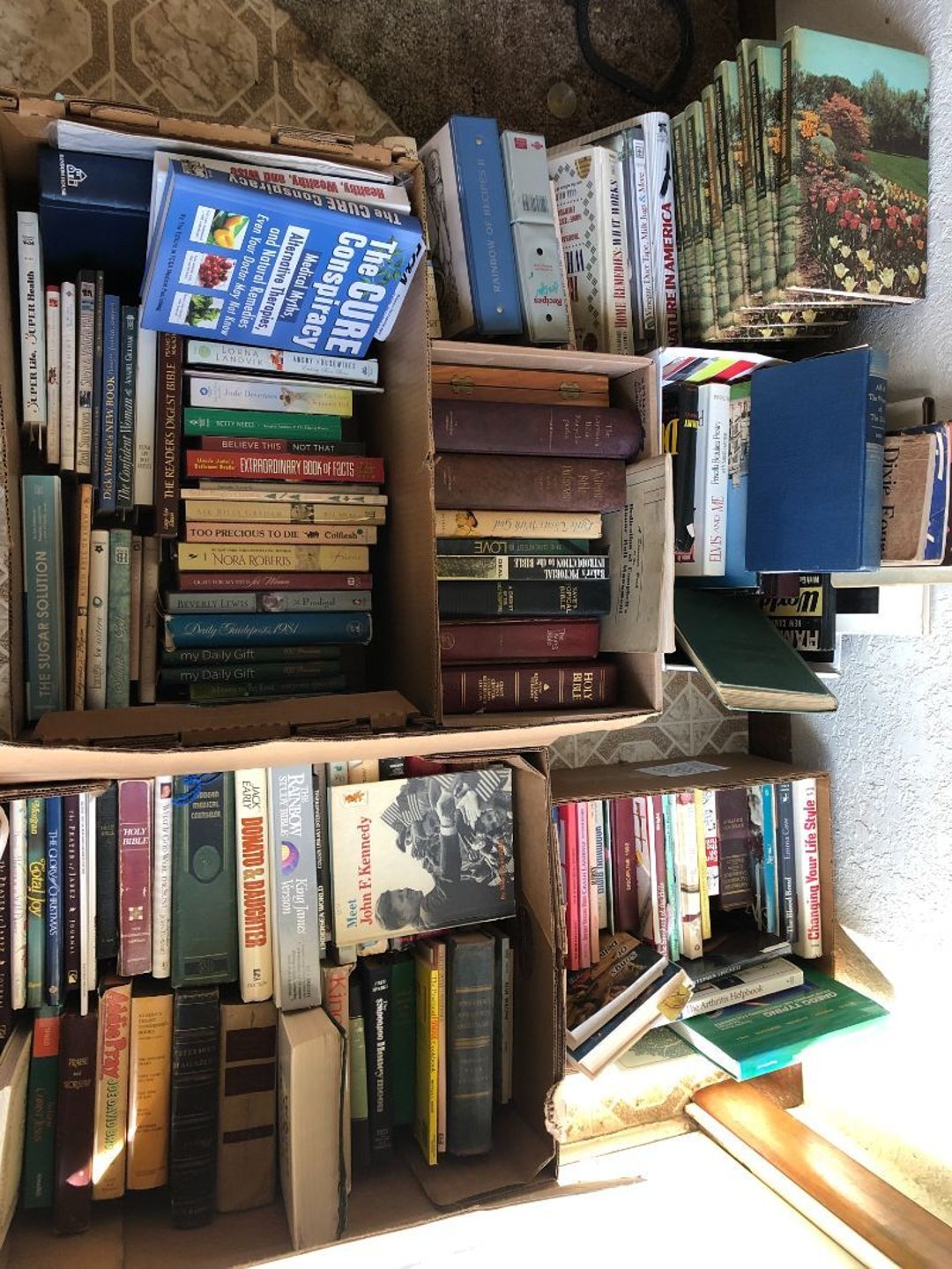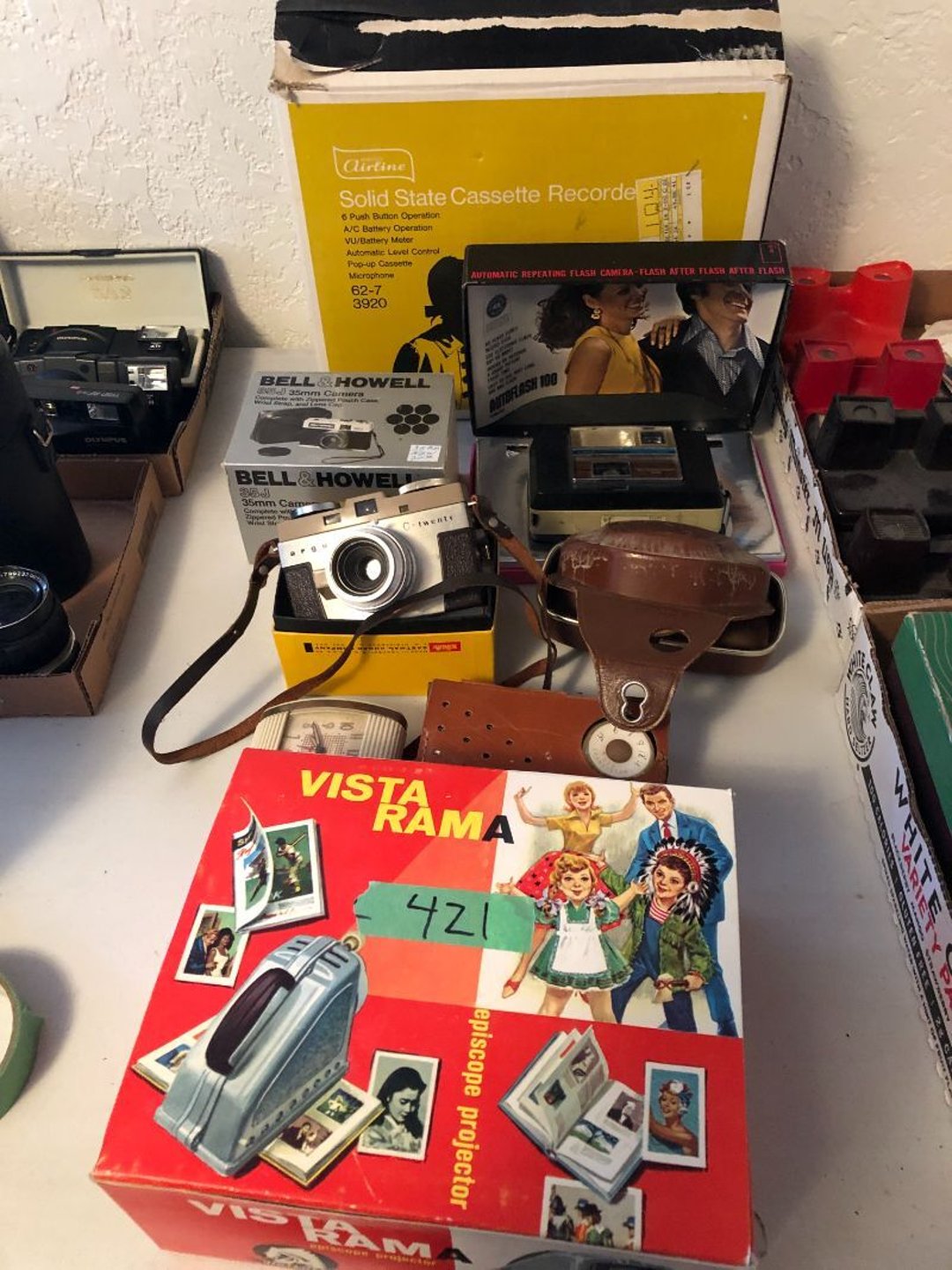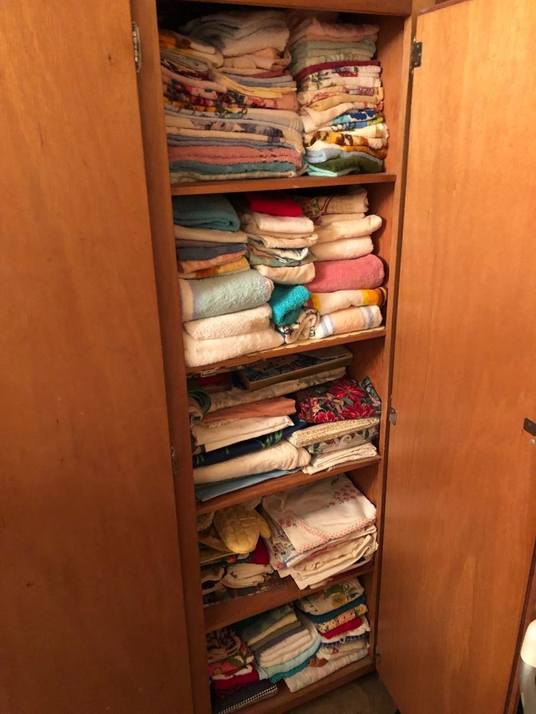 2 Griswold cast iron skillets, Salt and pepper shakers, blue Ball jars, refrigerator dishes, cookie jar, Pink rose dishes, Seyfert's pretzel jar, Jadite blossom design plate, Hull basket, Pink and cream small Hull vase, Roseville pitcher vase, Silver leaf glasses, Cast iron car, metal duck, metal horse bookend, ship bookend, Texaco pump, Glass fish, flower, vase, vintage bookends, bowl, planter, 3 piece moon and stars glassware, Fenton basket, fairy lights, misc glass, Pink, green, yellow depression dishes, Mayfair pink depression dishes, cracker jar, candy jar, 3 Mayfair pink depression bowls, Cast iron doorstop, 75 piece Homer Laughlin dogwood pattern dishes, Patton heater, small fan, Misc kitchenware, Strainer, 2 pressure cookers, Vintage Silvertone radio, 3 vintage ladies hats, 6 men's hats, Magnavox CD player and cassette recorder, cassettes, Juliette Eight Track Stereo player, 8 tracks, Sony fm/am stereo cassette recorder, cassettes, Crocks, sad iron, Vintage kitchenware, DVDs, 37 piece Homer Laughlin Georgian Eggshell dishes, Basket of glass vegetables, Vintage child's dishes, 2 pieces candle wick, 1 American sweetheart plate, 3 pieces bubbleglass, novelties and advertising, violin, 2 Furbys, Dubl Handi washboard, 2 feed bags, 2 cuckoo clocks both made in Germany, 29 pieces of misc Corelle, 95+ pieces of Lazy Daisy Corelle and flatware, 8 Pyrex mixing bowls, 2 Pyrex measuring pitchers, Copper boiler (rusty), vintage pot (chipped), American Tourister suitcase, Holiday decorations, Pots and pans with tote, Cleaning supplies, wire racks, Vintage handmade quilt, Signed handmade quilt, Comforter (damaged), 17 Life magazines from 1969 and 1971, 1969 Sears catalog, Handmade cross stitch flower quilt, State bird needlepoint quilt 96" x 68", Handmade signed quilt 108" x 84", Pyrex 3 piece casseroles, Commodore vintage computer, misc computer equipment, Bell & Howell movie projector, Quilt rack, automatic knitter, Small metal cabinet, Body power inversion table, Vitamaster 1000 XT exercise bike, Craft supplies and metal rack, Coppertone rack with sewing supplies and glassware, Coppertone rack with glassware, pop bottles, ceramic statutes, Record albums, Chalkboard, 3 mirrors, Fossil advertising sign, Metal plant stand, Craft supplies, material, doll heads, toolbox w/paints, metal rack, Weber small grill, 9' x 13' screen house, 3 wooden folding chairs, metal folding chair, 2 lawn chairs, 4 cushions, Belt buckles, knives, lighters, cuff links, hand warmers, Jewelry and jewelry boxes, Cat's eye ring, Logger, chicken wire, watering can, pavers, magnet, 2 boxes of canning jars, Whirlpool hot spa, Matmassager, Chi machine, exercise equipment, Painting supplies, small trash can, plastic baskets, Yard and garden tools, Adams Central letter jacket and t-shirt, Hammock, 2 folding lawn chairs, NIB heavy-duty shelving, Nib Proctor Silex coffee maker, rock garden, Nib Shiatsu foot massager, nib Snuggie, Staple gun, hammers, knives, screwdrivers, Champion socket set, Air pump, light bulbs, smoke alarms, hole saw set, glue gun, parts bin, 3 license plates, Kerosene heater, Patton electric heater, Magnifying lamp, bungee cords, batteries, oil can, Rubbermaid medium size cooler, Igloo polar roller 60 quart cooler, Metal shelving with glassware, stemware, vases, pots, plant stands, buckets, Metal shelving with garden supplies, small wooden ladder, bowling ball, Metal shelving with Memories of Yesterday and misc figurines, Large new extension cord, 3 aluminum treble lights, 2 Blue Mountain 2 piece rainsuits, small Comfort Zone heater, GE HEPA air purifier, Storage totes and containers misc sizes, 3 boxes of décor, Hand blown art glass, 7 pieces of Lefton china, glass basket and animals, Precious Moments collection, Precious Moments musical Ferris wheel, town buildings, books, Precious Moments train, nativity, 14 misc pieces, Brinn's musical dolls, Sleigh bells, 2 vintage bird pictures with feathers, Quilt top 74" x 90", Vintage marbles, Cast iron collection, Wicker planter, Garden statues, 2 photo screens, Vintage light-up Santa and snowman, Huge assortment of Christmas, 3 piece Roseville, Vases and decorator pieces, 18" green plate, glass decorator pieces, 46" x 36" drop leaf table with 2 chairs, Glassware, Americana Star stainless steel flatware service for 12 with chest, Oneida Wm A Rogers AI Plus flatware, 3 pieces silver plated items, Wm Rogers silver tea set, casserole, cutlery, cake knife, Silver plated assortment, 18" tall metal patio table, 5 garden statues, Large sitting angel cement statue, 4 plant stands, Vintage large green glass vase, large artificial rose, Heavy metal stand with glass shelves, wooden cabinet with contents, Misc wall items, Vintage metal serving cart, Microwave and cart, wall décor, Advertising yardsticks, grabber, dusters, gloves, Toshiba 19" television with remote, 6" pasta machine, metal kitchen utensils, warming tray, Office supplies, Kitchen table with 1 leaf and 6 chairs with wheels, Rival electric slicer, Primo water dispenser, Wm Rogers "Harvest" pitcher, Leonard silver plated pitcher, misc silver pieces, Heavy vintage glass pitcher, spongeware bowl, 3 crock bowls, coffee urn, 7 "The Young and the Restless" collector plates, record of "Nadia's Theme", Leonard silver plated pitcher, 2 silver plated cups, William Rogers candlesticks, Fire King baking dishes, 2 casseroles, Pyrex casserole, Misc Corningware and Fire King, 2 boxes of 25 Boopie stemware, Wooden bull, F B Rogers Silver Company tea set - Sugar and creamer, footed waste, Sharp Carousel microwave, Glitter lava-type lamp, dancing clown music box, 20+ pieces of mushroom design kitchen set, 2 boxes of flatware, 1 boxes of knives, sharpening steel, Vintage elephant cookie jar, 8 pieces Lefton china, 12 pieces Pink Rose Lefton china, McCoy cookie jar, 4 boxes of kitchen utensils, Joseph Rogers Jr & Sons drum with case and drum sticks, Bissel Powerforce bagless vacuum, Vintage Shirley Temple "First Vacation" doll, Vin