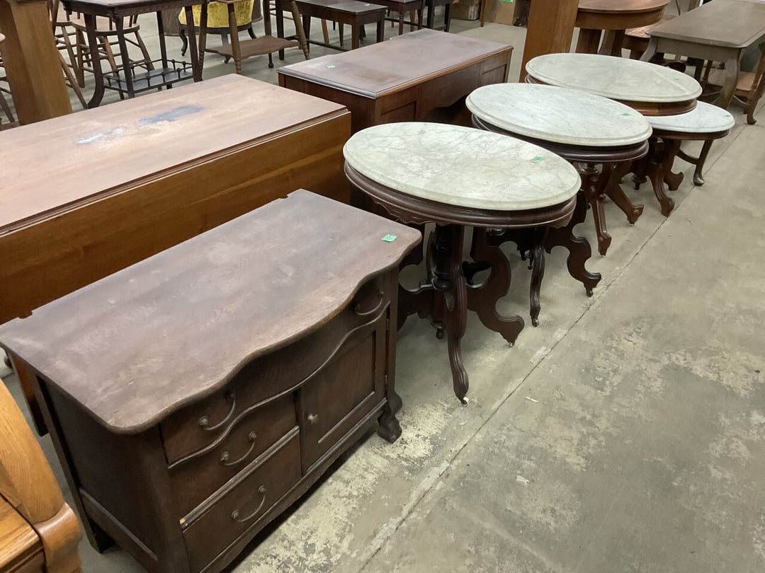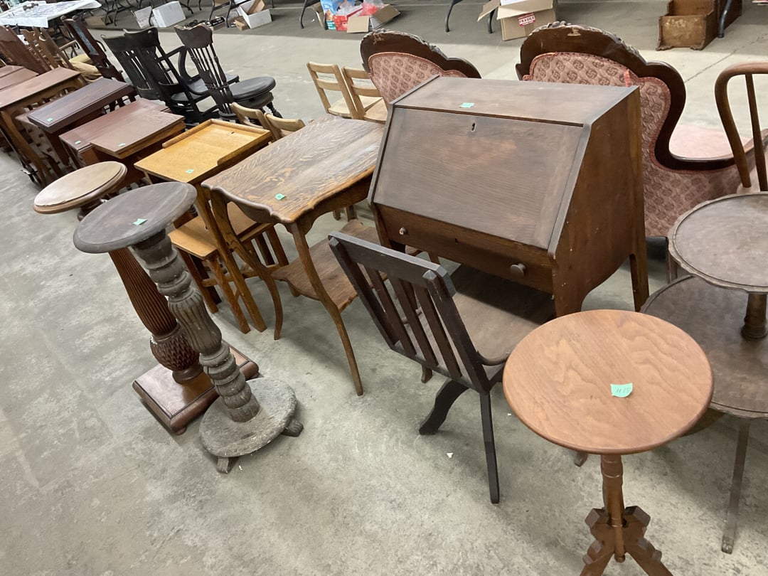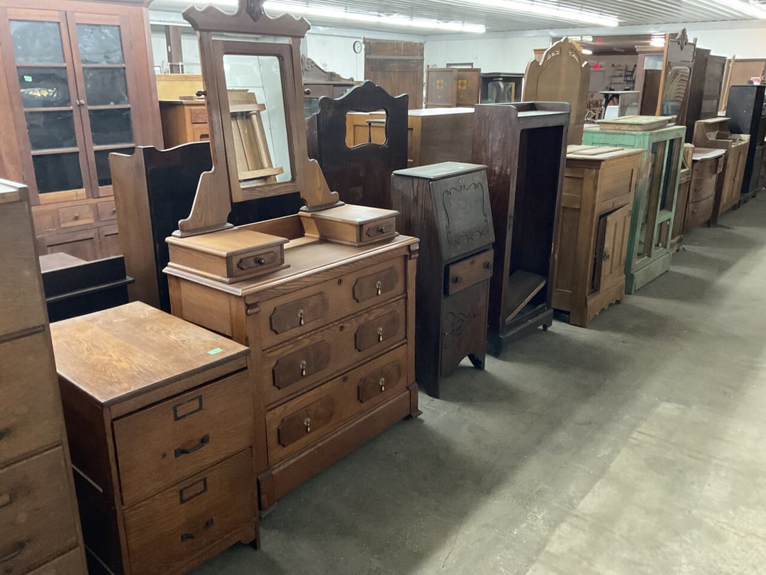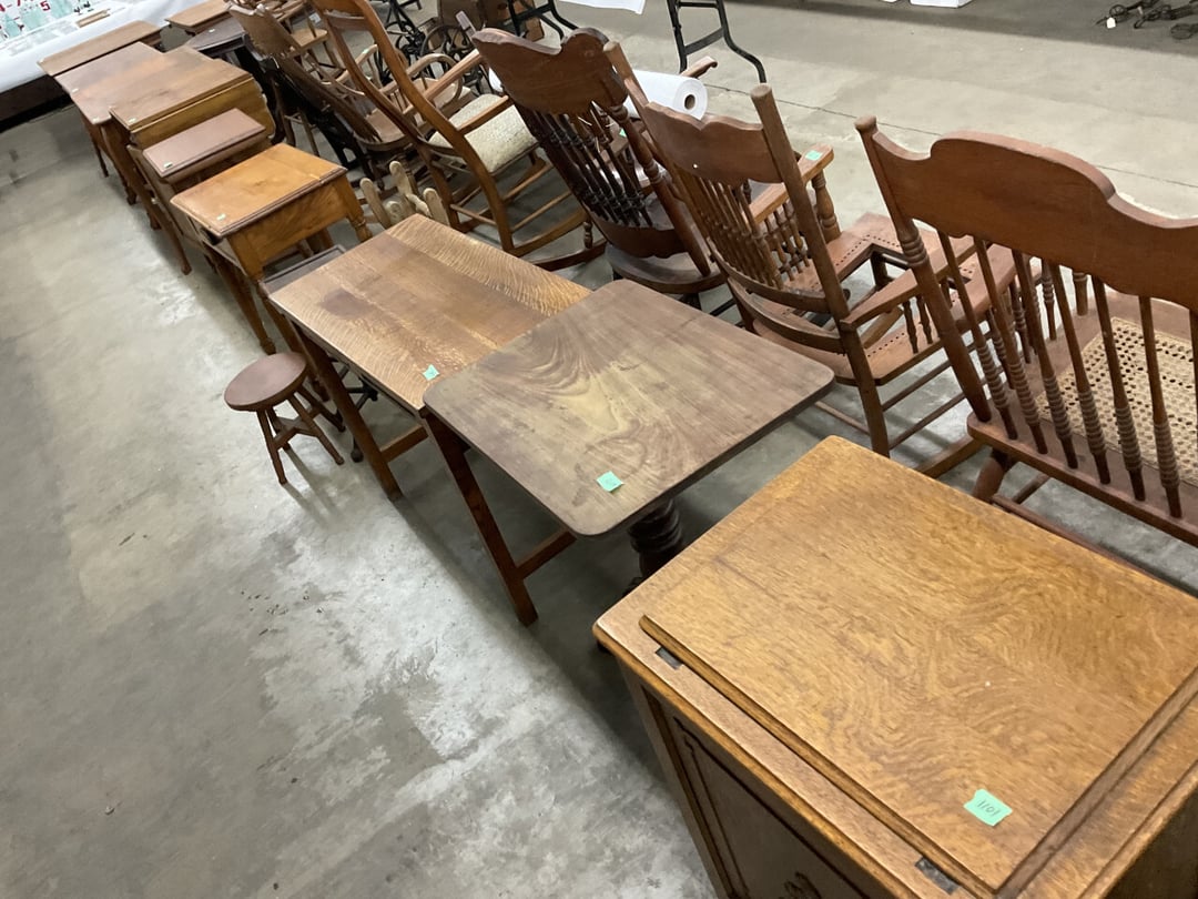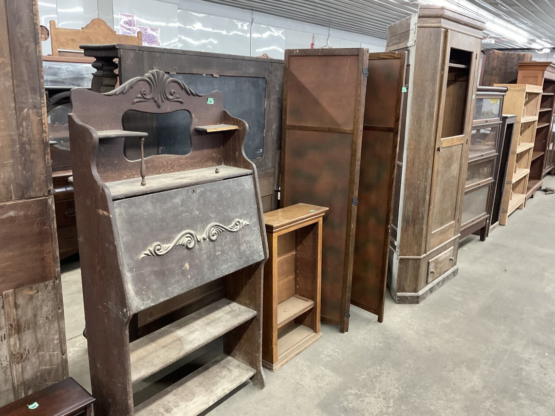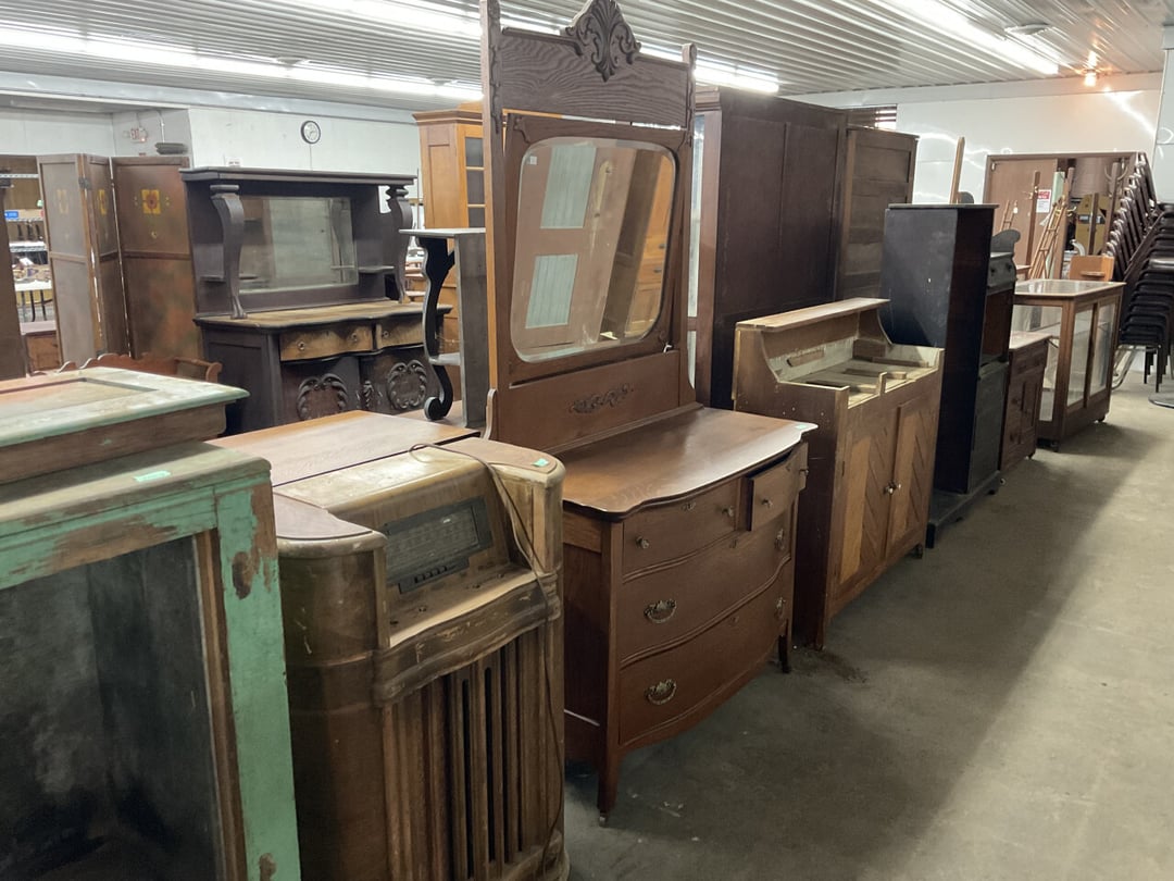 Stepback Kitchen Cabinet , 2 Door- 2 Drawer Oak Cabinet , Jelly Cupboard , Secretary Curio Cabinet- Original Finish, Buffet , Secretary Curio Cabinet- Original Finish, Oak Mantle with Mirror , Oak Mantle with Mirror , Oak Mantle, Oak Full Size Bed Frame , Walnut Queen Size Bed Frame- with Burl Inlay , Oak Full size Bed Frame , Floor Lamp with Marble , Floor Lamp with Marble , Floor Lamp with Marble , Table Lamp with Marble, "Brass" Coat Rack , 4 Drawer Oak Filing Cabinet , 4 Drawer Oak Filing Cabinet , 4 Drawer Oak Filing Cabinet , 4 Drawer Oak Filing Cabinet , 2 Drawer Oak Filing Cabinet , Oak Dresser with Mirror and glove boxes , Oak Secretary Cabinet, Oak Book Case with Glass Door , Oak Ice Box , Oak Ice Box-Painted , RCA Victor Console Radio , Oak Dresser with Mirror, Buffet (Missing Drawers and top), Secretary Curio Cabinet- Missing Parts/Mirror , Wash Stand , Oak Showcase with Glass Top , Oak Showcase with Glass Top , Kitchen Cupboard with spooning , Sliding Door Glass Display Case , 4 Drawer Dresser with Mirror, Buffet Top Piece , 4 Drawer Dresser with no mirror , Waterfall Make-up Vanity w/broken chair , 9 Drawer Oak Filing Cabinet on Pedestal, Secretary, 2 Door Oak Bookcase , Paneled Writing Desk , Kichen Cupboard , Room Divider with Vintage Rugs , Blanket Box , Vanity Dresser with Hat Box , Vintage Kitchen Cupboard with Dry Sink , Corner China Cabinet (3 pieces of glass broken), Oak Pie/Jelly Cubboard , China Cabinet w/Drawers , Wood Blanket Box , Lamp Table w/hidden storage , Wash Stand , Buffet with Mirror , Writing Desk/China Cupboard, Wash Stand , Marble Top Fern Table , Marble Top Fern Table , Marble Top Fern Table , Marble Top End Table , Sofa Table , End Table , Misc Piece (Hat Box), Misc Piece (Hat Box), Oak Easel , 2 Oak Easel , 2 Easels , 2 Hall Trees , 2 Hall Trees , 2 Hall Trees with no hooks , Cast Iron Fern Stand , 2 Pedestal Library Parlor Table , 2 Pedestal Library Parlor Table , 2 Drawer/1 Door Cabinet , Walnut Knee Hole Desk , Dropleaf Tabl e, Butter Churn with broken handle and no bottom , Bed Stool , Writing Desk -Broken , Cabinet , Dressing Screen , Oak Corner Dresser (missing mirror) , Globe-Wernicke Sectional Bookcase , Glass Door Bookcase , 4 Section Stacking Bookcase , Bookcase , Mission Oak Curio/Bookcase Cabinet , Walnut Vanity with Hat Box and Burled Inserts, Wash Stand with mirror and towel bar- Burl drawer fronts , Fern Table , Fern Table , Desk, Dropleaf Cabinet , Small Fern Stand , Small End Table with Drawer , Small Fern Stand, Small Stool and Hi-chair base , Child Desk , Fern Table , Sewing Machine Cabinet w/NO sewing machine , Nail Keg, Lamp Table with drawer , Lamp Table with drawer , Lamp Table , Fern Table , 2 Drawer End Table , Fern Table , Dropleaf End table with 2 drawers, Fern Table , Child Desk with Stool , Fern Table , Writing Desk with Chair , 2- Pedestal Fern Stands, Pedestal Fern Stand and "Duncan Phyfe" Table , 2 Pedestal Fern Stands , Serving Table-wheels do not match , Jenny Lynn Style Fern Table , Piano Bench , x2 Piano Benches, Mission Style Desk , Insert for desk, vintage sitting bench,, Church pew hymnal holders, Church pew hymnal holders, Church pew hymnal holders, 3 Various size shelving, 2 Chairs, 2 Cane Bottom Chairs, 2 Chairs, Buffet top, Antique Upholstered Chair, 4 Wood Dining Chairs, 4 Wood Dining Chairs, Pair of Antique Upholstered Chairs, 6 Childrens Chairs, Antique Chair w/ Glass Ball & Claw Feet, 3 Antique Chairs, 2 Chairs, Cane Bottom Bench, Antique Chair, Rocking Chair, Rocking Chair, Rocking Chair, Rocking Chair, Rocking Chair, High Chair, Antique Oval Table, Antique Side Table, Buffett Top Cabinet , 2 Cast Iron Treadle Sewing Machine Bases, Plate shelf, Hanging corner shelf, Hanging corner shelf, Antique Oak Hat/Coat Rack 23"x23", Antique Media display rack, Antique Spooned Mantle Clock Shelf w/Mirror, Antique rope bed w/ Cannon Balls, Ornate wall mirror, Antique child's / hired hand bed, Vintage Stained glass window, Antique "Brass" Full size bed, Antique Iron Toddler Bed w/sides, Antique "Oak" full size bed frame, Antique "Brass " Twin Bed, Antique Lawyers Book Case - needs restored, Antique 58" Roll Top Desk, Antique hardware store parts bins, Antique revolving bookcase, Antique oak office chair with casters, Danner Revolving bookcase 1876 Walnut, Antique Leather bottom Rocker & Yellow Parlor, Antique doll chair, child's rocking chair, Antique wood Highchair - needs repair , 7 Vintage dining room chairs, Vintage dressing bench and stool, 2 Vintage chairs, 5 antique Plank bottom chairs, 3 Press back chairs , 1 child's booster chair , 2 Vintage chairs and stool, 3 Antique kitchen chairs, 2 Antique chairs, Unique antique chair, Antique entryway bench with storage, 2 Unique chairs, 2 Vintage plank bottom chairs, Antique shadow box & Wood file cabinet base, 5 vintage child's chairs, 2 Vintage rockers – needs repair, Vintage plank bottom rocker & Cane rocker, 4 Vintage press back chairs, Vintage machinist chest, Antique Coffee table " Marble" top, Vintage side table - broken leg, Table leaves( 2) 8" x 48", Vintage wash stand 35 x 19 , Dining room table 46" x 52" (veneer loose), Vintage wood ironing board, 5 Dining room table legs 23 inches long, Two vintage table bases, Vintage full size spool bed w/rails, Vintage medicine cabinet with towel bar 19" x 24", Vintage medicine cabinet with towel bar, Vintage medicine cabinet with Tower bar, Vintage medicine cabinet, Vintage medicine cabinet, Vintage medicine cabinet, Vintage hanging hat box With shelf, Vintage child's wooden seat with drawer, Vintage wall mirror, Bookcase or China cabinet doors, , , , , Chair - needs reupholstered, Ice Cream Parlor Chairs & Small Table , Vintage 7' Misson Style Sofa, Ice Cream Parlor Chairs & Small Table , Vintage Oval Dropleaf Table , Vintage 5 Leg Table , Vintage Round Pedestal Table , Vintage Expandable Drop Leaf Table , Vintage 42" Round Pedestal Table, Vintage LibraryTable, Vintage Table , Vintage 48" Round Table , Vintage Sq
