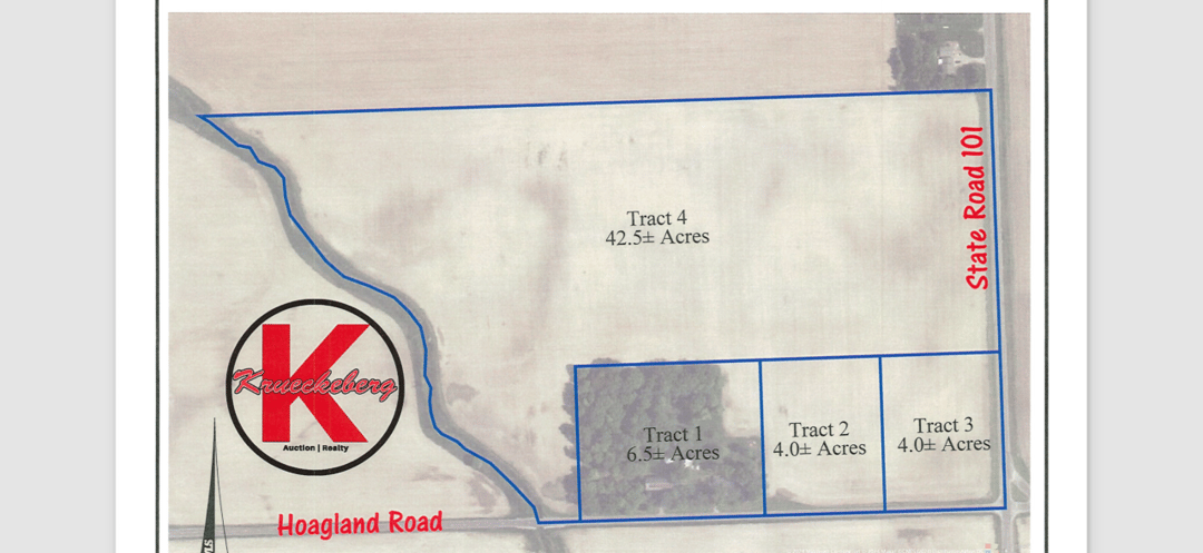 Auction Terms & Conditions Real Estate: Tract 1 $10,000 Nonrefundable down payment due at close of auction, Tract 2 $5,000 Nonrefundable down payment due at close of auction,Tract 3 $5,000 Nonrefundable down payment due at close of auction. Tract 4 $40,000 Nonrefundable down payment due at close of auction.Possession Of tillable ground Day of Auction, Possession of house & Barn to be given day of closing, Closing to be within 45 days from date of auction, A staked survey will be provided, cost of the survey split 50/50 between buyer & seller. Title search, title policy, closing cost to be split 50/50 between buyer and seller. Not Sold Subject to Inspections, Please have inspections done Prior to day of auction Sold AS/IS WHERE/IS. Sold subject to Allen county plan commision approval, Sold Subject to Sellers approval. Not Responsible for accidents. Auctioneers License: Josh Krueckeberg (AU19800008 AC31500055) Christopher & Kellie Pierce -Owner