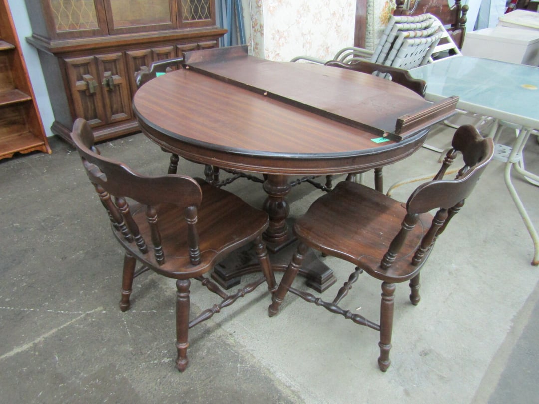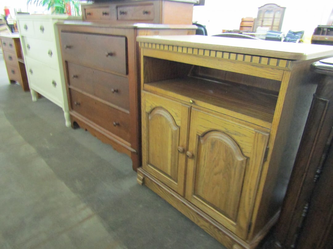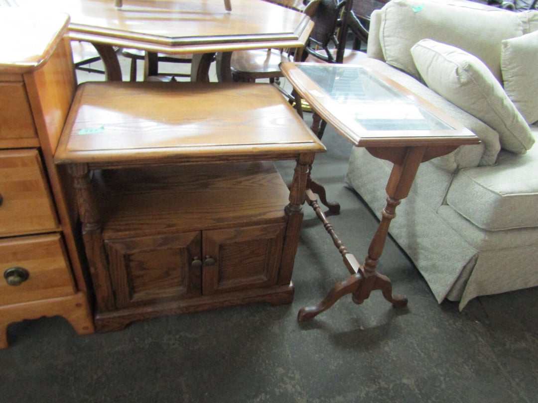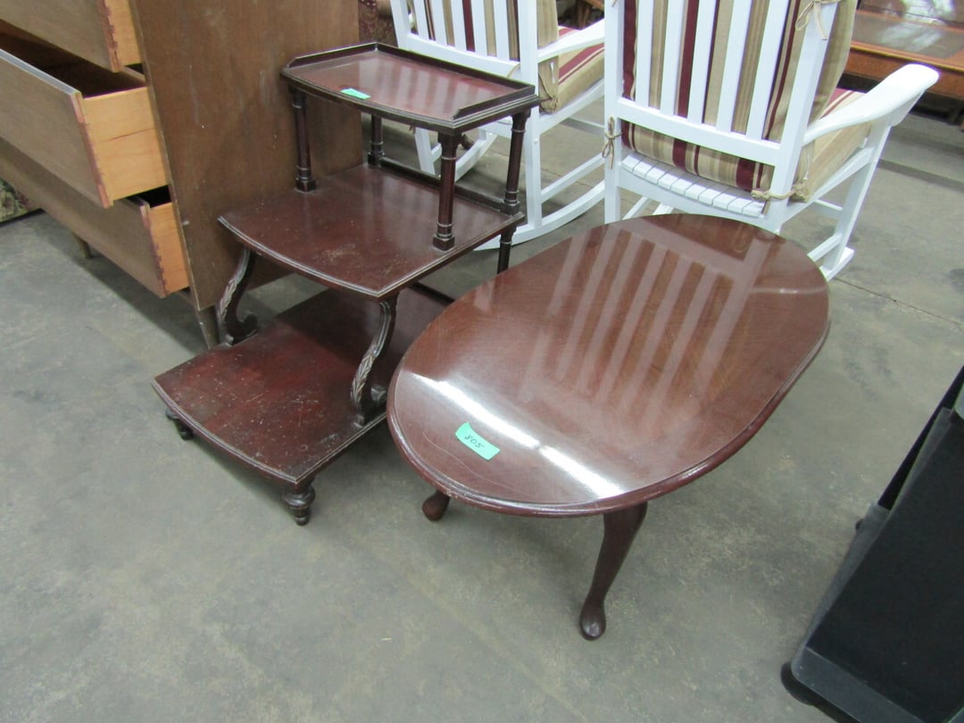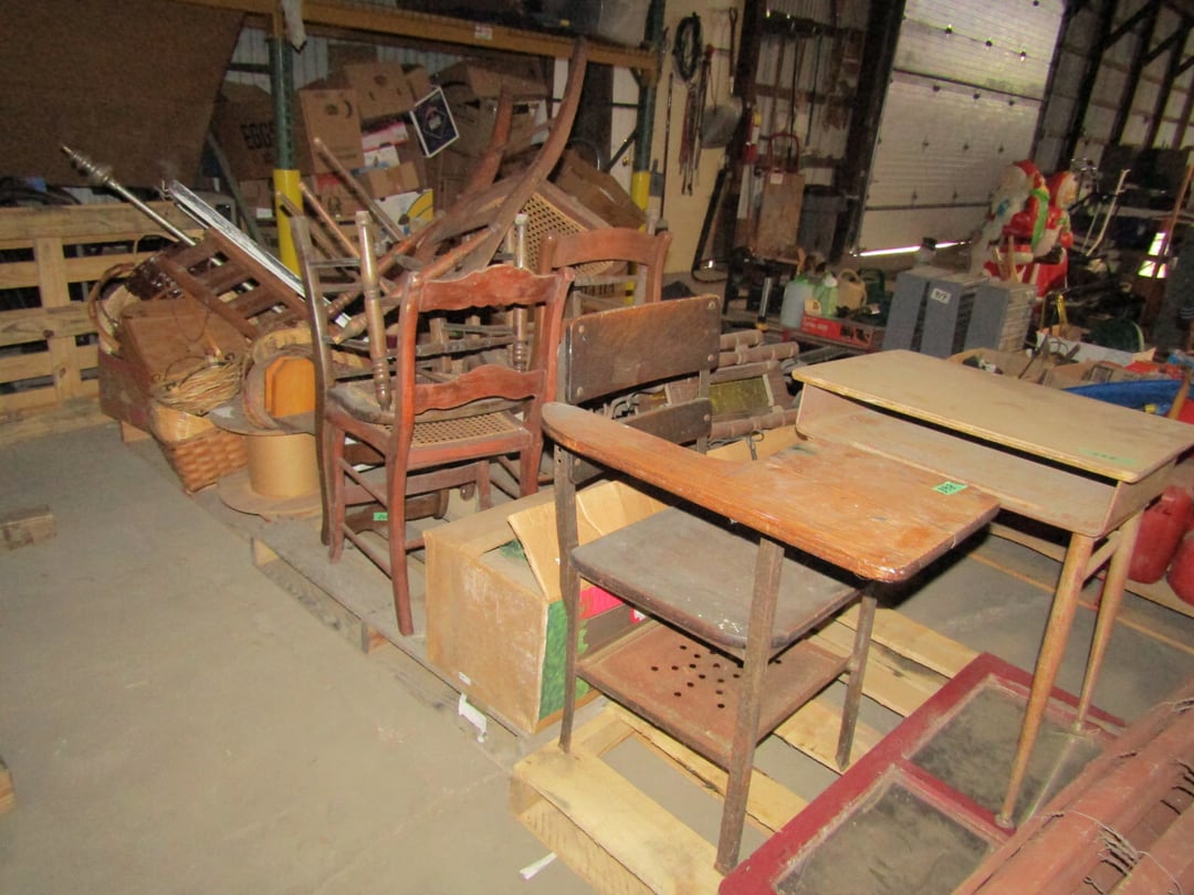 •King Bed - China Cabinet - Oak Bookshelf - (4) Dining Room Tables w/ 4 Chairs - Dining Room Tables w/ 8 Chairs - (2) Patio Tables w/ 4 Chairs - Sofa Curio Cabinet - Chairse Lounge - Swivel Rocker Patio Chair - Inside Patio Furniture - Porch Rockers - Wood Patio Set - Patio Umbrella - 2 & 4 Drawer File Cabinets - Heavy Wood Rocker - Barrel Back Chairs - Quilt Rack - Quilts - Bakers Rack - Drying Rack - Crocks - Granite Pans - Rotisserie - Snow Cone Maker - Ice Cream Maker - Candy Bin - End Tables - Coffee Tables - Roll Top Desk - Knee Hole Desk - Sofas - Love Seat - Armoire - (2) Fern Stands - Chest of Drawers - Dresser w/ Glove Boxes & Hart Mirror - Card Table w/ 4 Chairs - C.I. Bench - Drum Table - Lift Chair - 6' Handicap Ramp w/ Rails - Handicap Rolling Seat