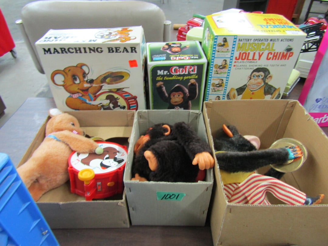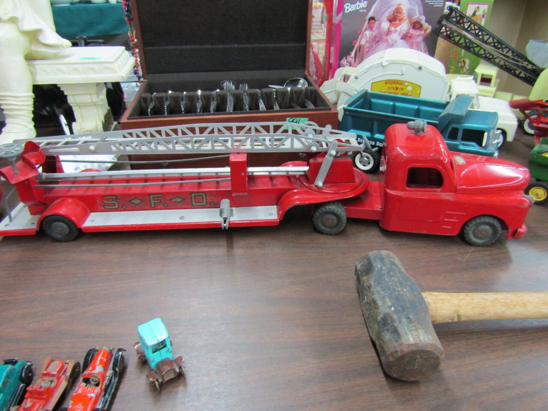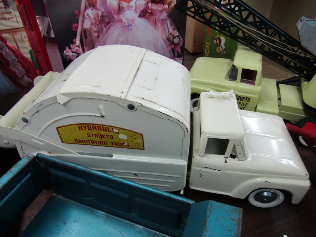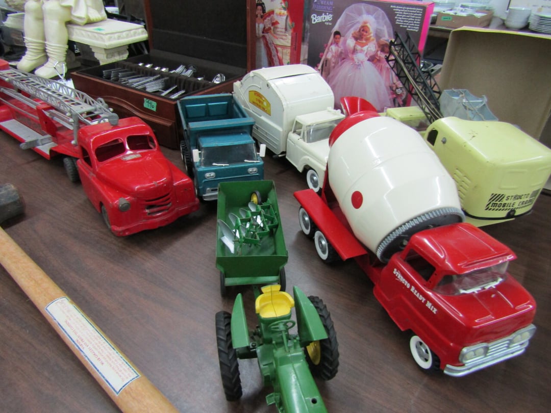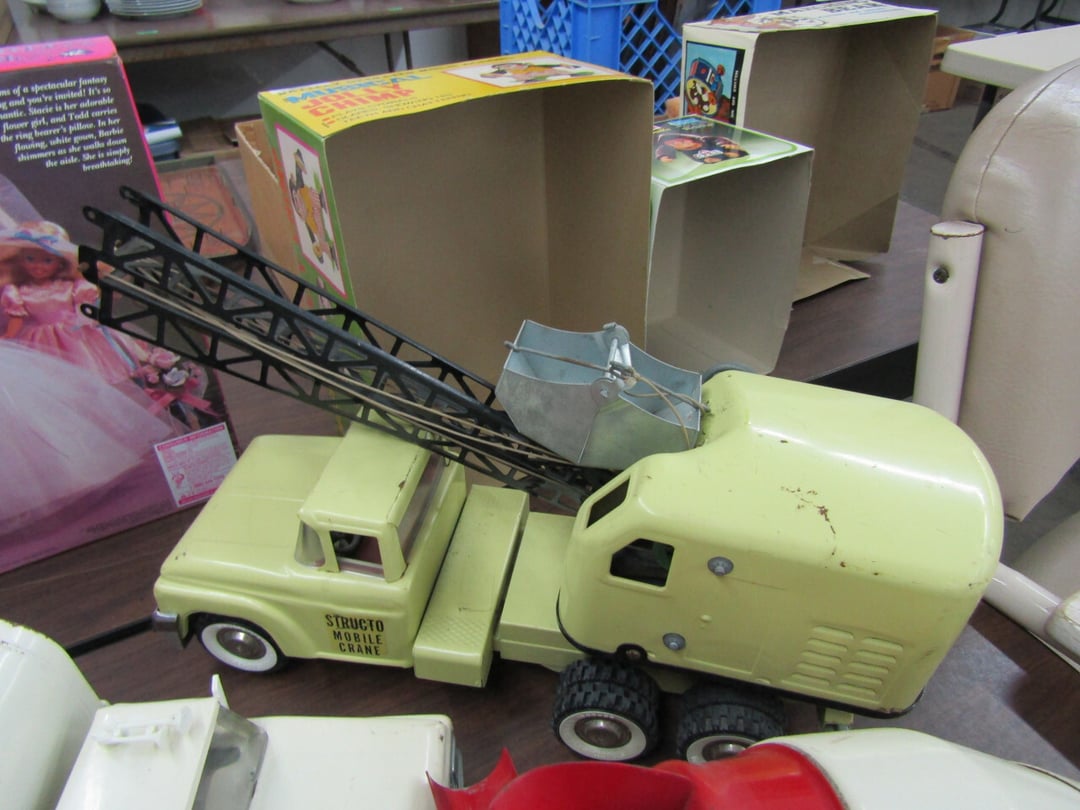 •Crane & Dump Truck - Tootsie Toys - Tom Brokaw Books - Wind Up Animals - Bagetelle & Baseball Game - (2) Barbie Dolls (Dream Wedding & Happy Holidays) - Coke Trays - baseball cards