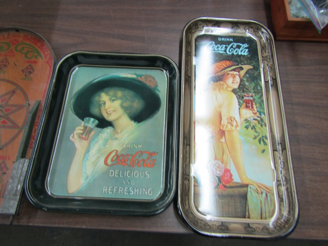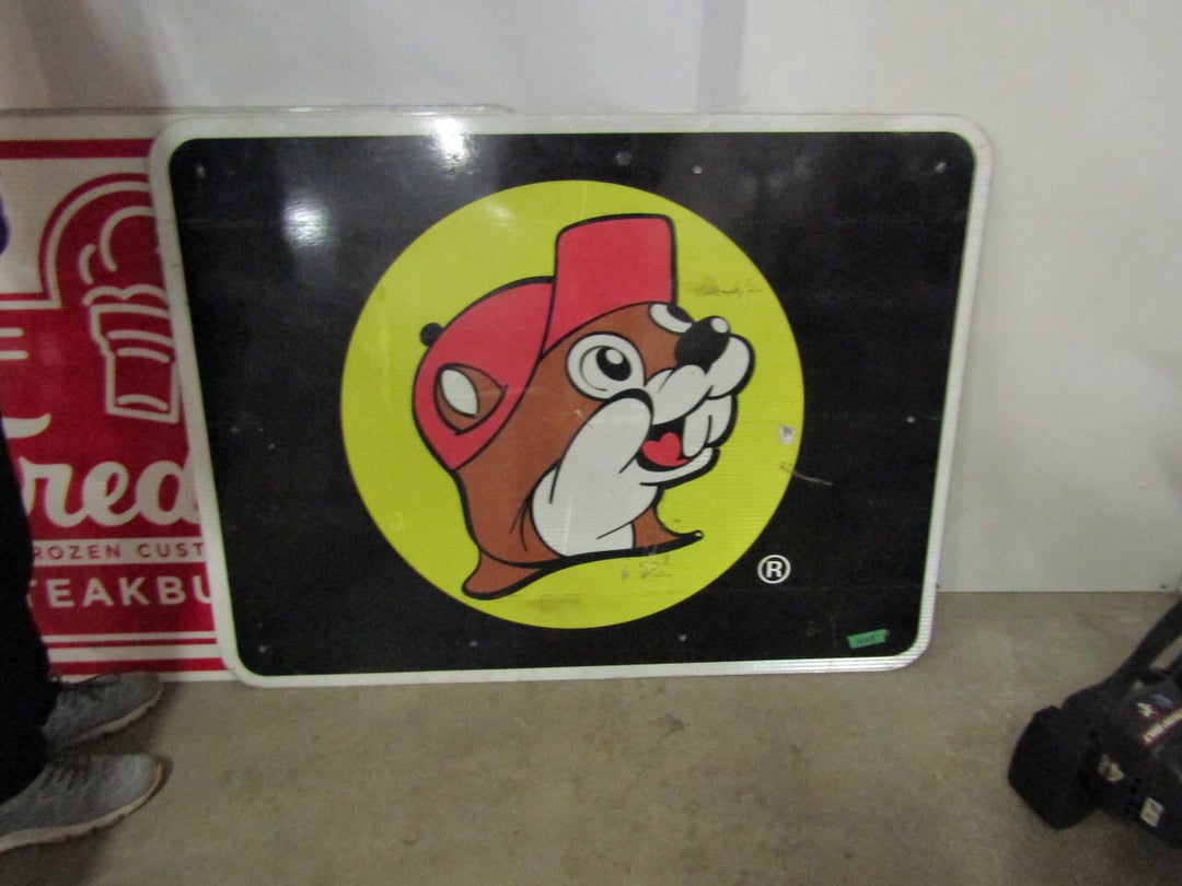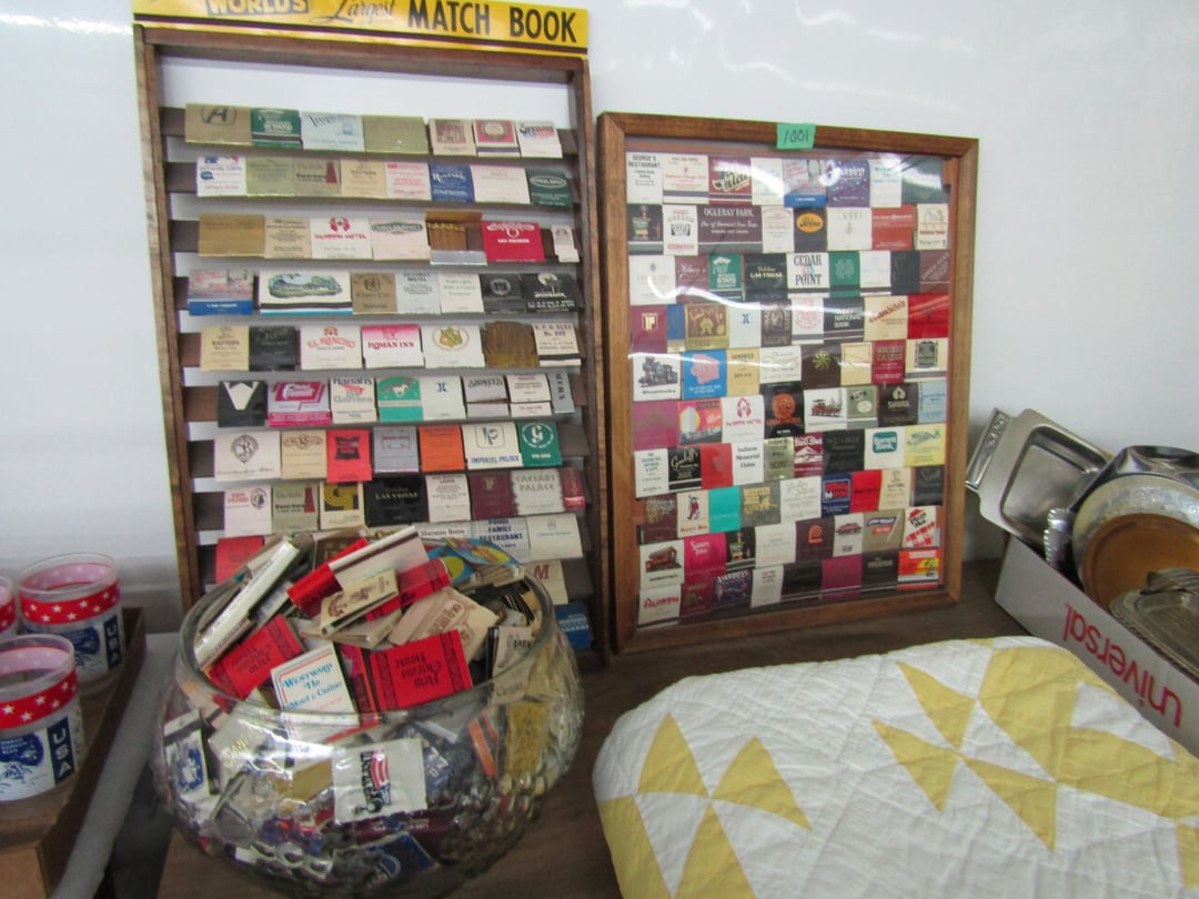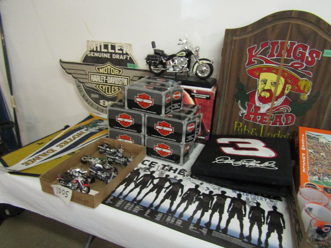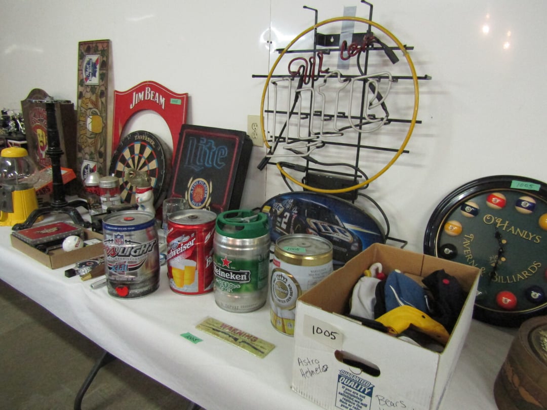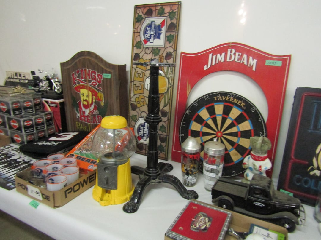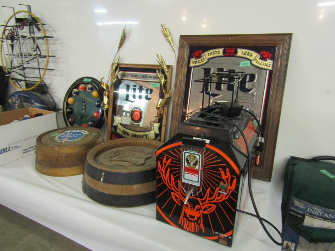 •has co2 tank) - Miller Lite Neon Sign - (21) metal advertisement signs (some double sided) - Beatles Items - Philco Table Top Radio - HO Train - Daisy BB Rifle - Brass Lamps - Matchbook Collection - die cast harley collection - (3) Flat Screens - Electronics - "Lead Glass" Butterfly - Gilbert Electric Set - Red Lightning Rod Balls - Brass Bookends - Box Car Mover - Budda Statue - Shirley Temple Pitcher - Old License Plates - Plastic Gum Ball Machine - Mt Dew Cooler - misc knickknacks - Cot - Sleeping Bag - Blankets