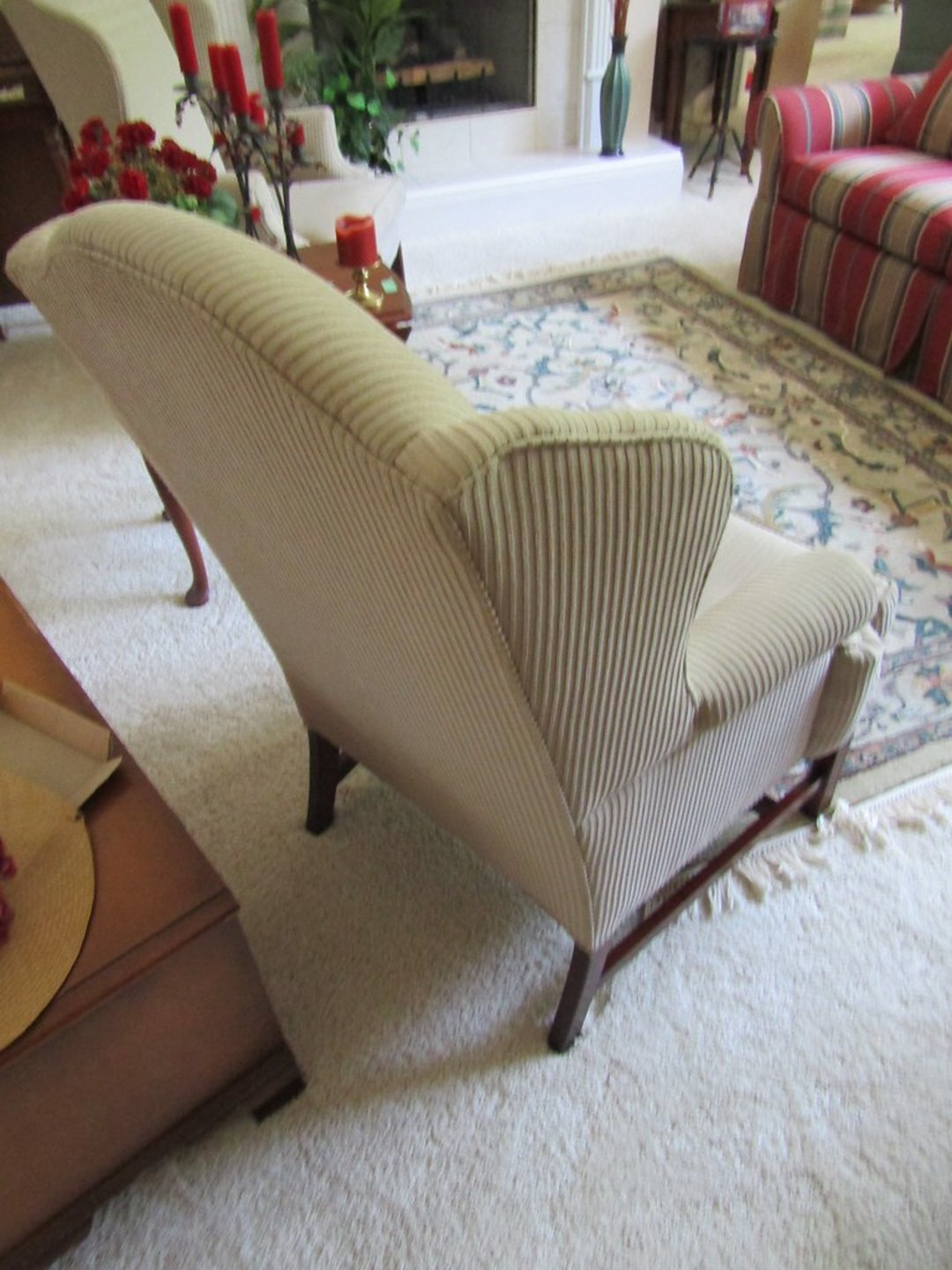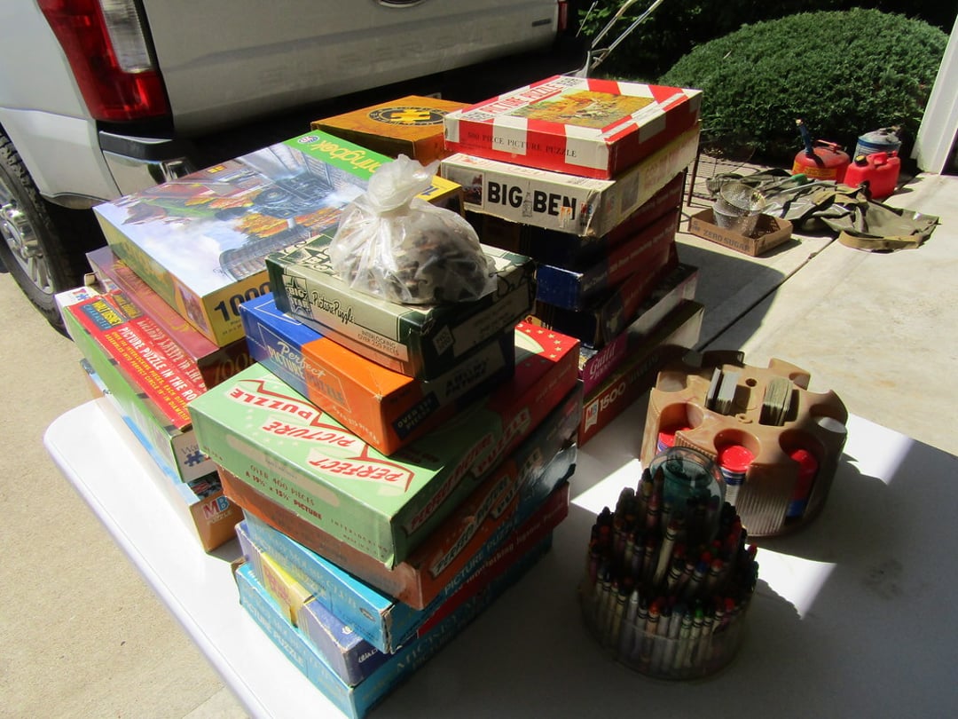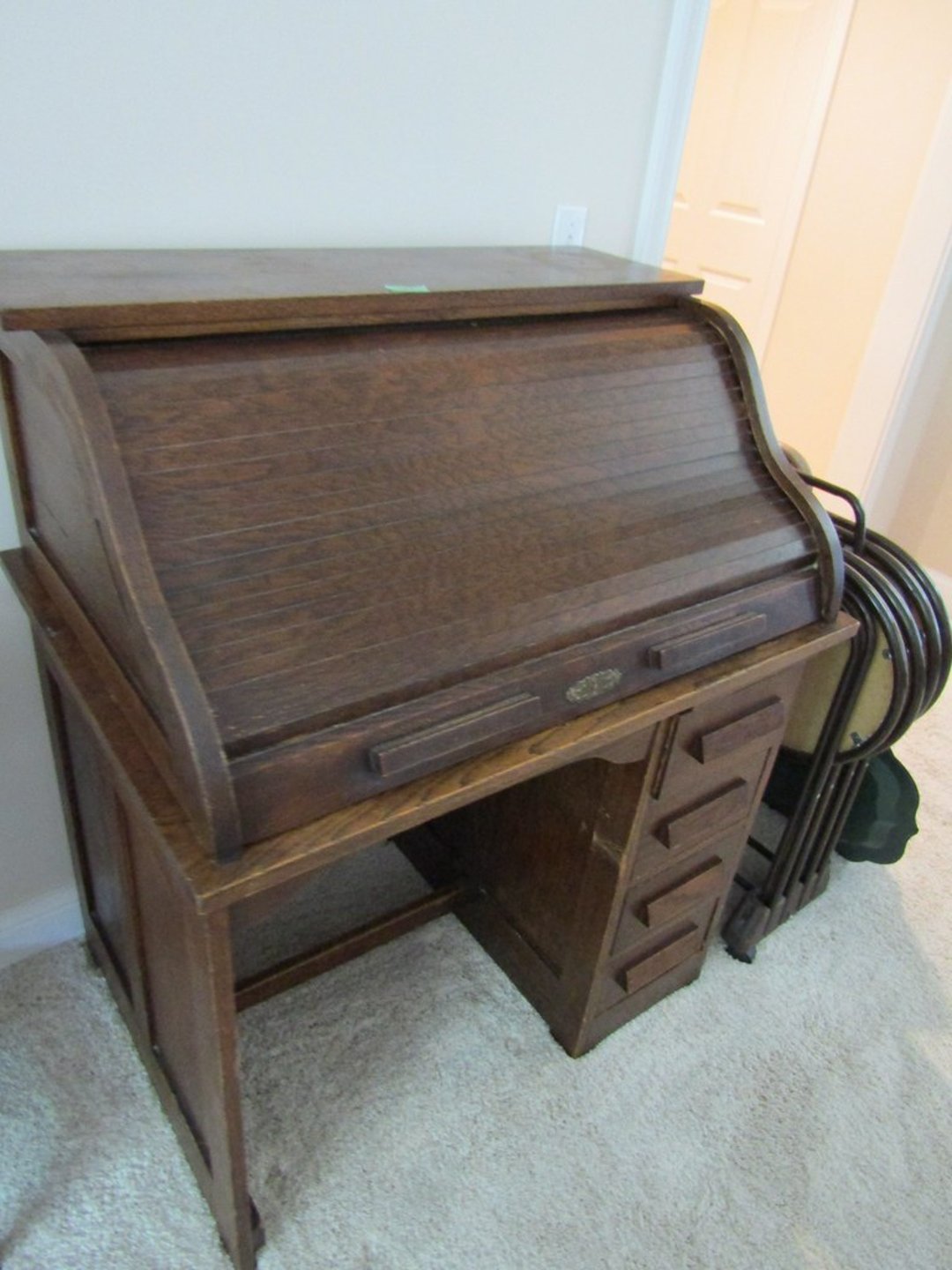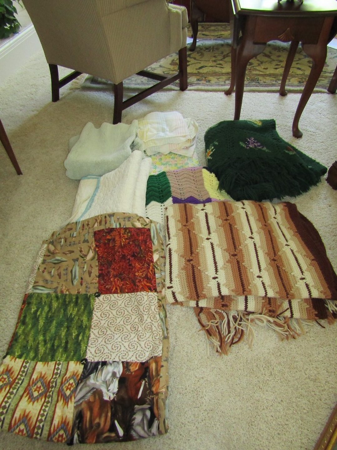 •Weather Gauge – 4 Luggage Bags – Sheets & Towels – Blankets & Quilts – Towels & Blankets – Ottoman – End Table – Chair – Bar Stools – Table w/ 2 Benches – Coffee Table – Desk & Chair – Couch – Love Seat – Shelf – Childs Rocker – Small Table – Drexel Entertainment Center – Roll Top Desk – Cedar Chest – Small Dresser – Armoir Dresser – Night Stand & Lamp – 5×8 Wool Rug – TV Trays – Card Table – Quilt Rack – Pictures – G. Harvey “ The Blessing” – G. Harvey “Charity – The Gift of Love” – Toshiba 42” TV – Baskets