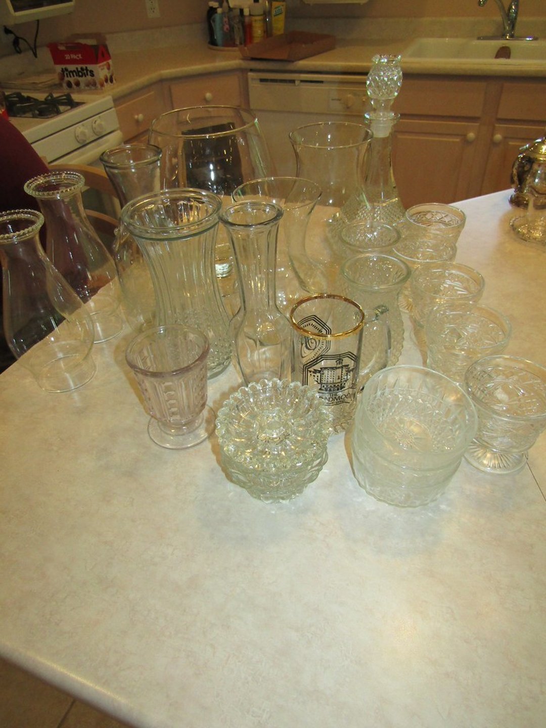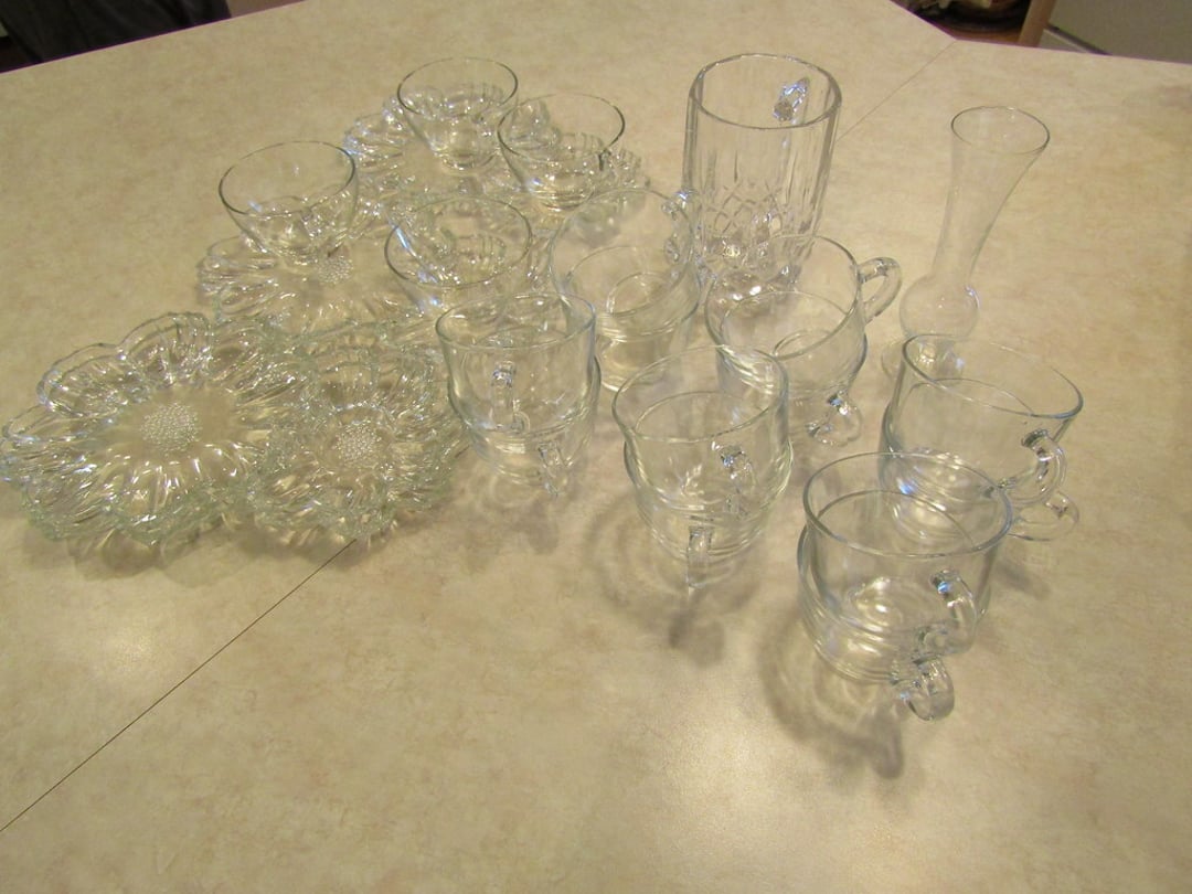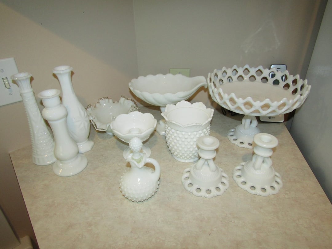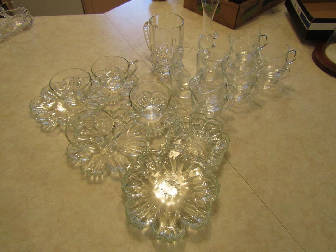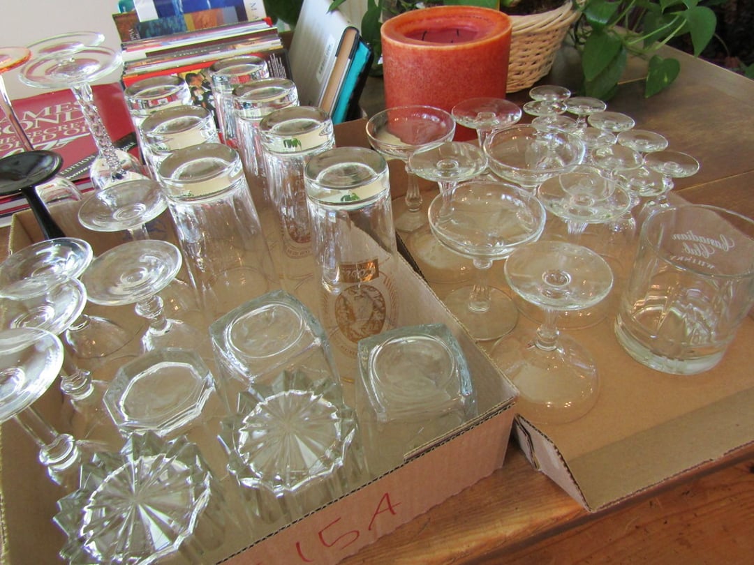 •Milk Glass – Punch Bowl w/ 12 Cups – (12) Wine Glasses – (6) Martini Glasses – Drink Glasses – Assorted Glassware – Misc. Glassware – Misc. China – Pyrex Dish – Flatware – Toaster