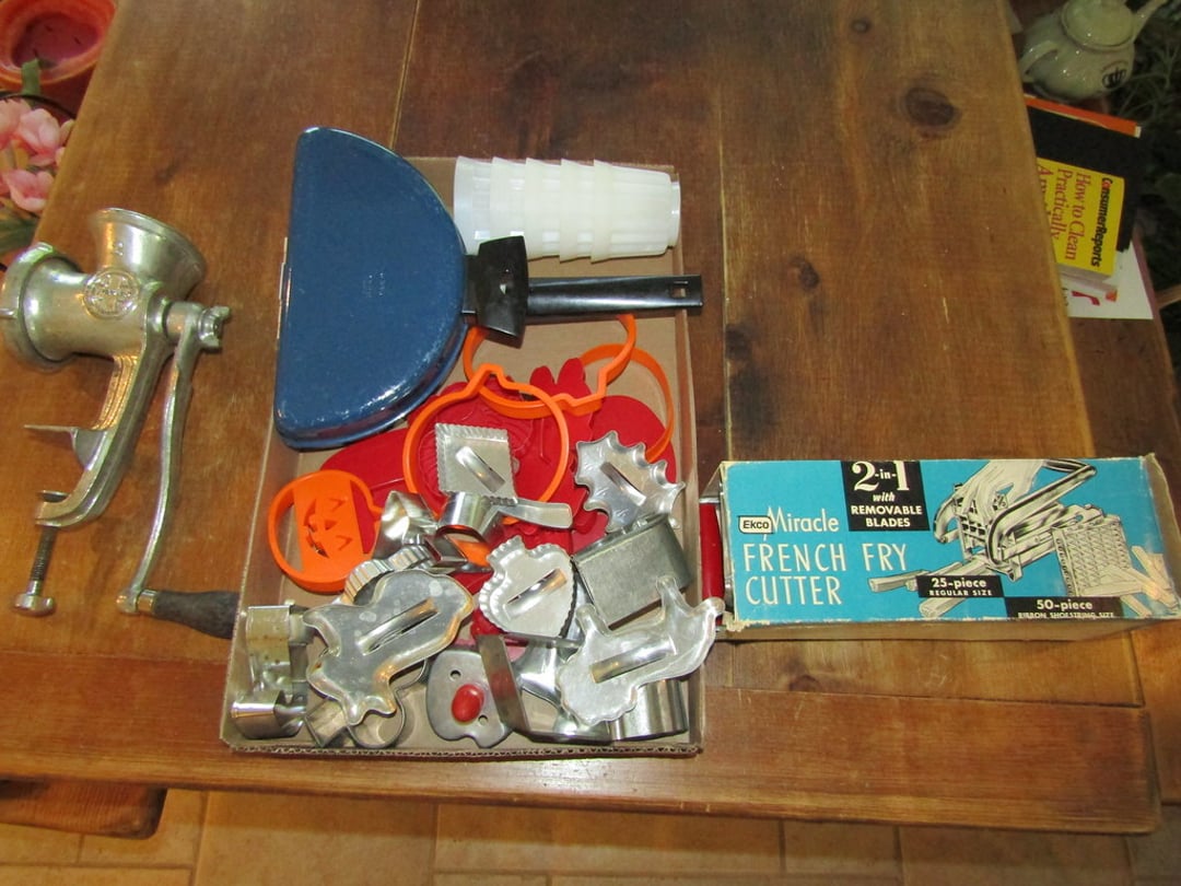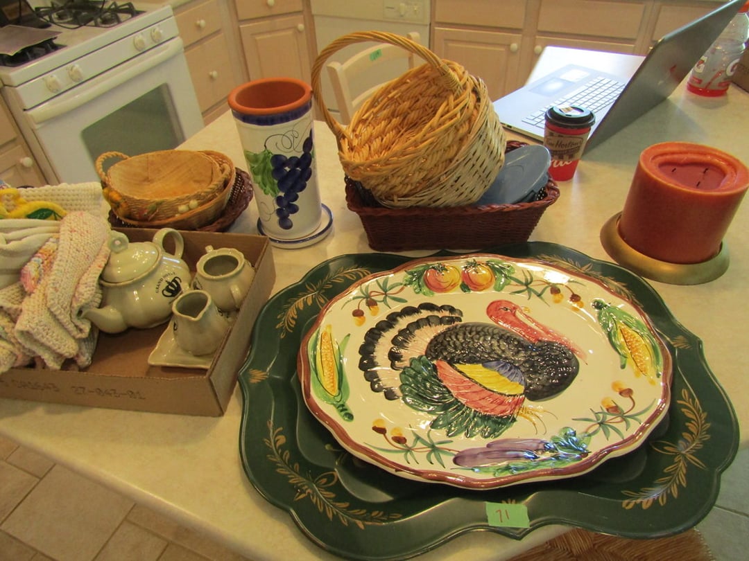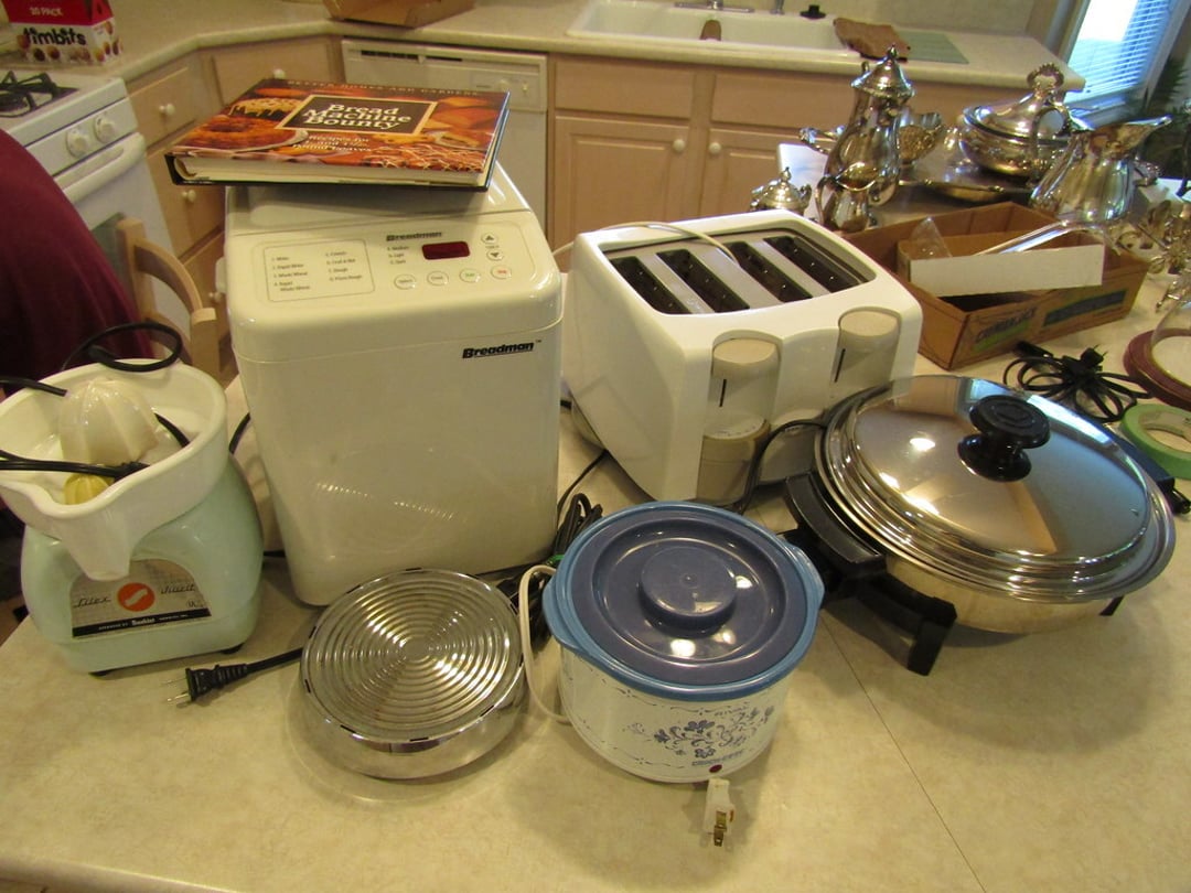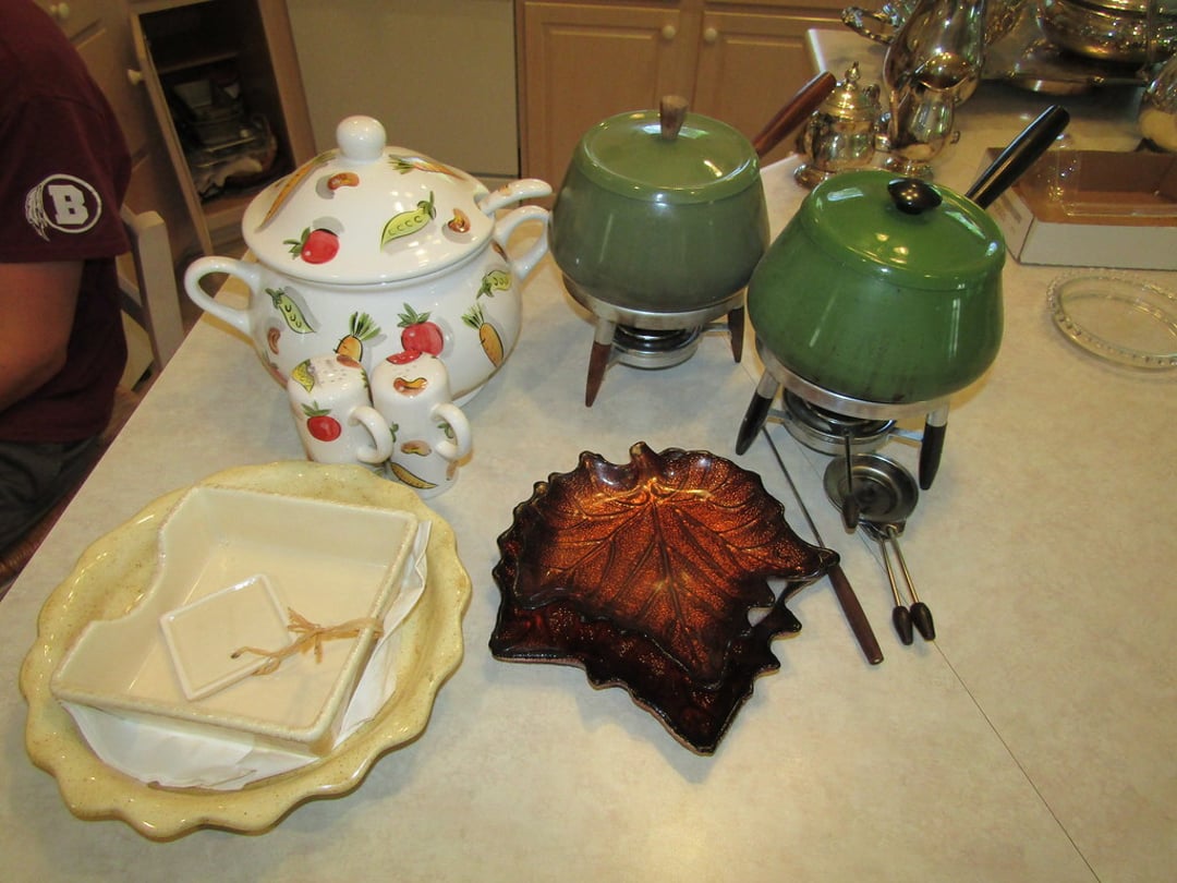 •Juicer – Misc. Kitchen Items – Misc. Ceramic Pieces – Chateau Dinner Set – Cooking & Baking Items – Scale – Cheese Boxes – Pots – Nesco Crockpot & Pressure Cooker – French Fry Cutter