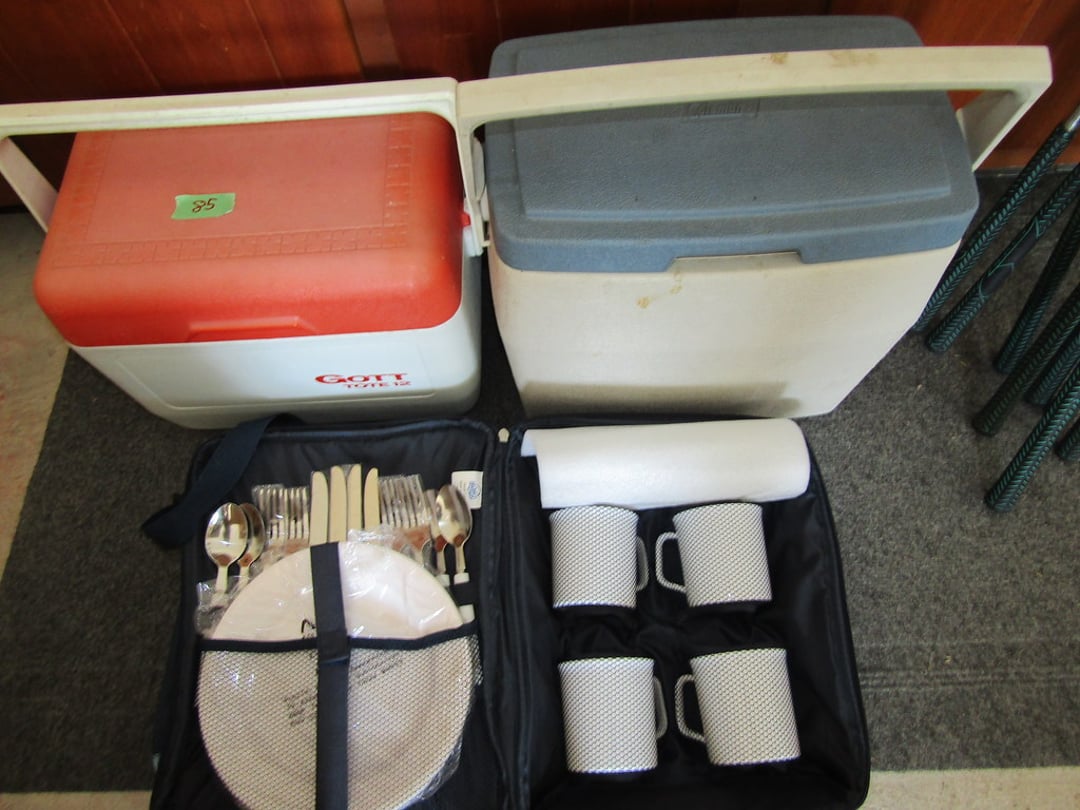 •2 Coleman Lanterns & Spotlight – 2 Coolers & Picnic Set – Waders (size 7