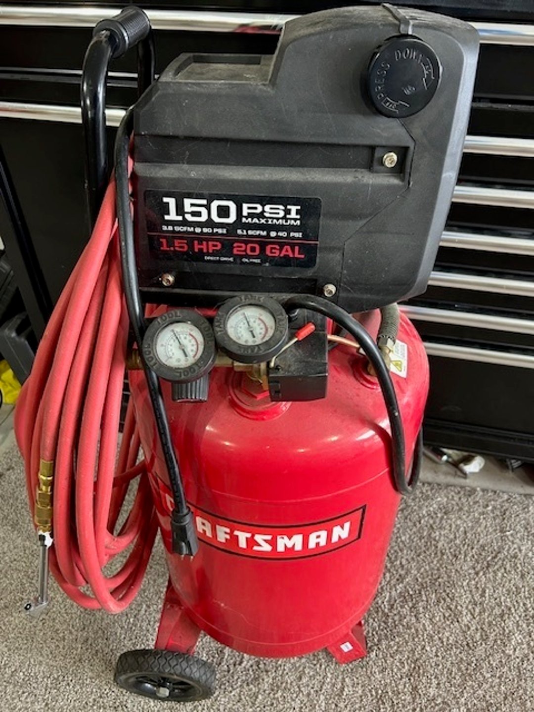 •Craftsman Air compressor 1.5 HP 20 gallon with Goodyear hose