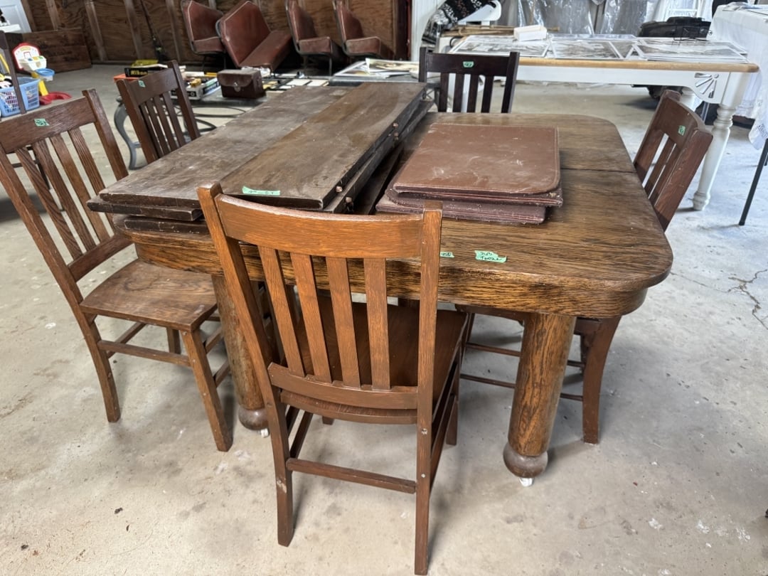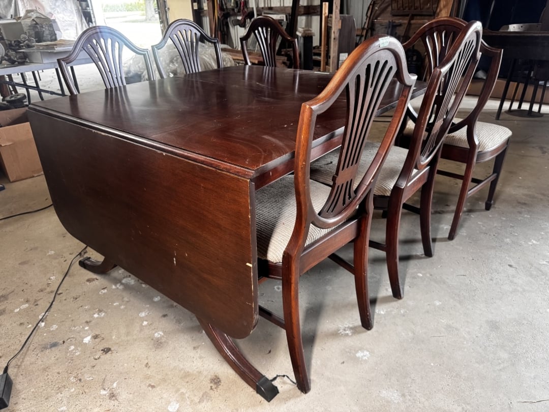 •Folding leaf dining room table w/ (6) matching (Lot #240)