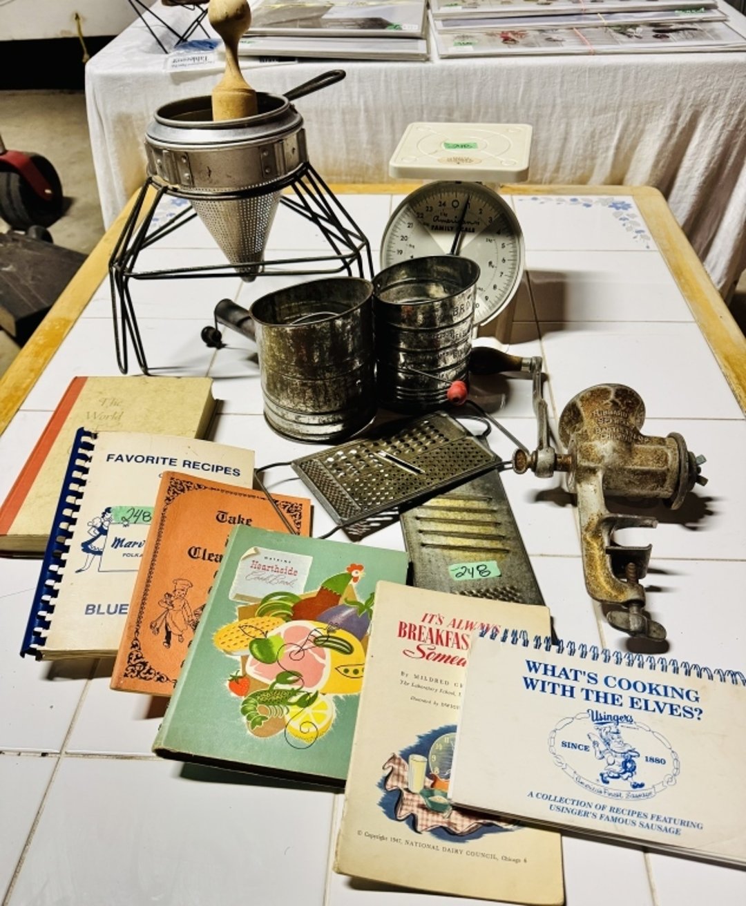•Vntg kitchen scale, masher, recipe books & more (Lot #248)