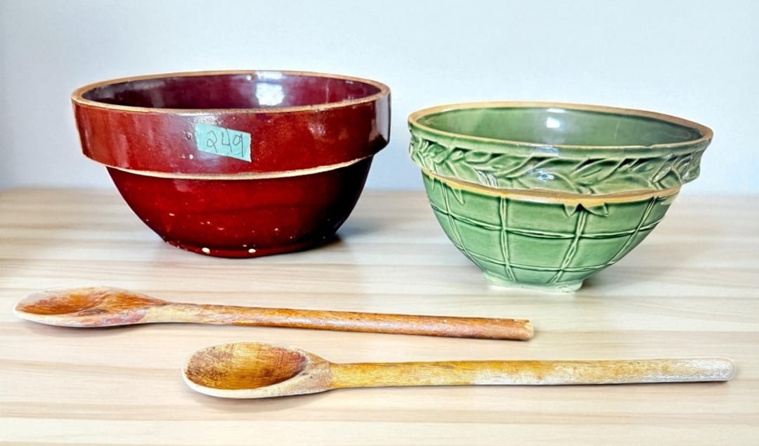•Primitive brown stoneware mixing bowl & wooden (Lot #249)
