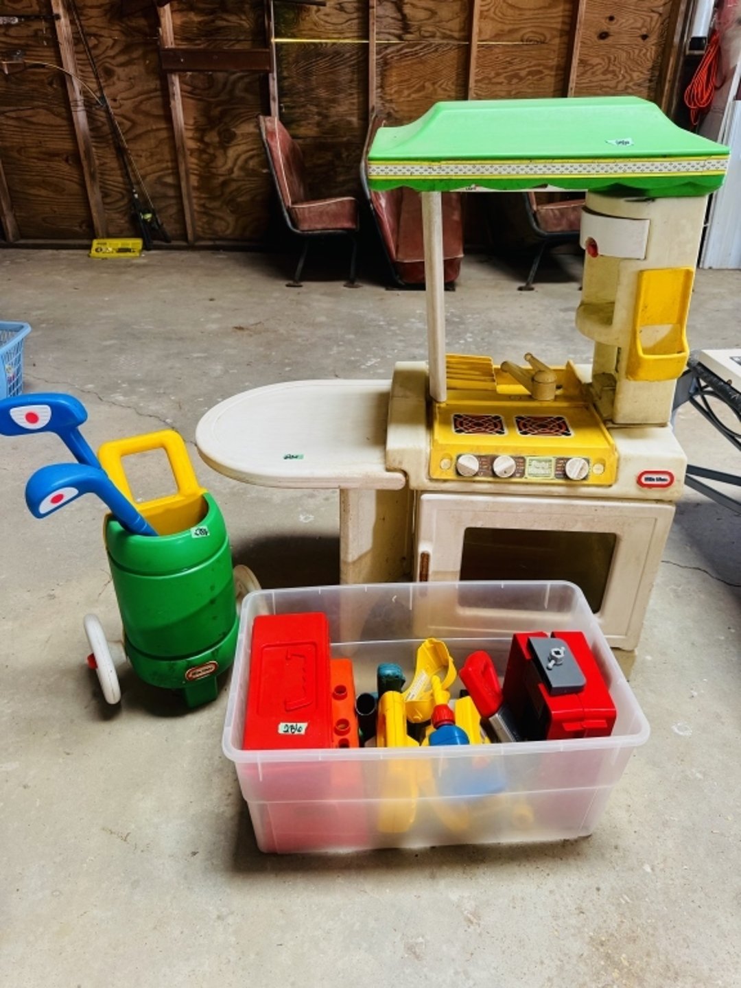 •Little Tikes play kitchen, golf clubs & toy tools (Lot #286)